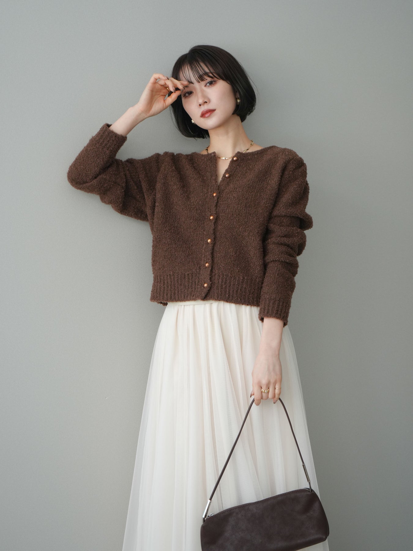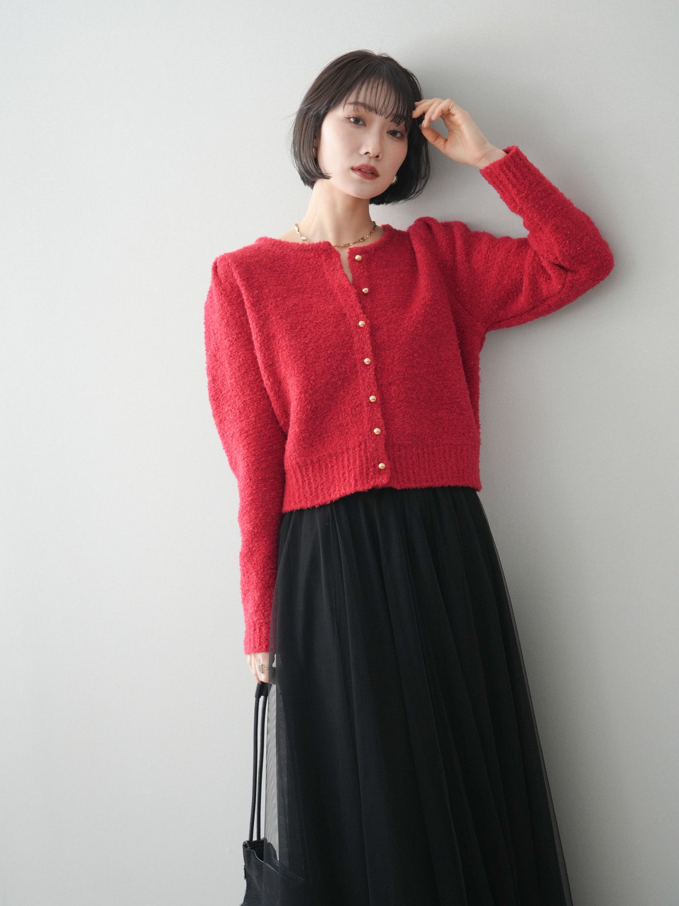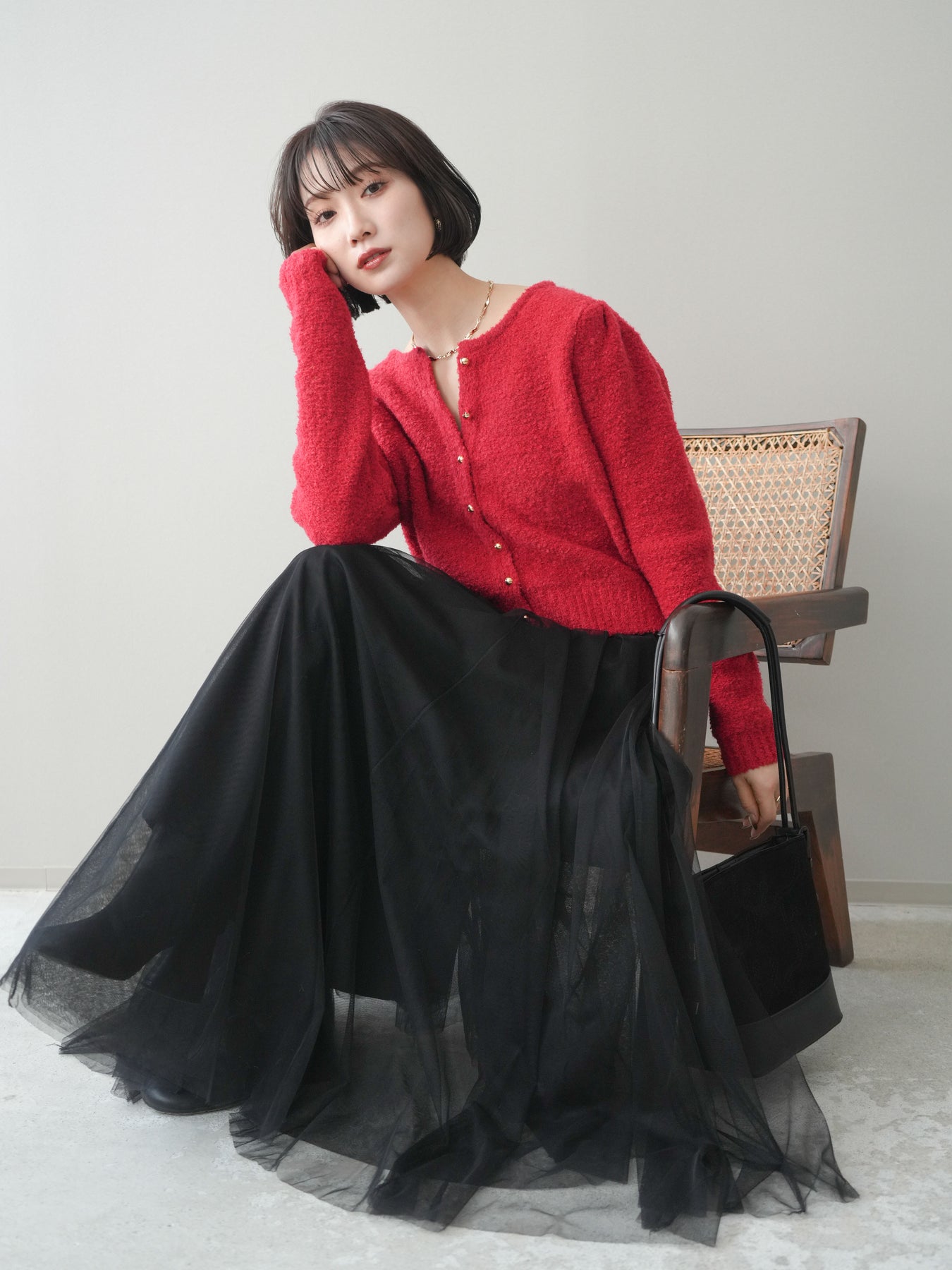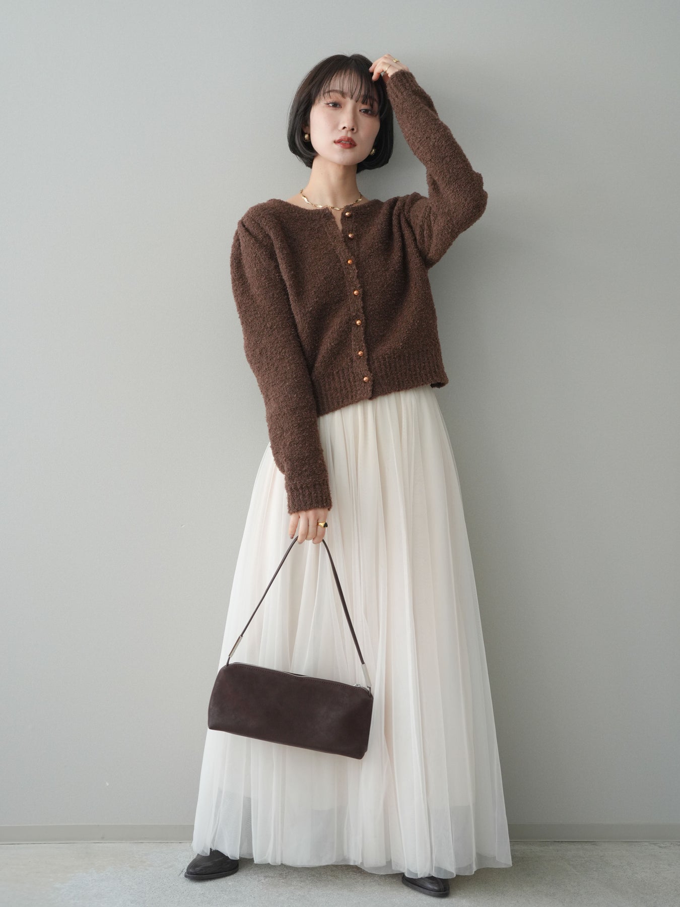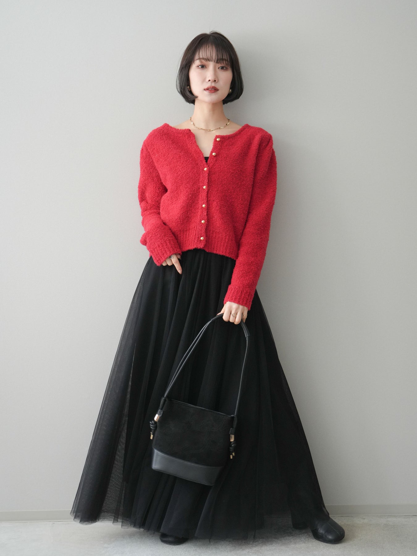 [SET]ゴールドボタンブークレニットカーディガン+チュールボリュームスカート(2set)