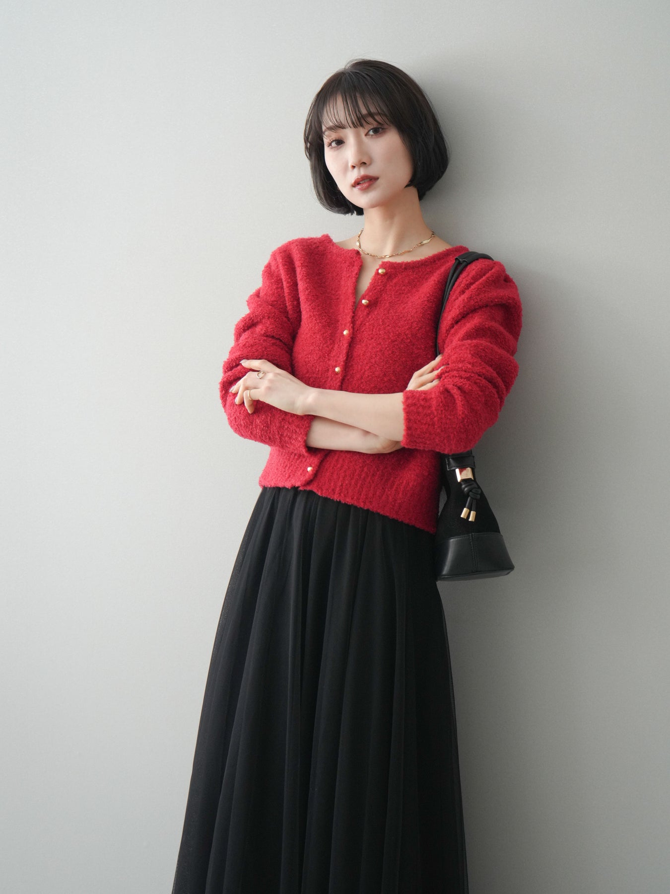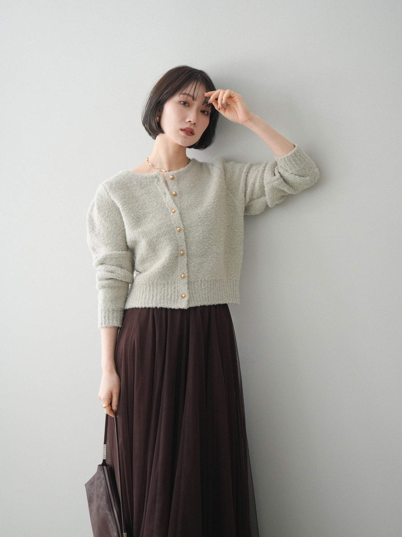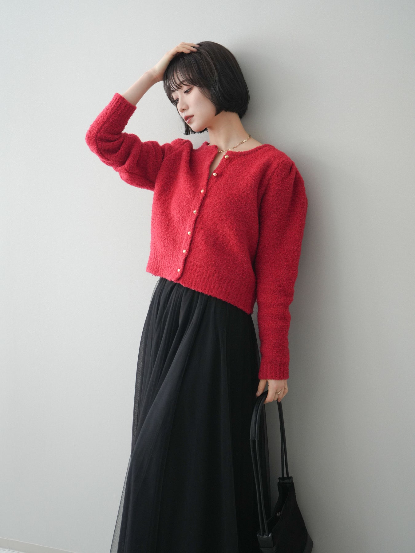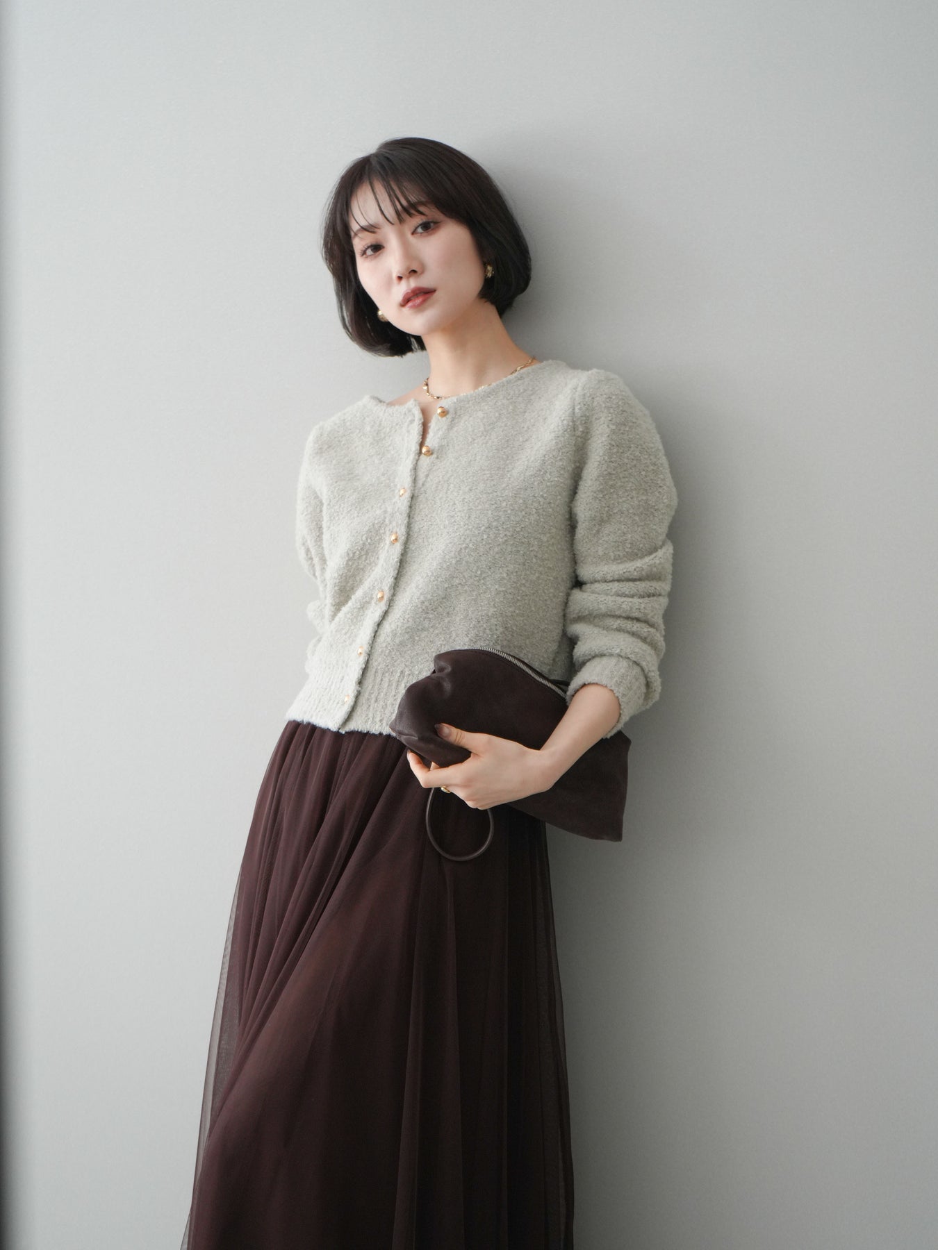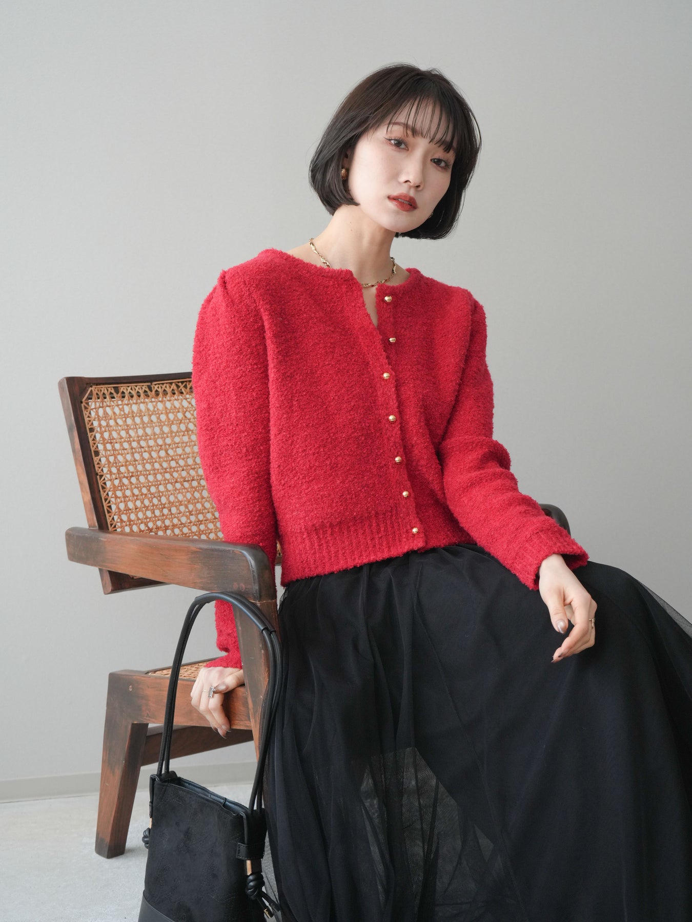 [SET]ゴールドボタンブークレニットカーディガン+チュールボリュームスカート(2set)