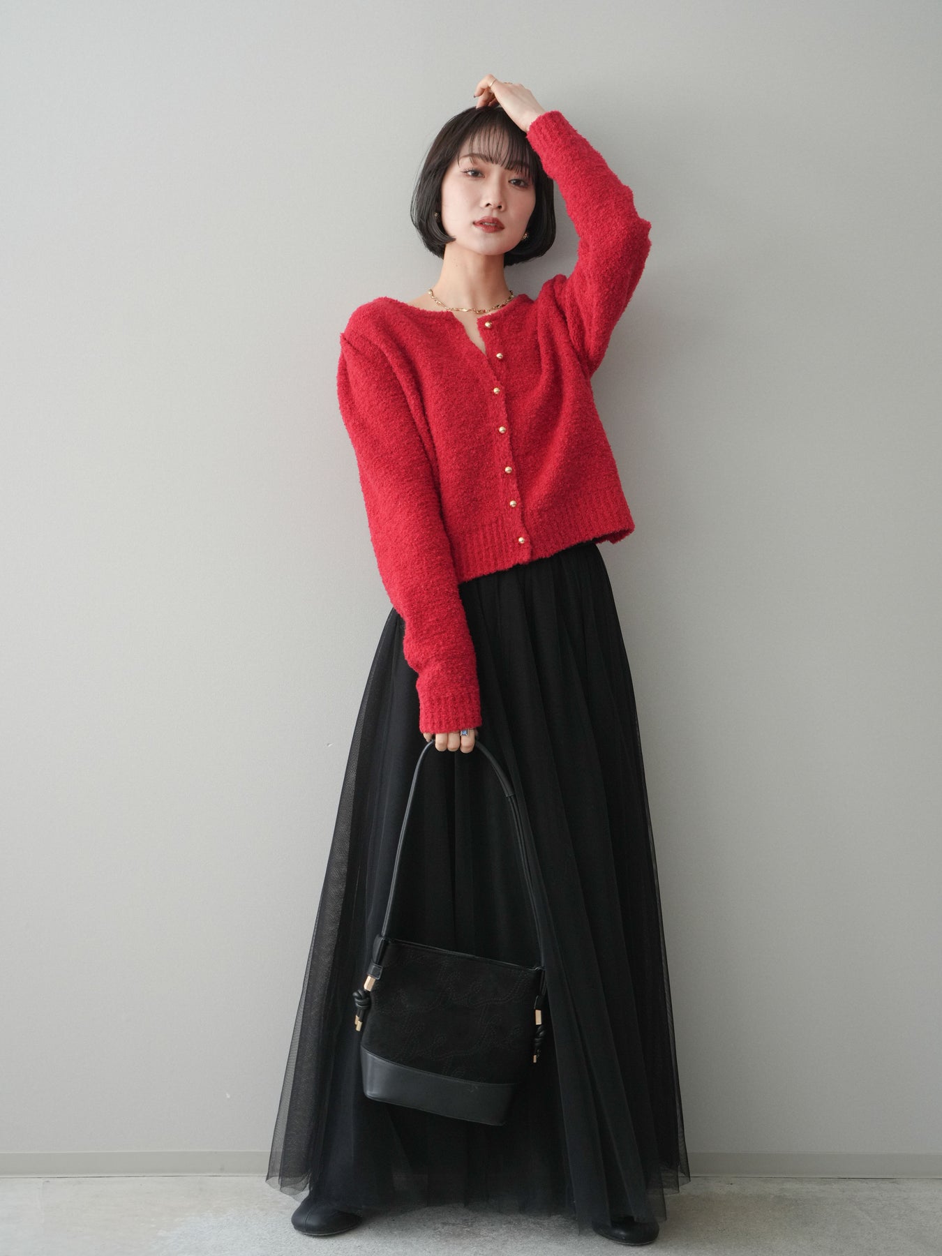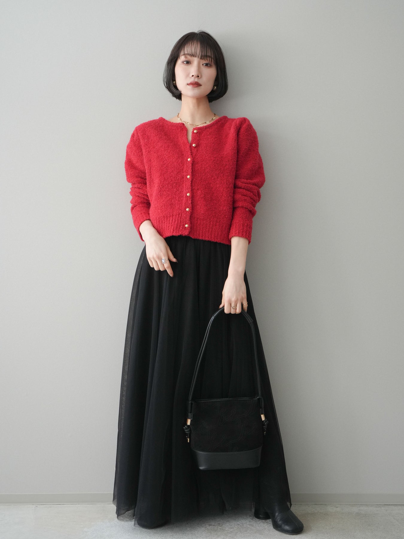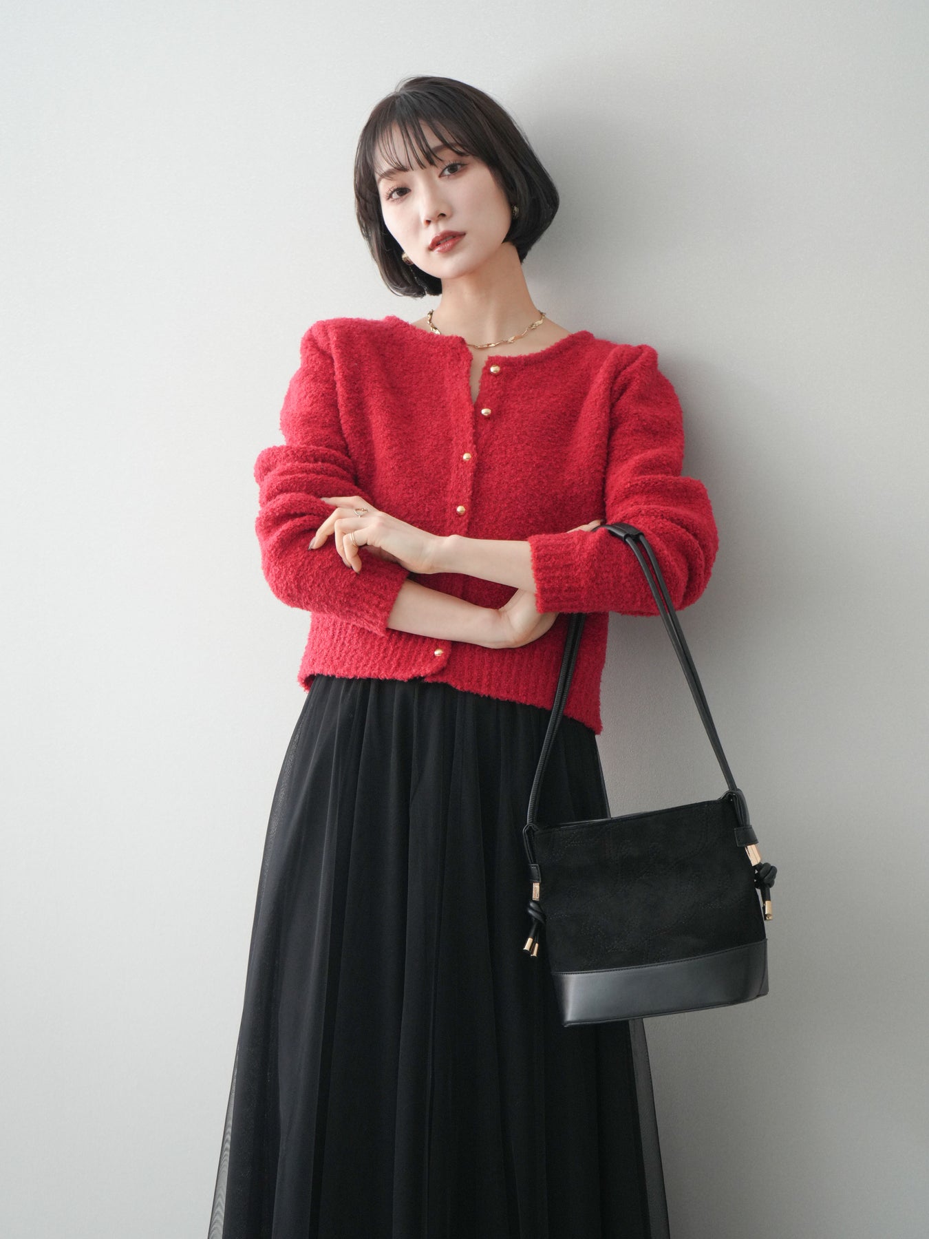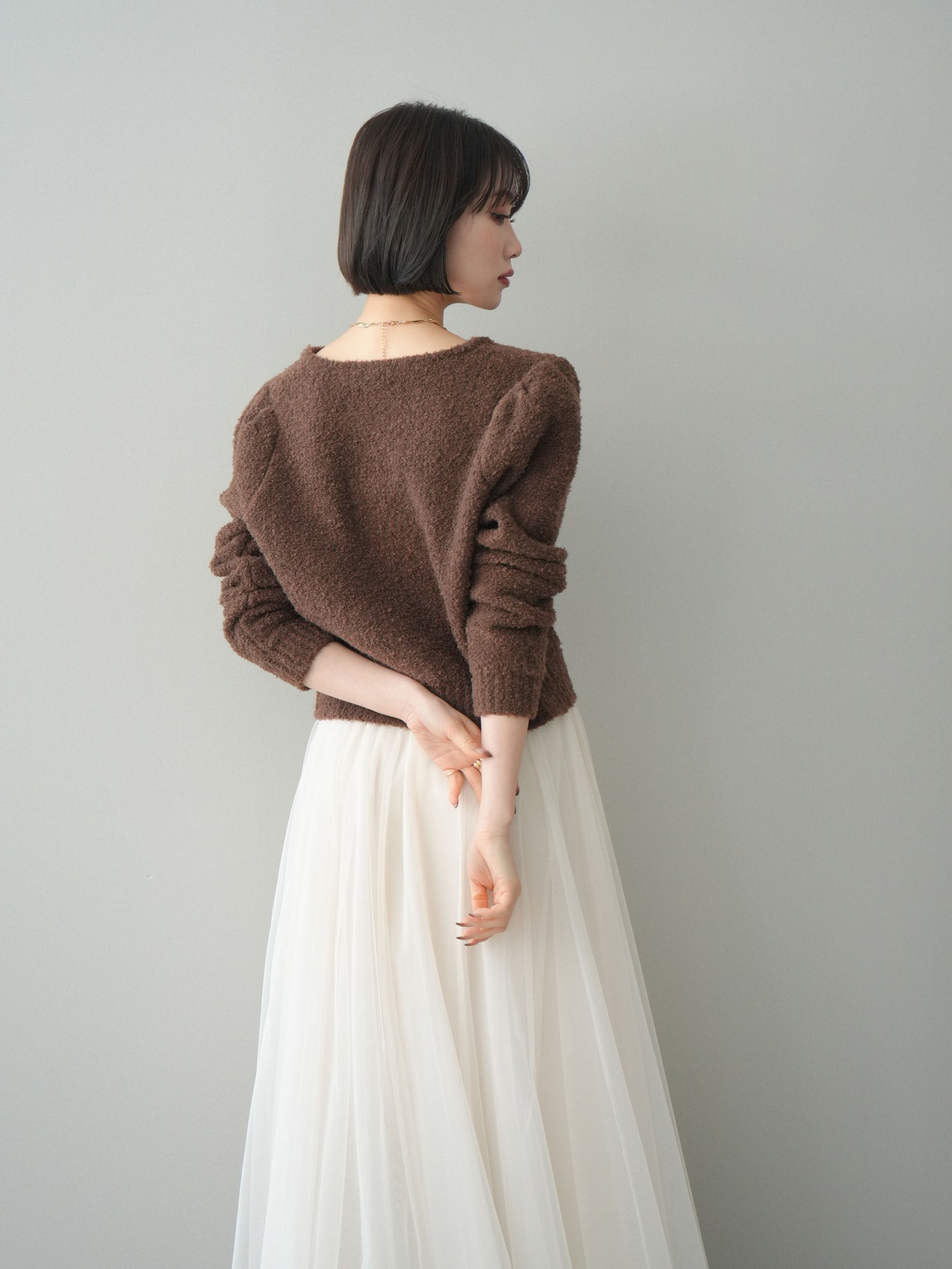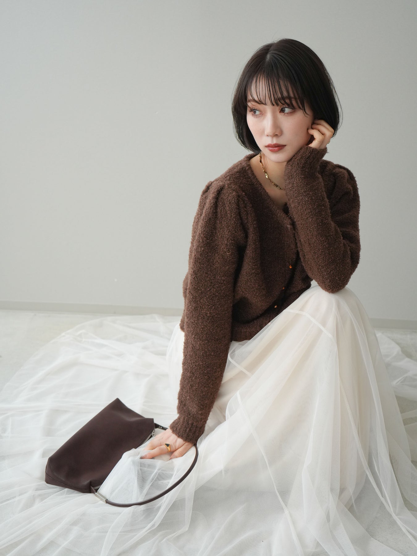 [SET]ゴールドボタンブークレニットカーディガン+チュールボリュームスカート(2set)