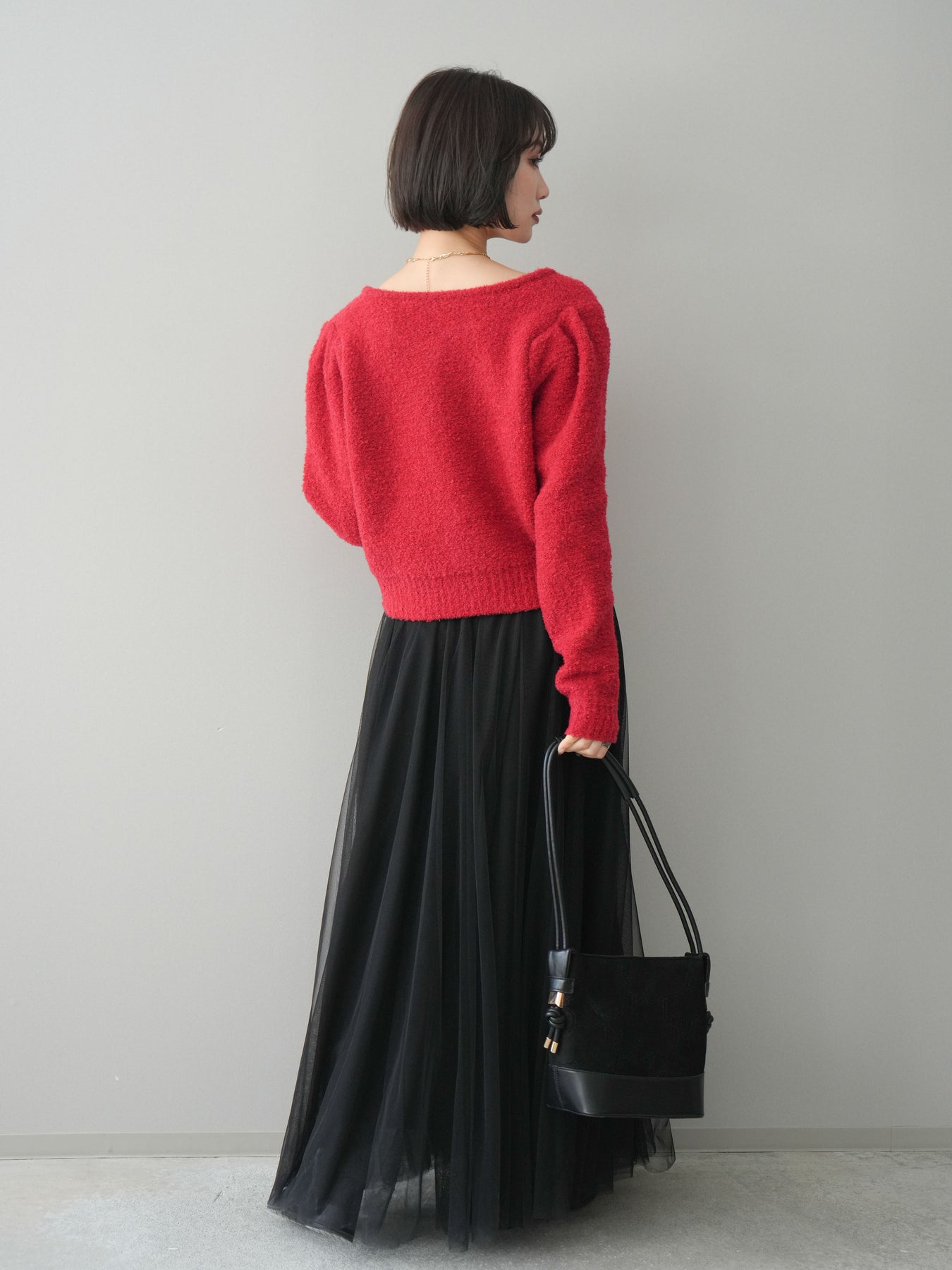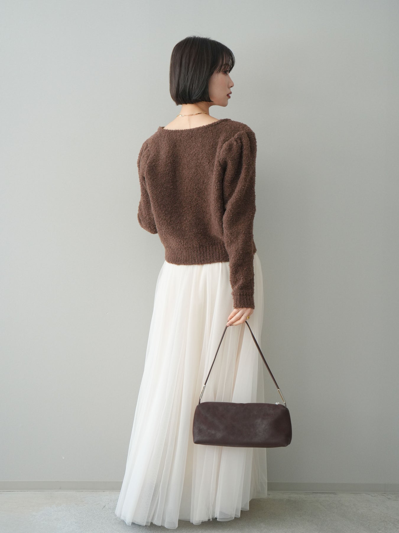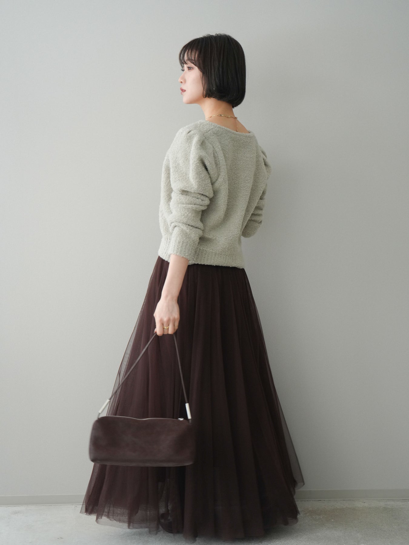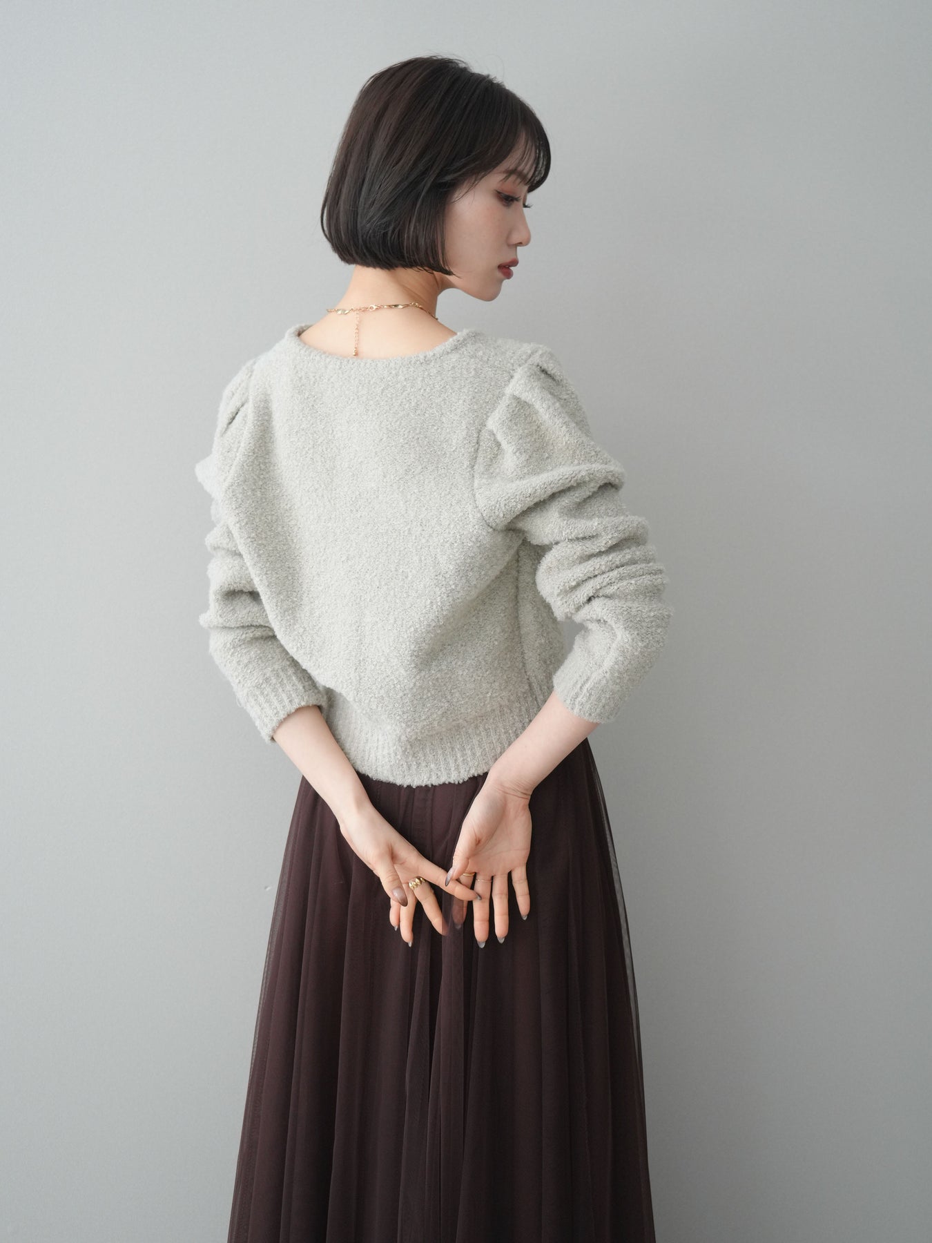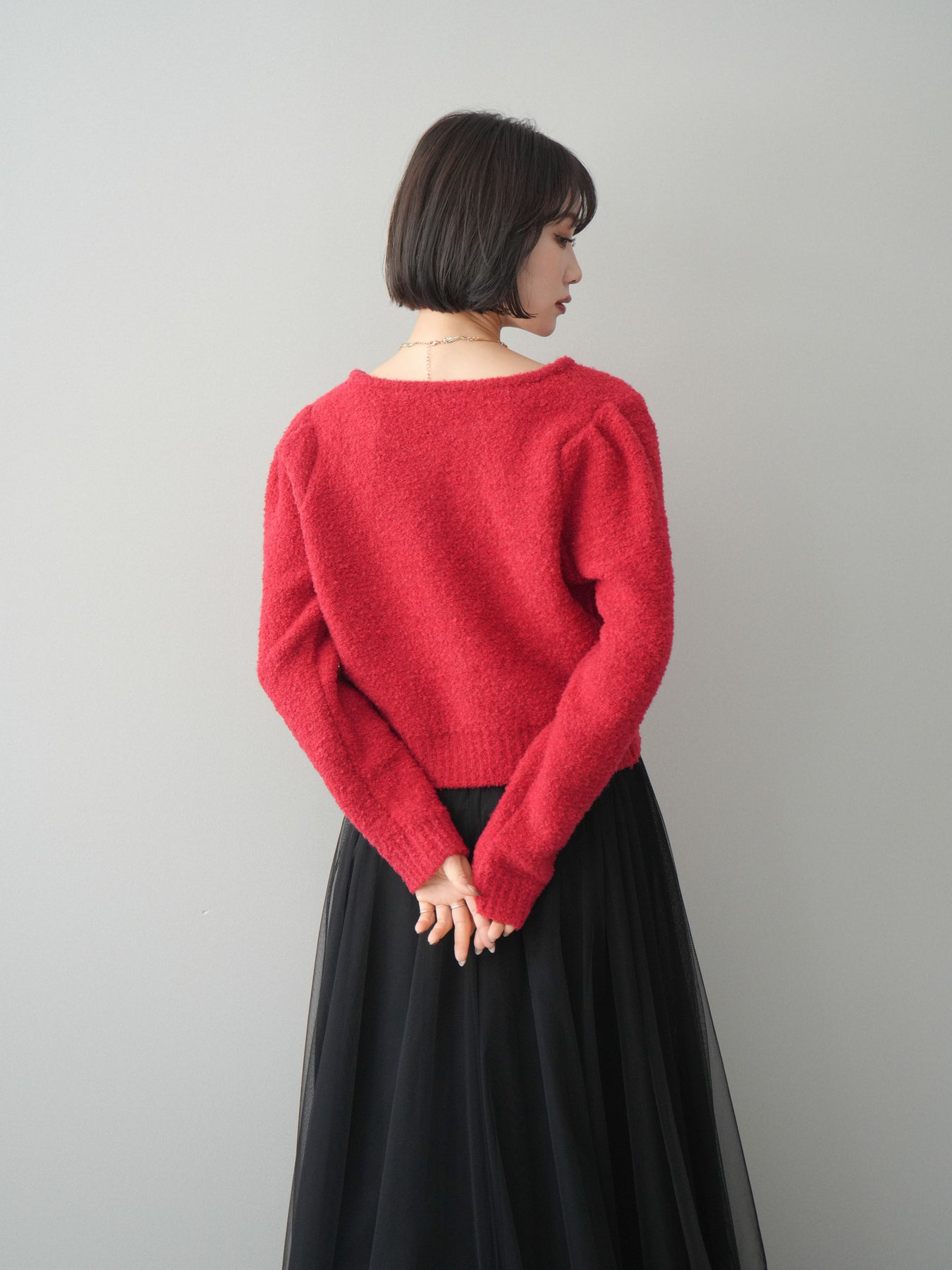 [SET]ゴールドボタンブークレニットカーディガン+チュールボリュームスカート(2set)
