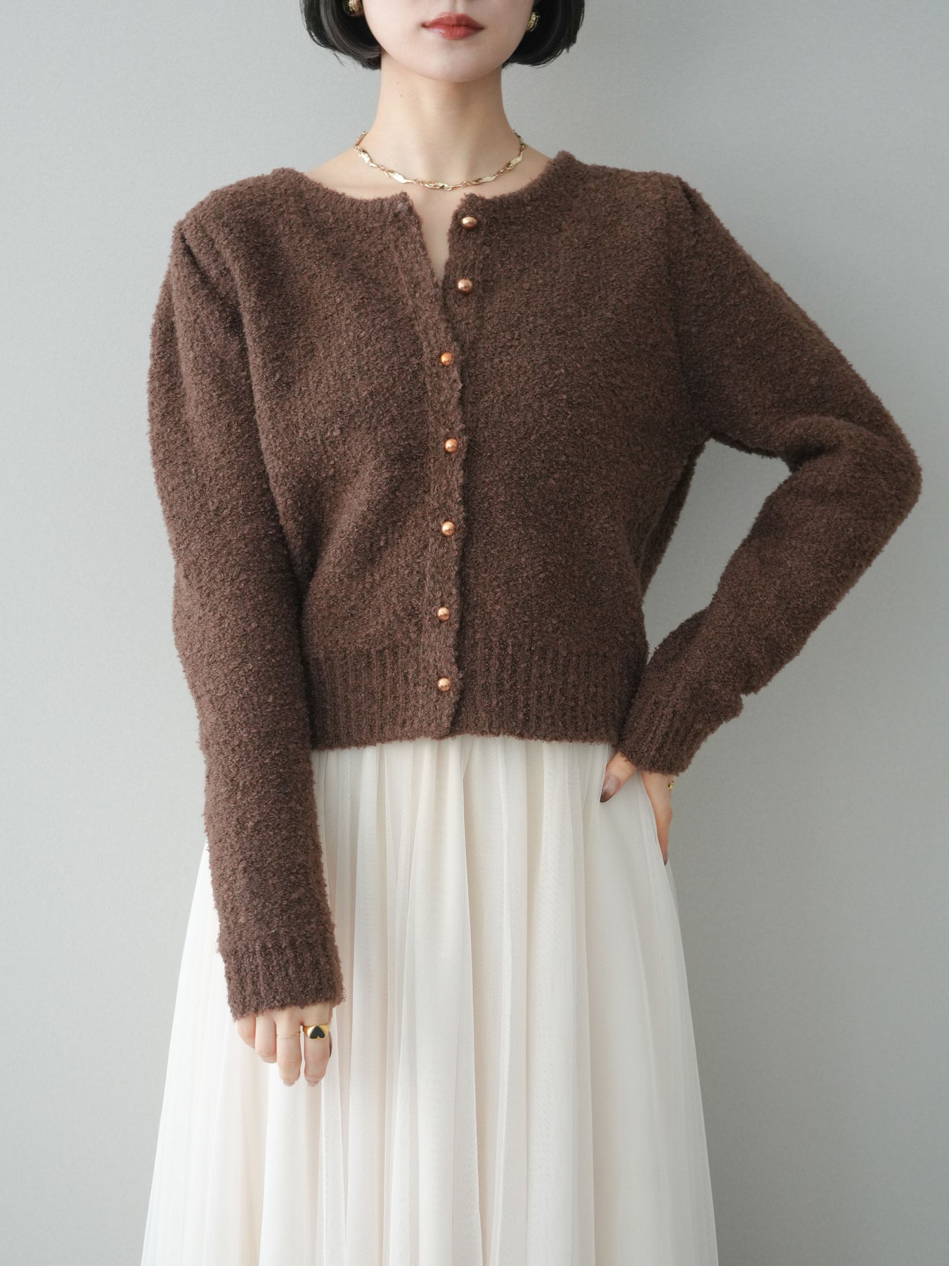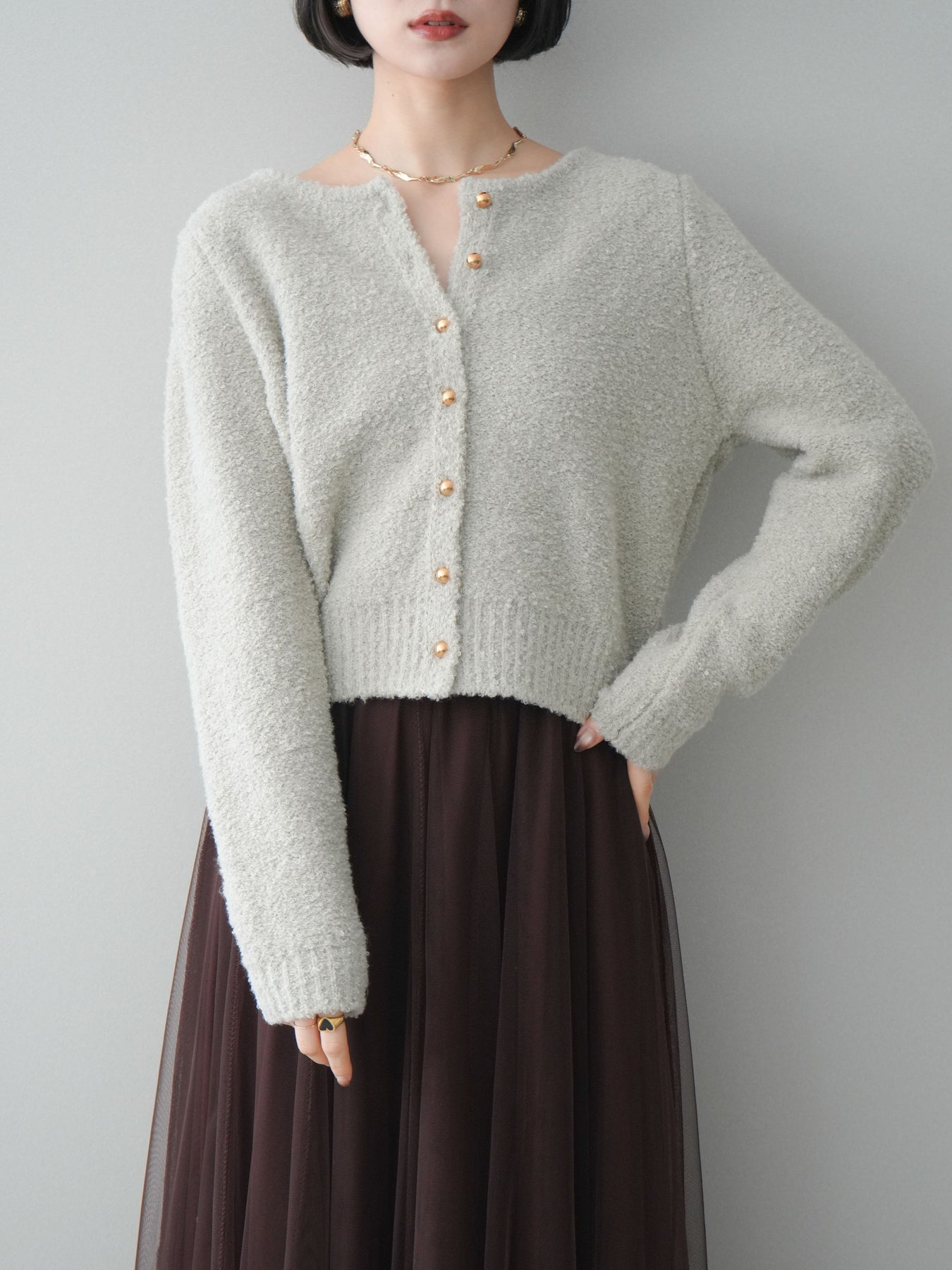 [予約]ゴールドボタンブークレニットカーディガン