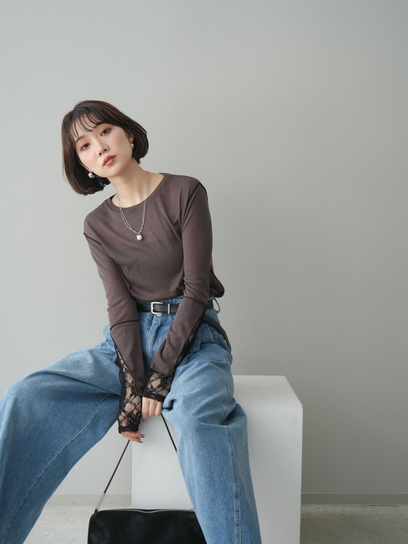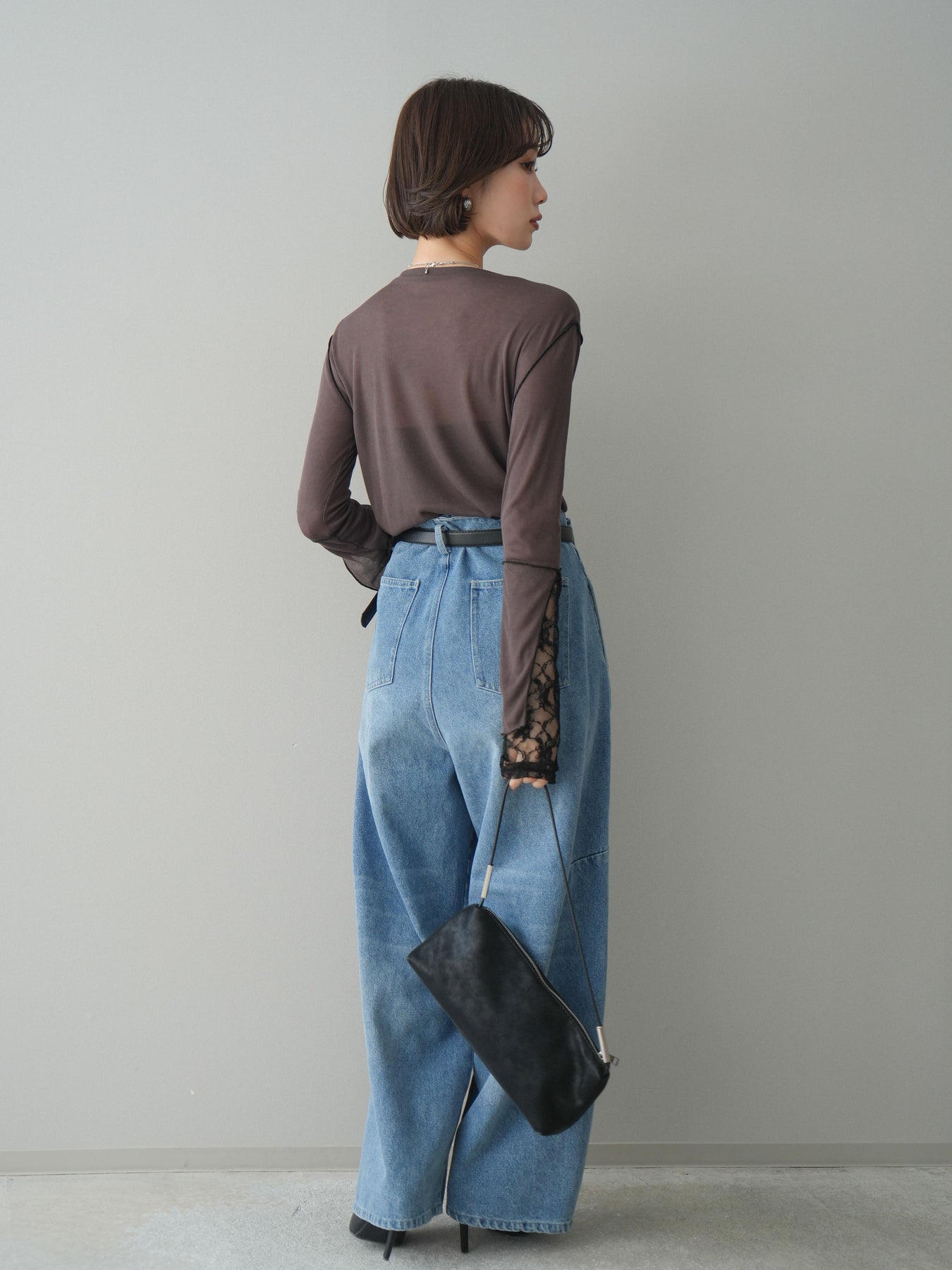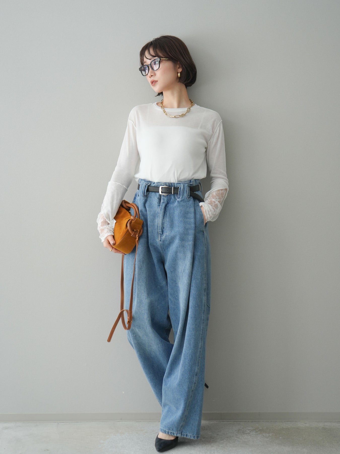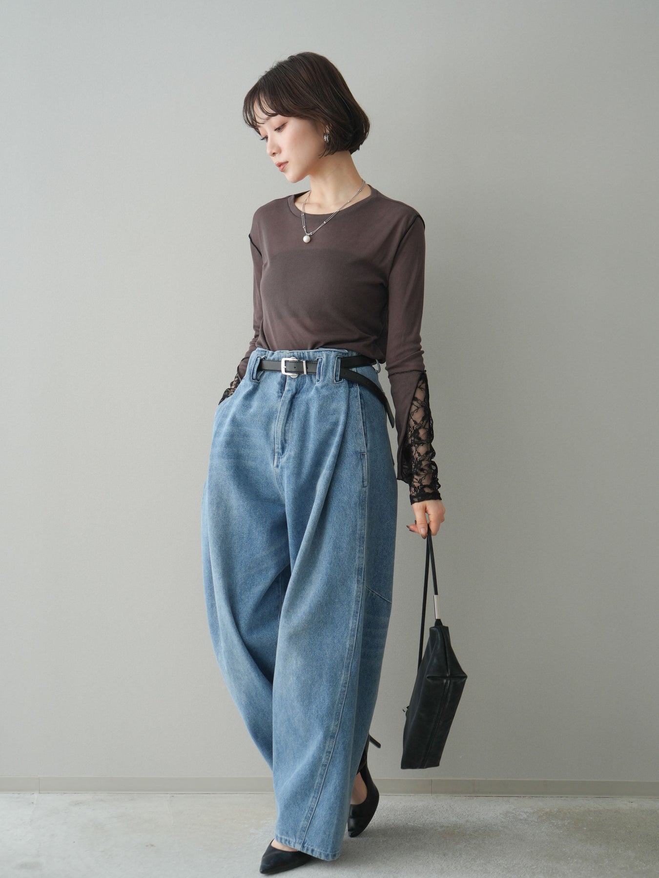 [SET]袖レースレイヤードデザインメロートップス+ハイウエストベルトループデザインデニムパンツ(2set)