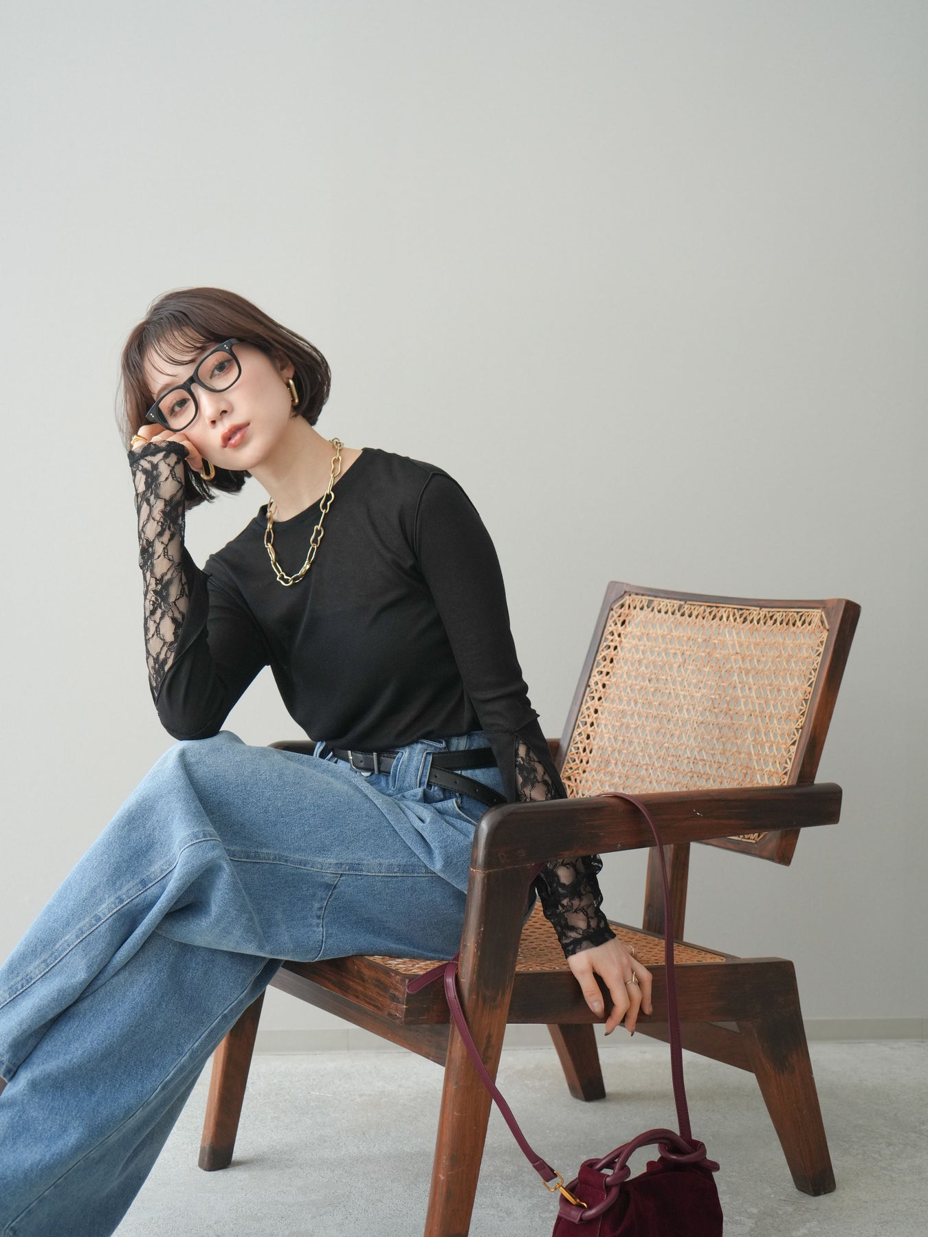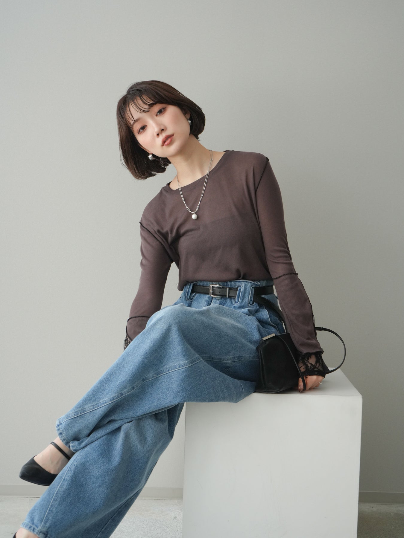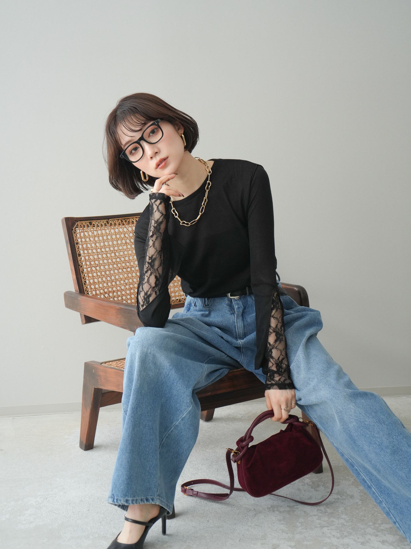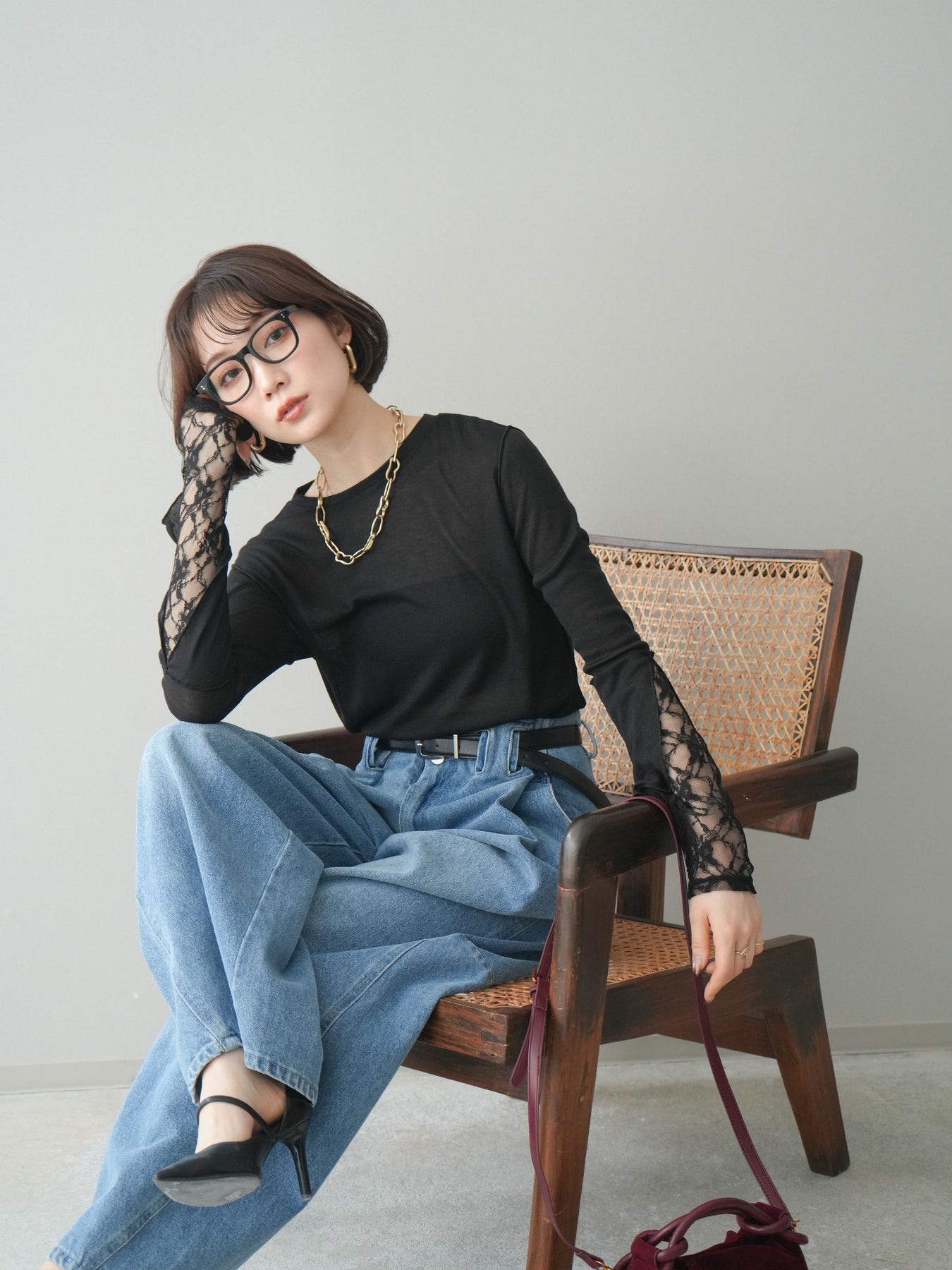 [SET]袖レースレイヤードデザインメロートップス+ハイウエストベルトループデザインデニムパンツ(2set)