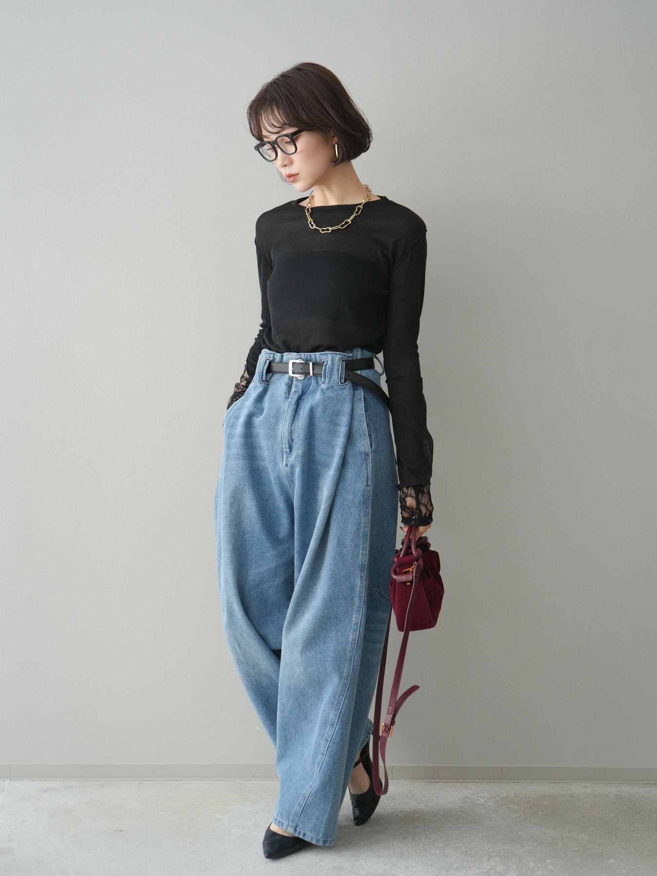 [予約]ハイウエストベルトループデザインデニムパンツ