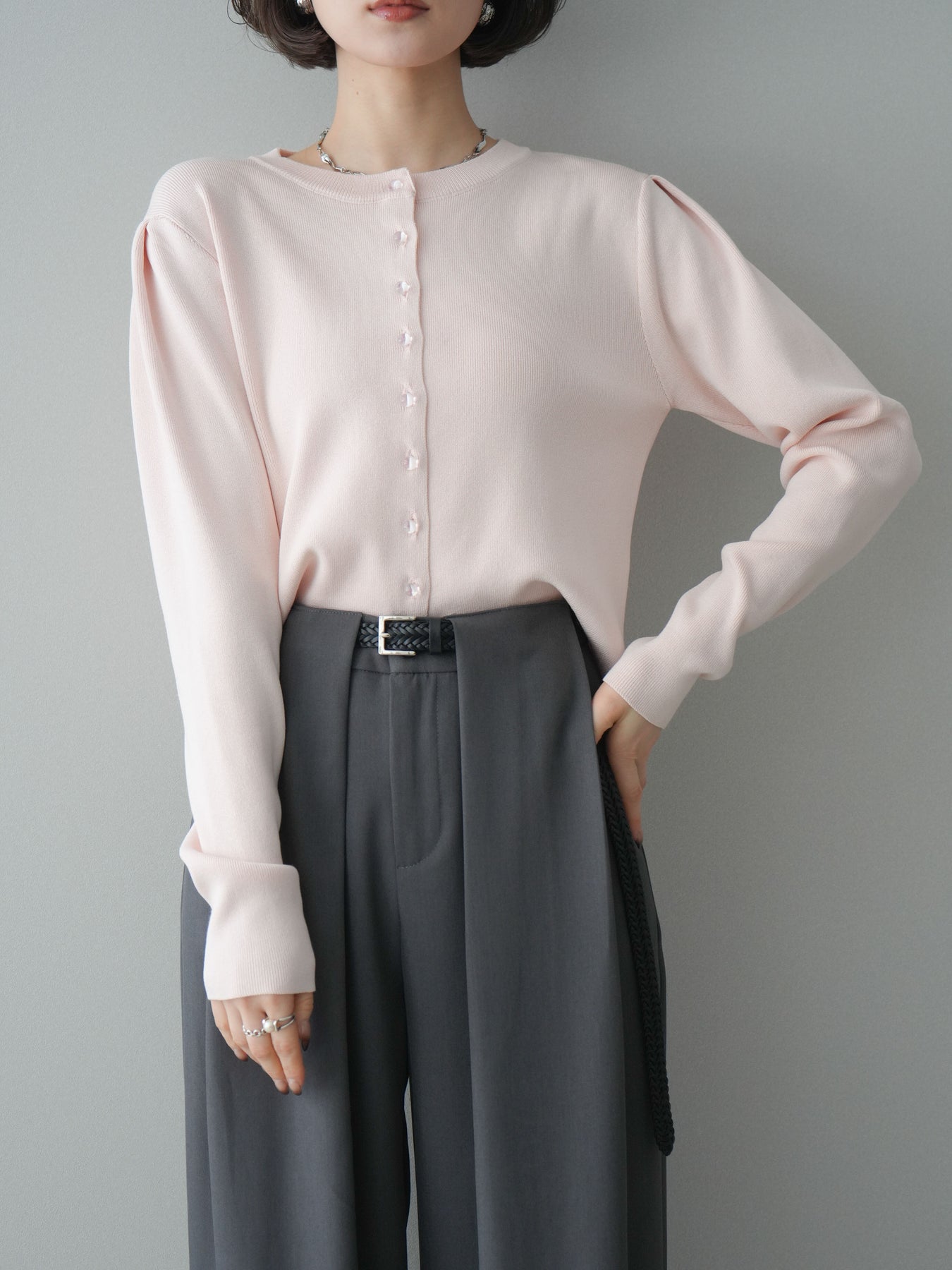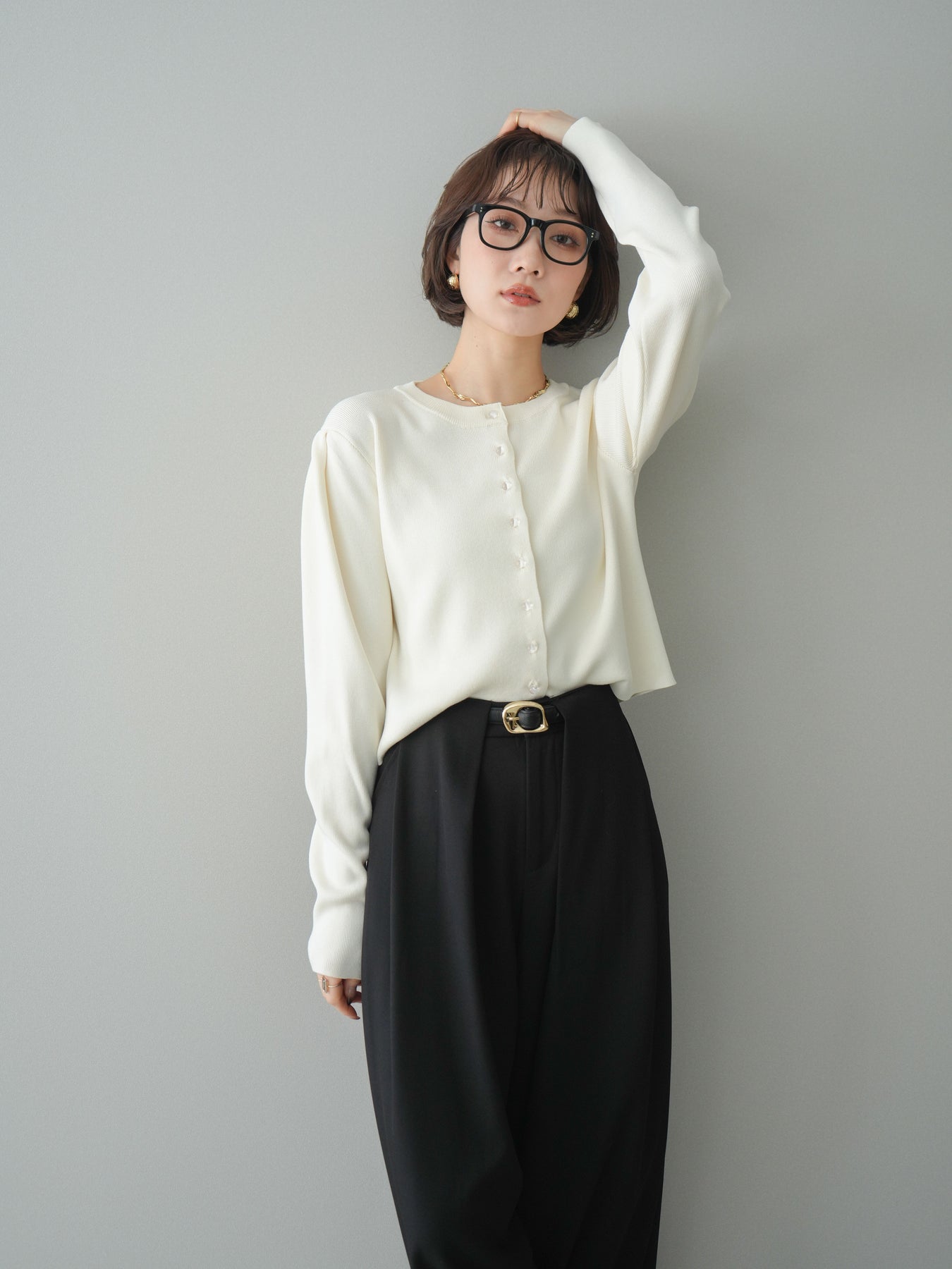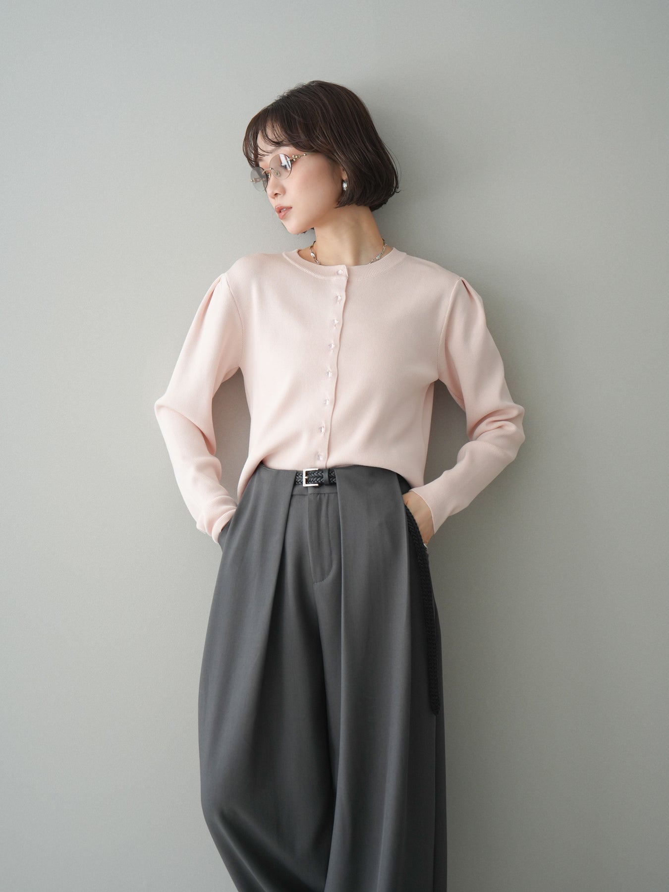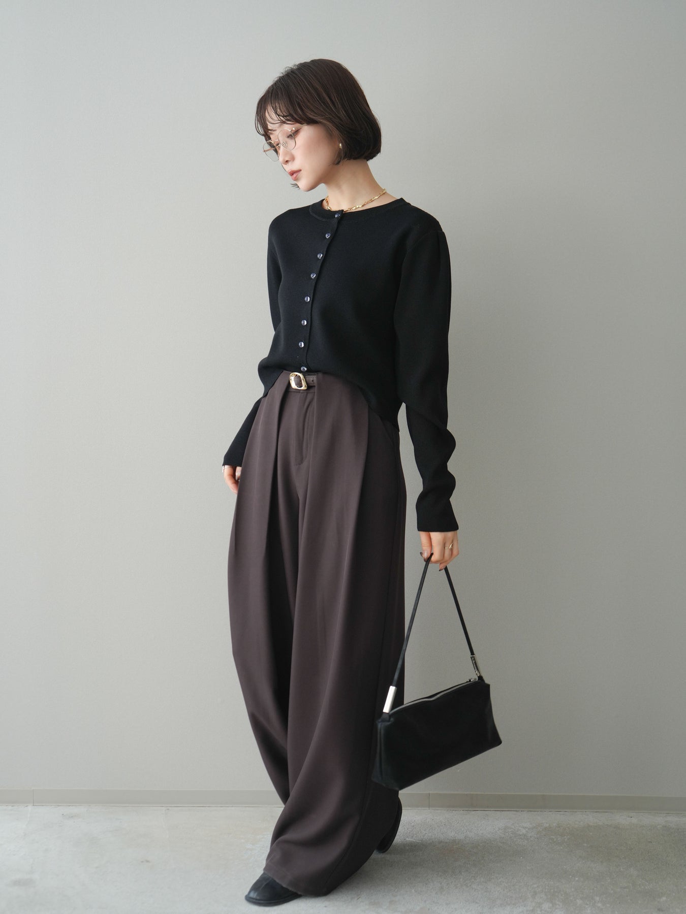 [SET]クリアボタンタックニットカーディガン+ベルトループデザインワイドパンツ(2set)