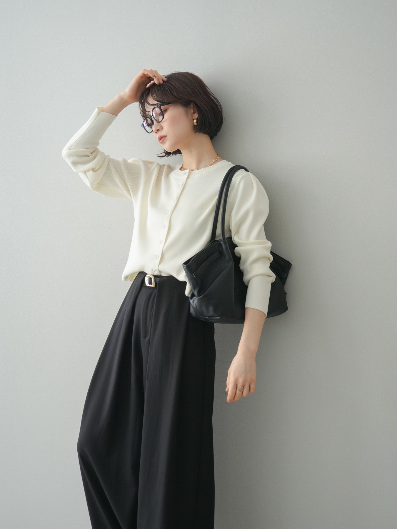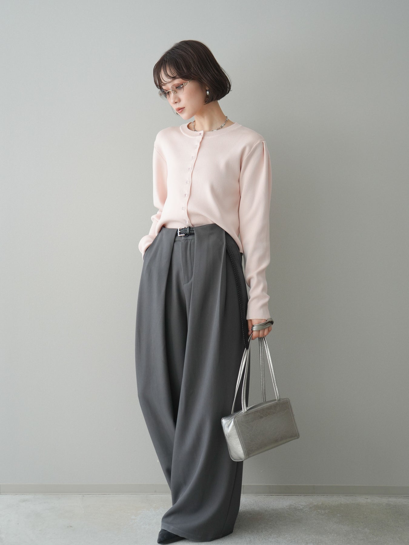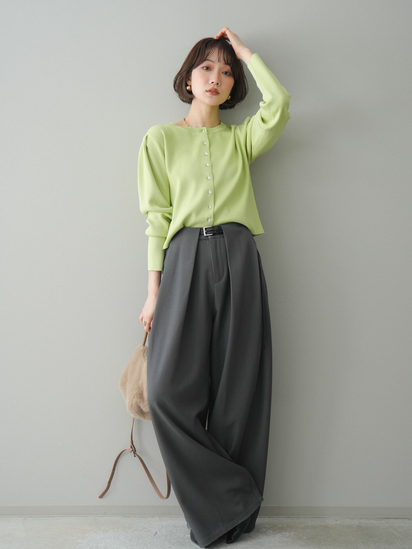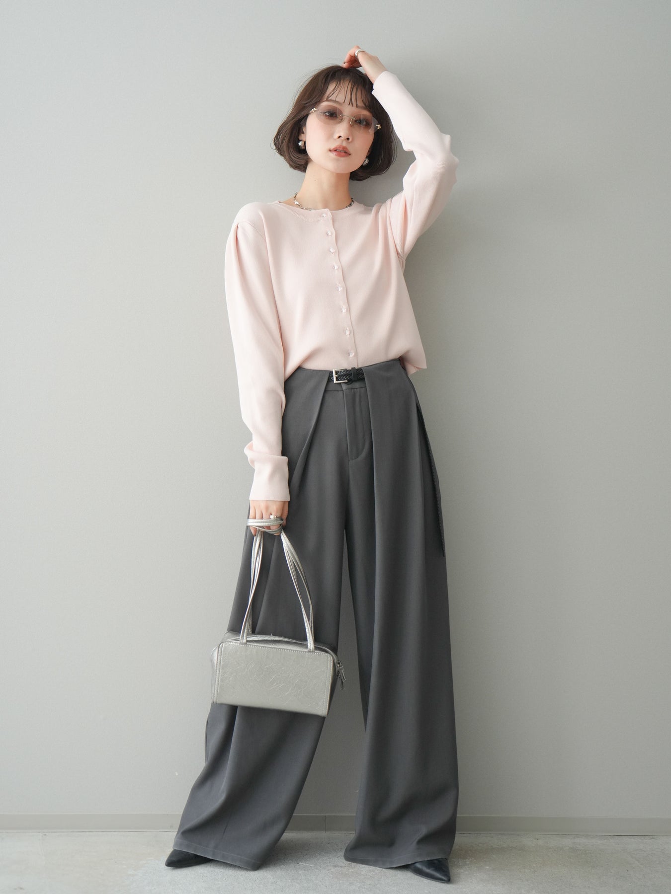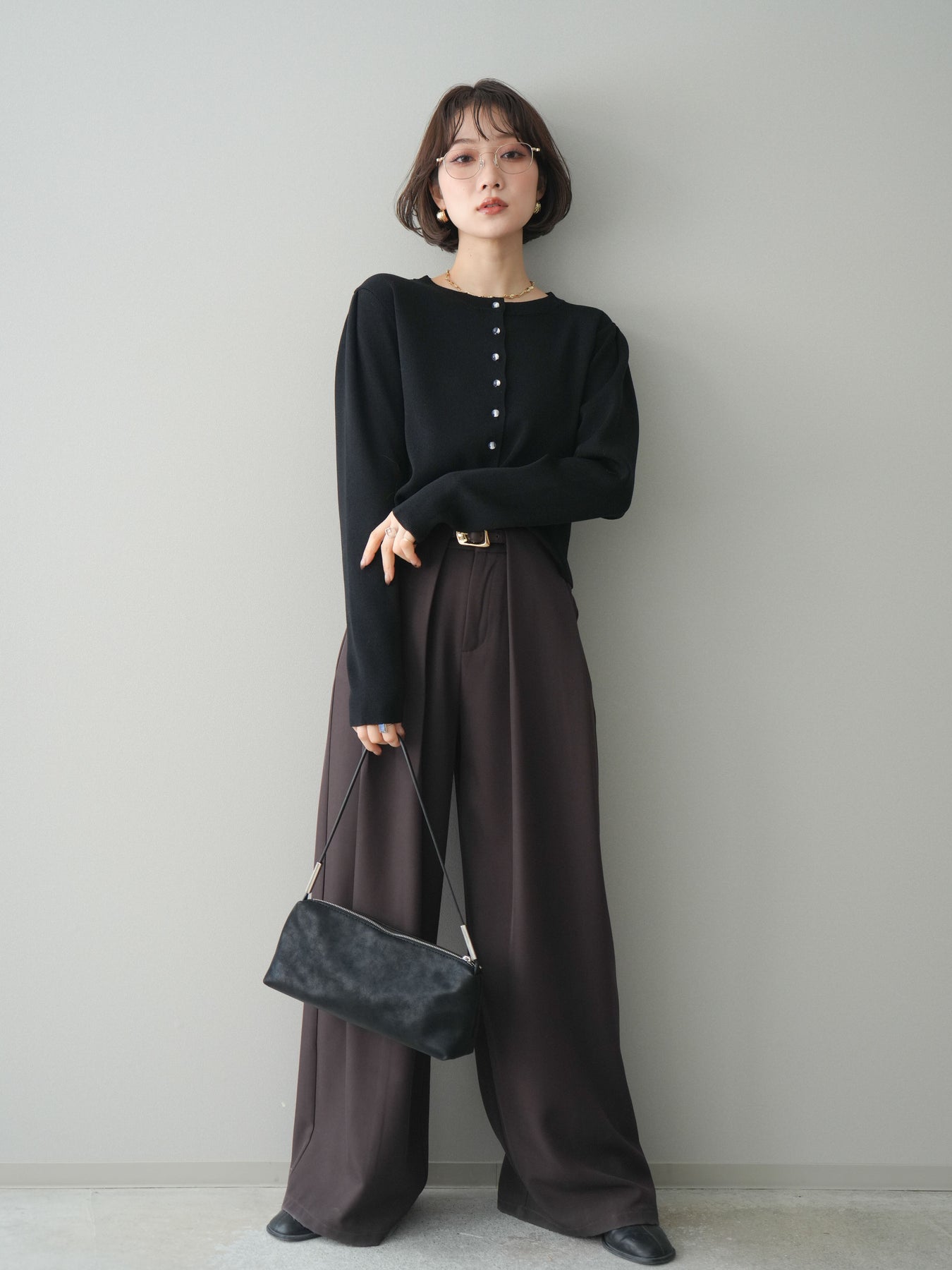 [SET]クリアボタンタックニットカーディガン+ベルトループデザインワイドパンツ(2set)