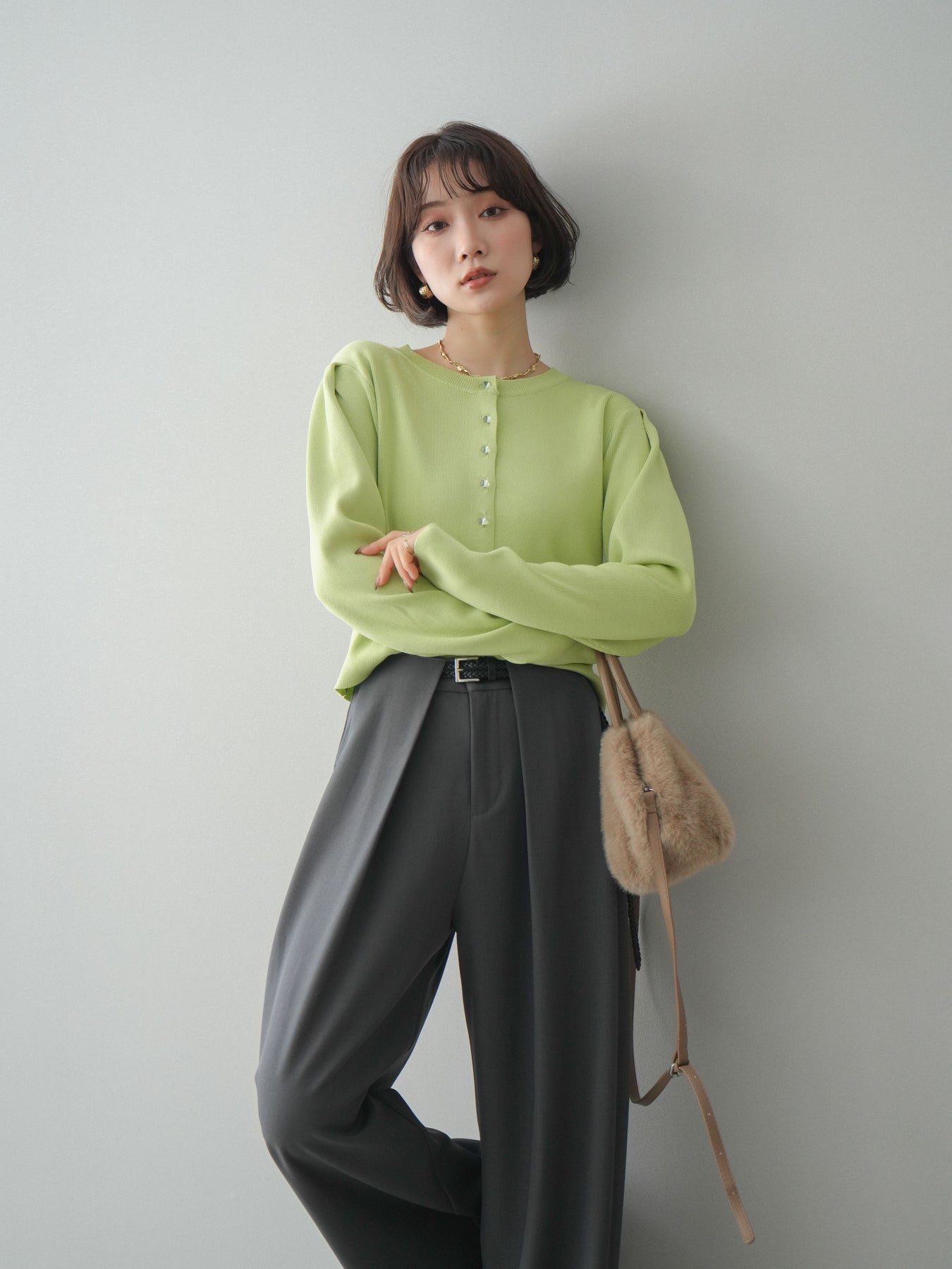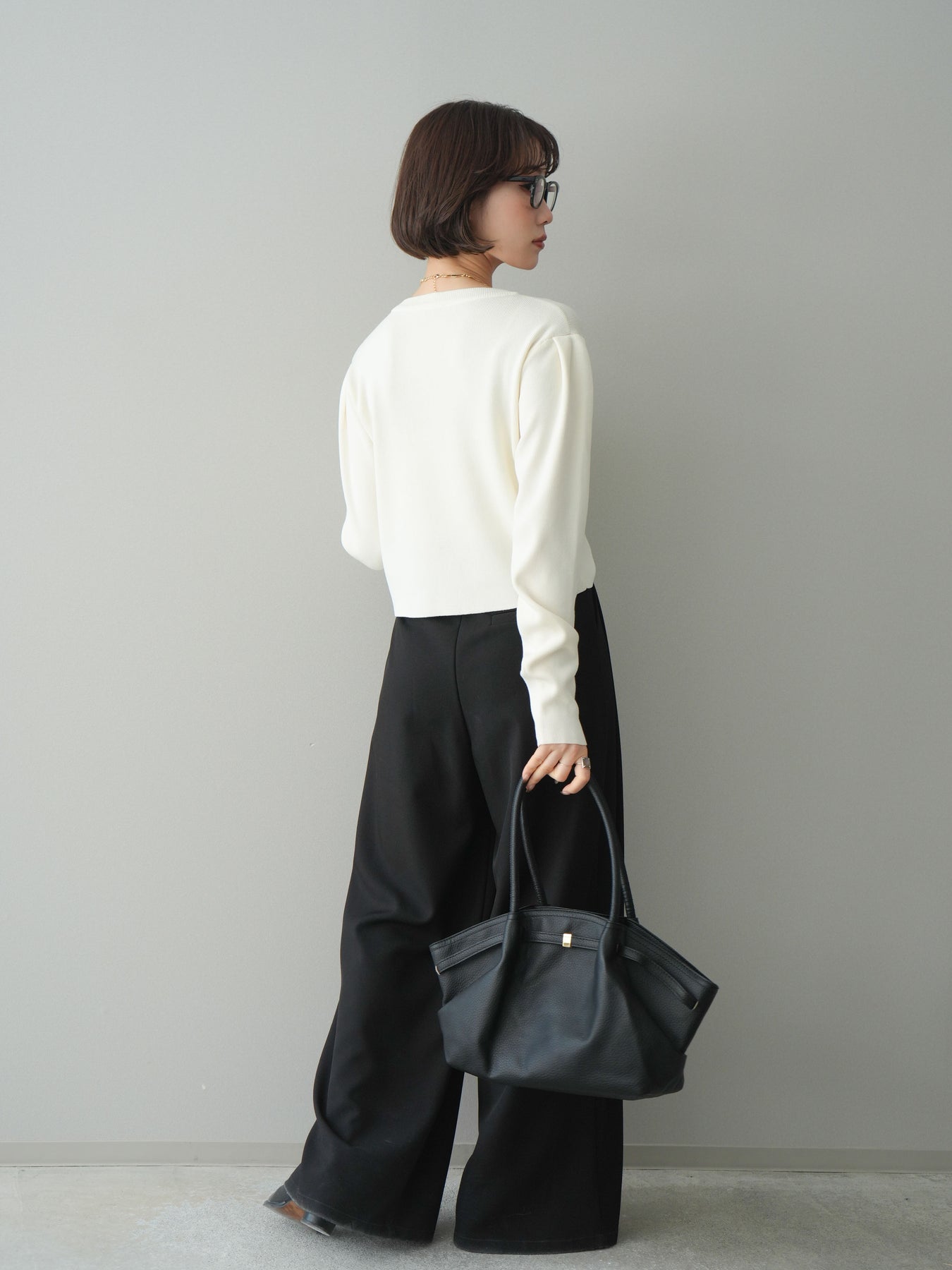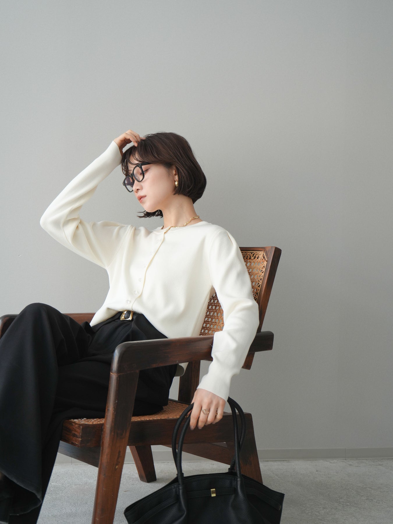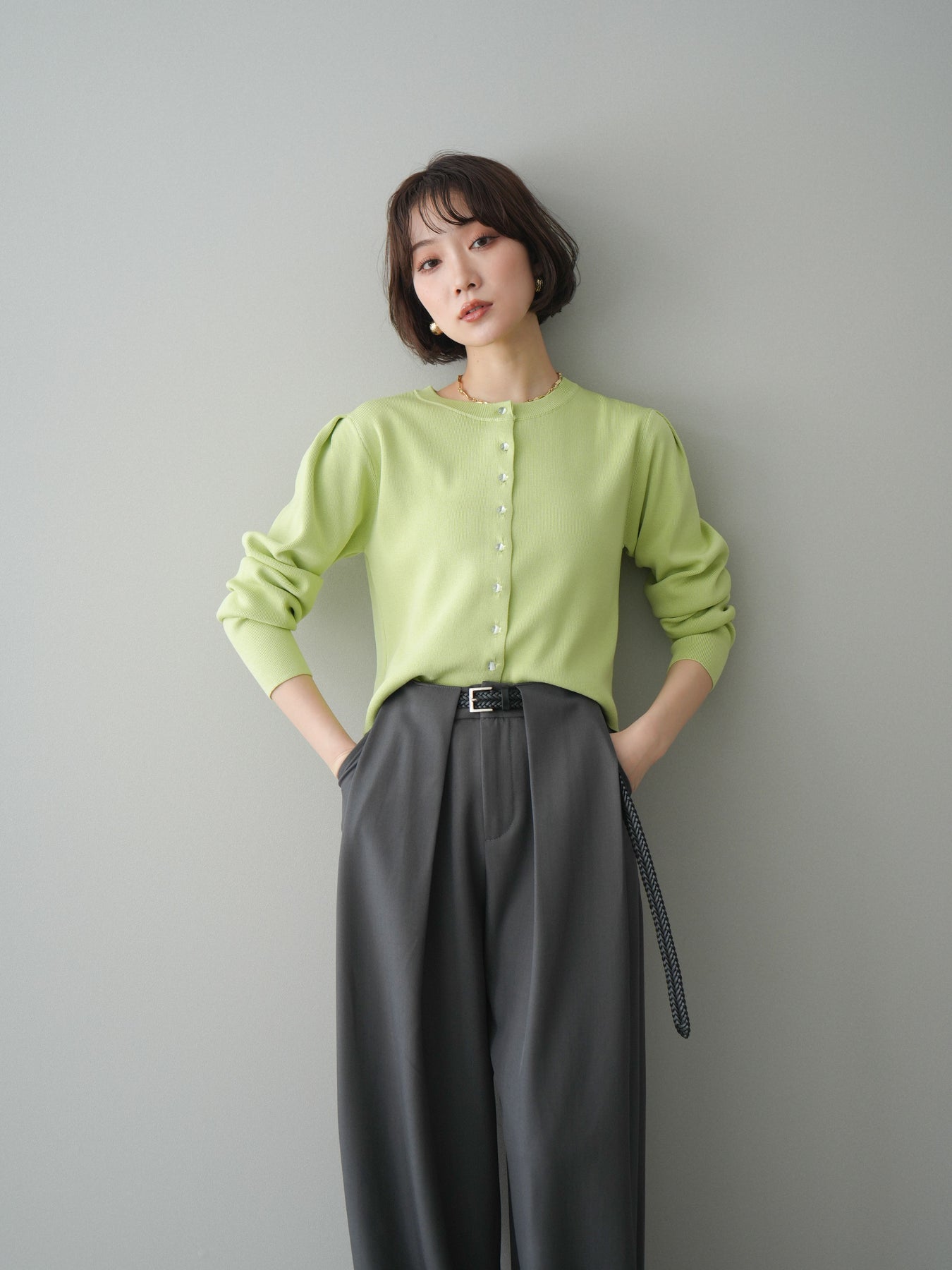 [SET]クリアボタンタックニットカーディガン+ベルトループデザインワイドパンツ(2set)