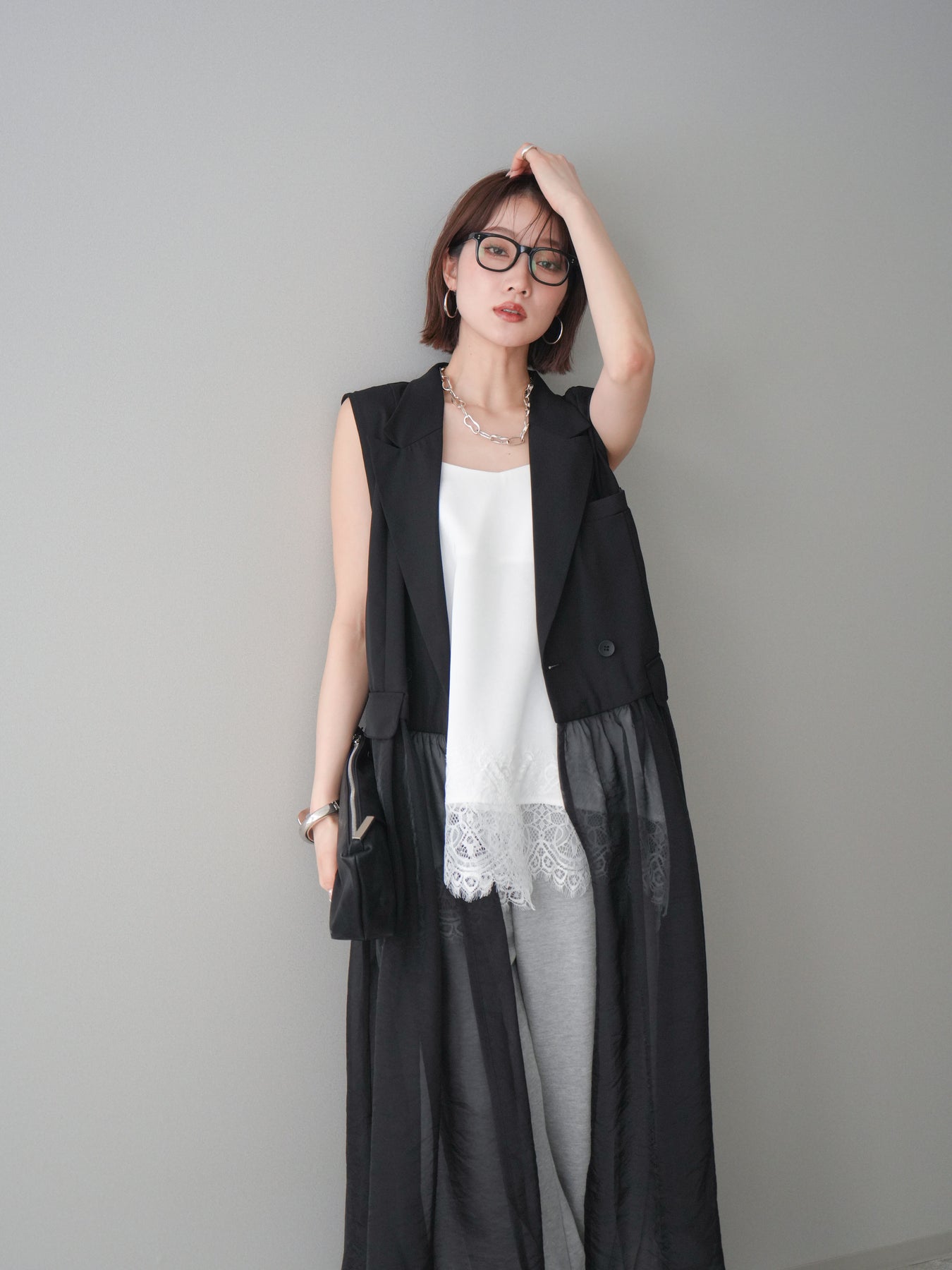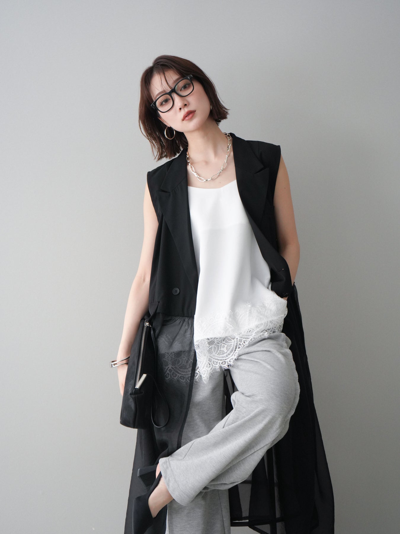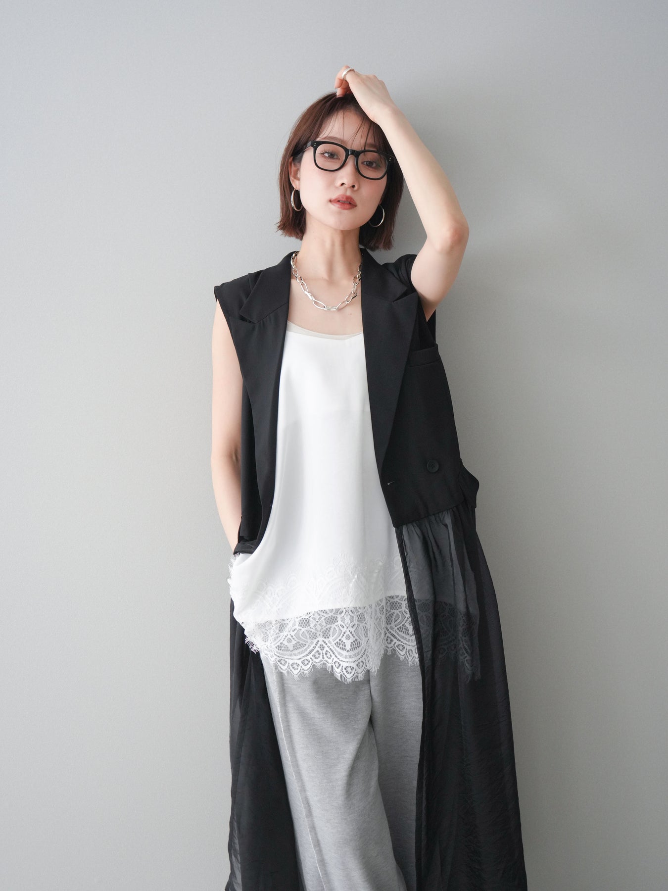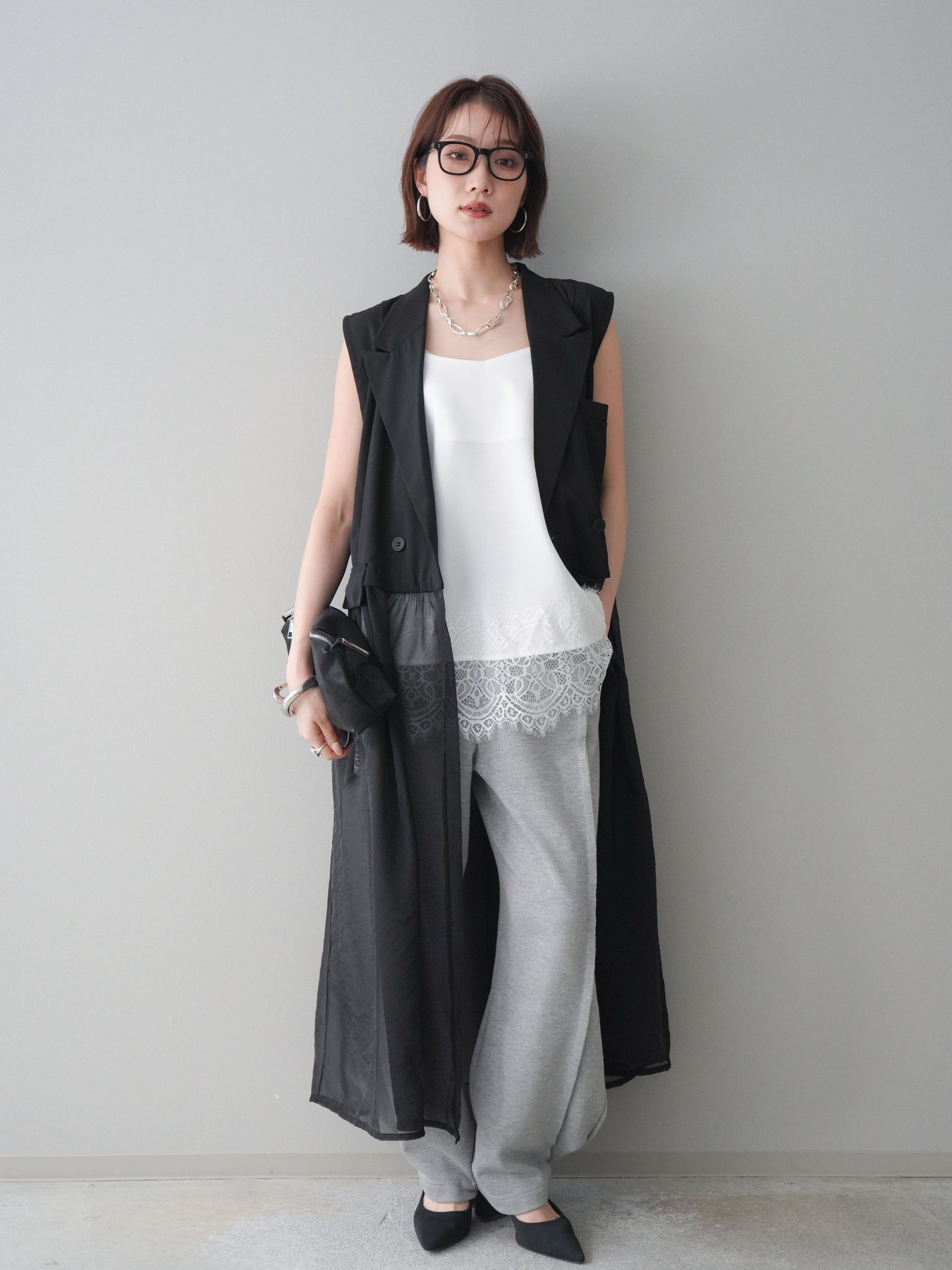 [SET]シアーレイヤードテーラードロングジレ+レーストリムキャミソール+2WAYデザインスウェットパンツ(3set)