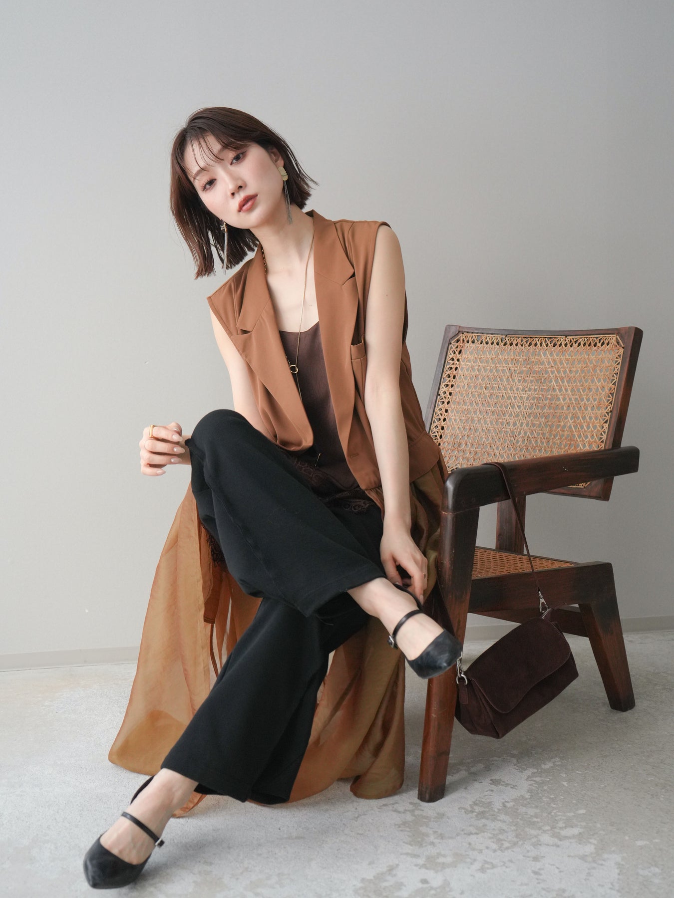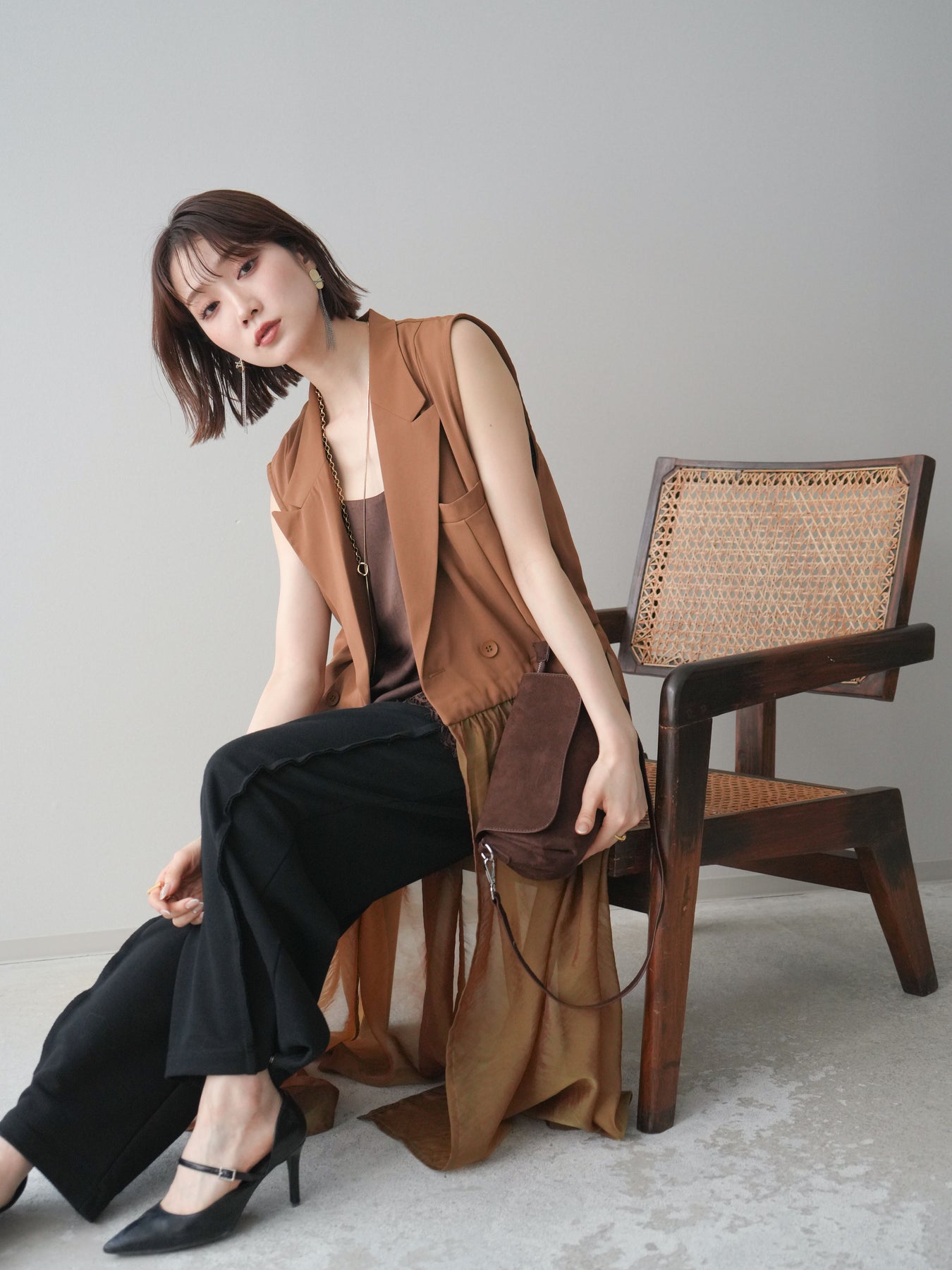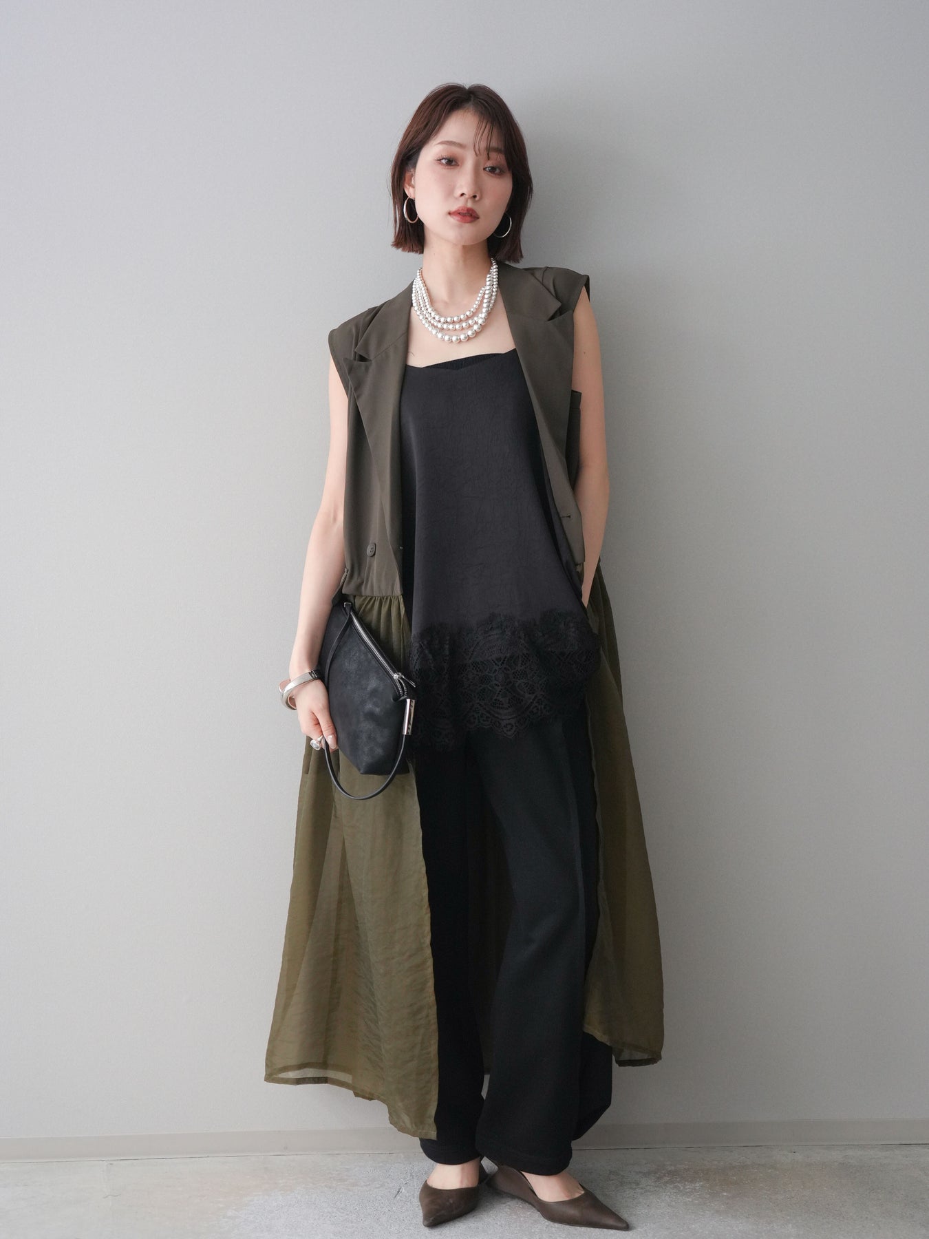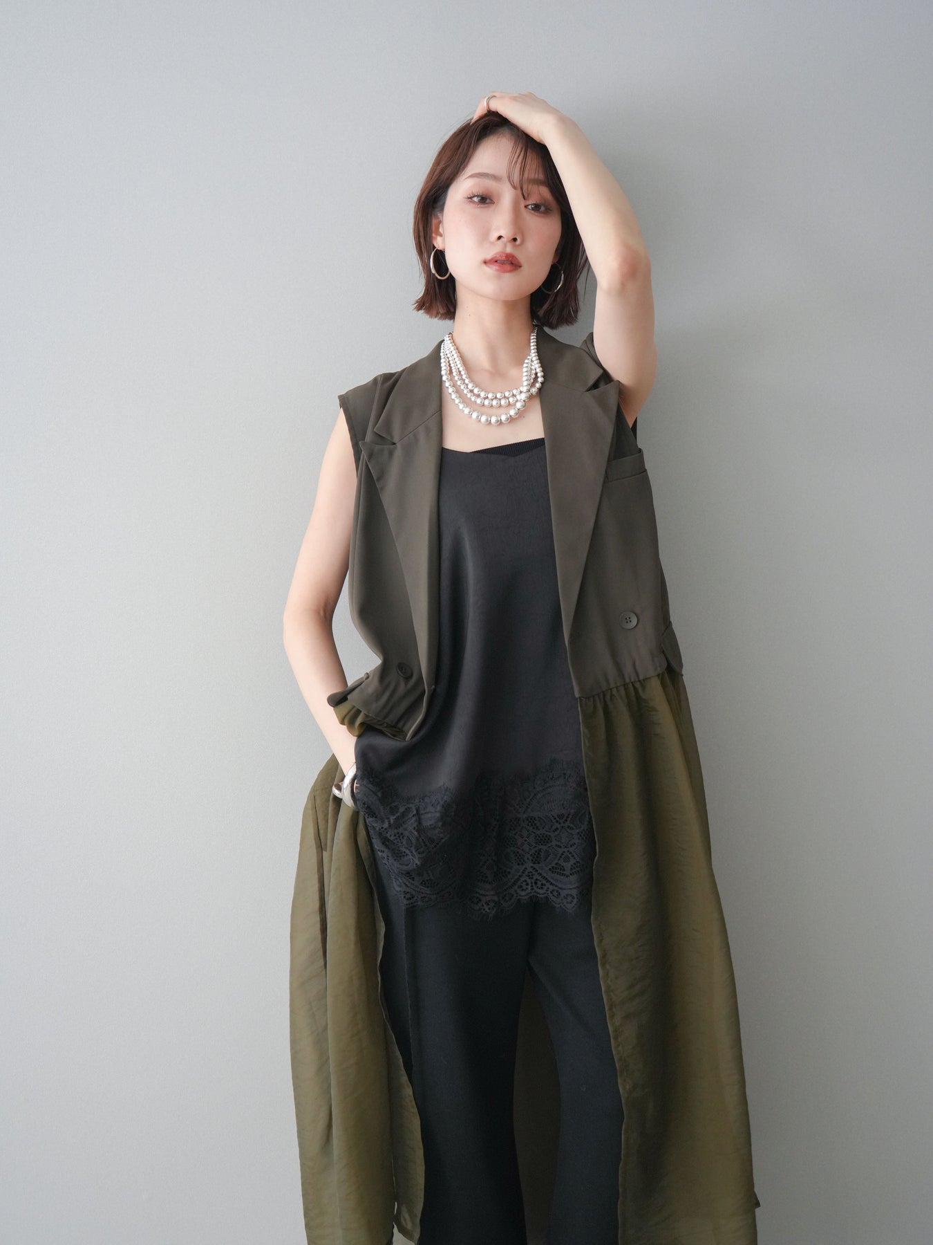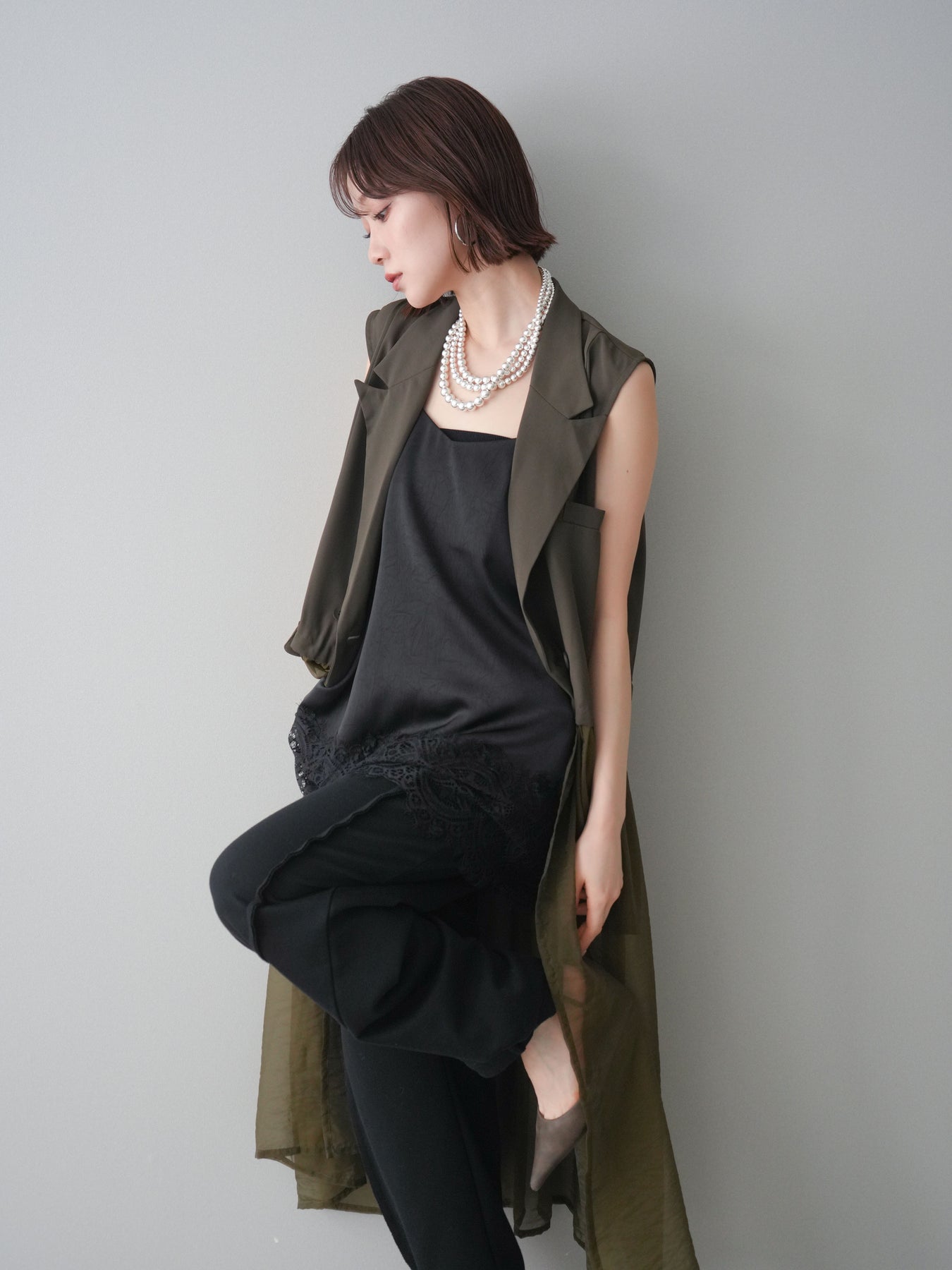 [SET]シアーレイヤードテーラードロングジレ+レーストリムキャミソール+2WAYデザインスウェットパンツ(3set)