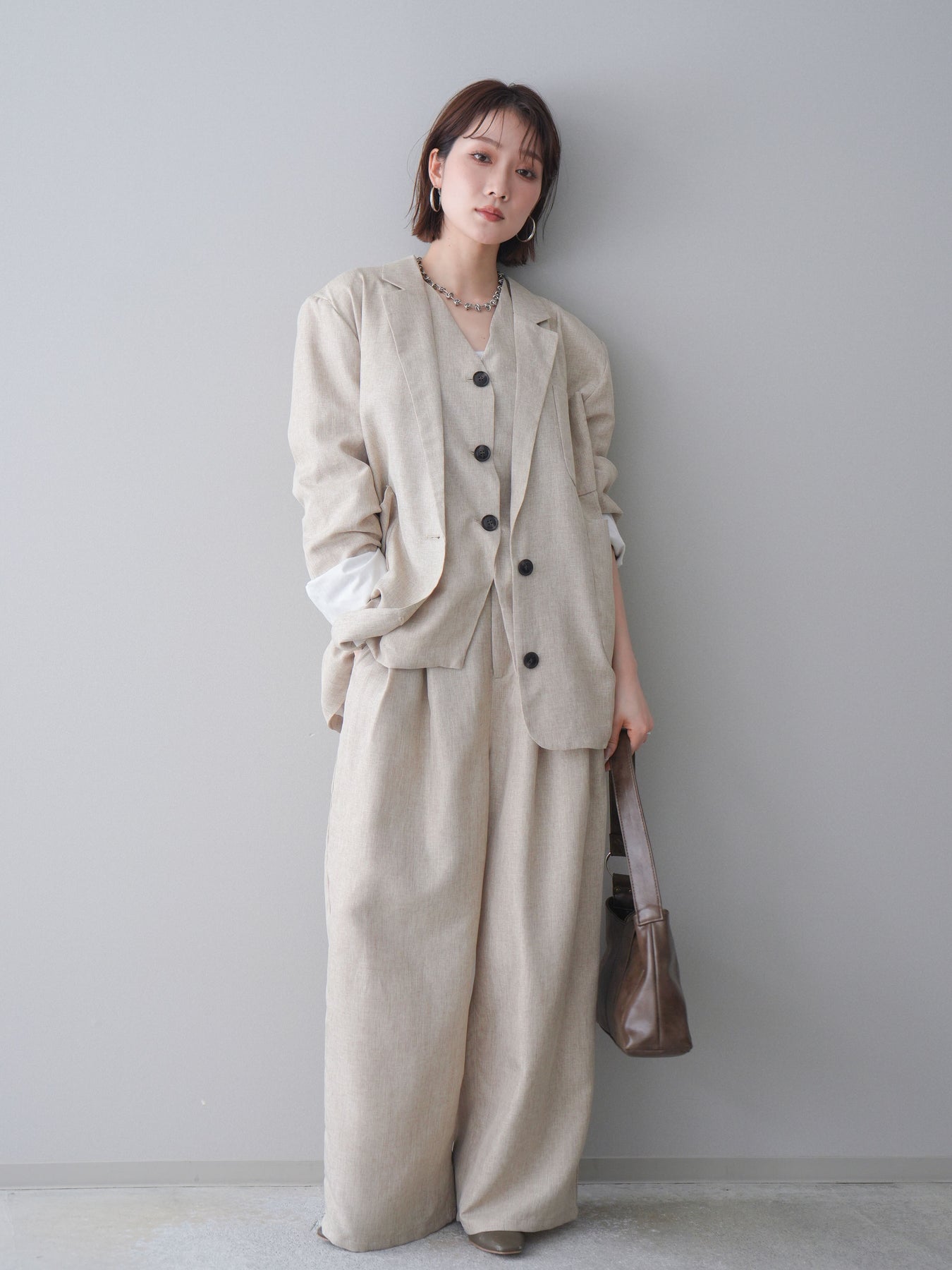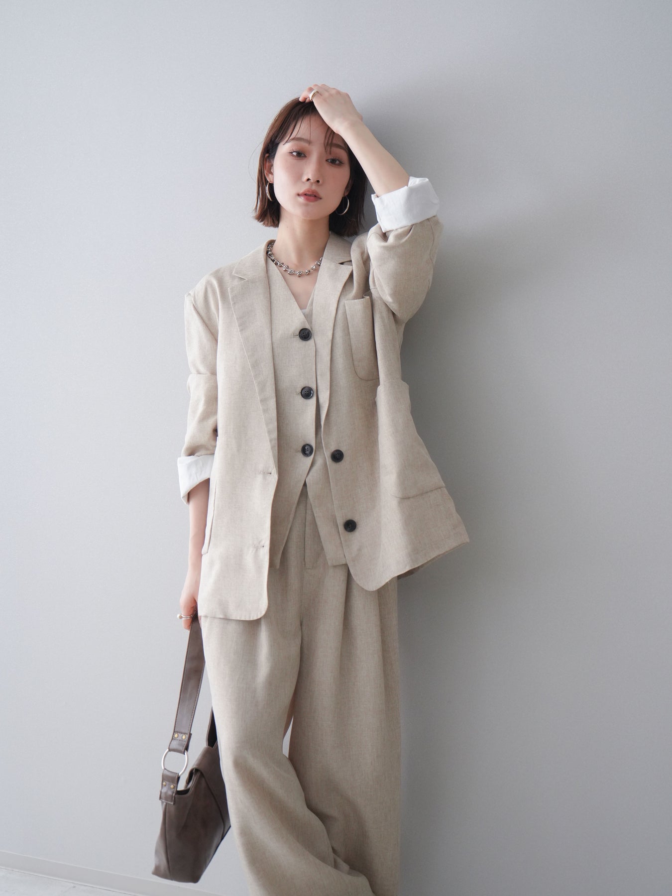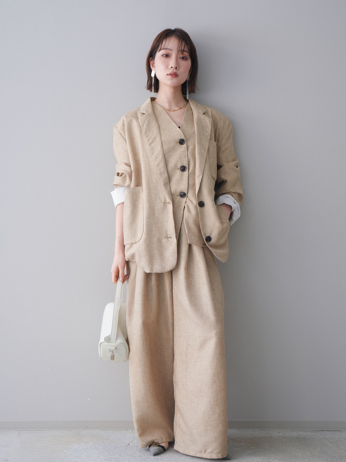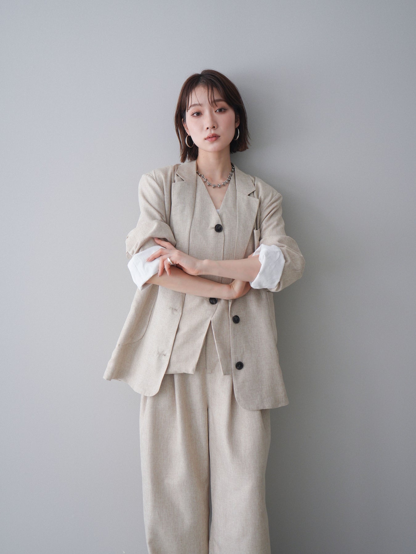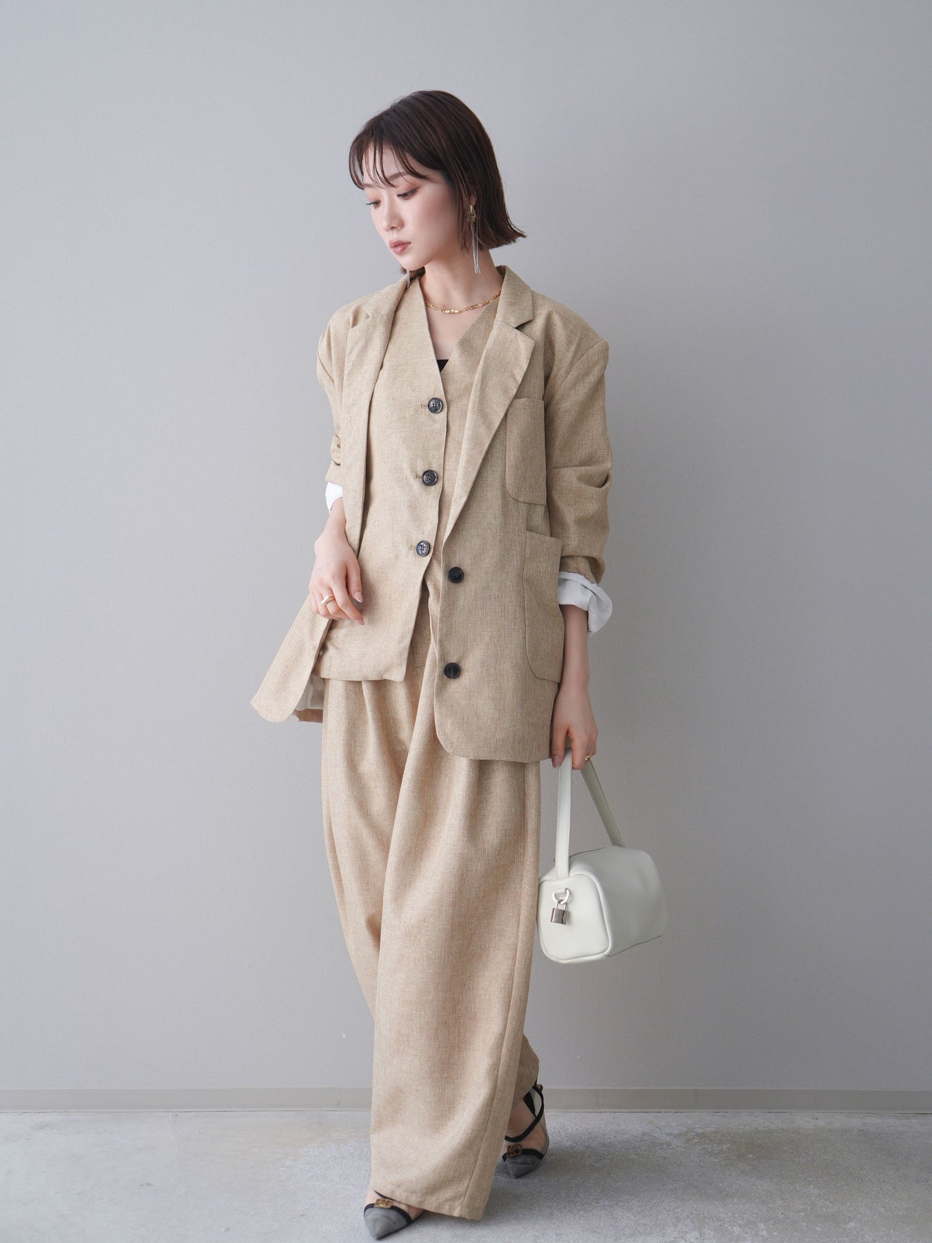 [SET]リネンライクテーラードジャケット+リネンライクバックオープンジレ+リネンライクタックワイドパンツ(3set)