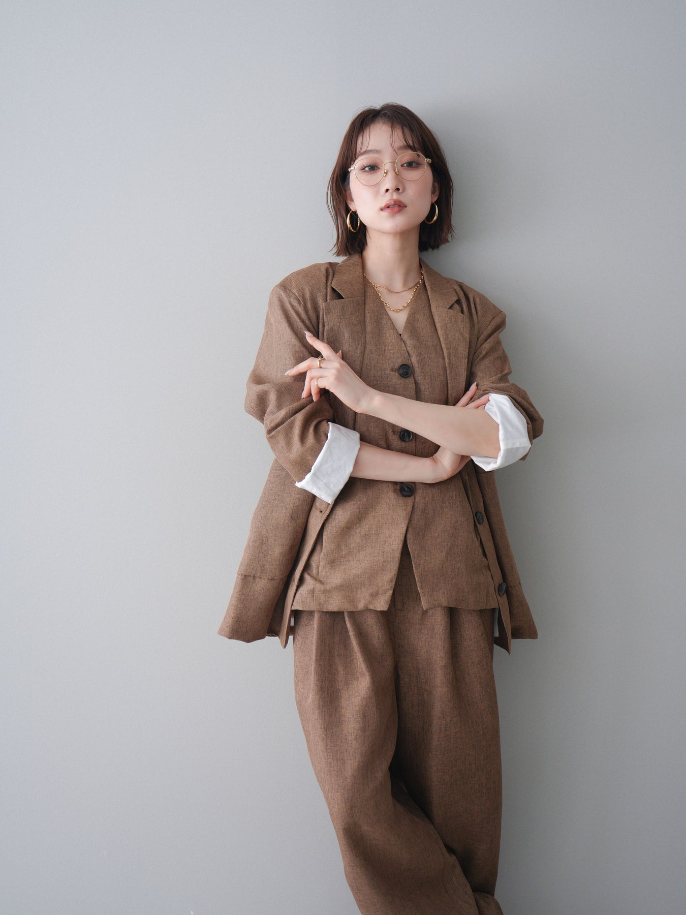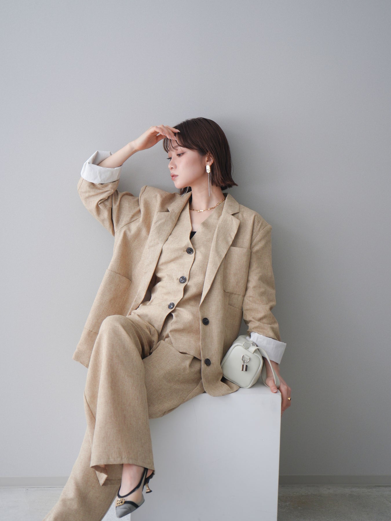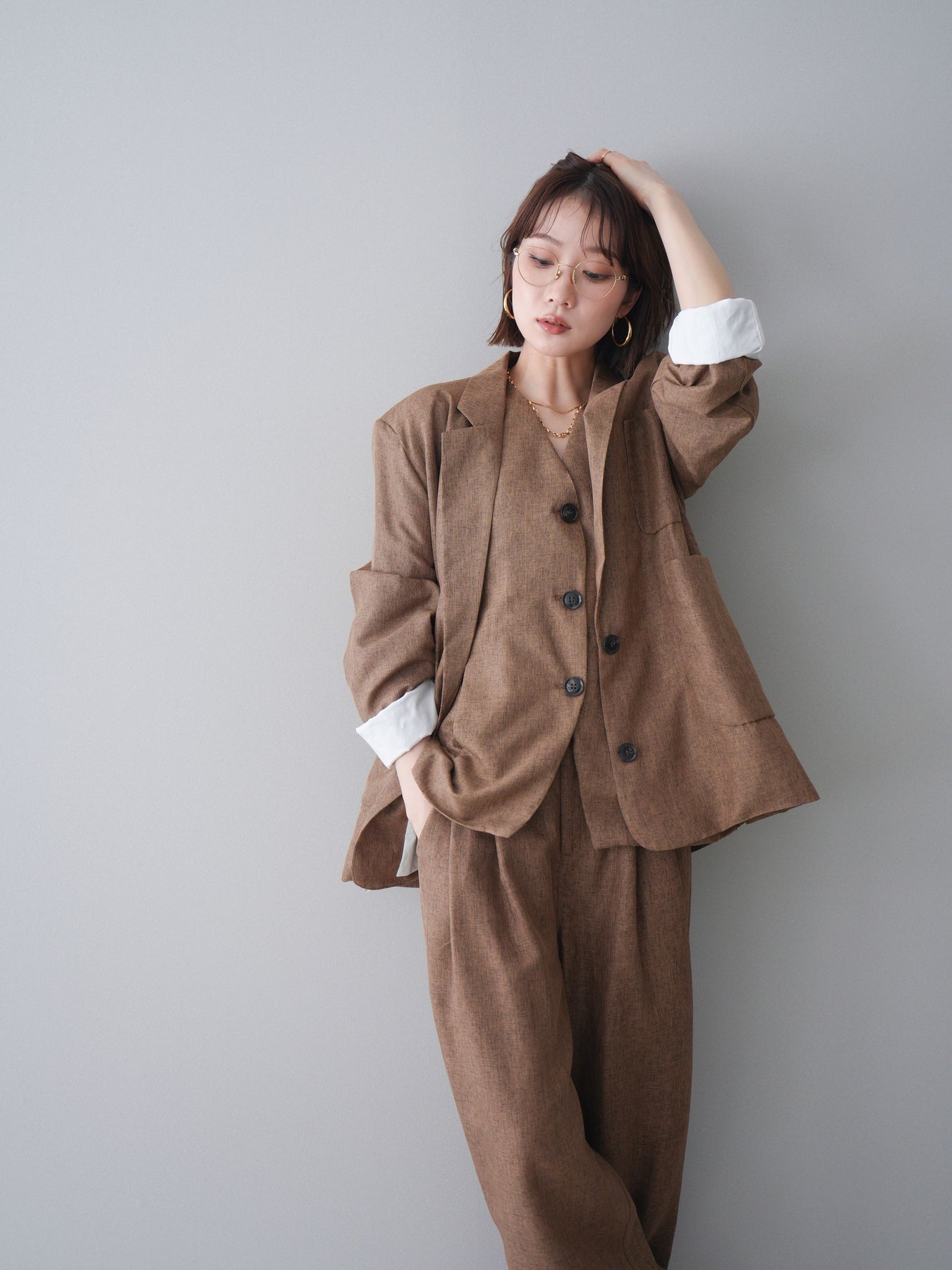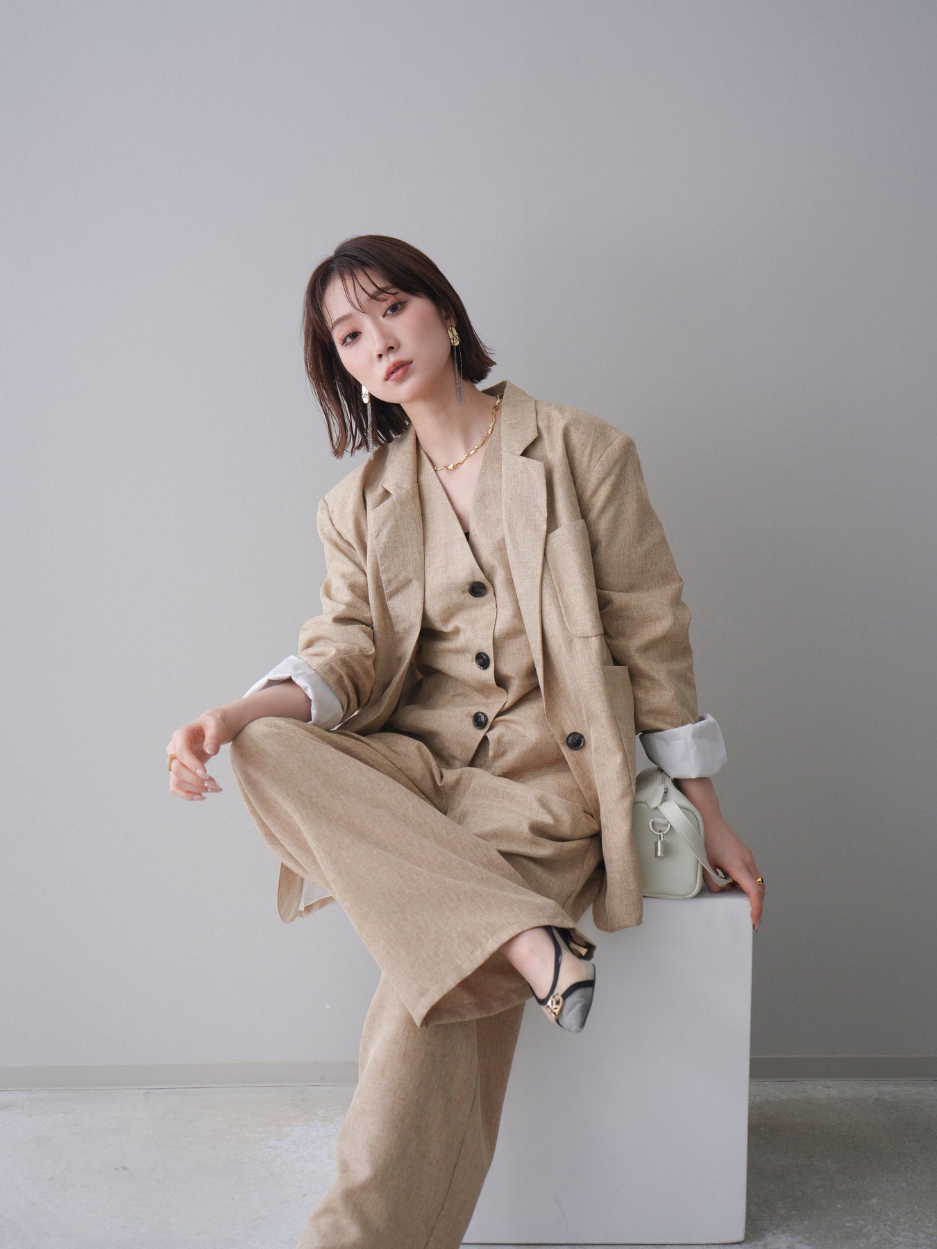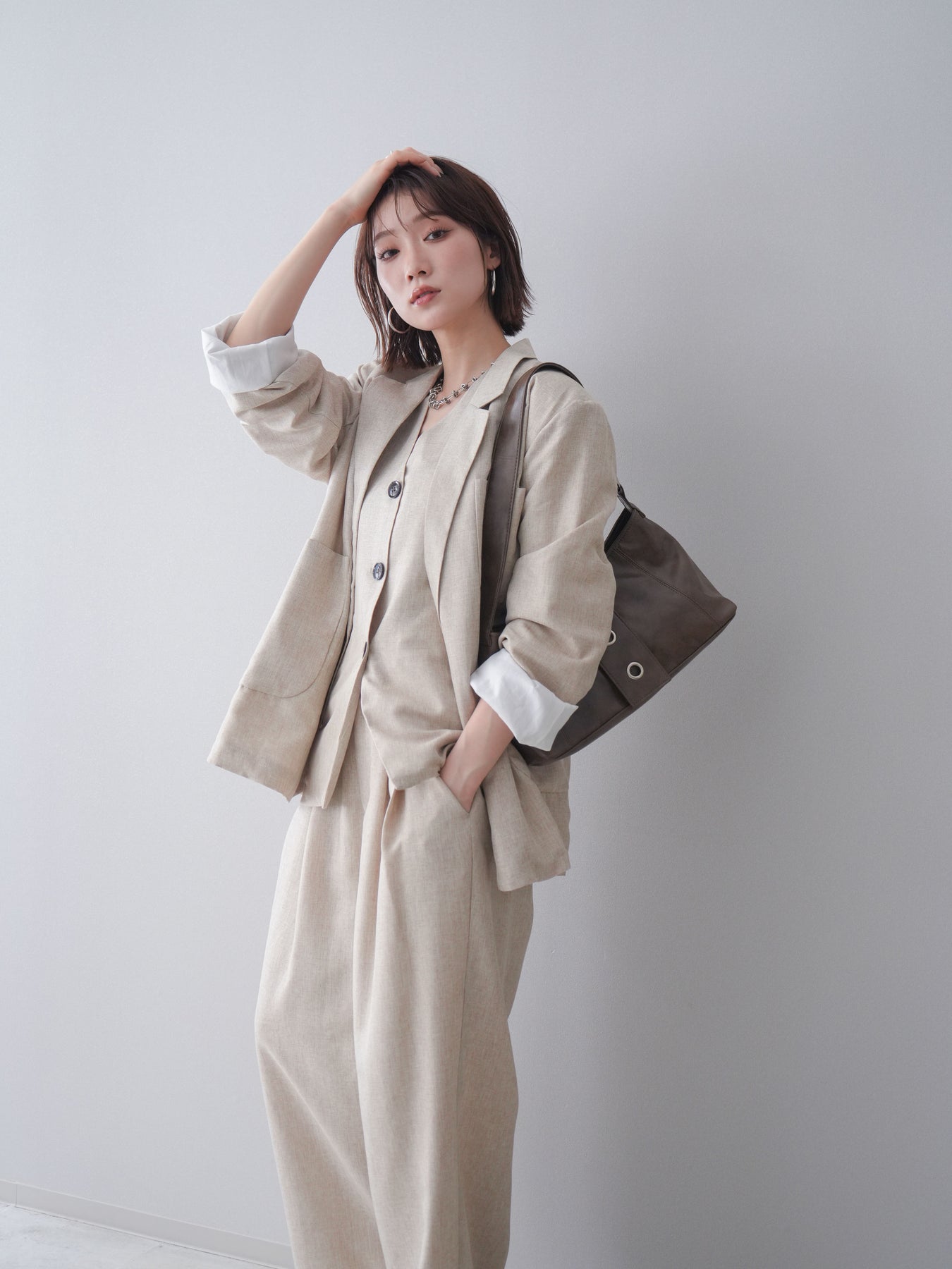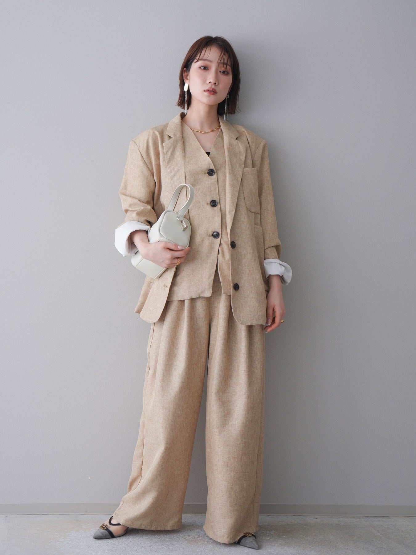 [SET]リネンライクテーラードジャケット+リネンライクバックオープンジレ+リネンライクタックワイドパンツ(3set)