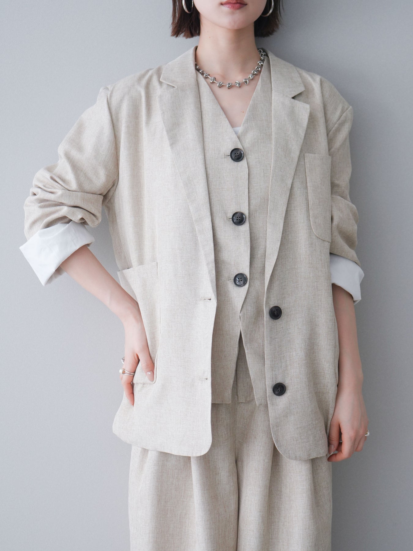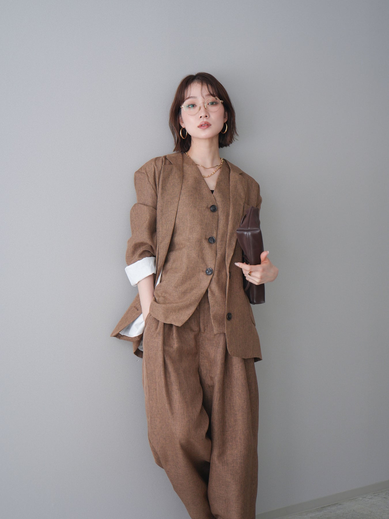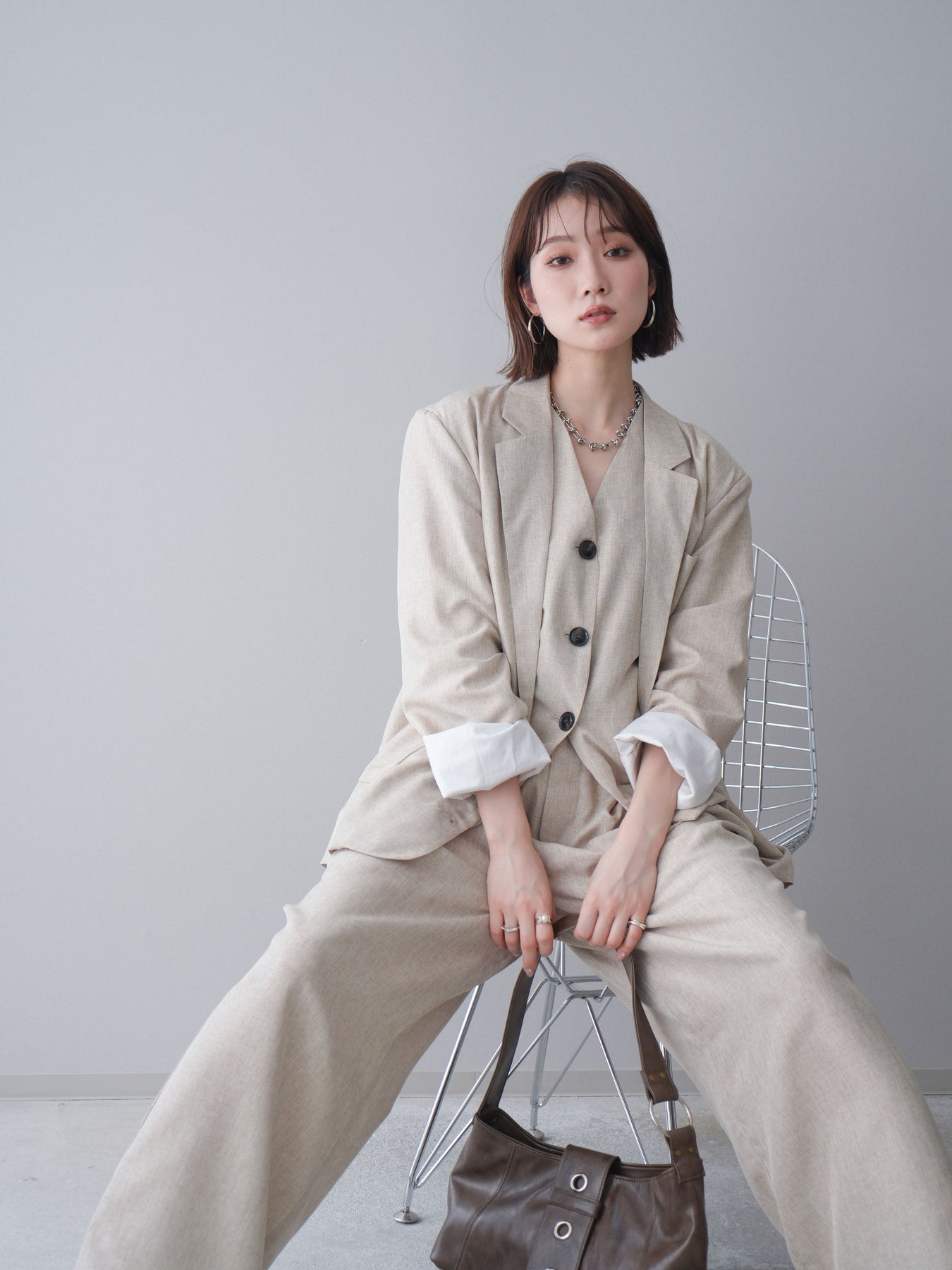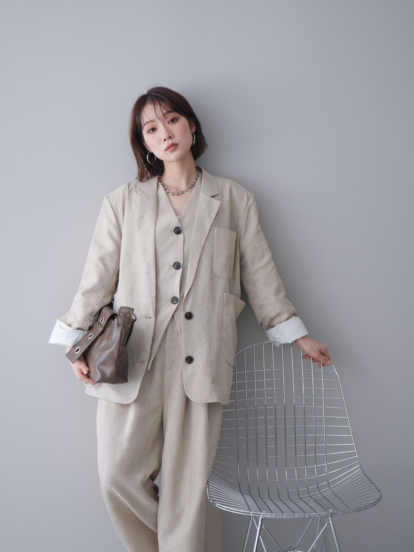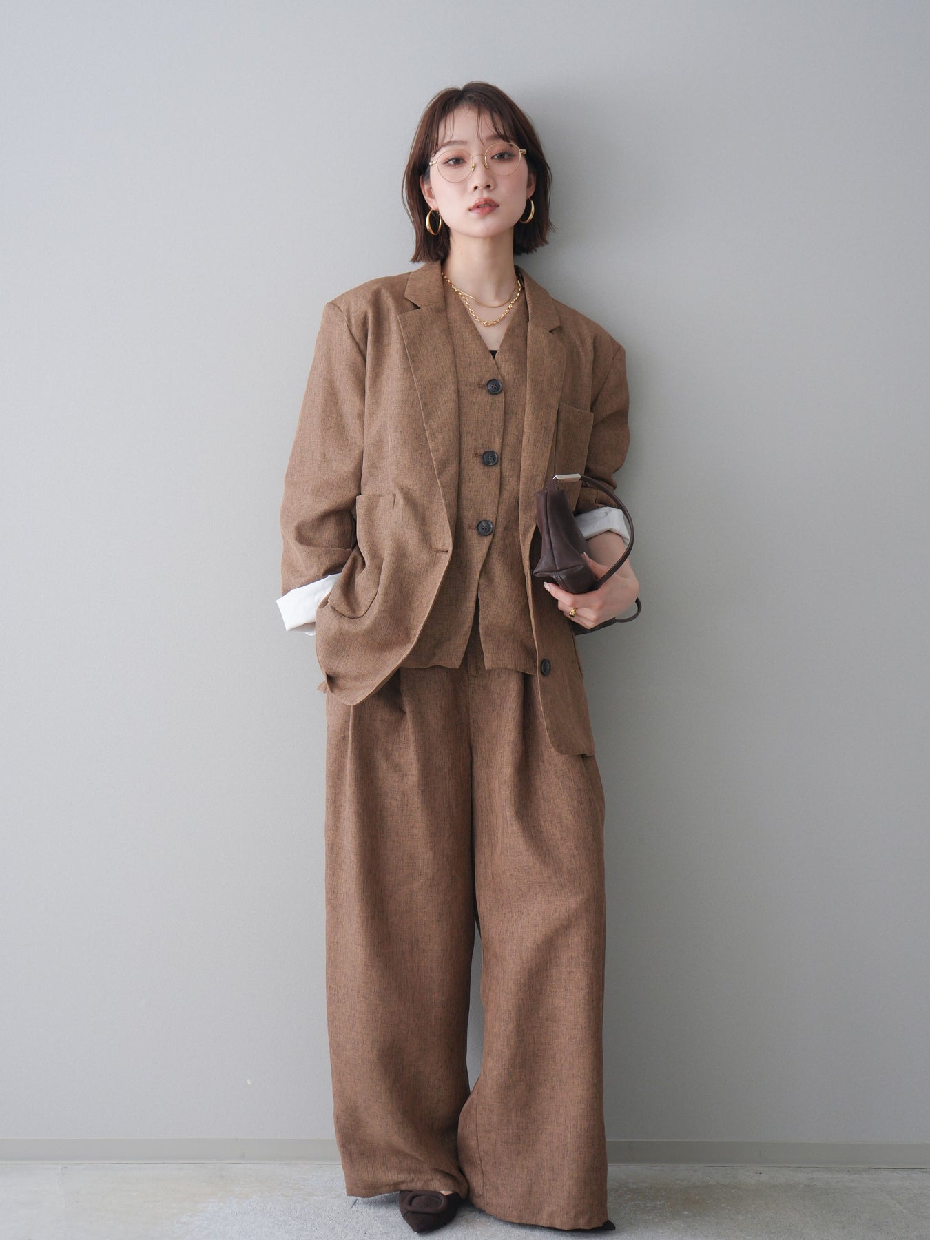 [SET]リネンライクテーラードジャケット+リネンライクバックオープンジレ+リネンライクタックワイドパンツ(3set)