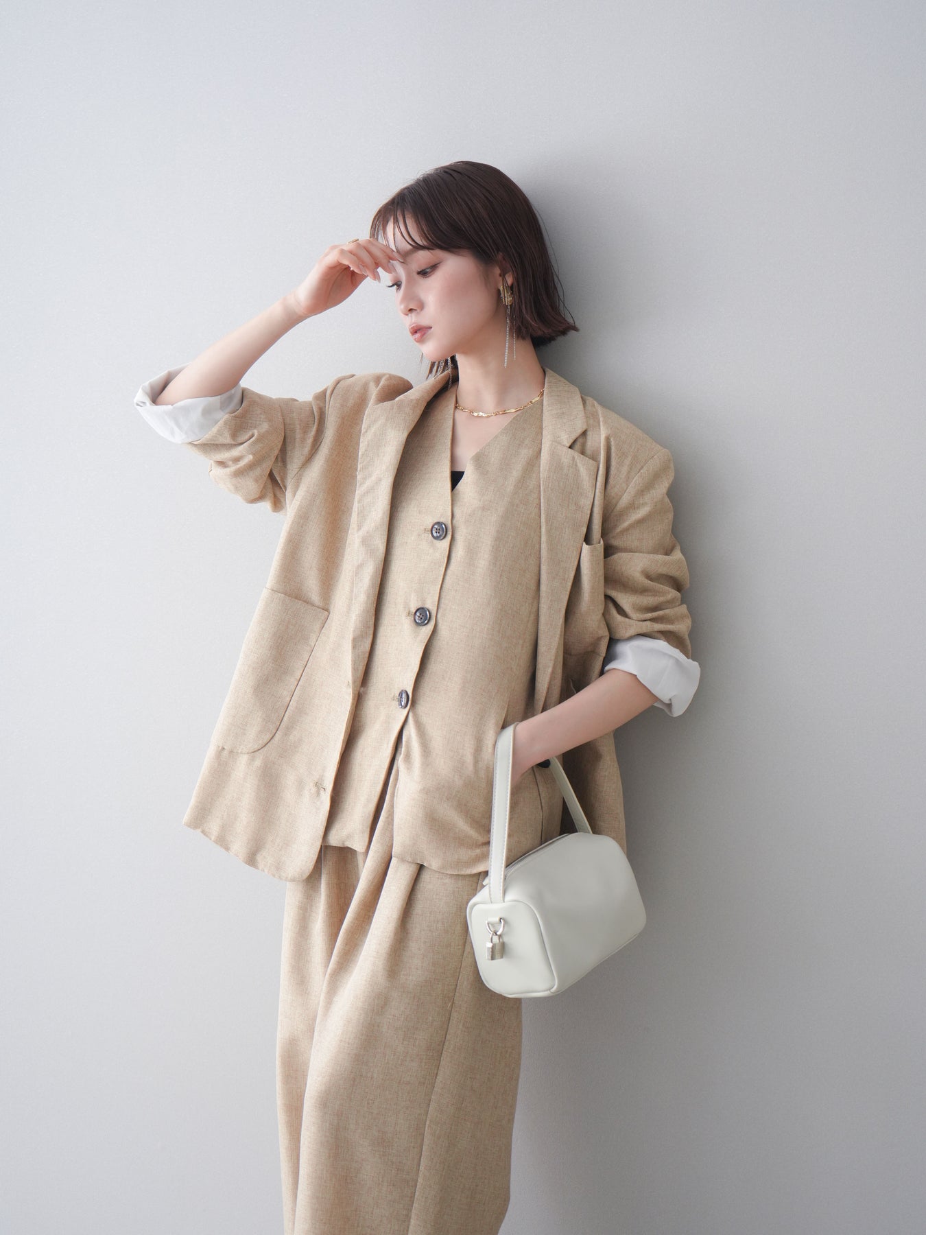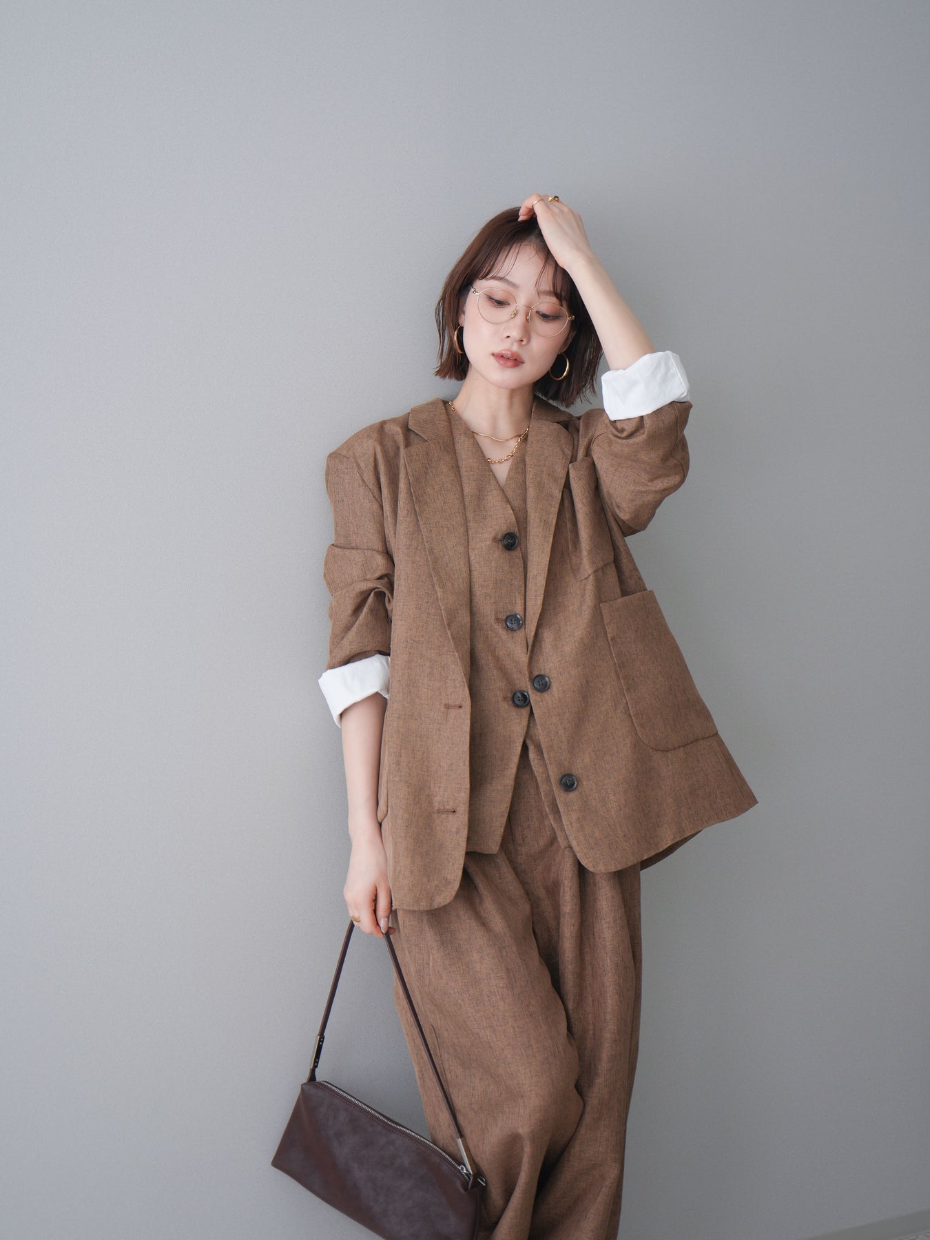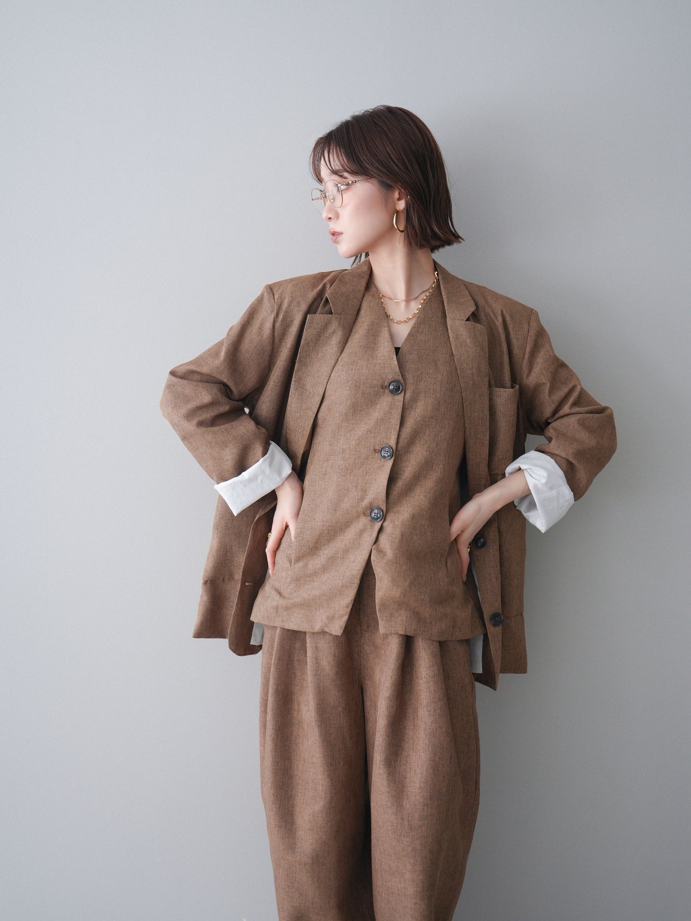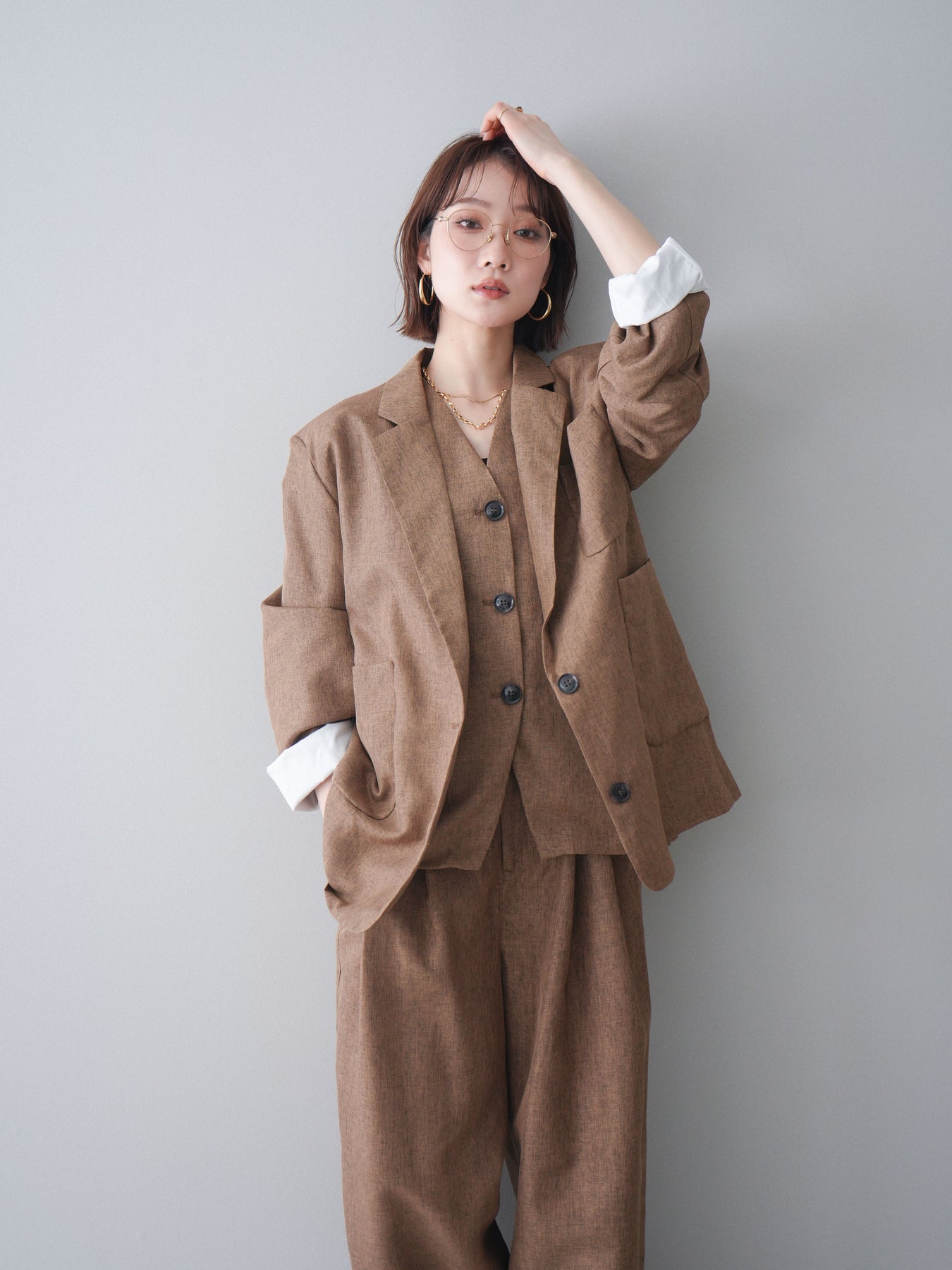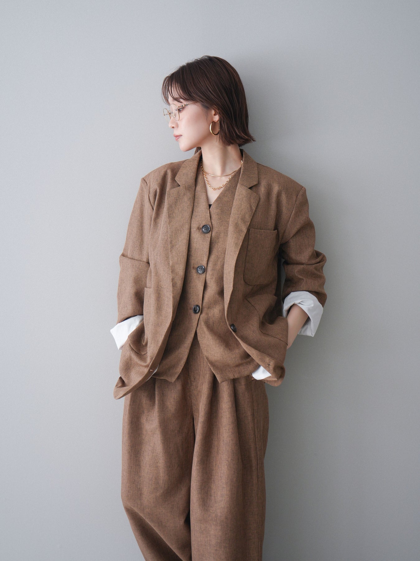 [SET]リネンライクテーラードジャケット+リネンライクバックオープンジレ+リネンライクタックワイドパンツ(3set)