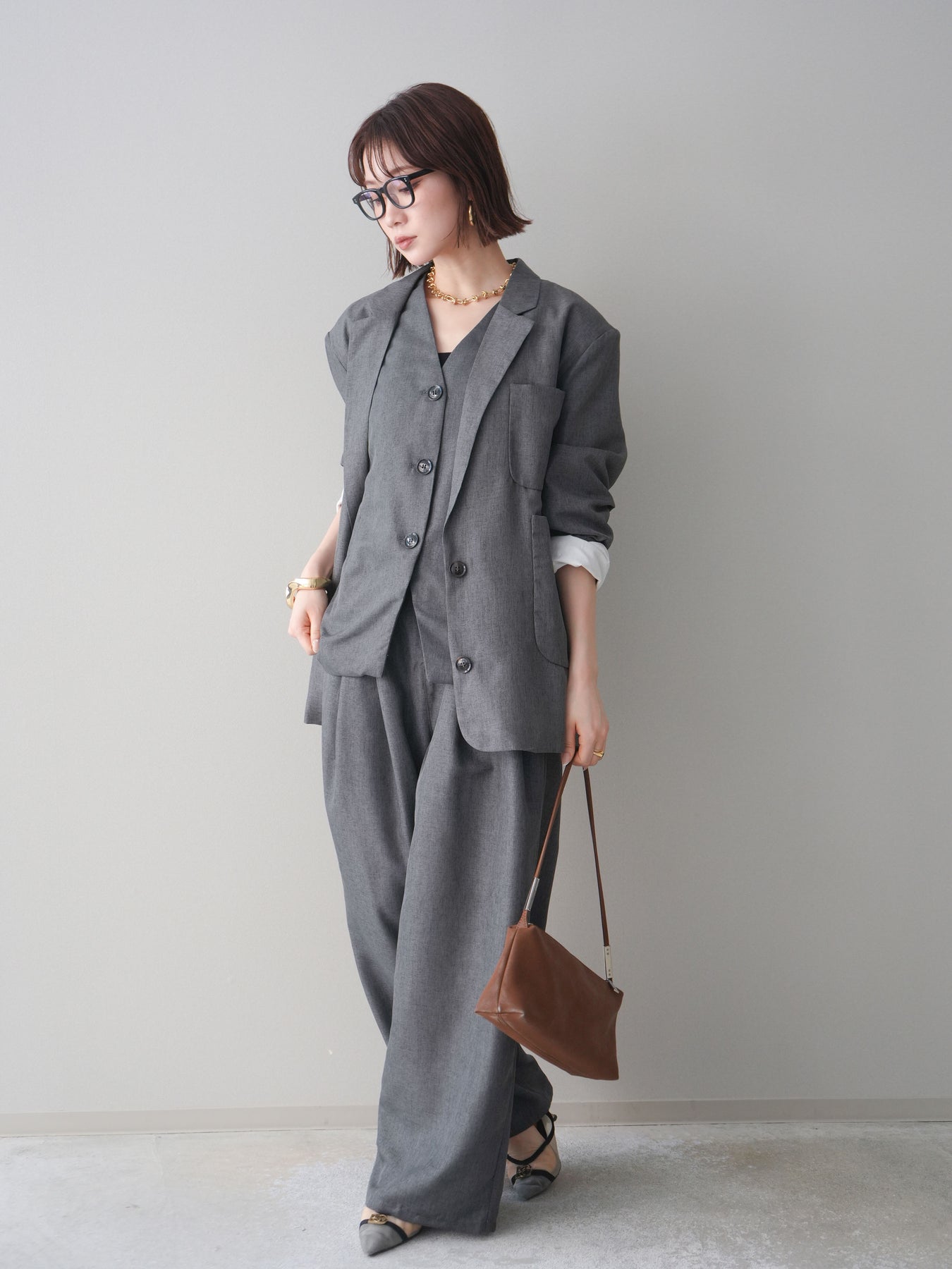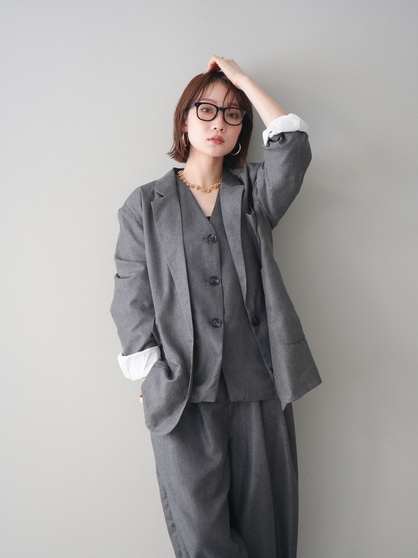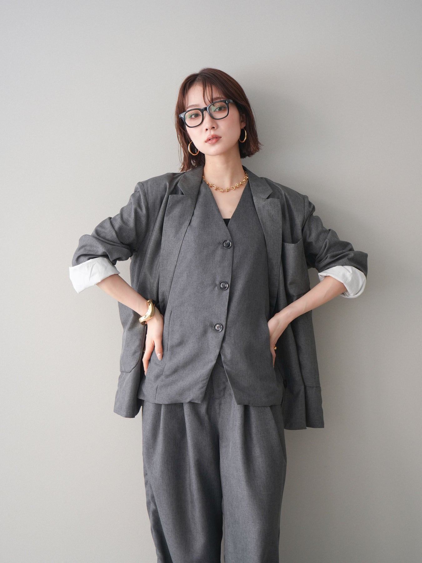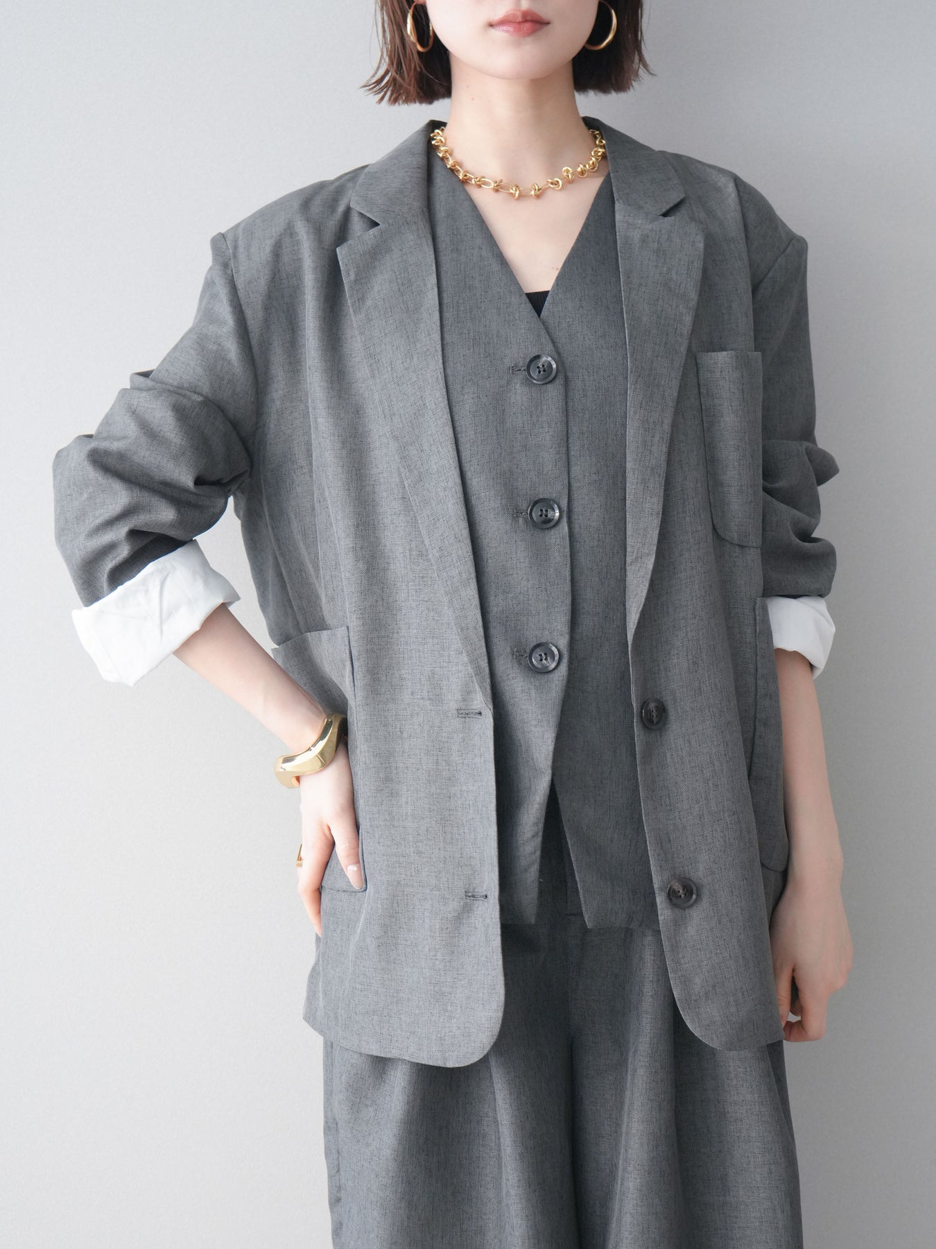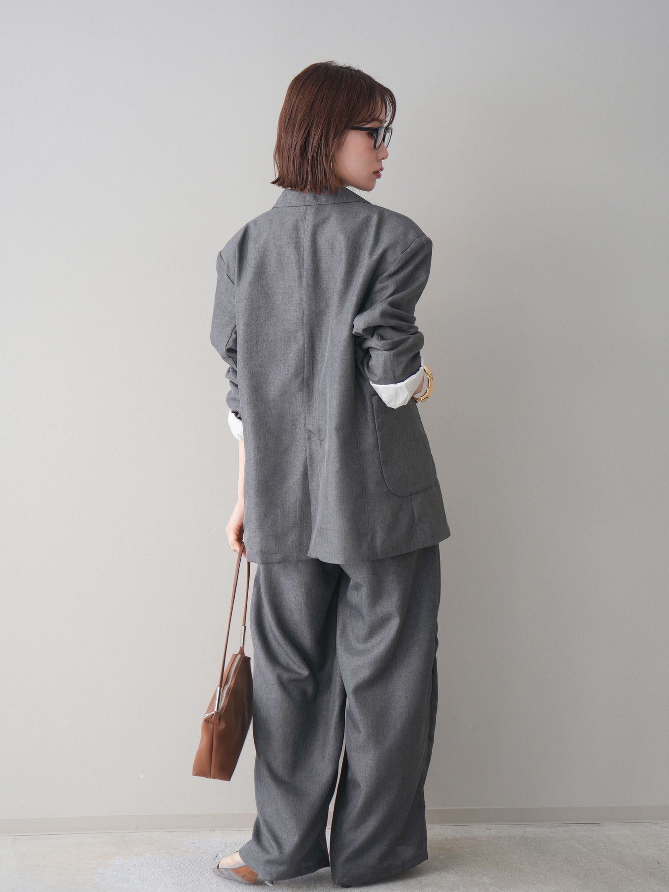 [SET]リネンライクテーラードジャケット+リネンライクバックオープンジレ+リネンライクタックワイドパンツ(3set)