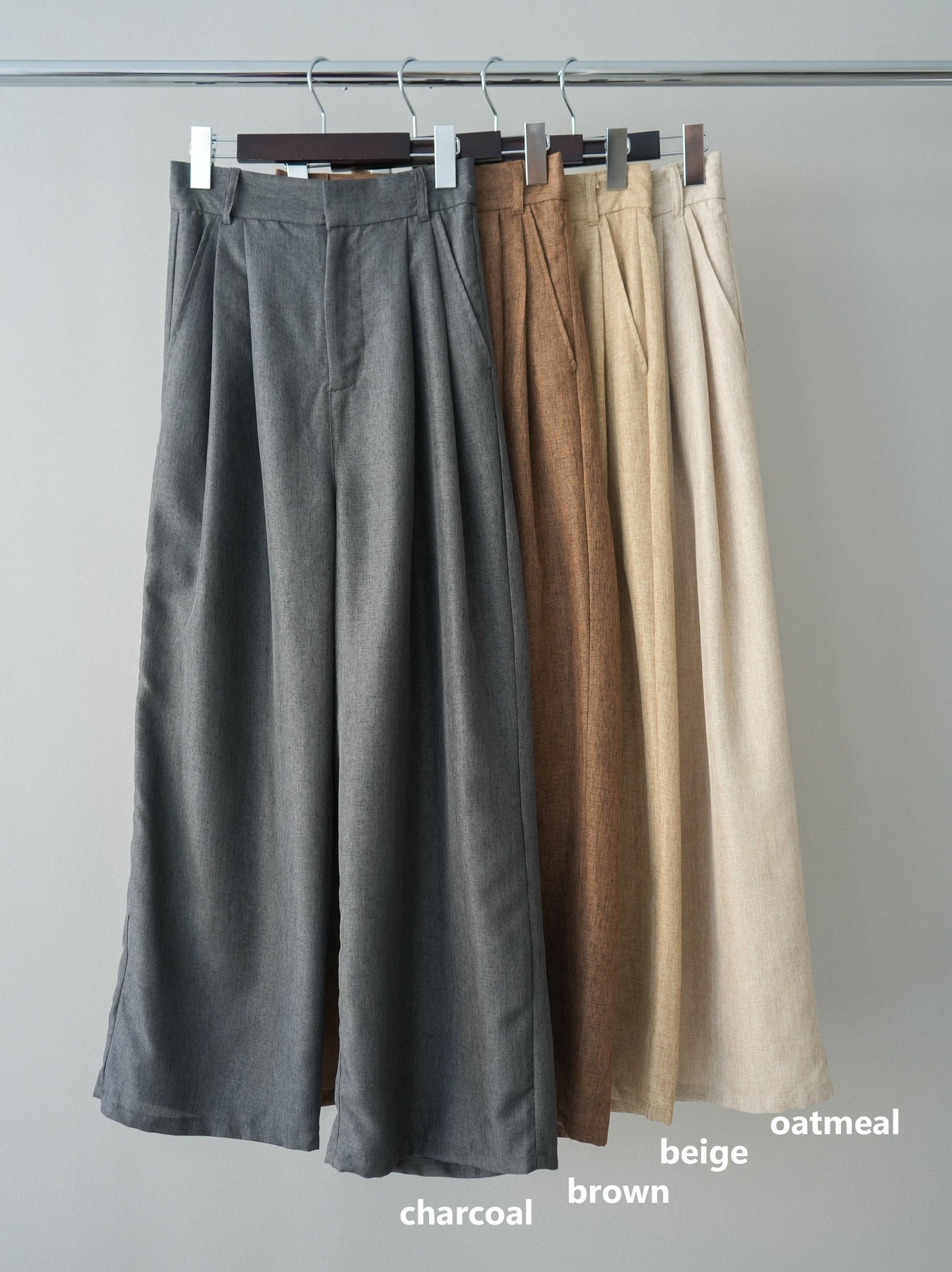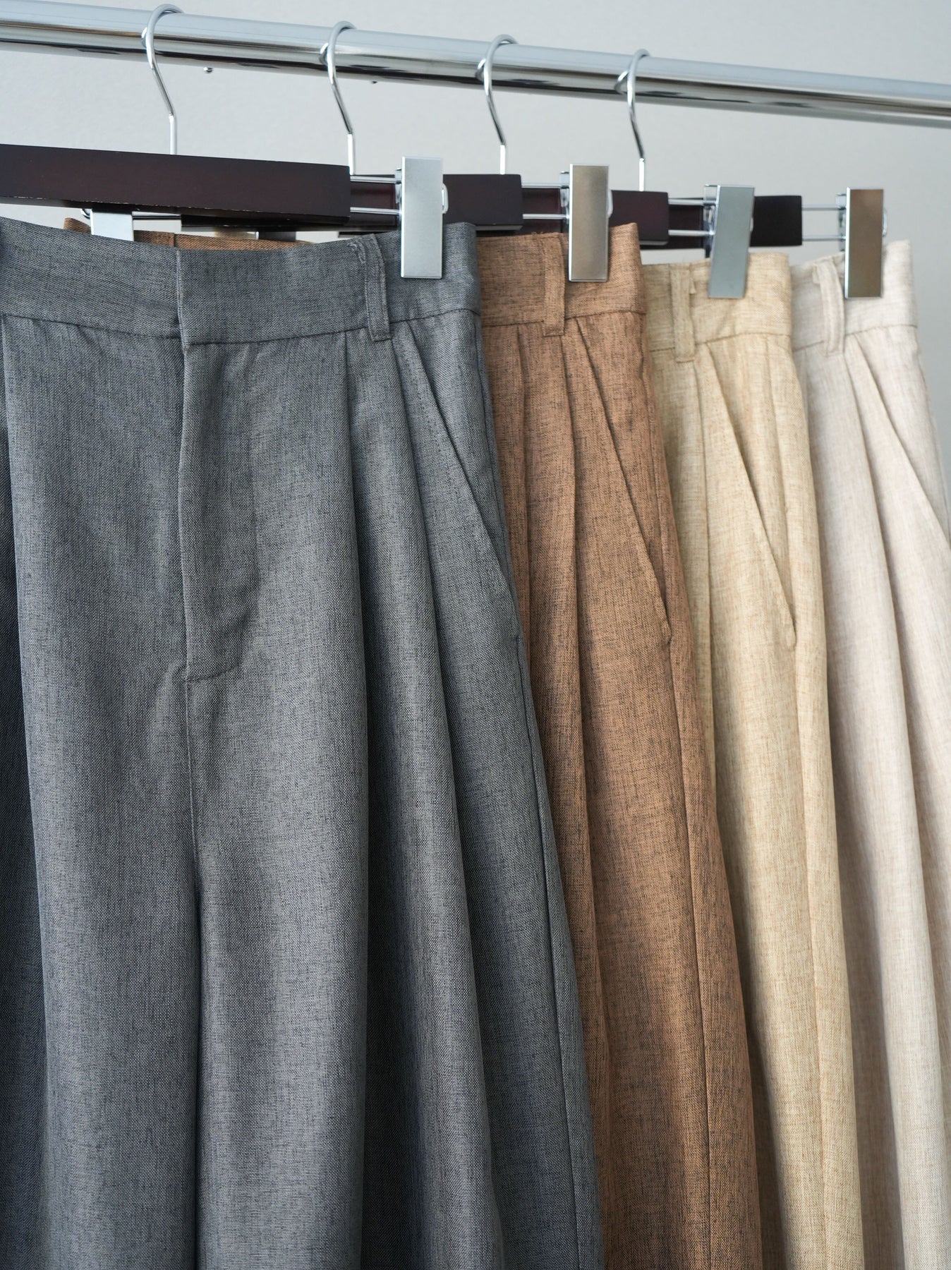 ナチュラルな風合いが魅力のリネンライク素材を使用したタックワイドパンツ。フロントに入れたタックが立体感を生み、ゆったりとしたシルエットながらすっきりとした印象に仕上げています。軽やかな穿き心地で、季節感のあるスタイリングにもぴったり。シンプルなトップスを合わせるだけでこなれた雰囲気を演出できる、デイリーに活躍する一本です。