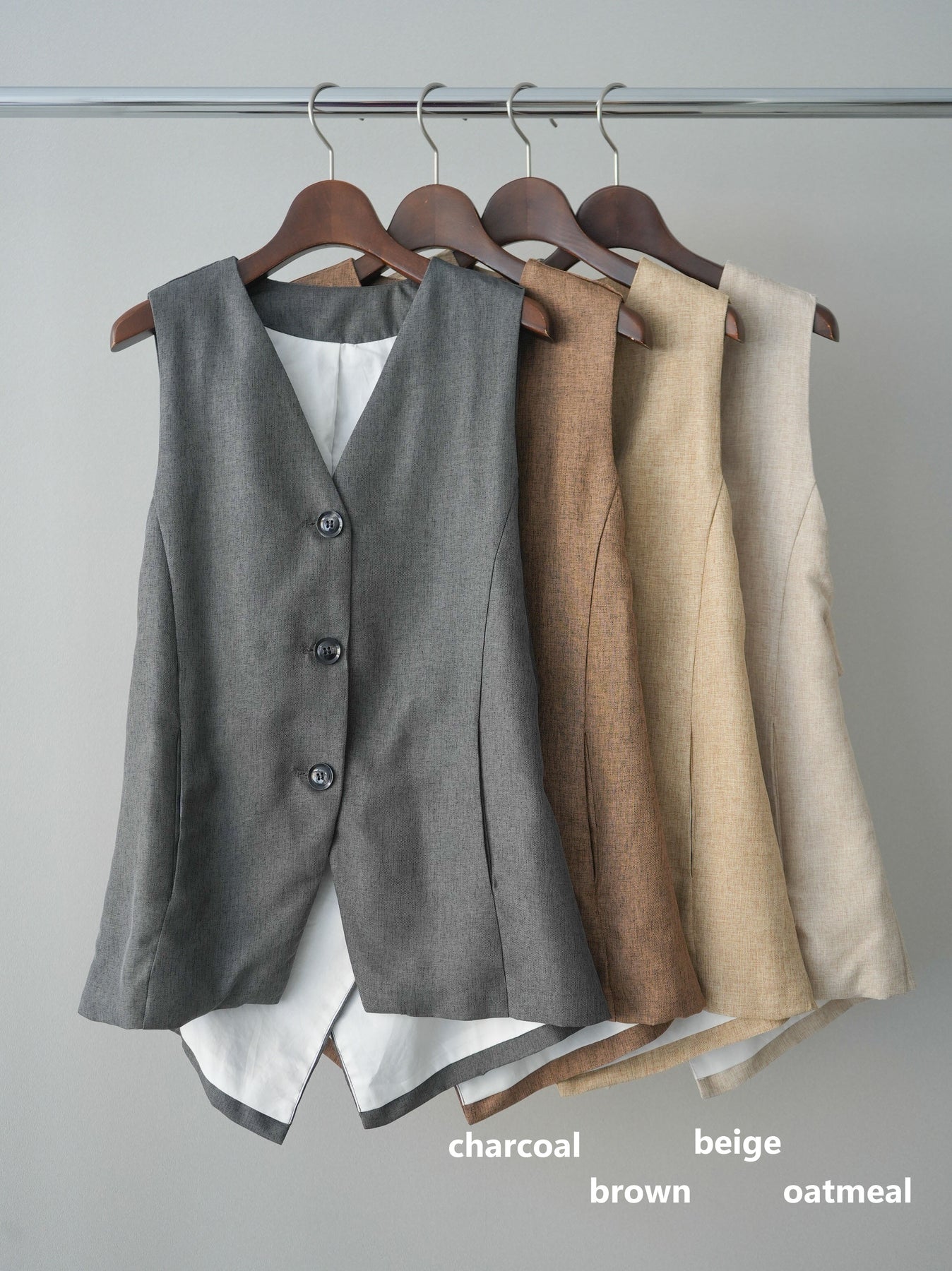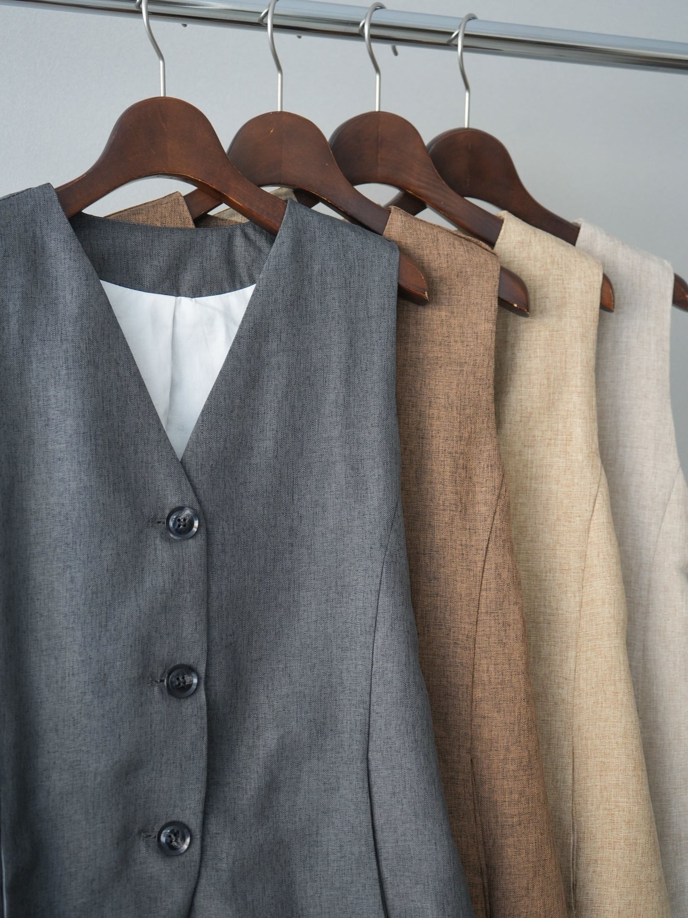 ナチュラルな風合いが魅力のリネンライク素材を使用したバックオープンジレ。フロントはすっきりとしたVネックデザインで、きちんと感を保ちながら女性らしいラインを引き立てます。後ろは程よく開いたデザインが抜け感を演出し、レイヤードスタイルにも映える一着。シャツやカットソーに重ねるだけで、こなれた印象に仕上がる着回し力の高いアイテムです。 ※ボトムス、キャミソール(インナー)以外の商品は一律でインナーは付属していません。