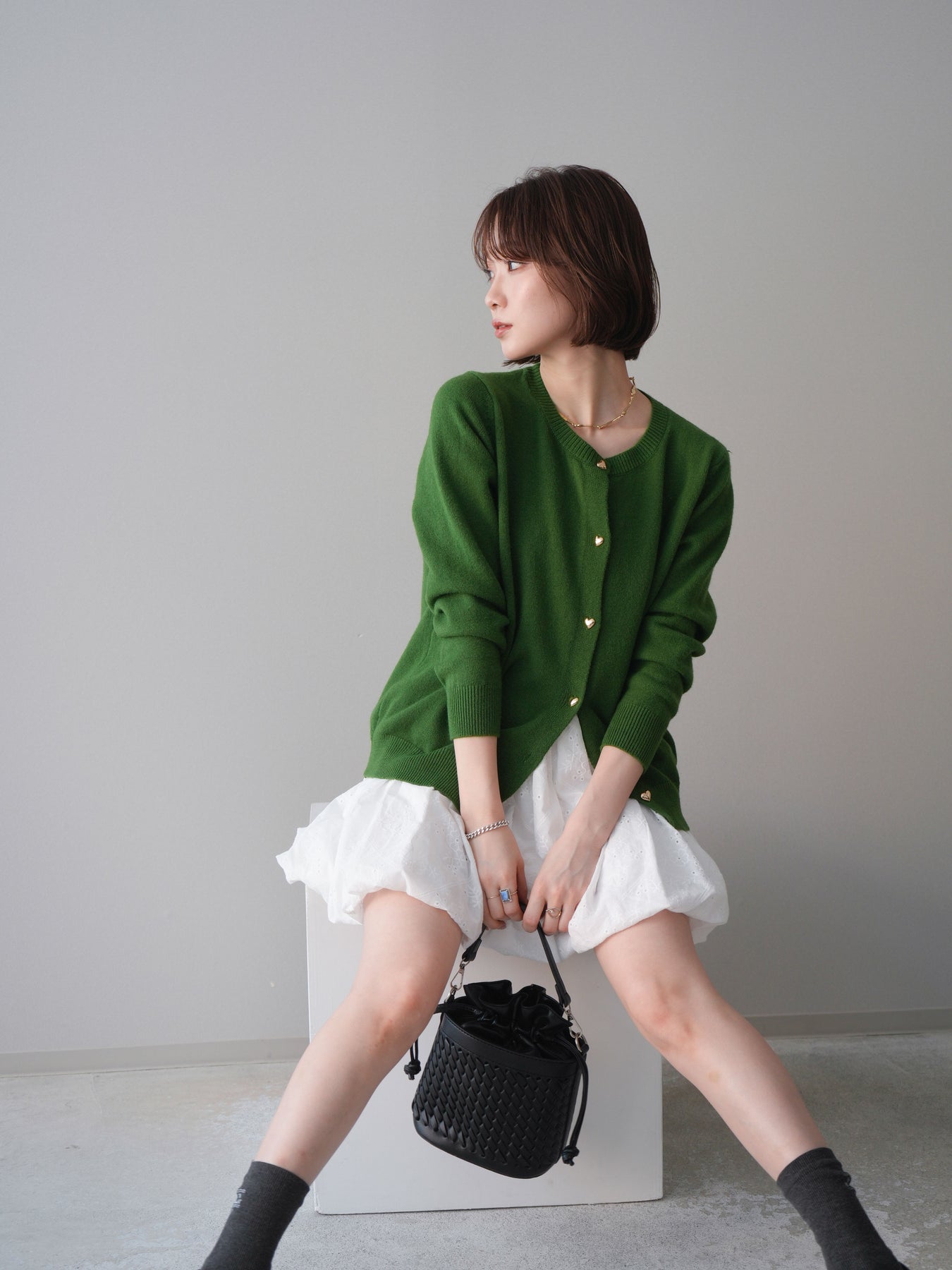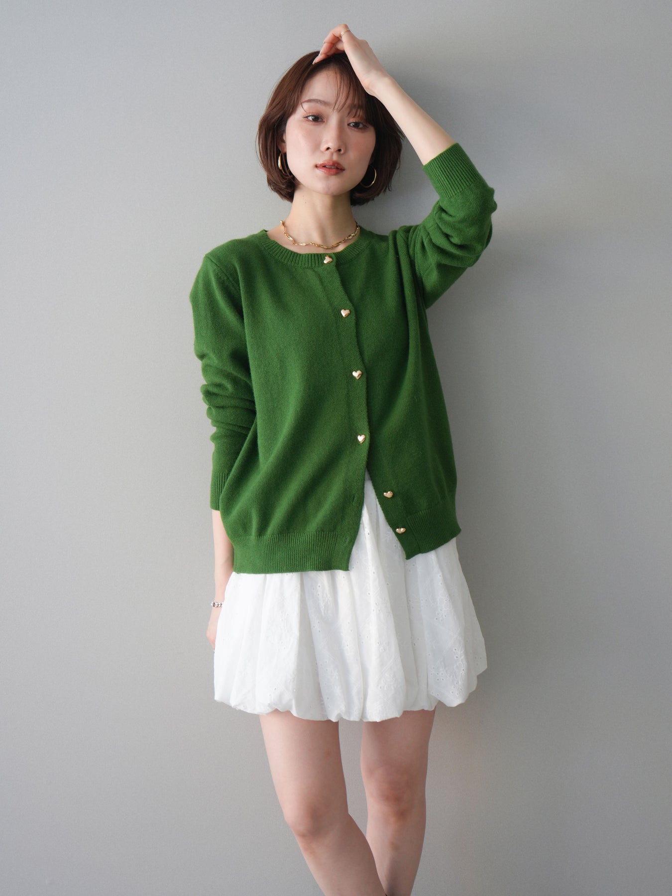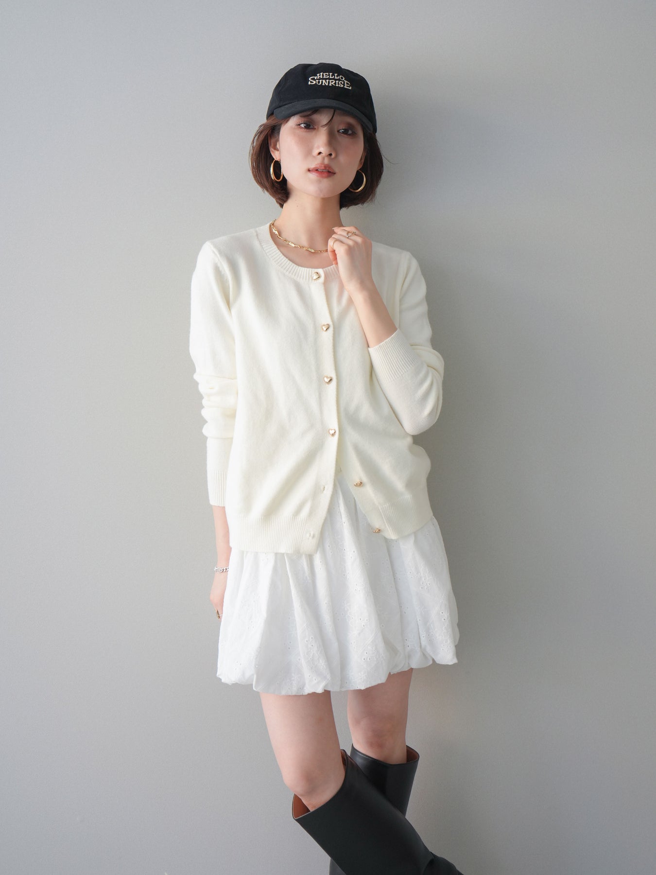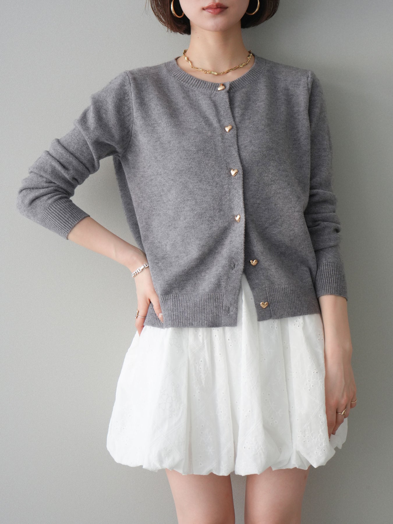 フロントにあしらったハートボタンが目を引くニットカーディガン。シンプルなクルーネックデザインにさりげない甘さをプラスし、コーディネートのアクセントになります。程よくゆとりのあるシルエットで、トップスとしても羽織りとしても着回しやすい一着。デニムやスラックスはもちろん、ワンピースに重ねたスタイリングもおすすめです。 ※ボトムス、キャミソール(インナー)以外の商品は一律でインナーは付属していません。