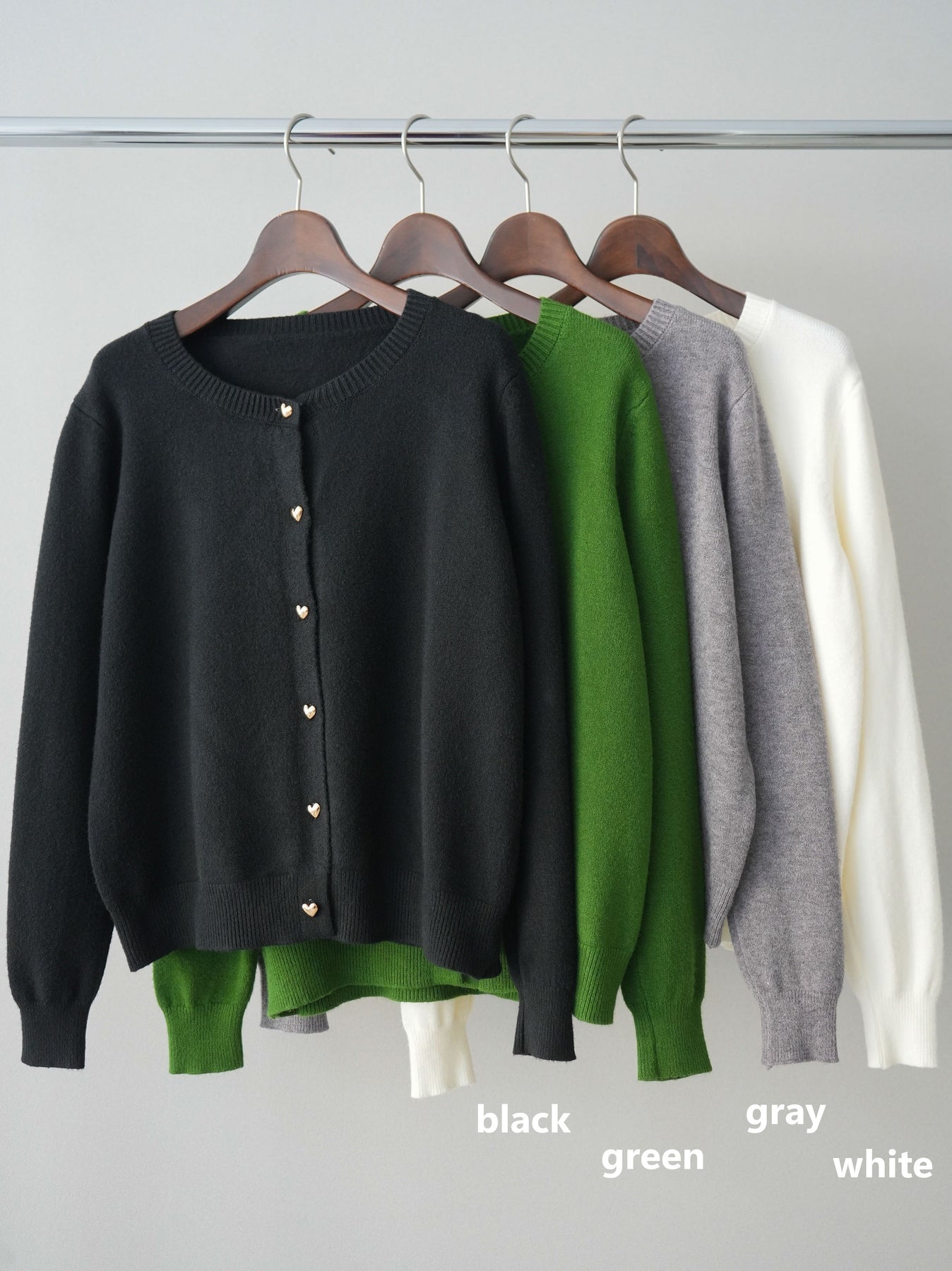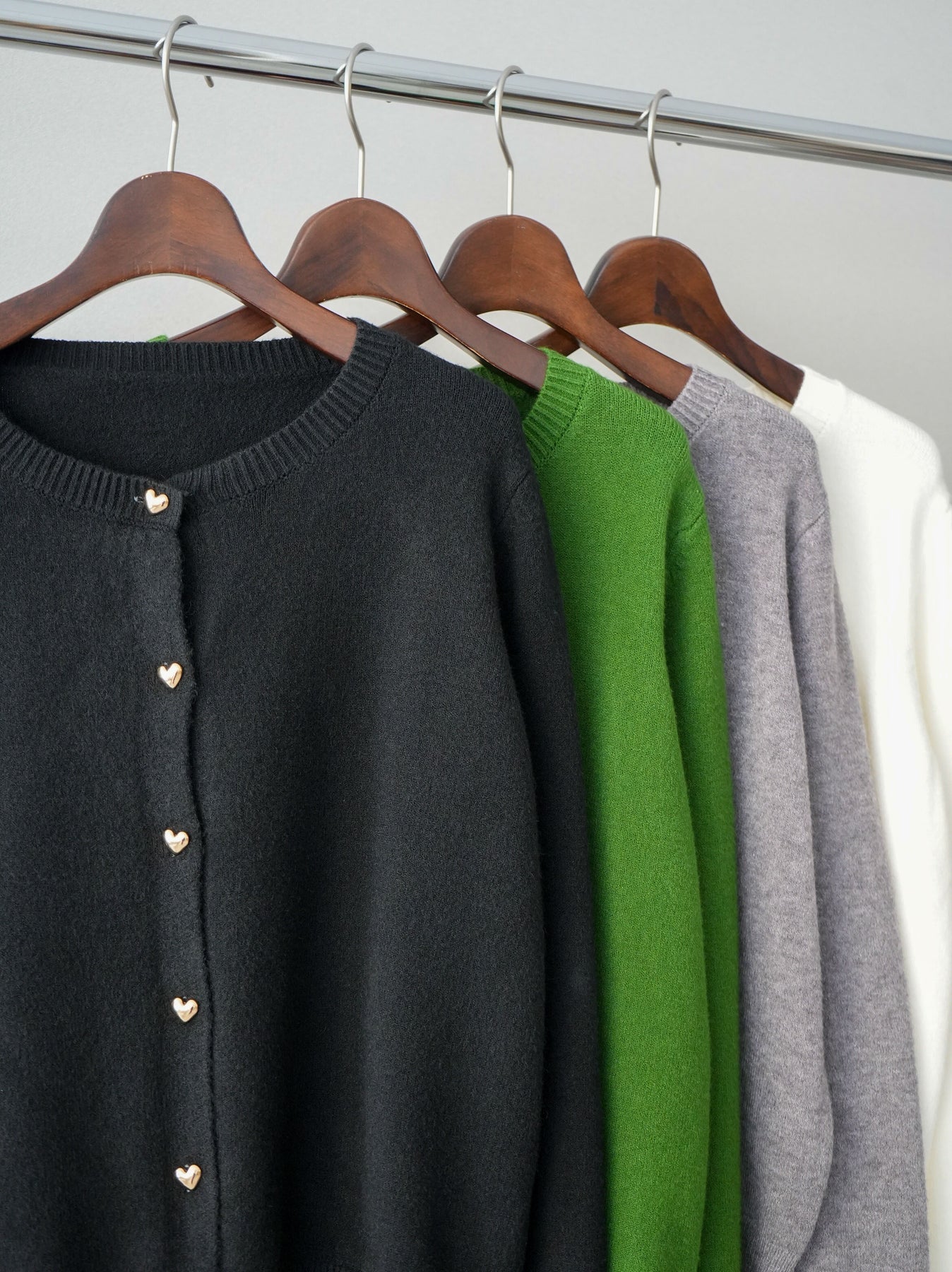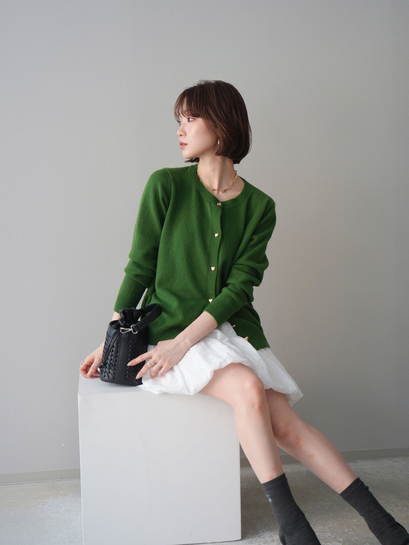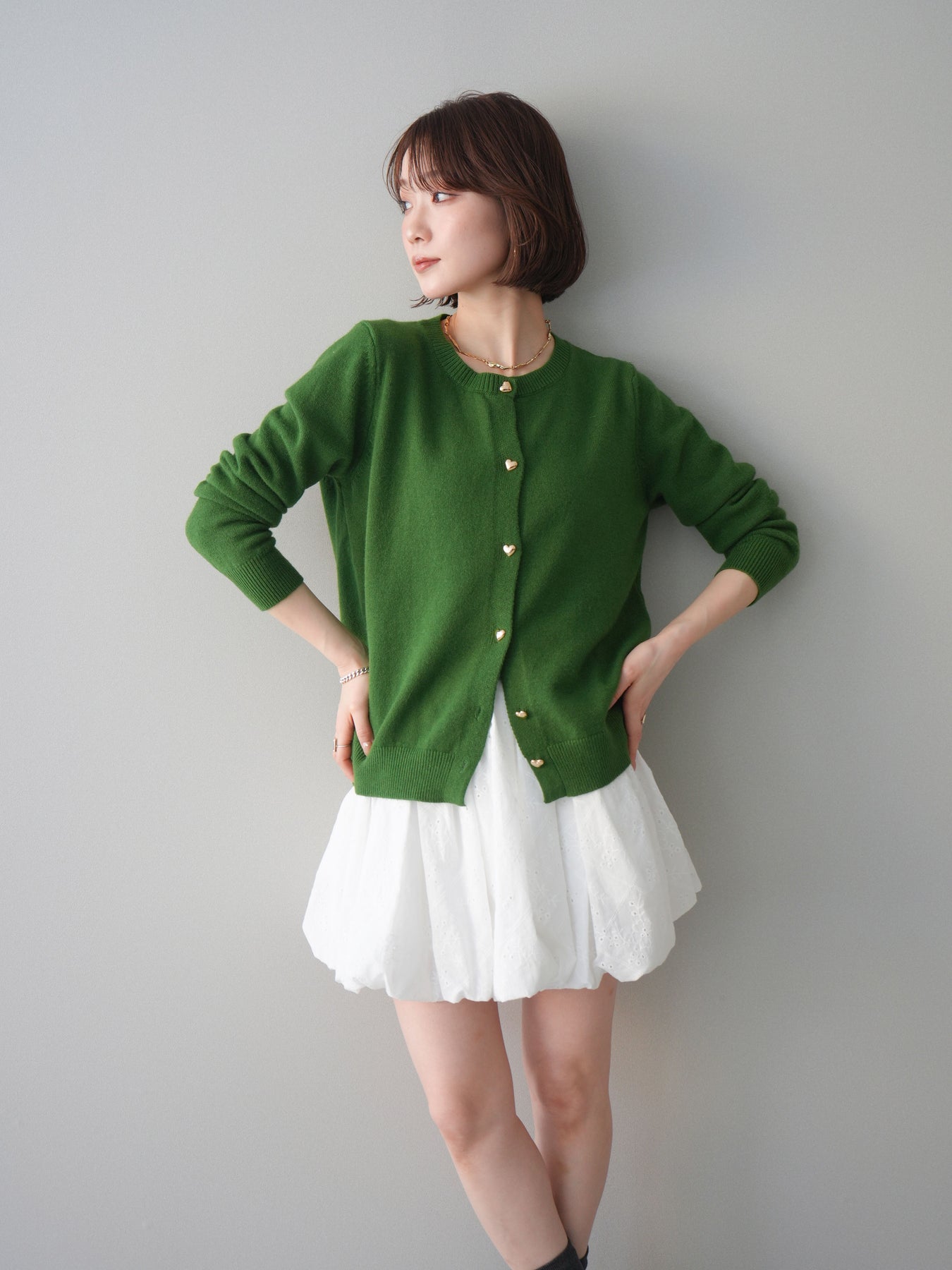 フロントにあしらったハートボタンが目を引くニットカーディガン。シンプルなクルーネックデザインにさりげない甘さをプラスし、コーディネートのアクセントになります。程よくゆとりのあるシルエットで、トップスとしても羽織りとしても着回しやすい一着。デニムやスラックスはもちろん、ワンピースに重ねたスタイリングもおすすめです。 ※ボトムス、キャミソール(インナー)以外の商品は一律でインナーは付属していません。