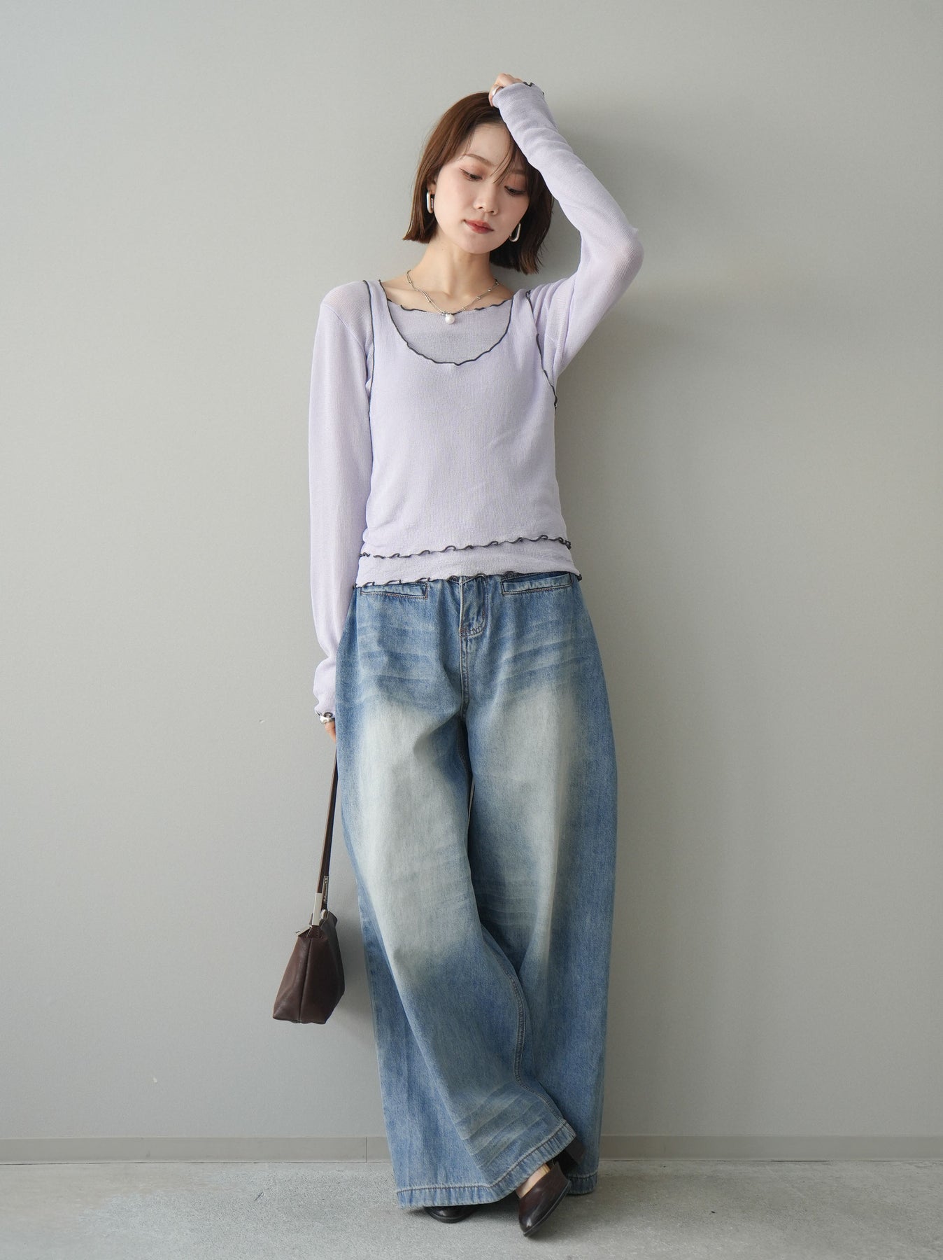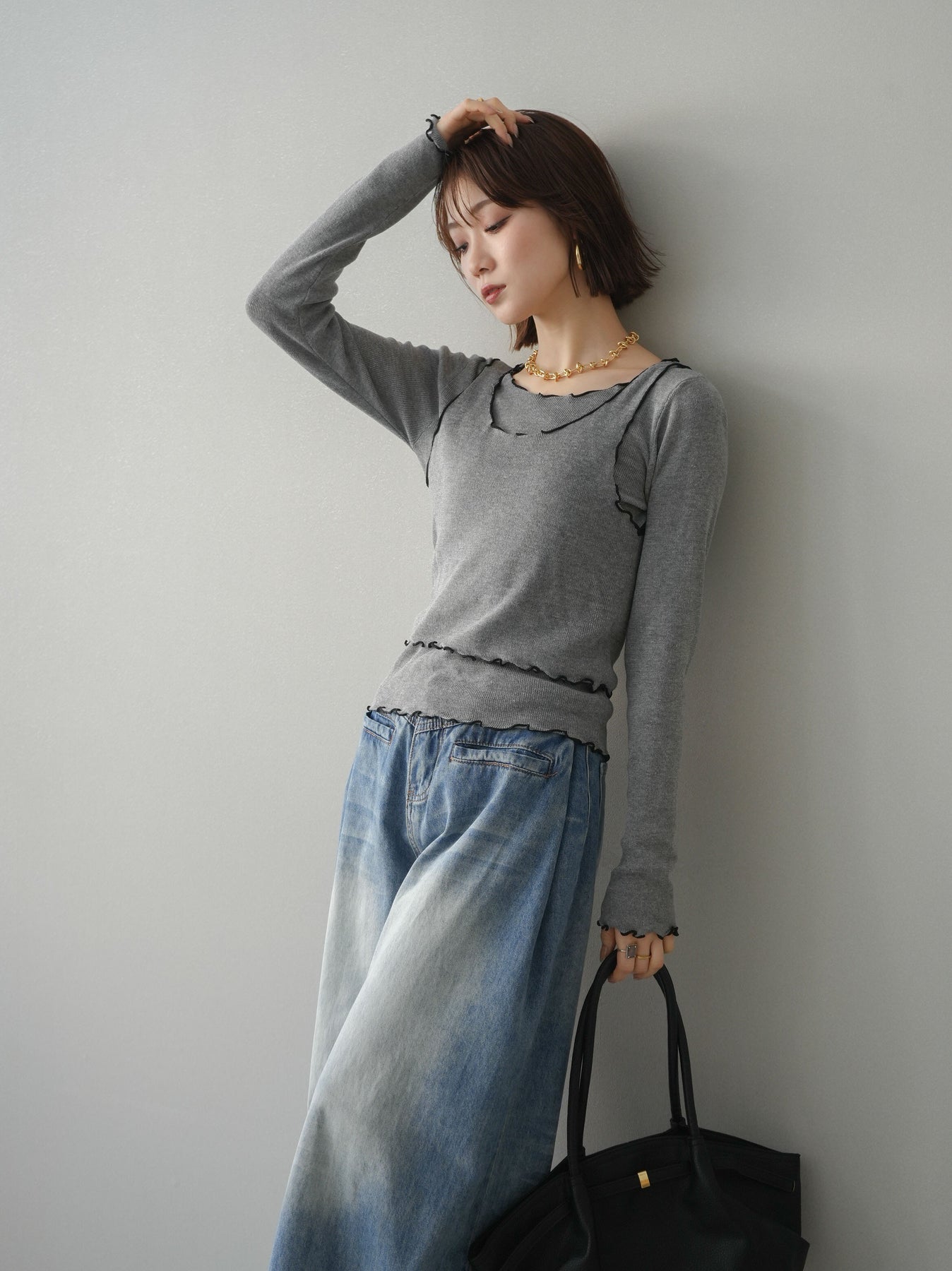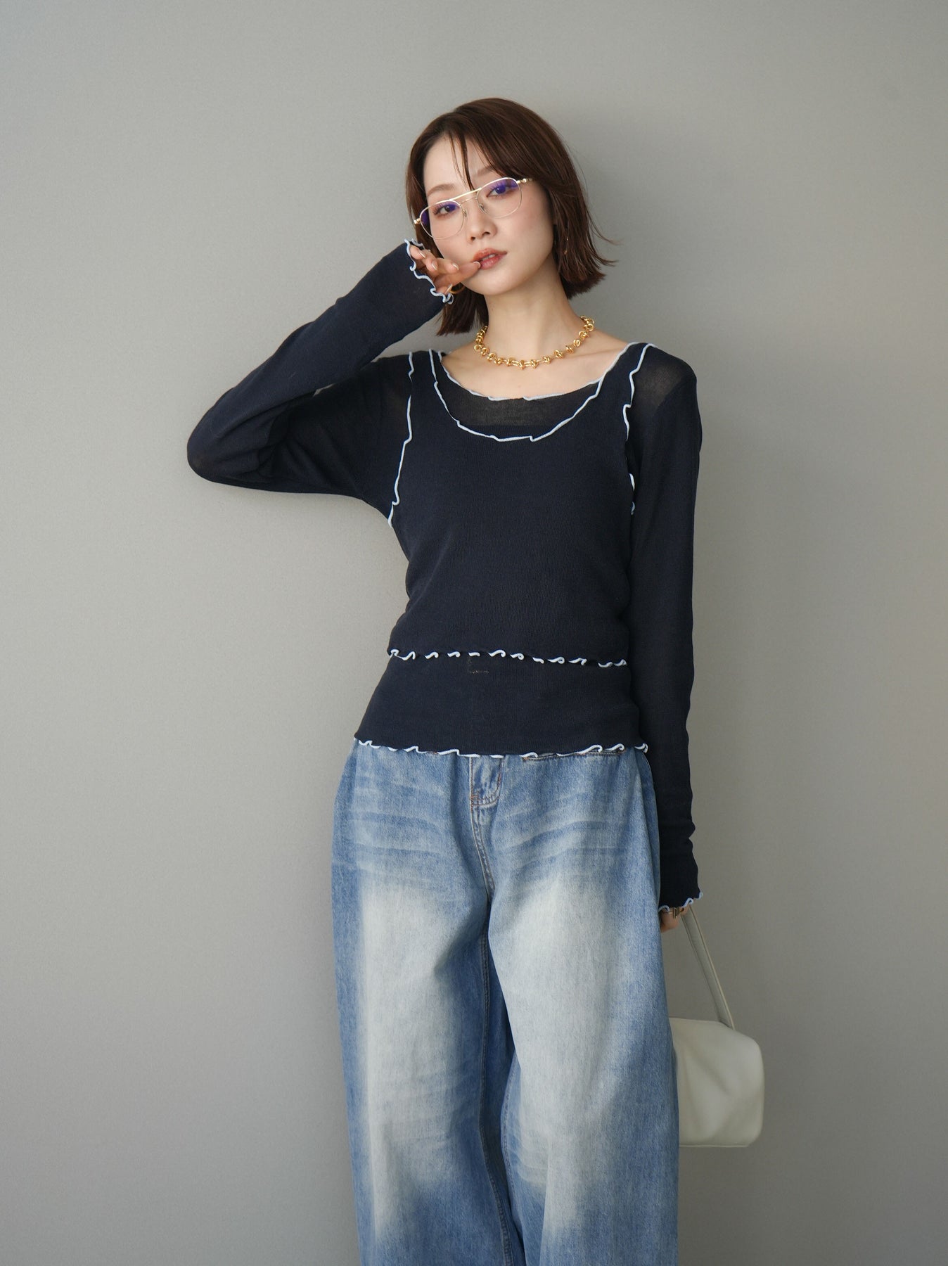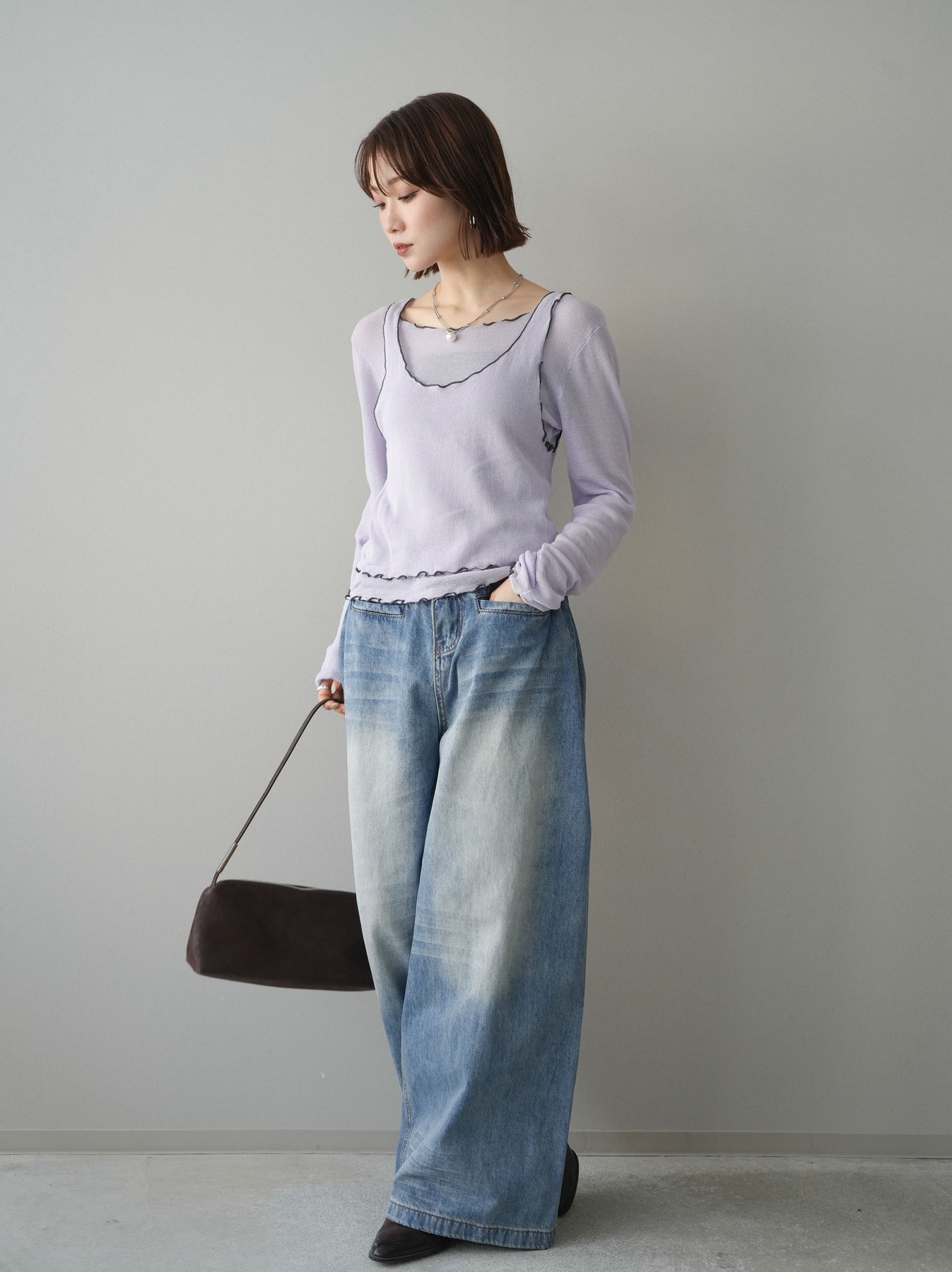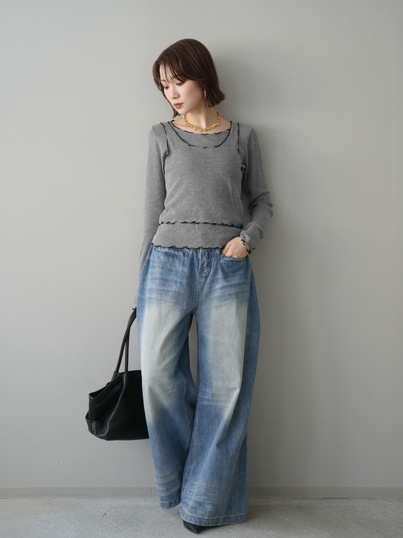 [SET]バイカラーメローアンサンブルシアーニットトップス+フロントポケットサイドタックワイドデニム(2set)