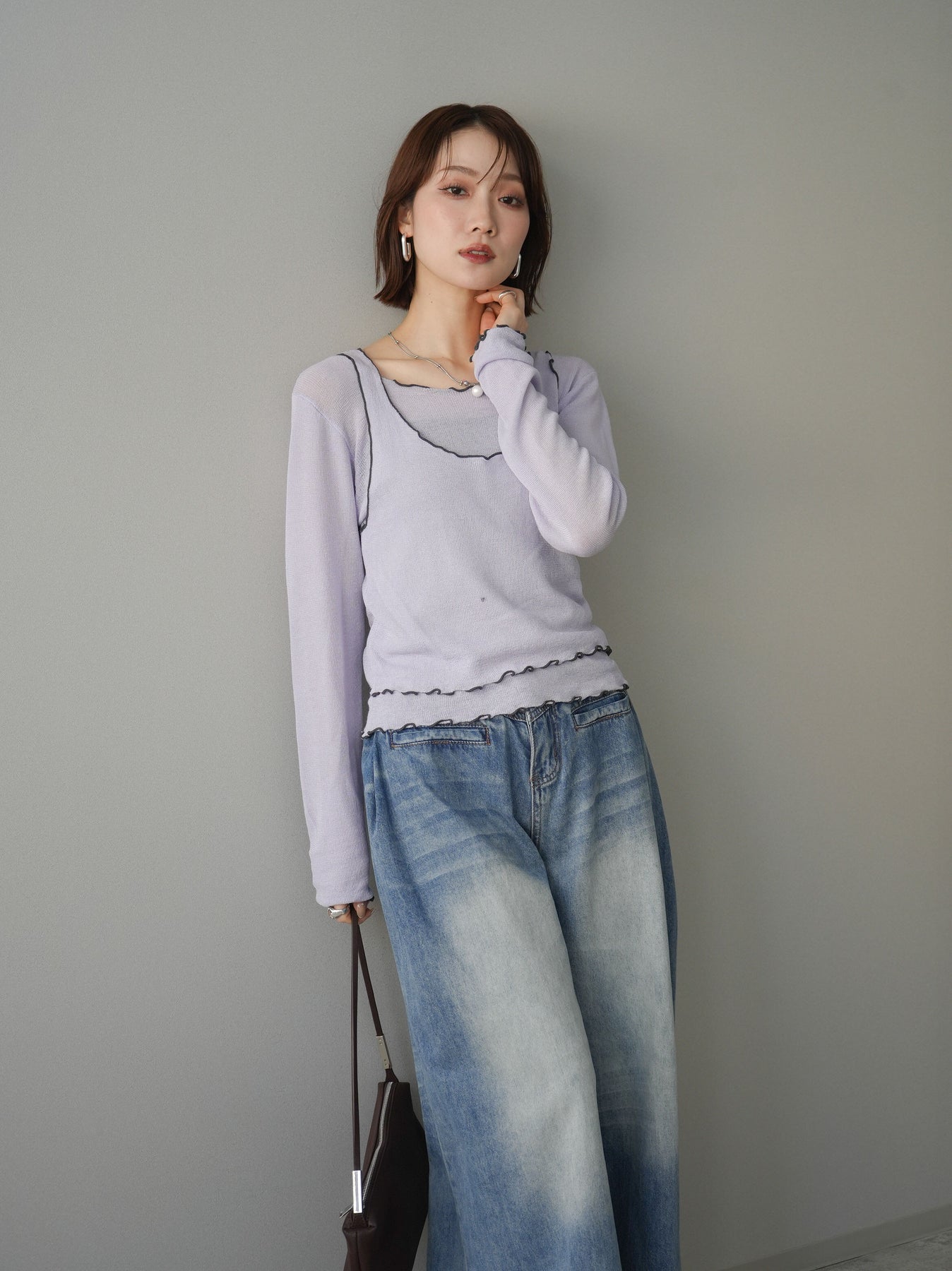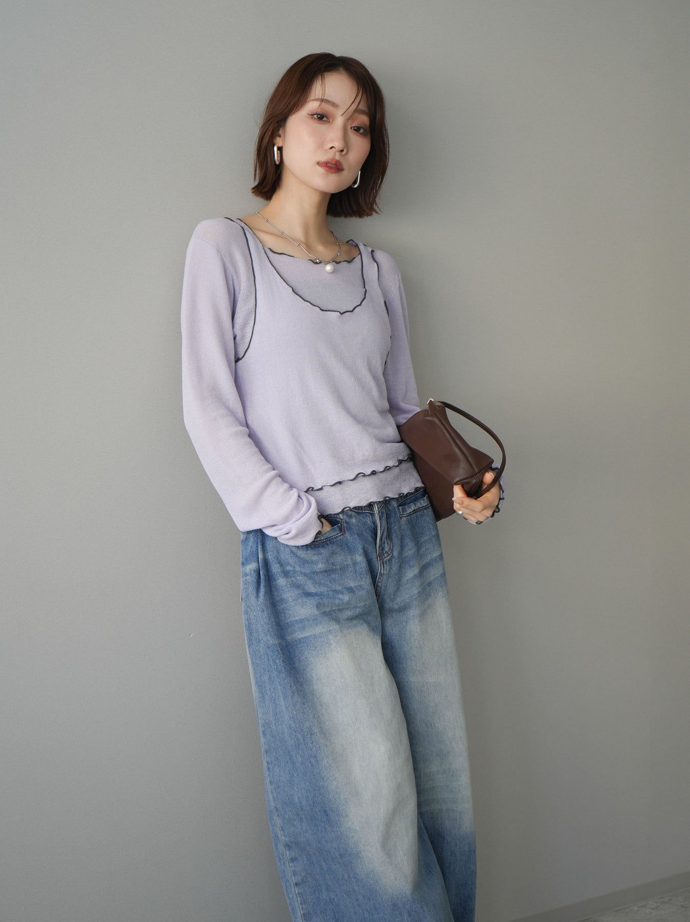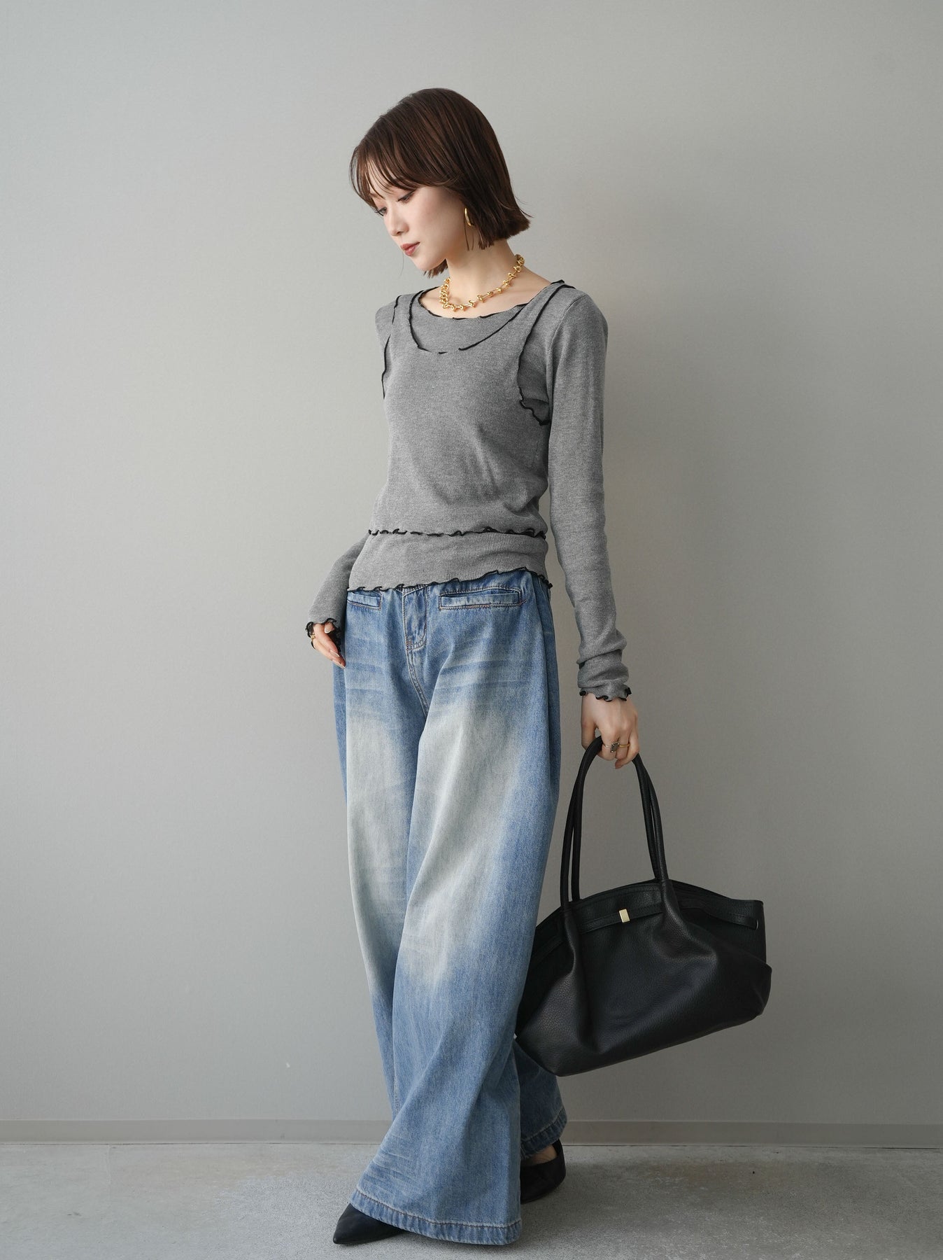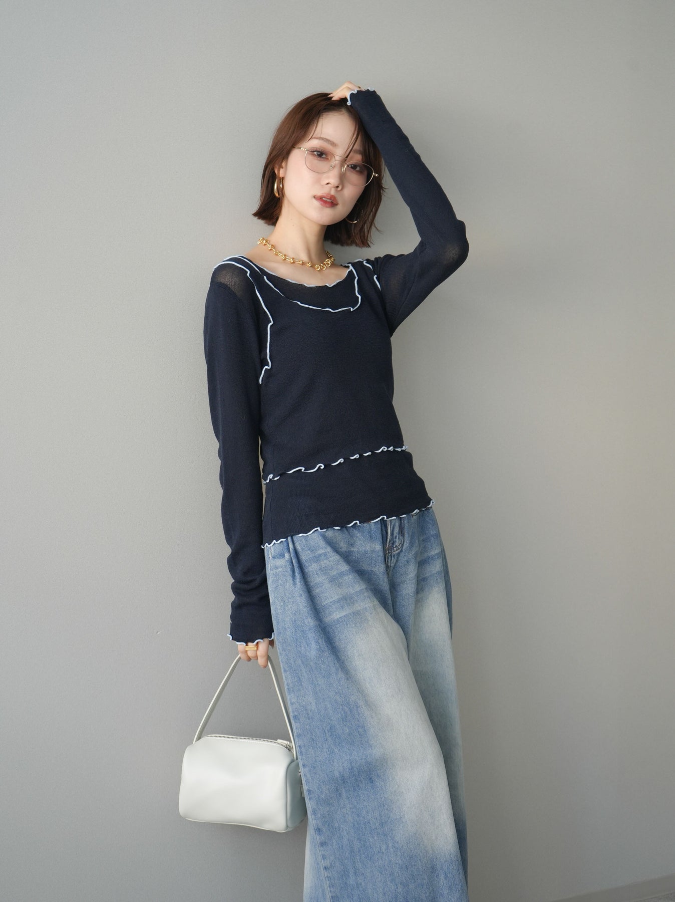 [SET]バイカラーメローアンサンブルシアーニットトップス+フロントポケットサイドタックワイドデニム(2set)
