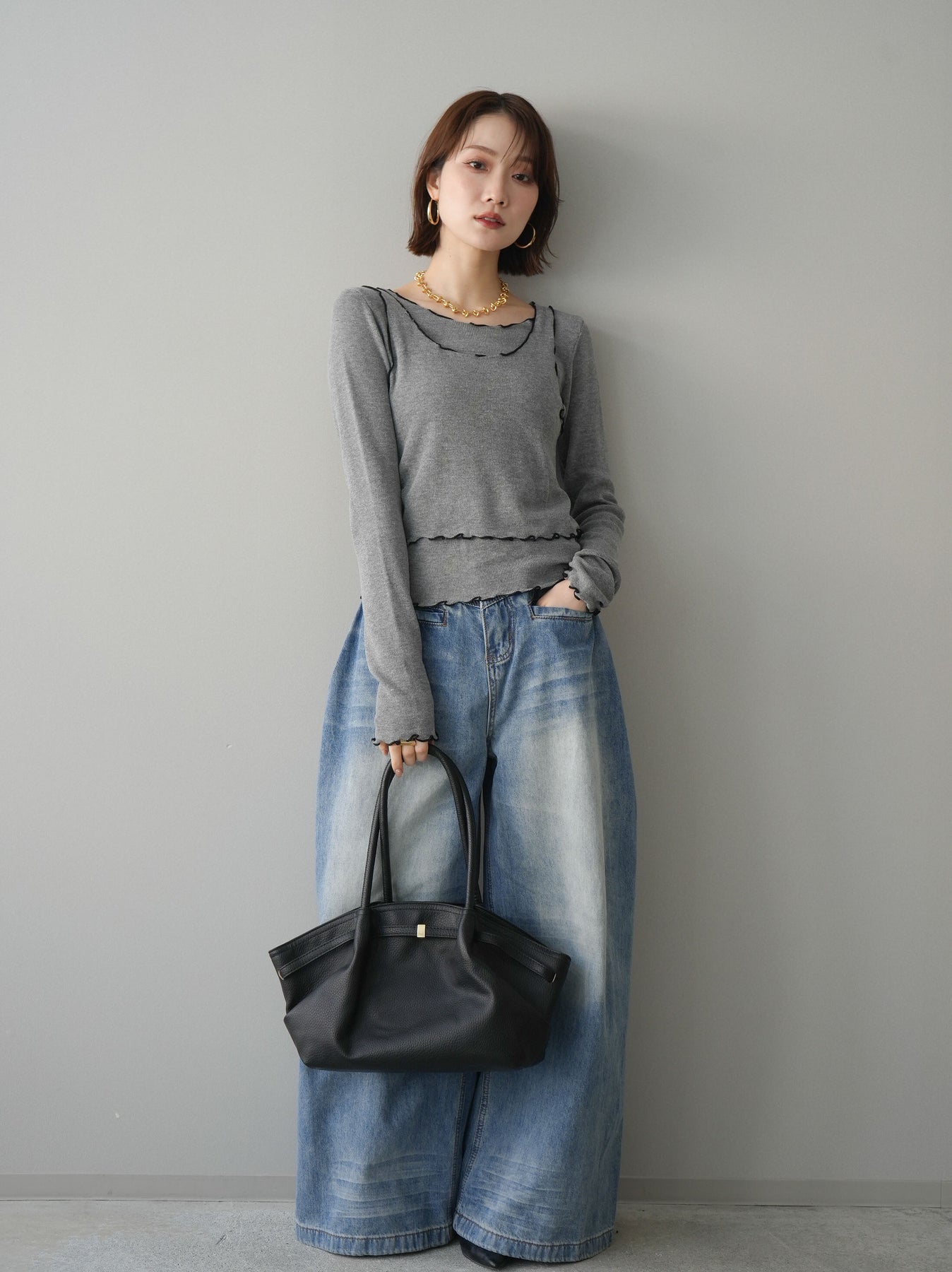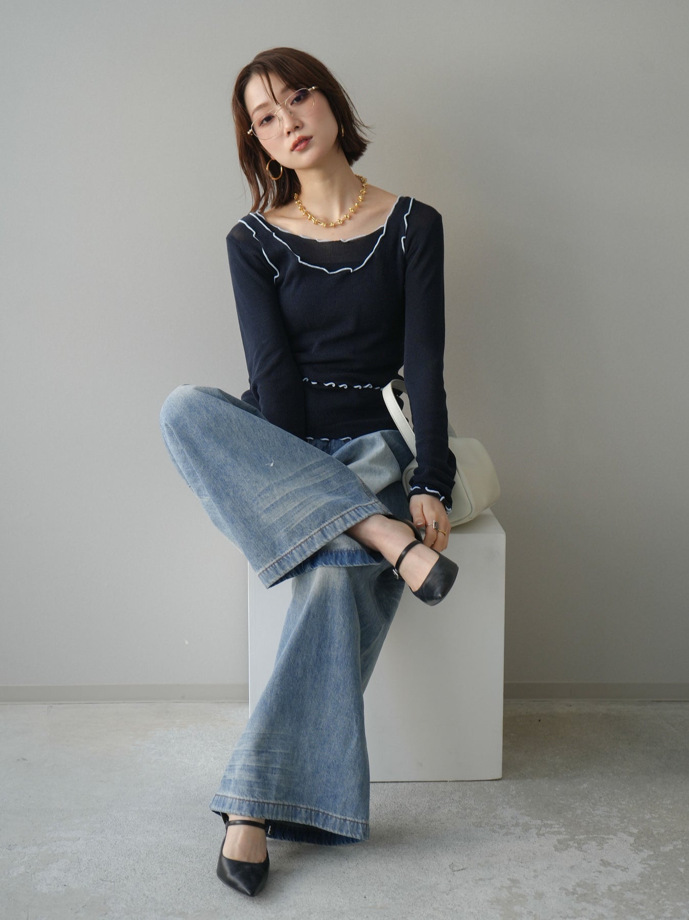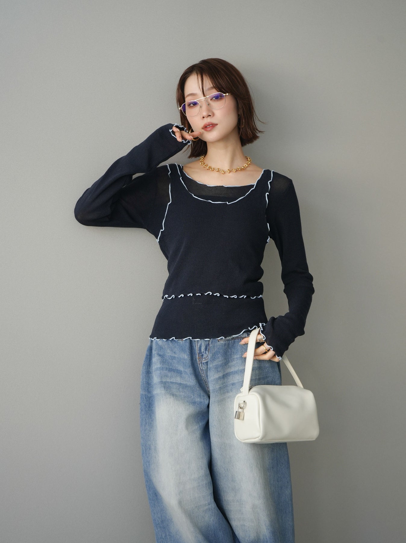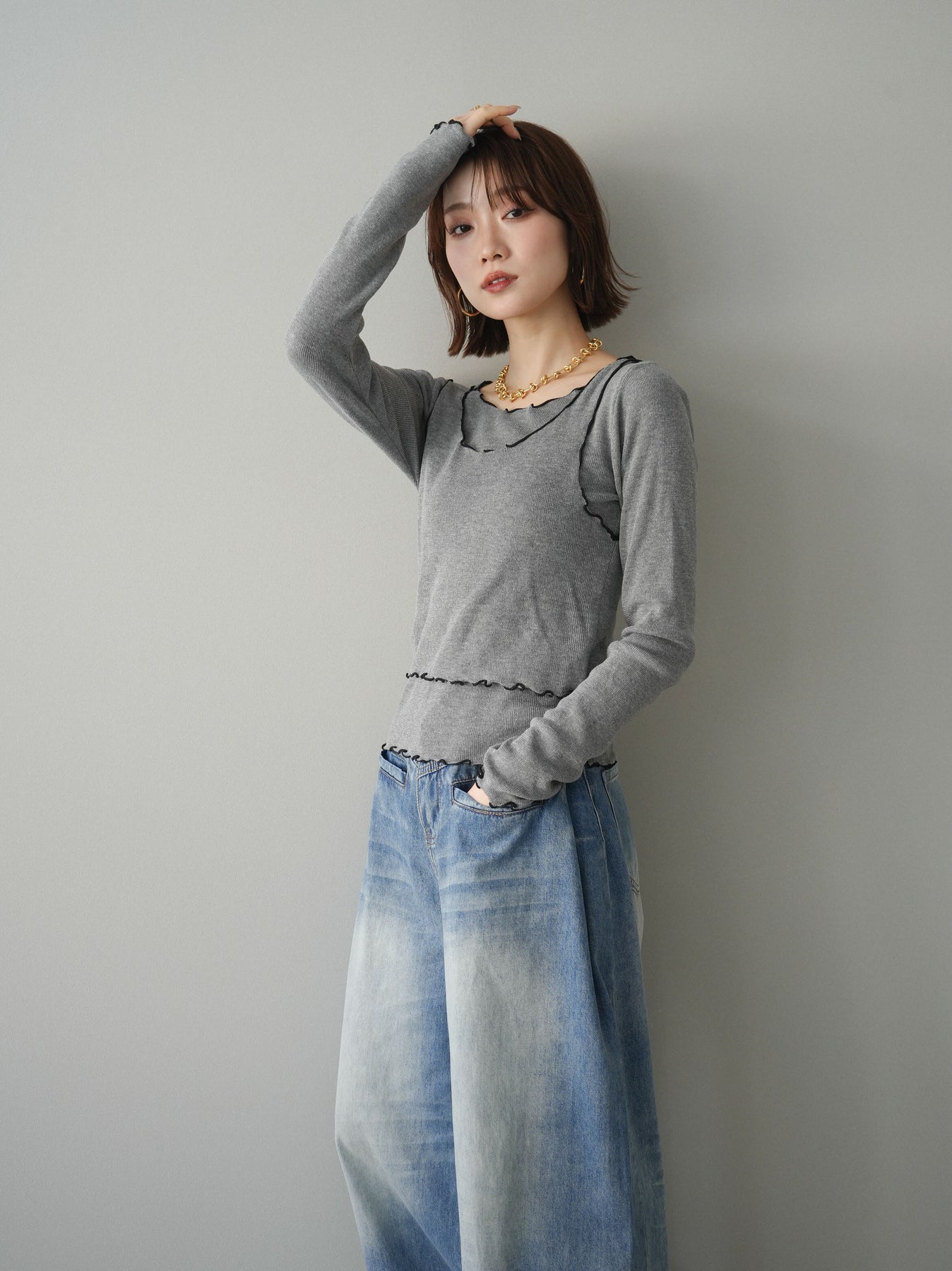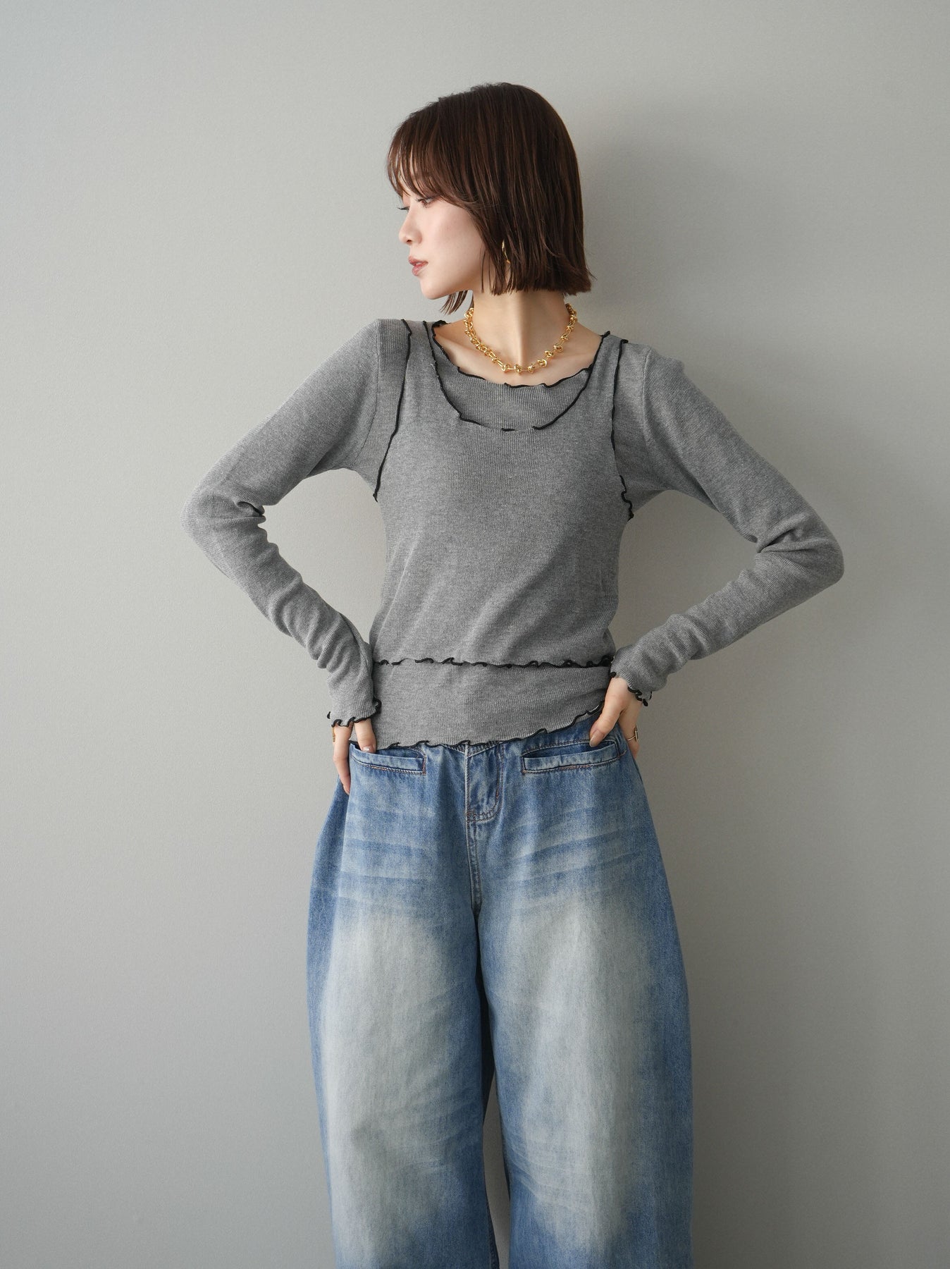 [SET]バイカラーメローアンサンブルシアーニットトップス+フロントポケットサイドタックワイドデニム(2set)