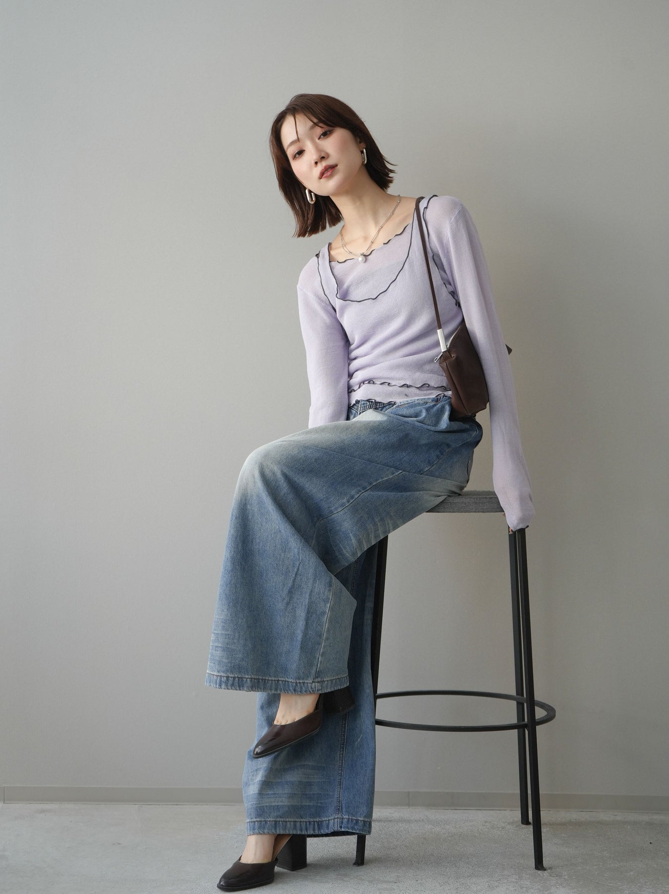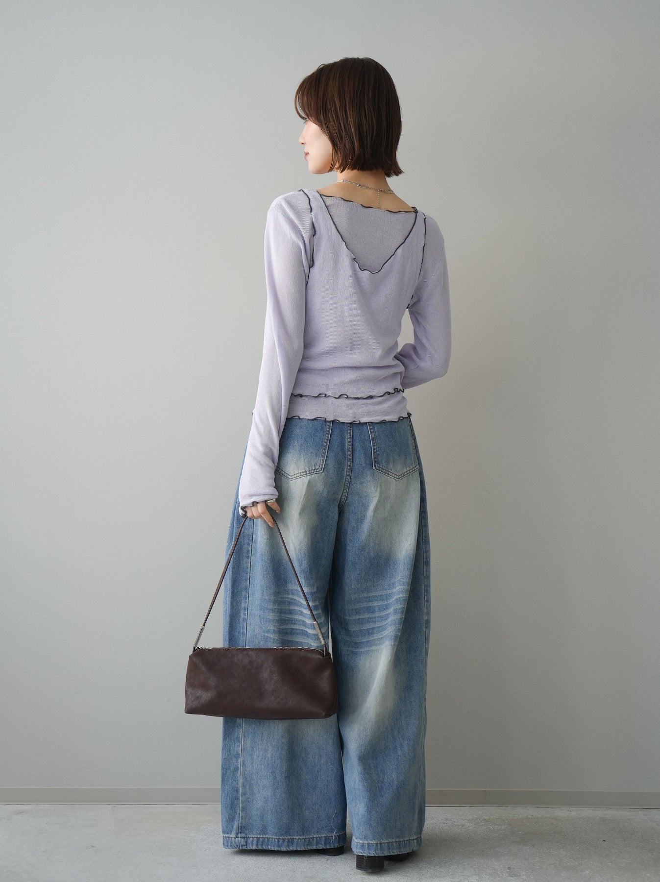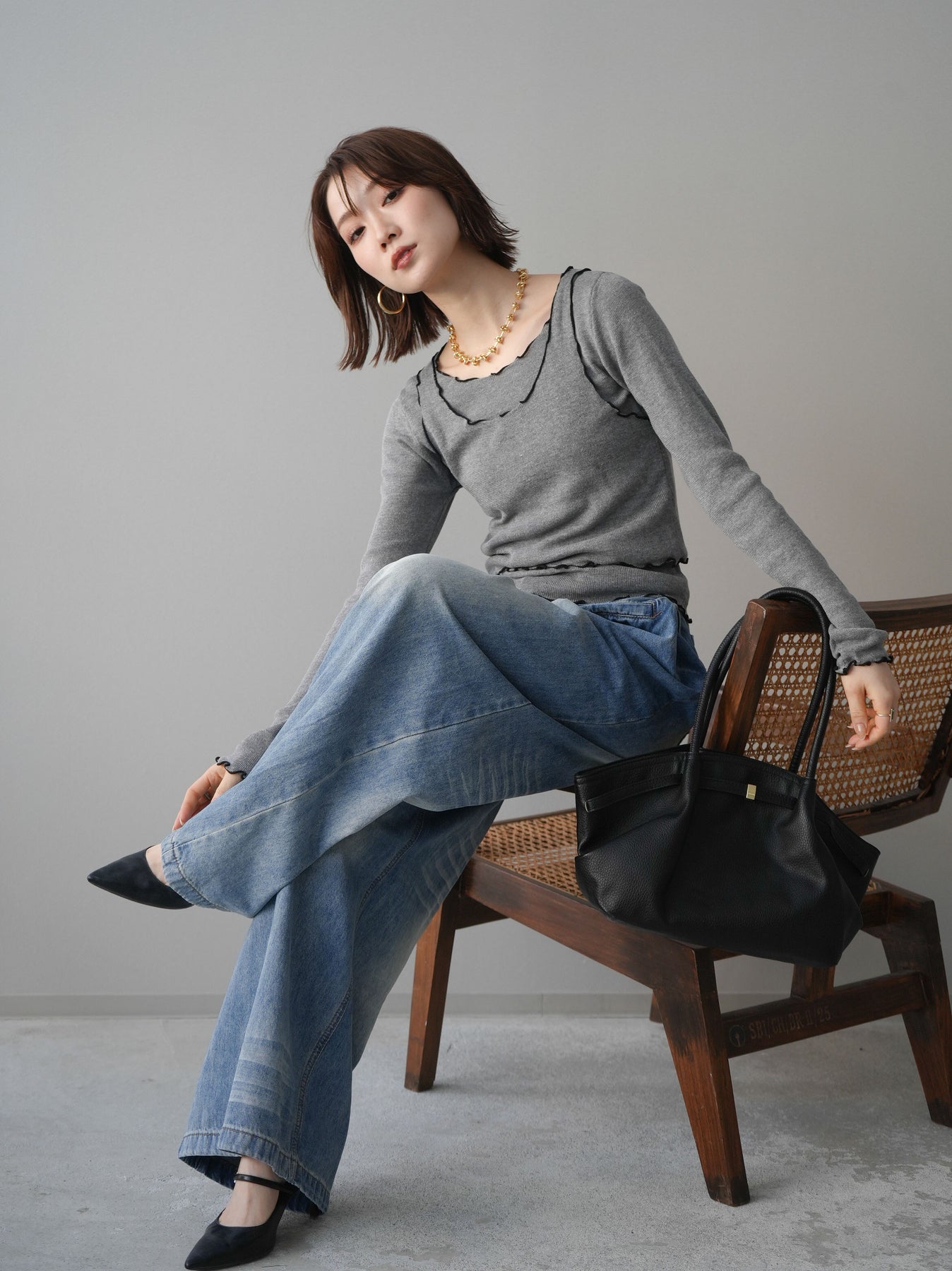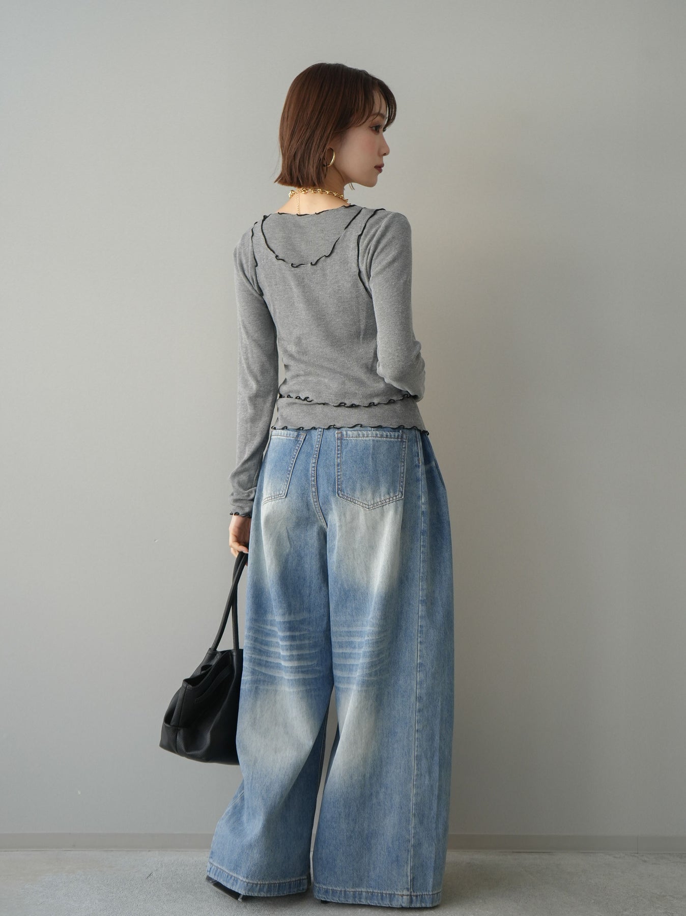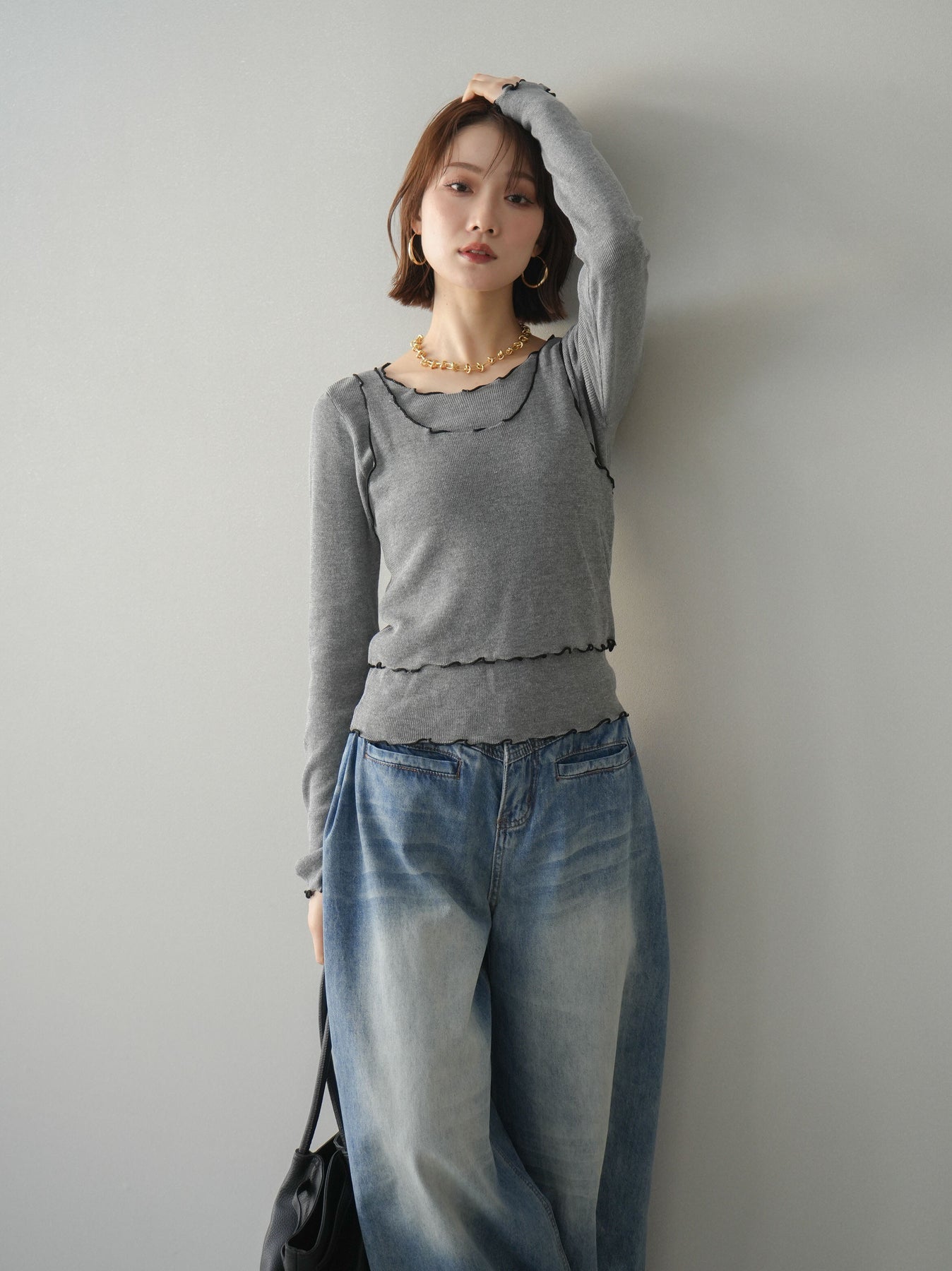 [SET]バイカラーメローアンサンブルシアーニットトップス+フロントポケットサイドタックワイドデニム(2set)