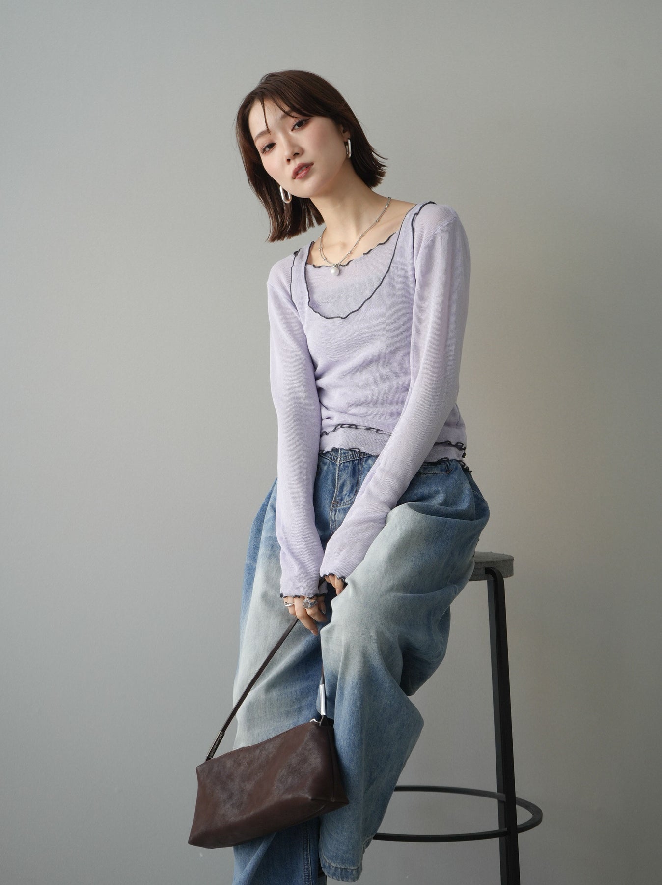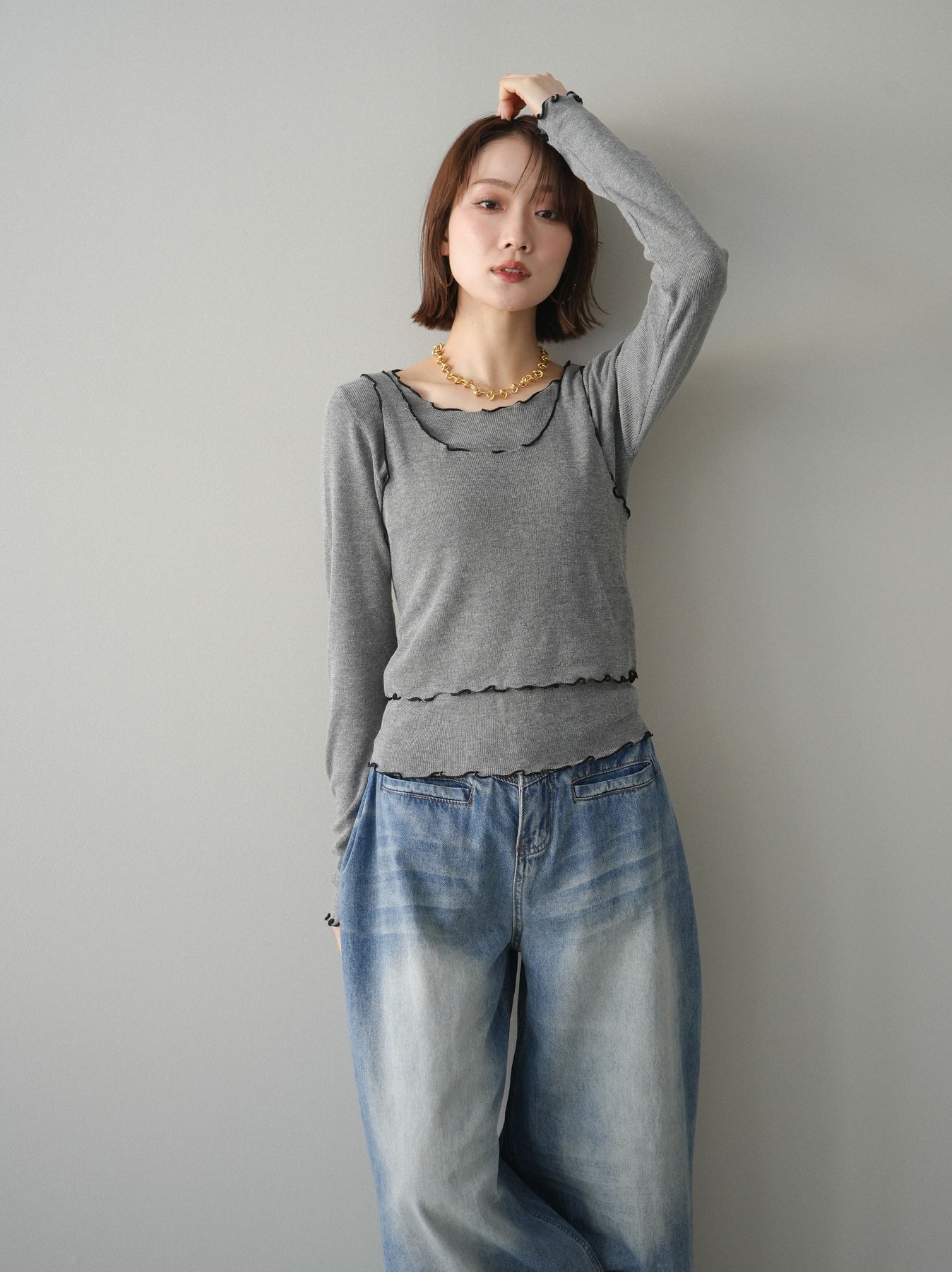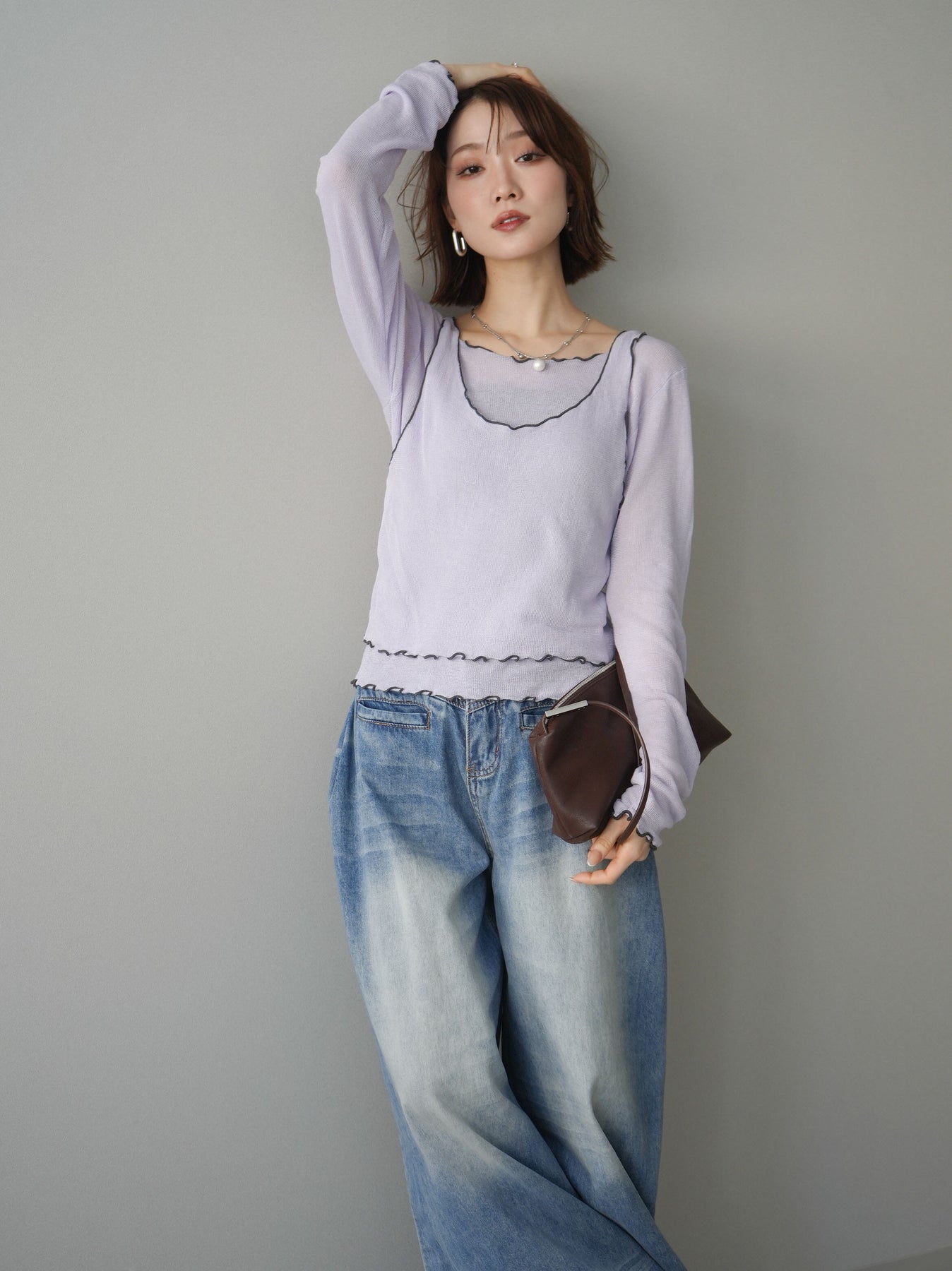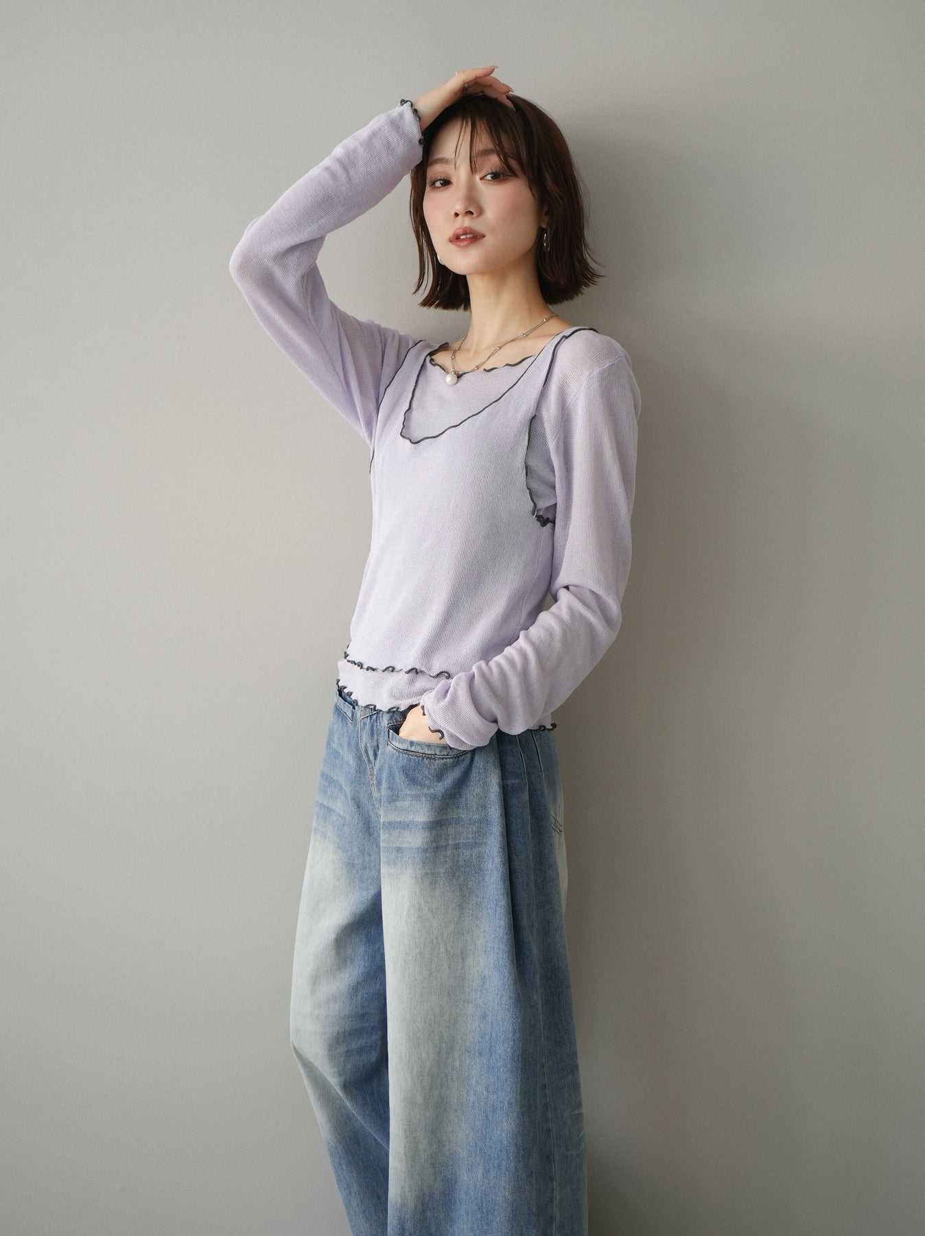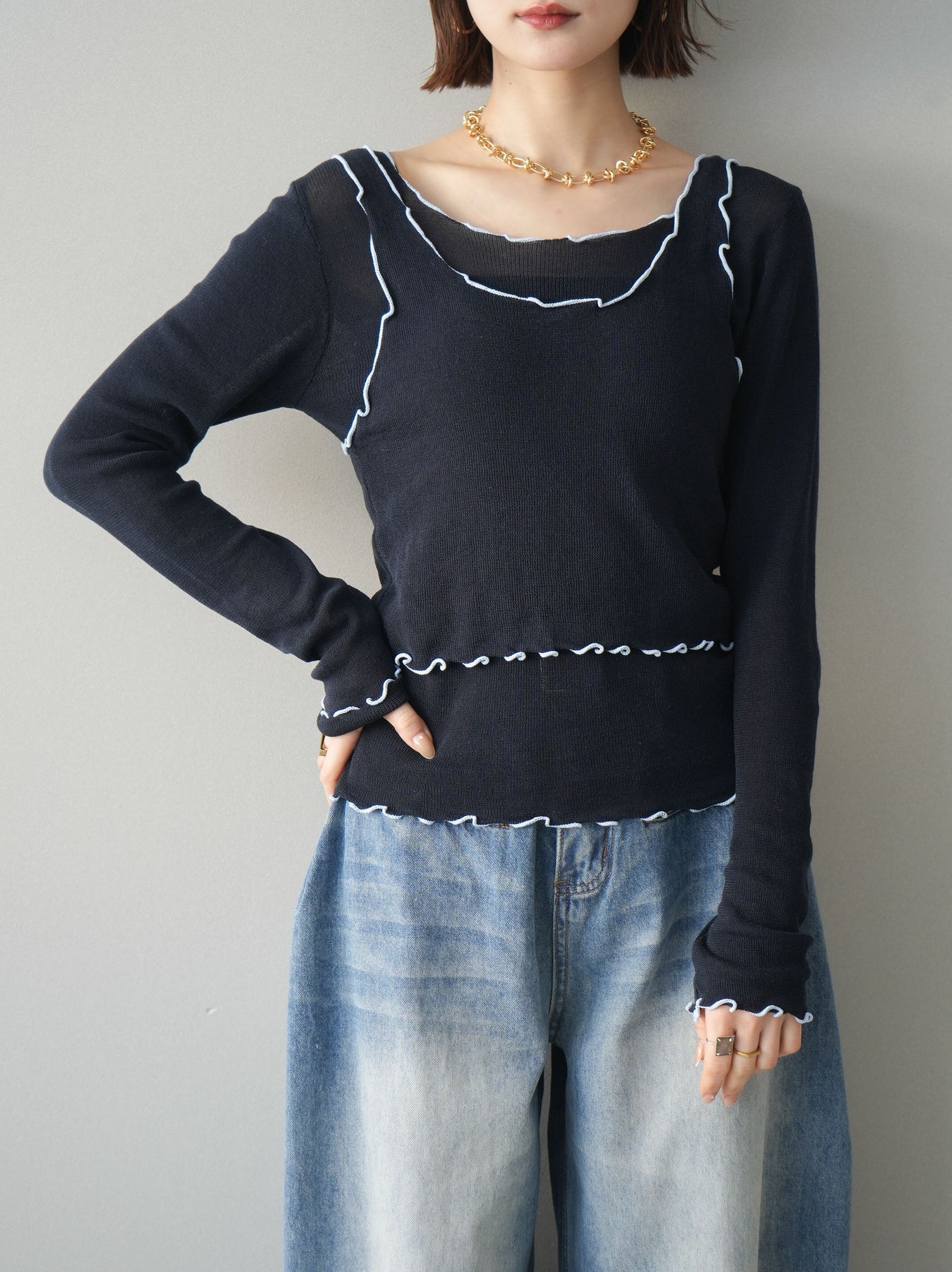 シアー感のある軽やかなニットに、配色メローを効かせたアンサンブルトップス。ネックや裾、袖口に施した波打つラインがさりげないアクセントになり、レイヤードするだけでこなれた印象に仕上がります。程よくフィットするシルエットで女性らしいラインを引き立てつつ、単品使いでも着回しやすいデザイン。カジュアルからきれいめまで幅広いスタイリングに活躍する一枚です。 ※ボトムス、キャミソール(インナー)以外の商品は一律でインナーは付属していません