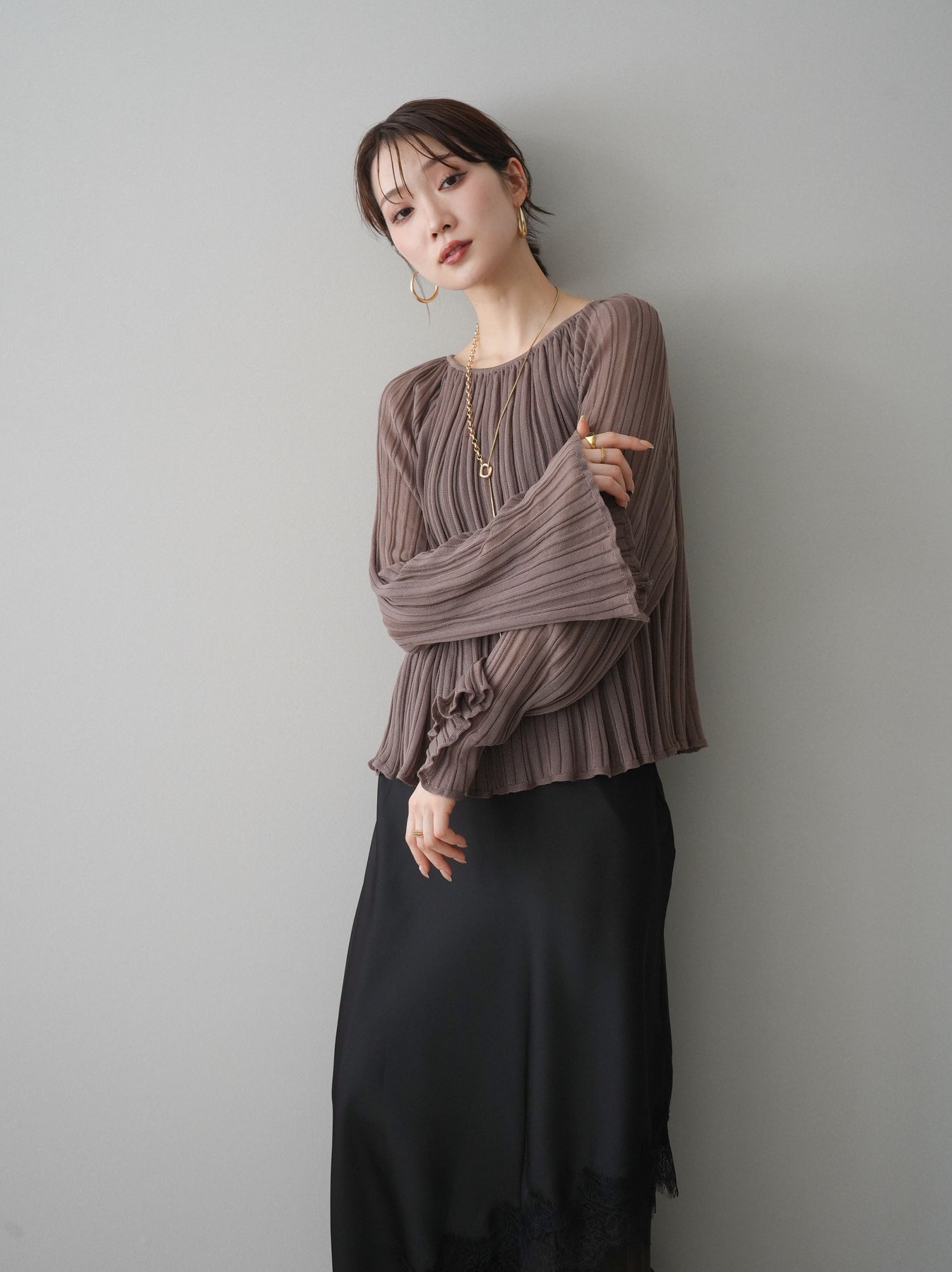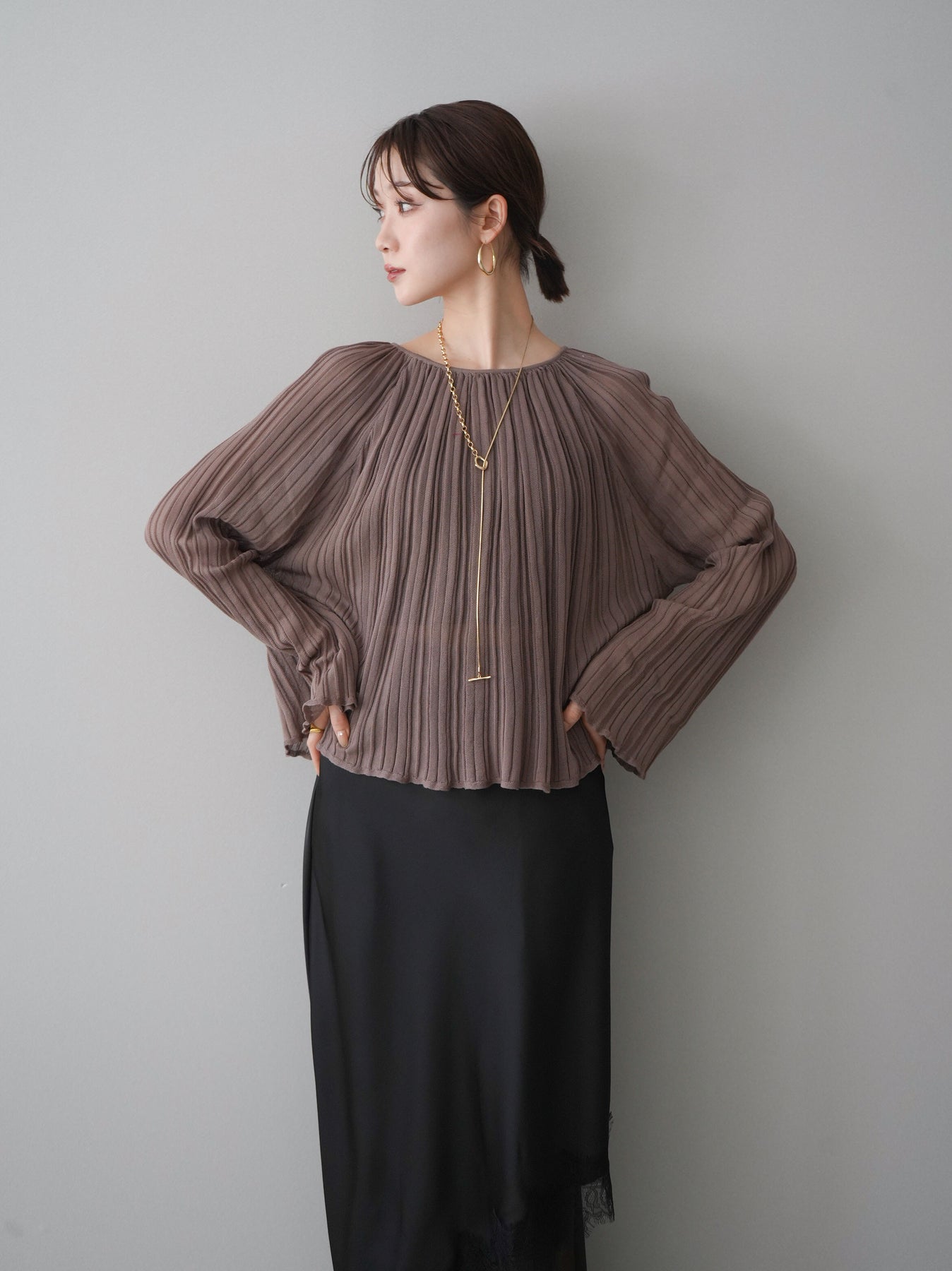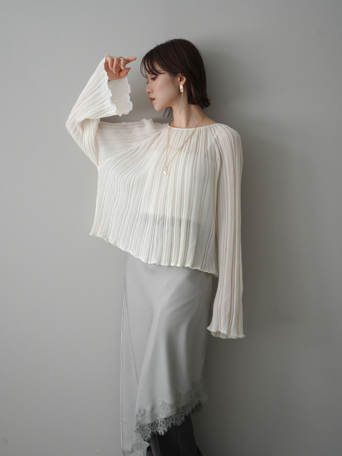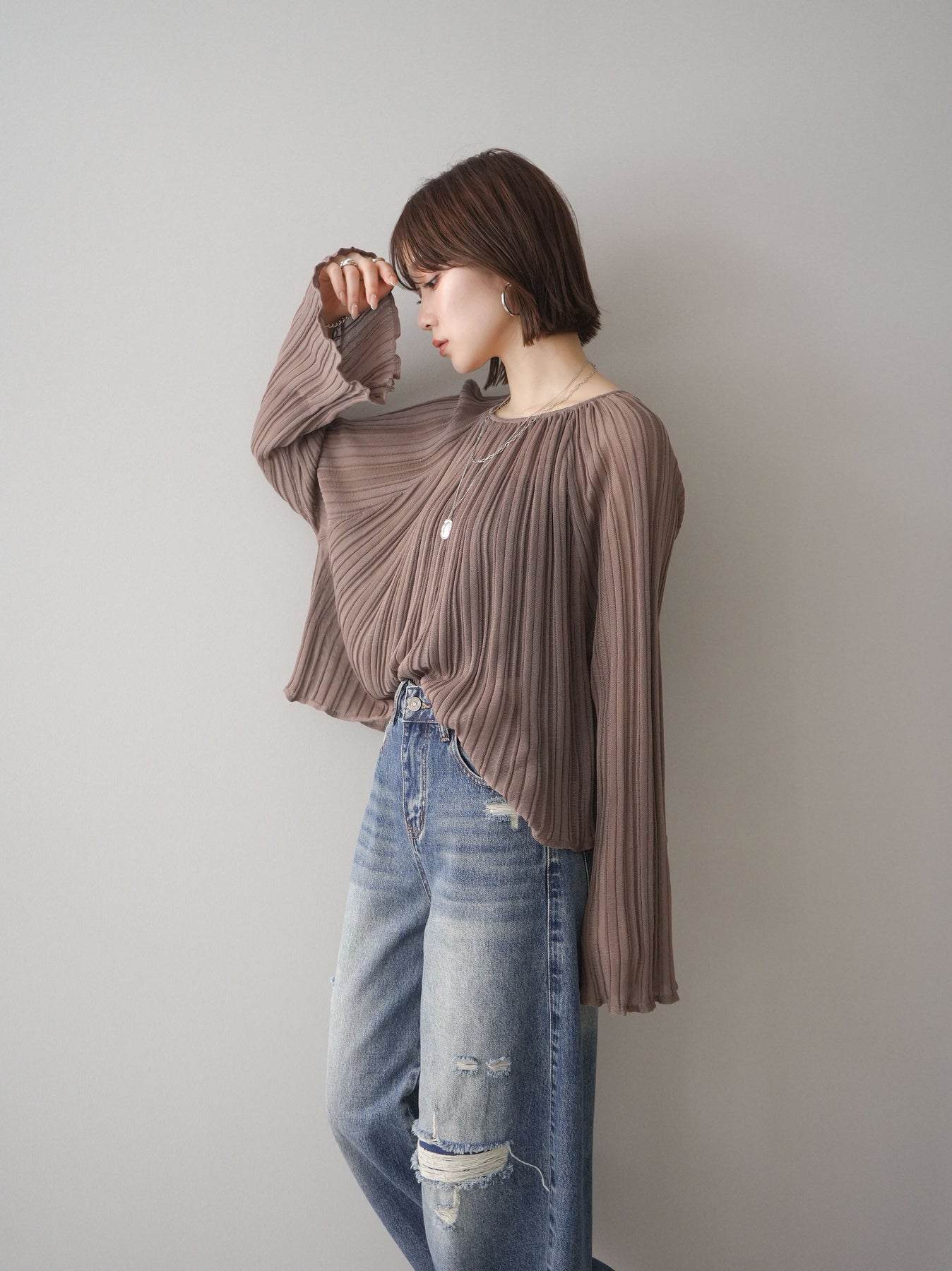 [SET]プリーツシアーフレアスリーブニットトップス+選べるアクセセット(2set)