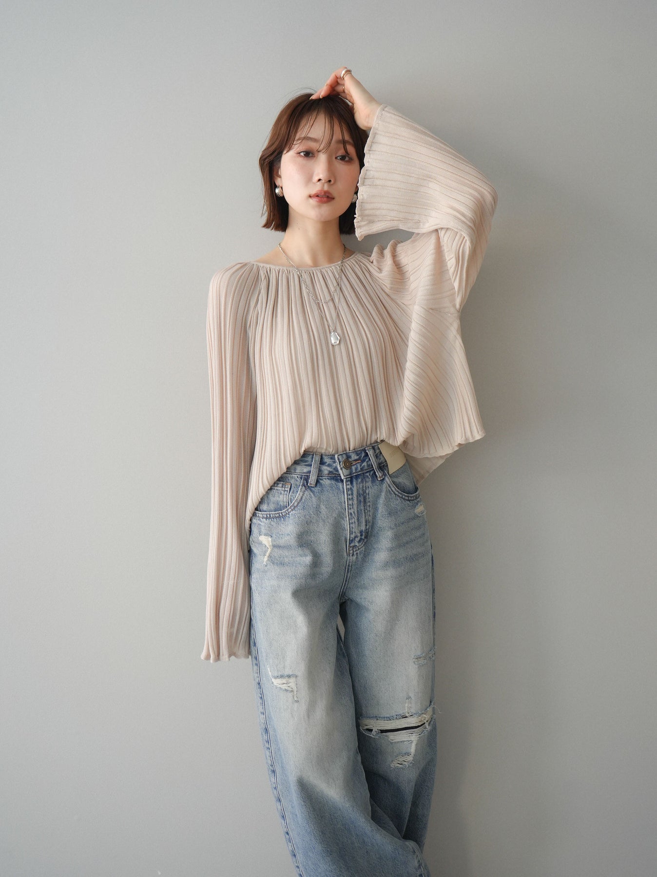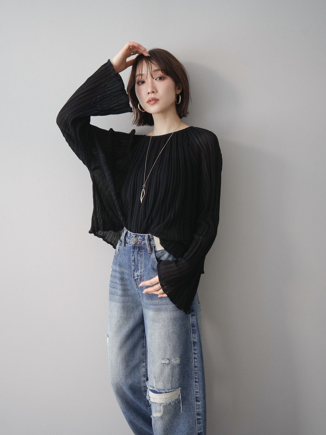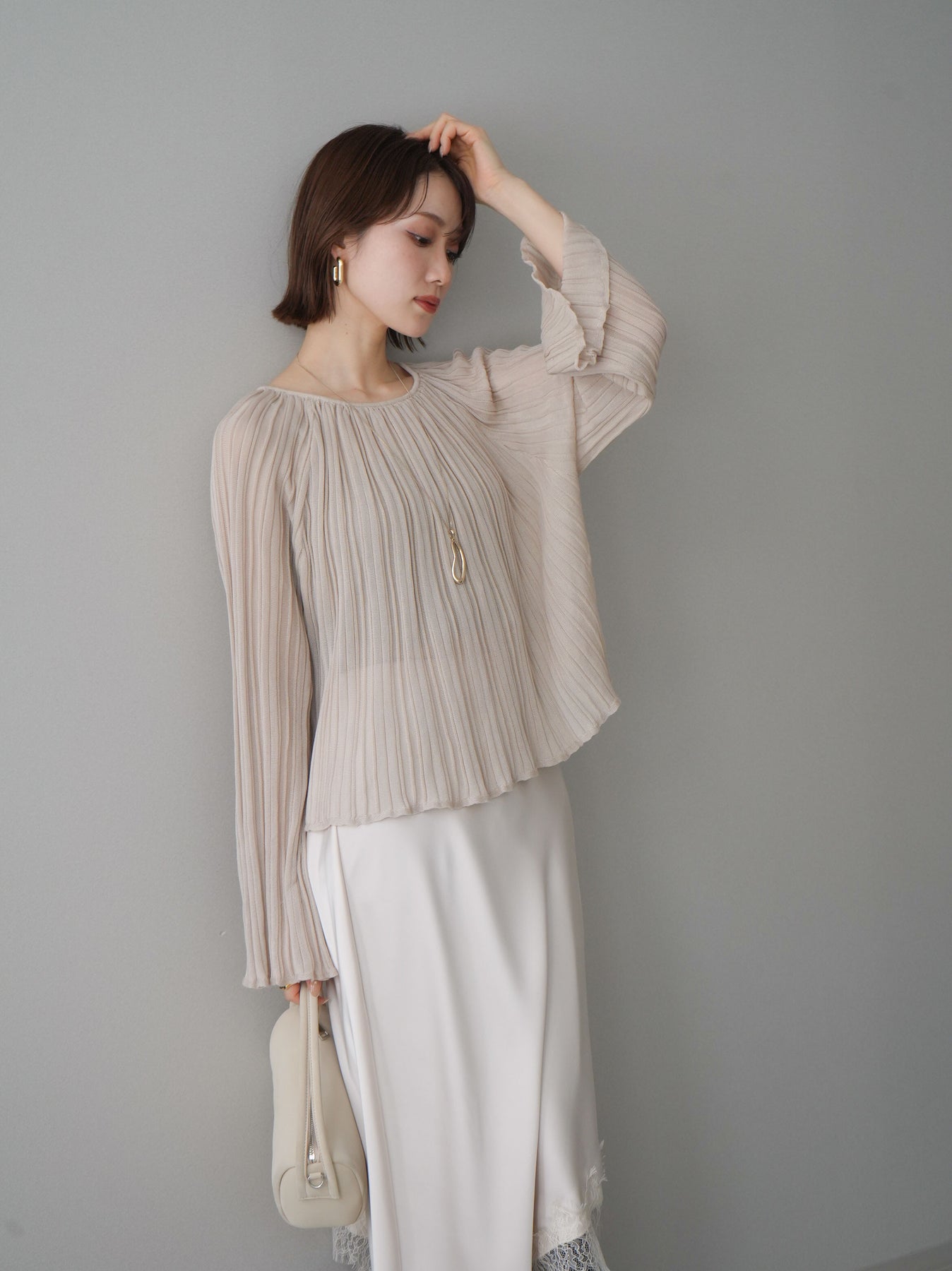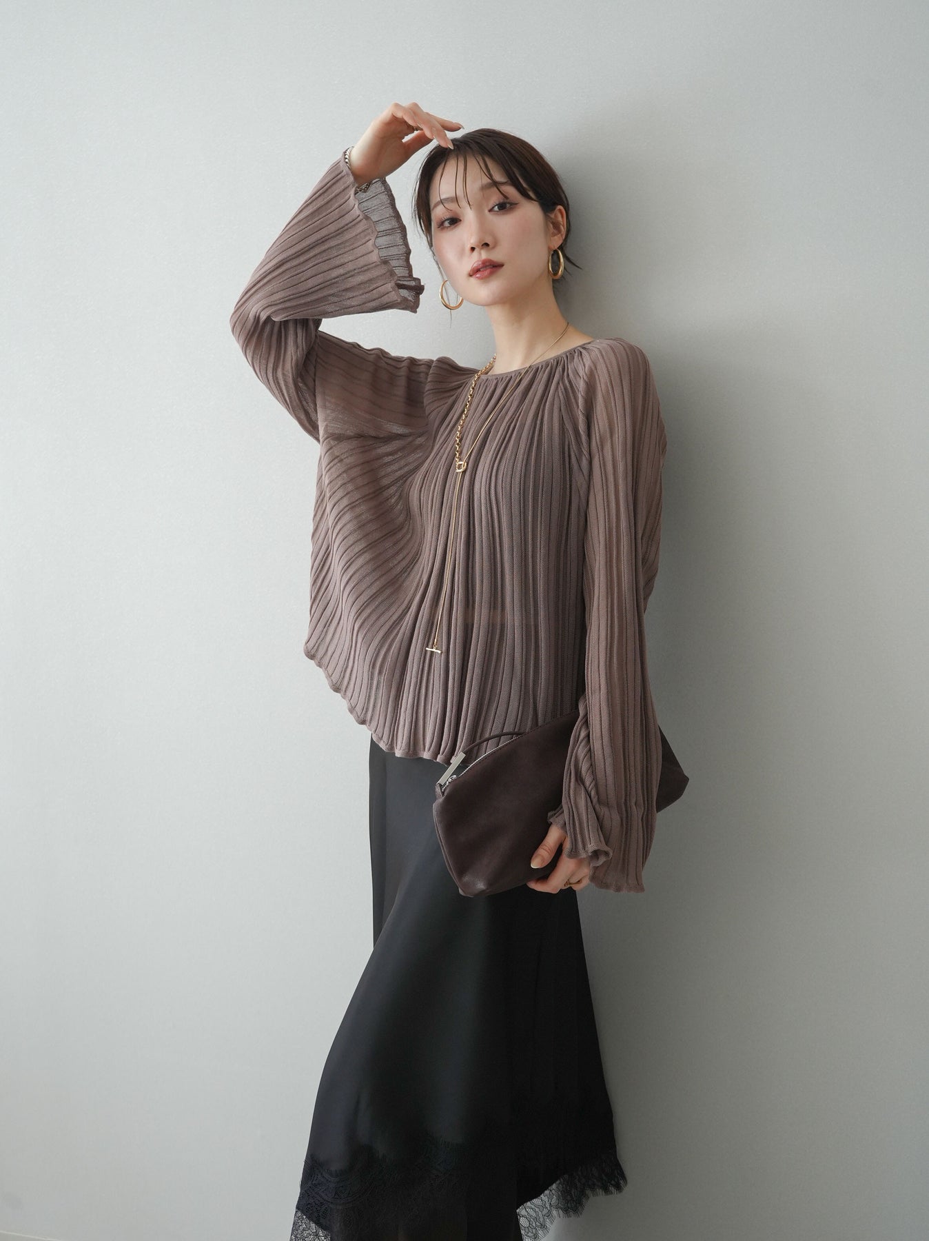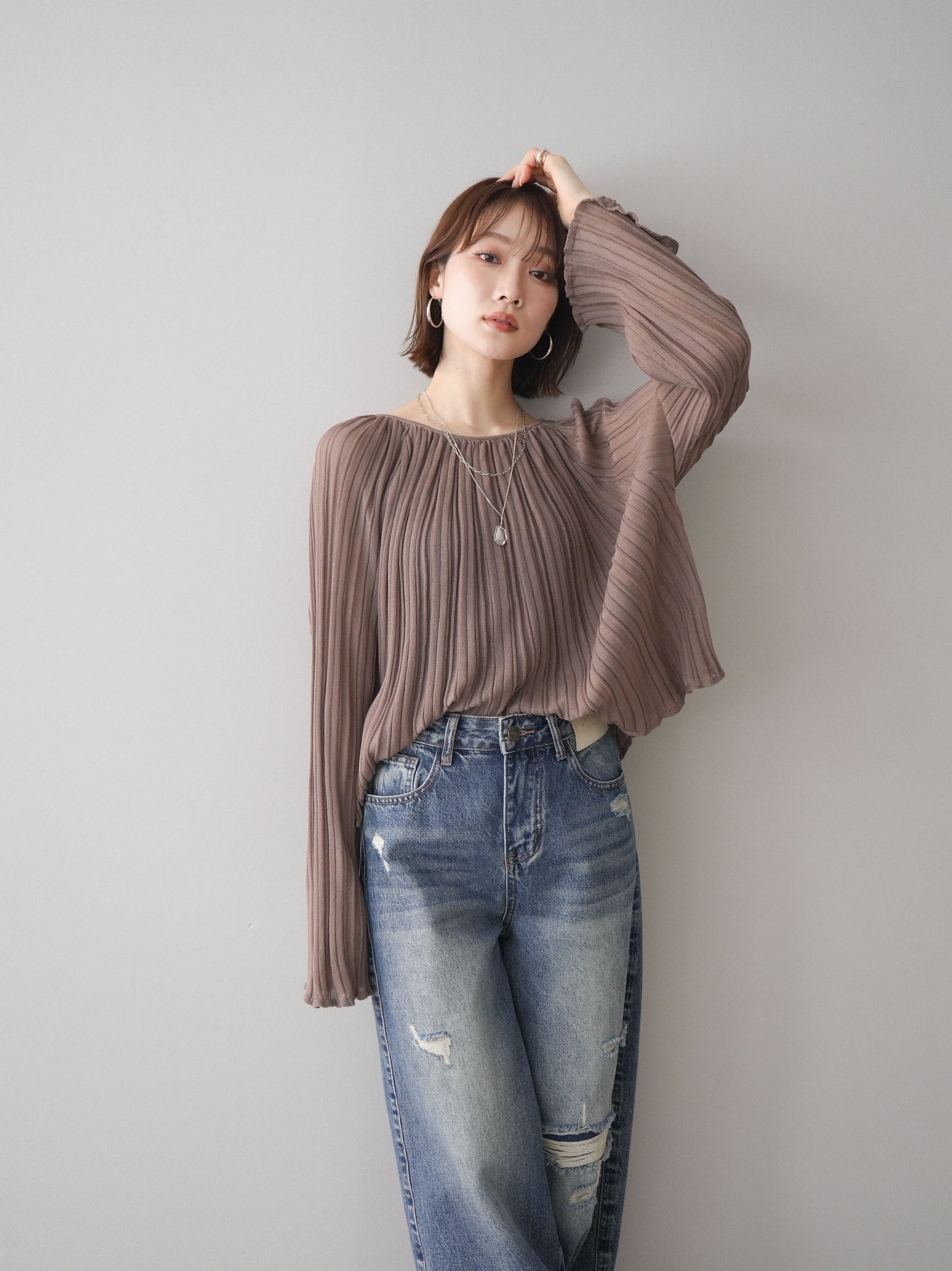 [SET]プリーツシアーフレアスリーブニットトップス+選べるアクセセット(2set)