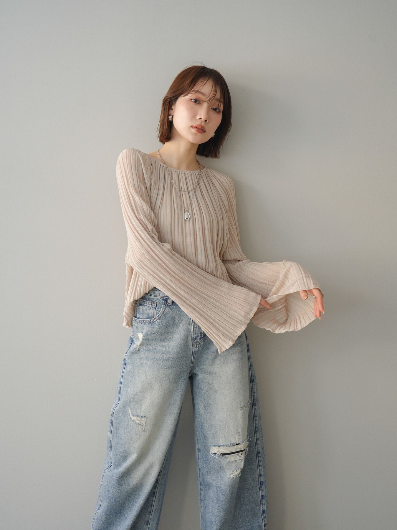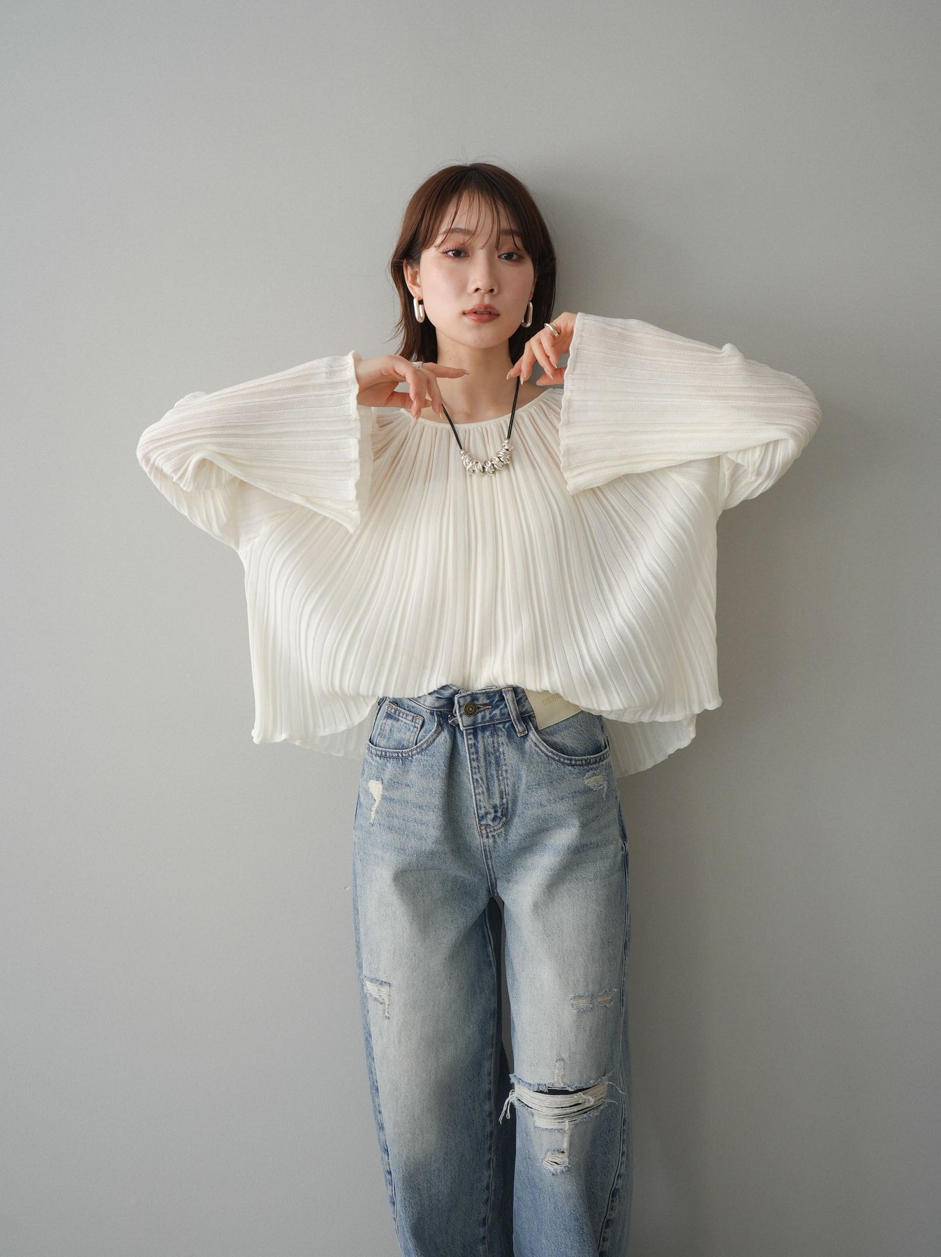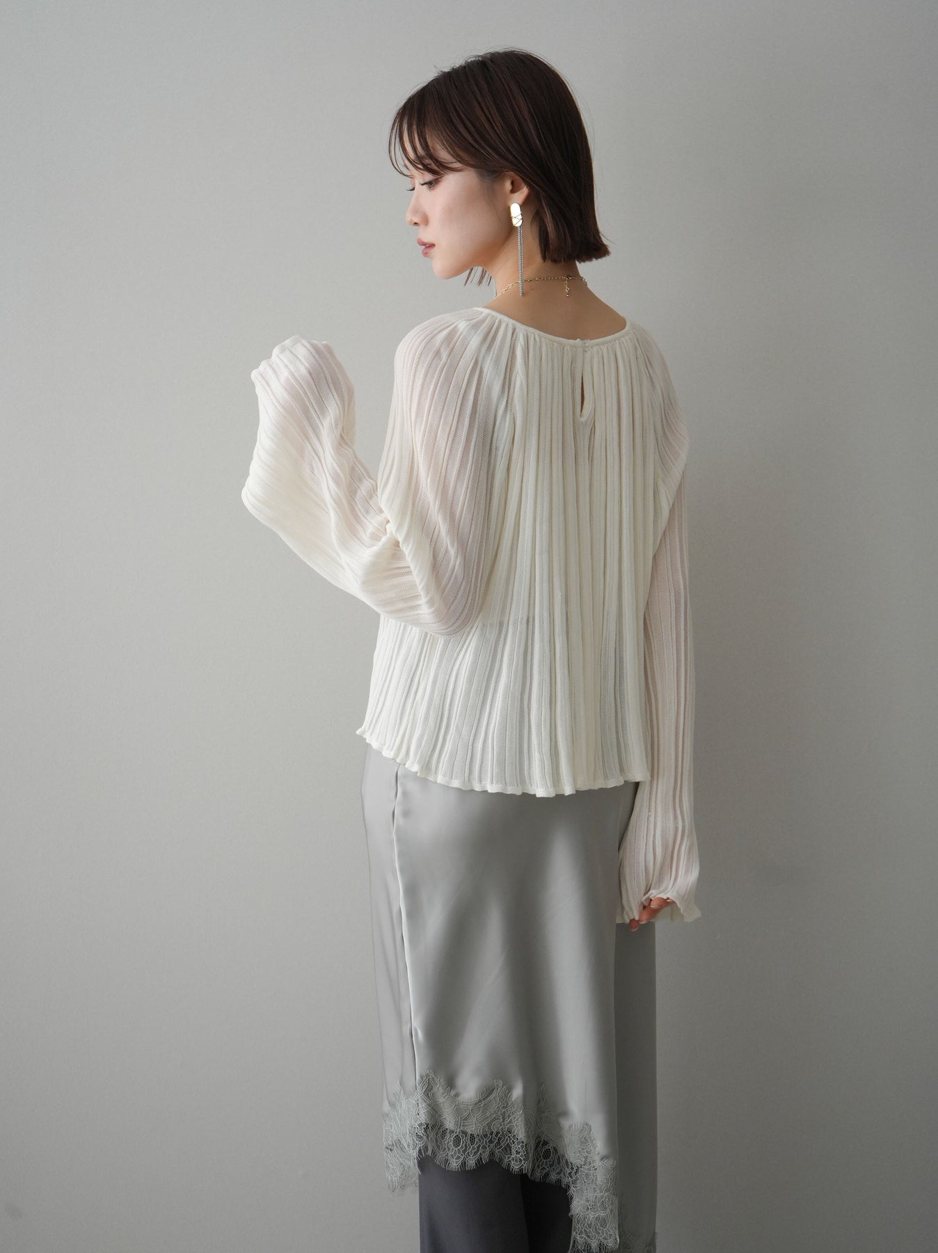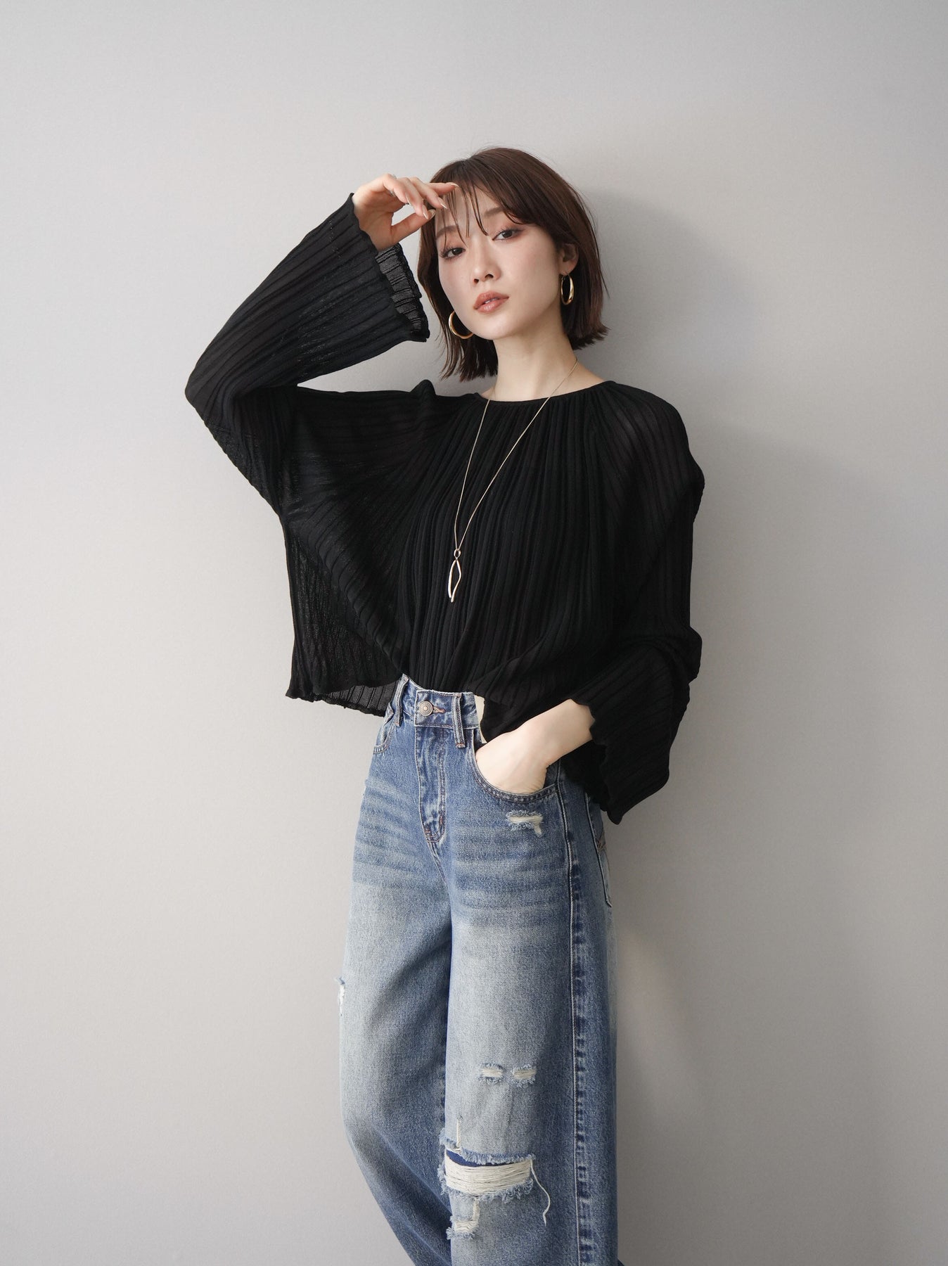 [SET]プリーツシアーフレアスリーブニットトップス+選べるアクセセット(2set)