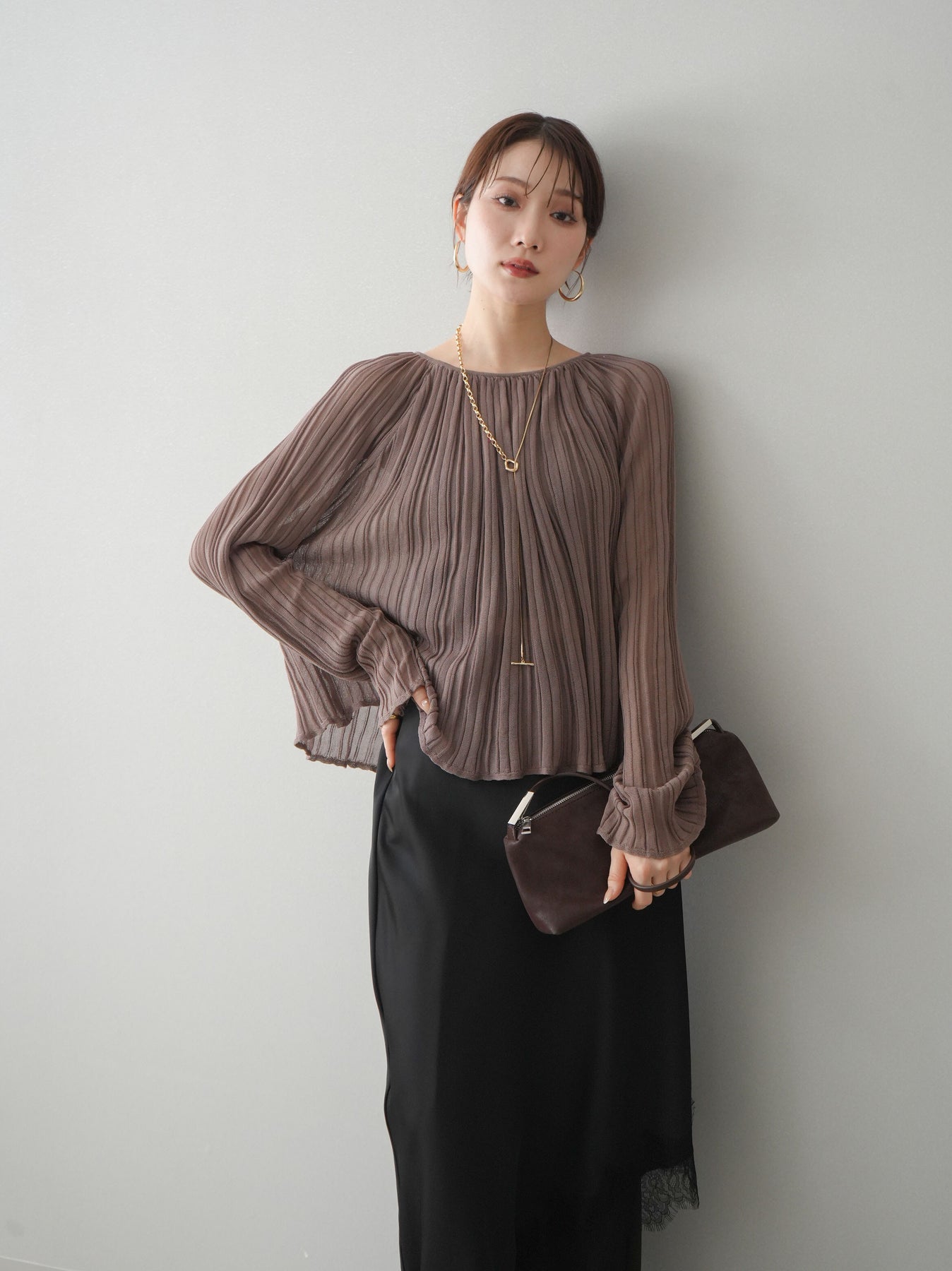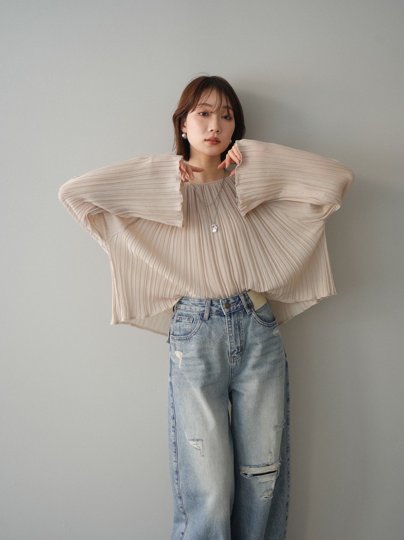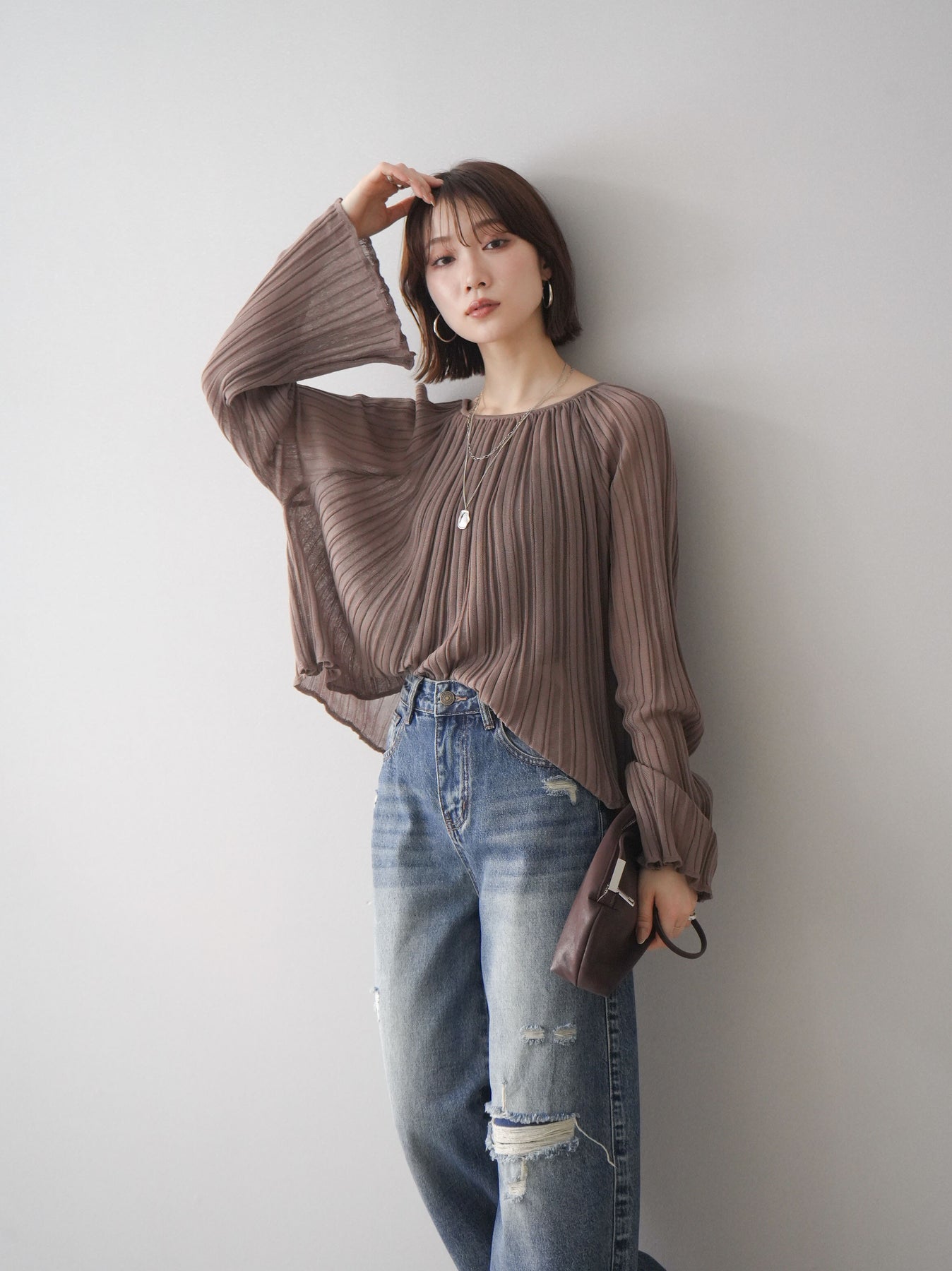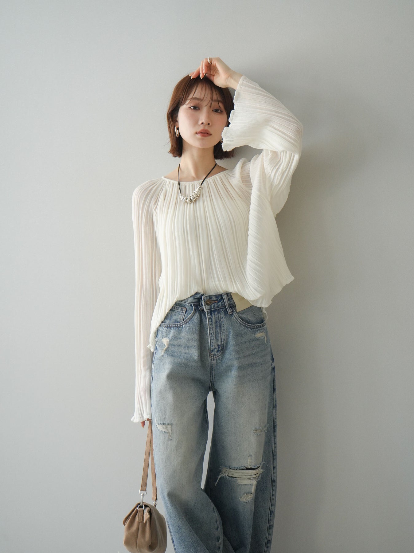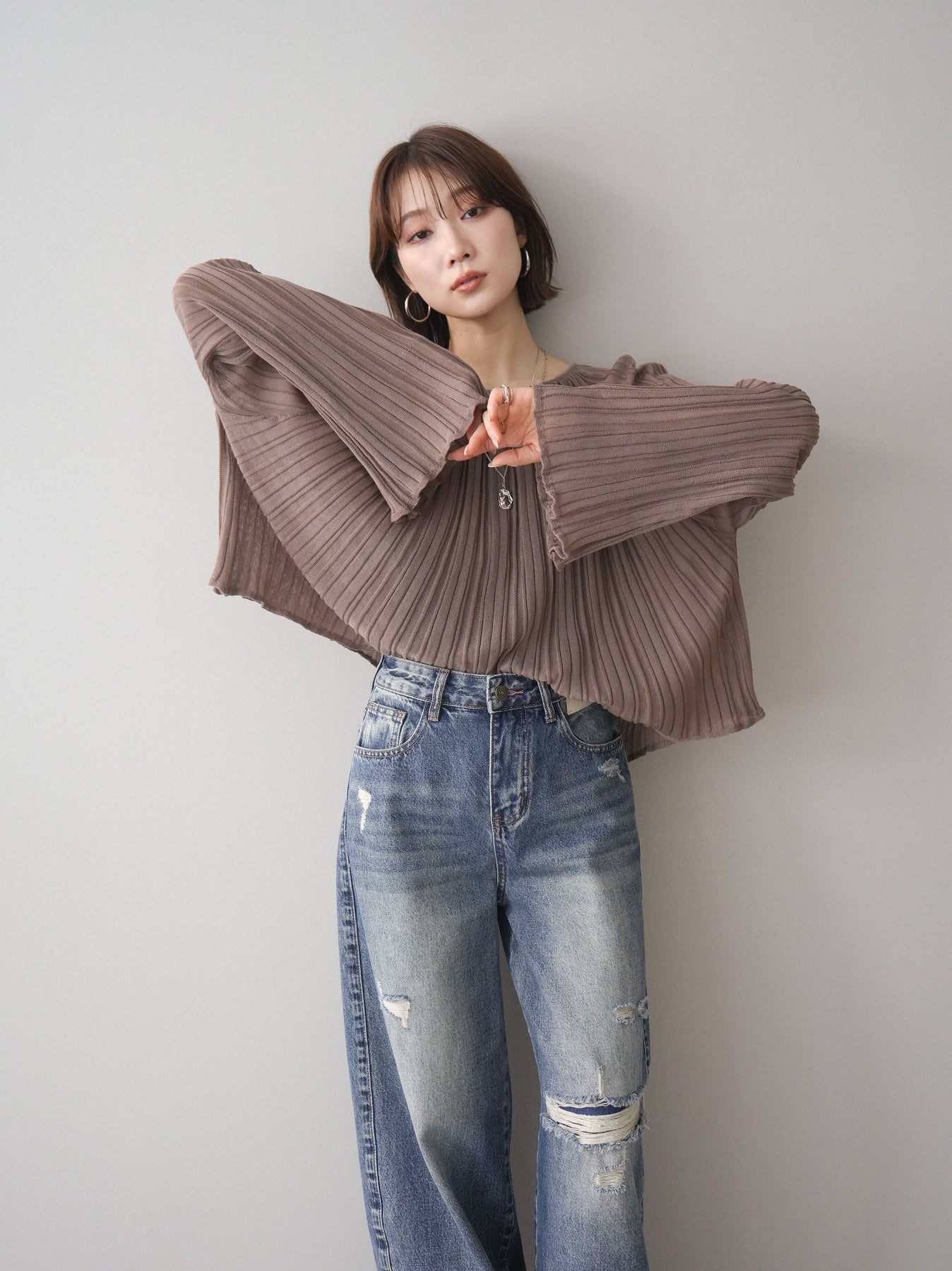 [SET]プリーツシアーフレアスリーブニットトップス+選べるアクセセット(2set)