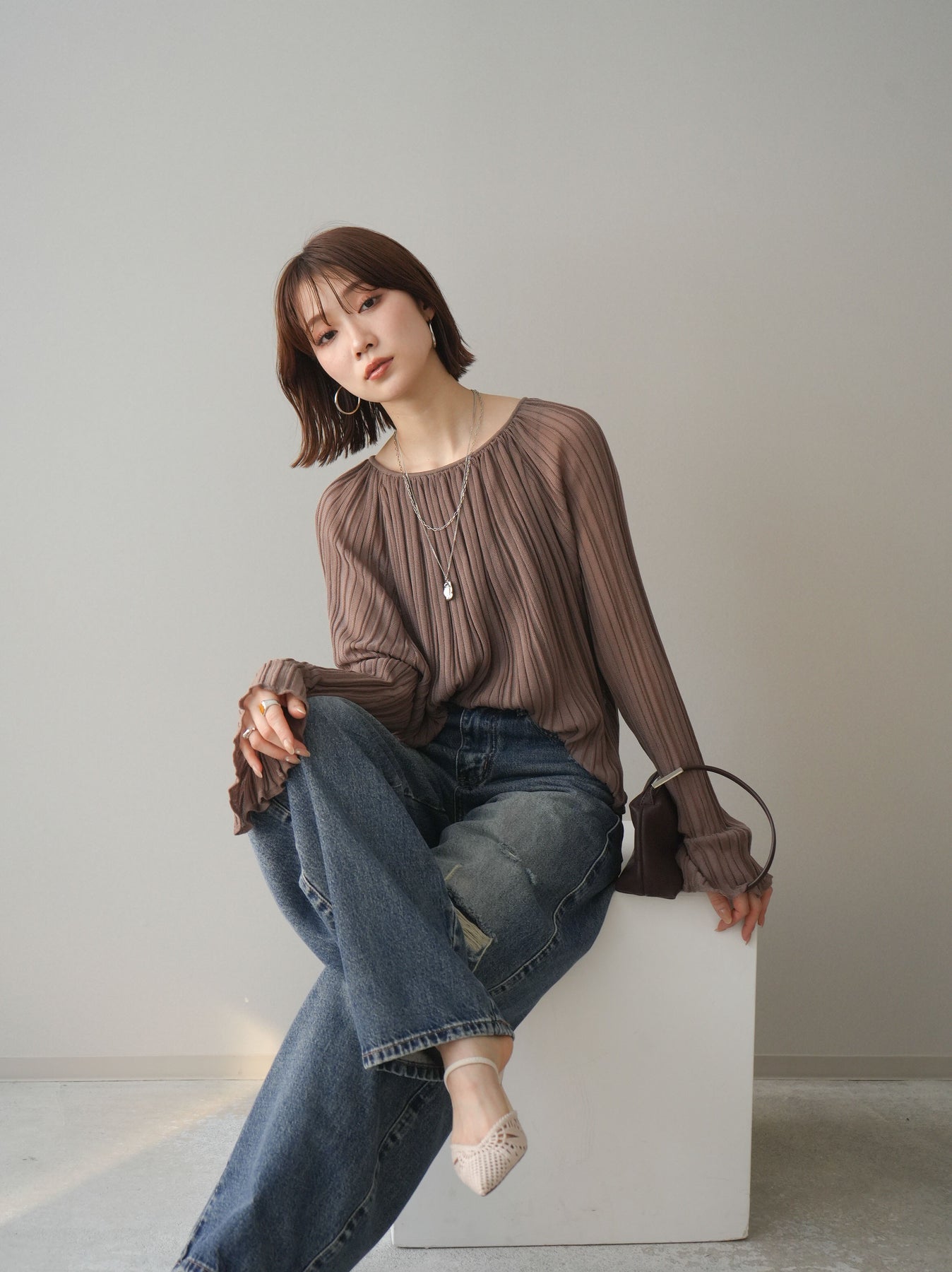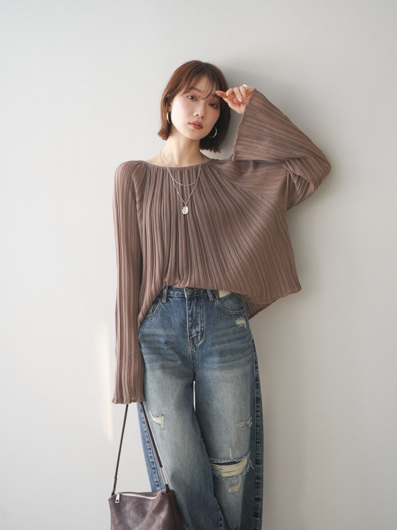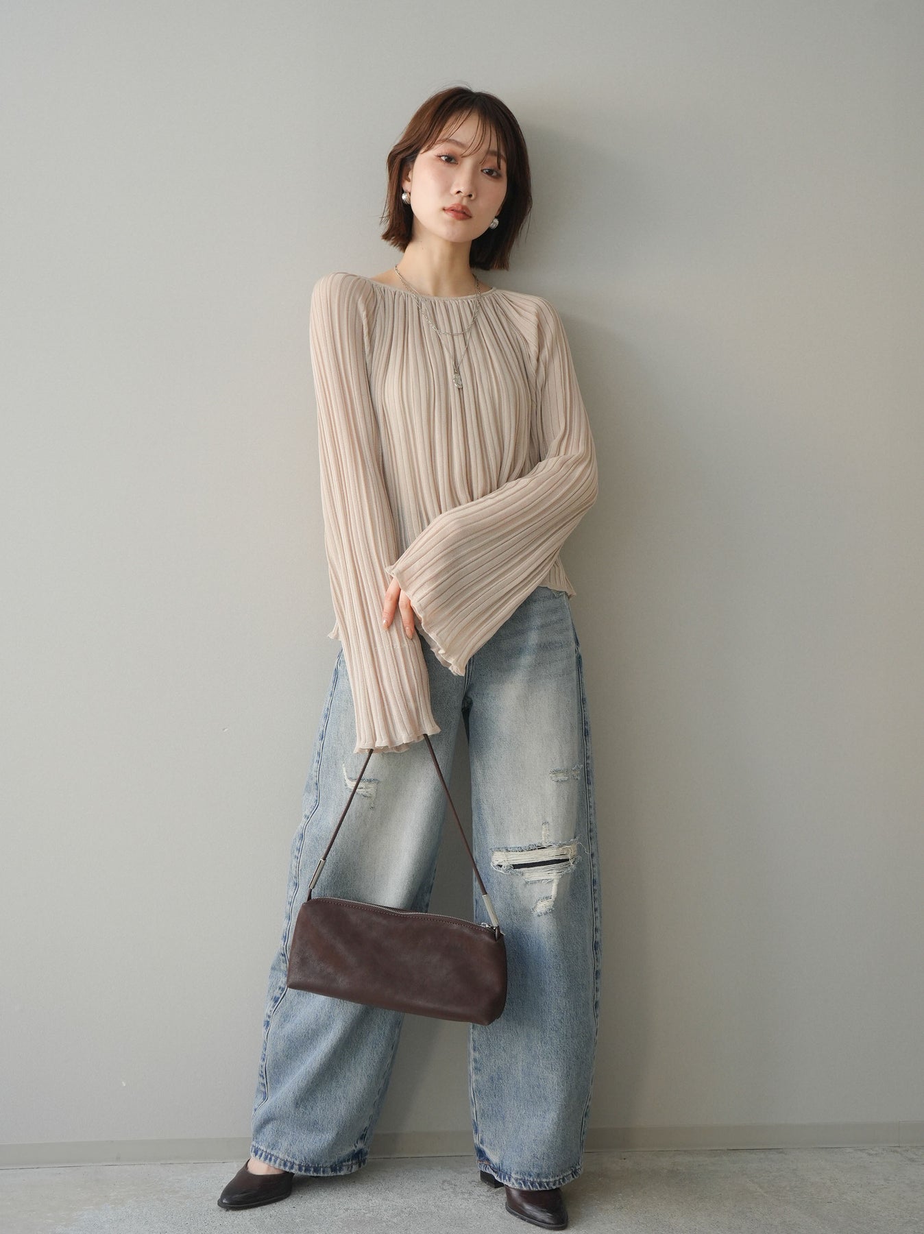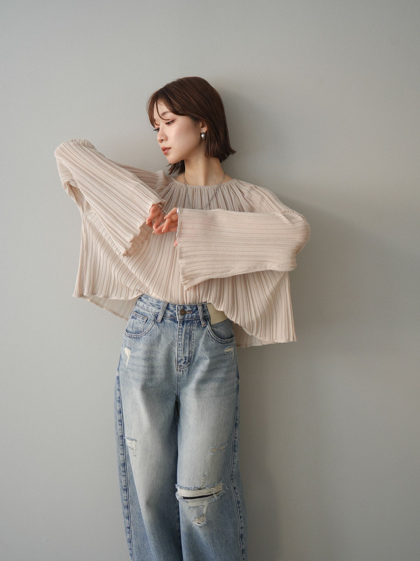 [SET]プリーツシアーフレアスリーブニットトップス+選べるアクセセット(2set)