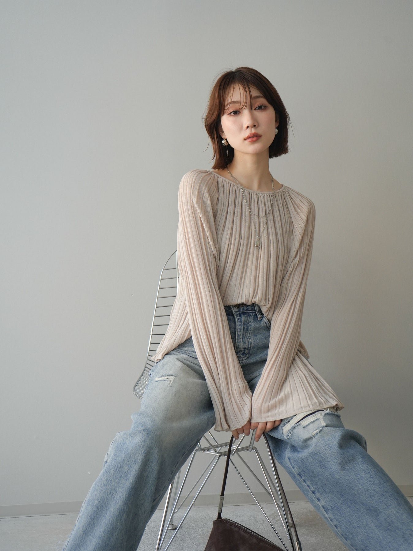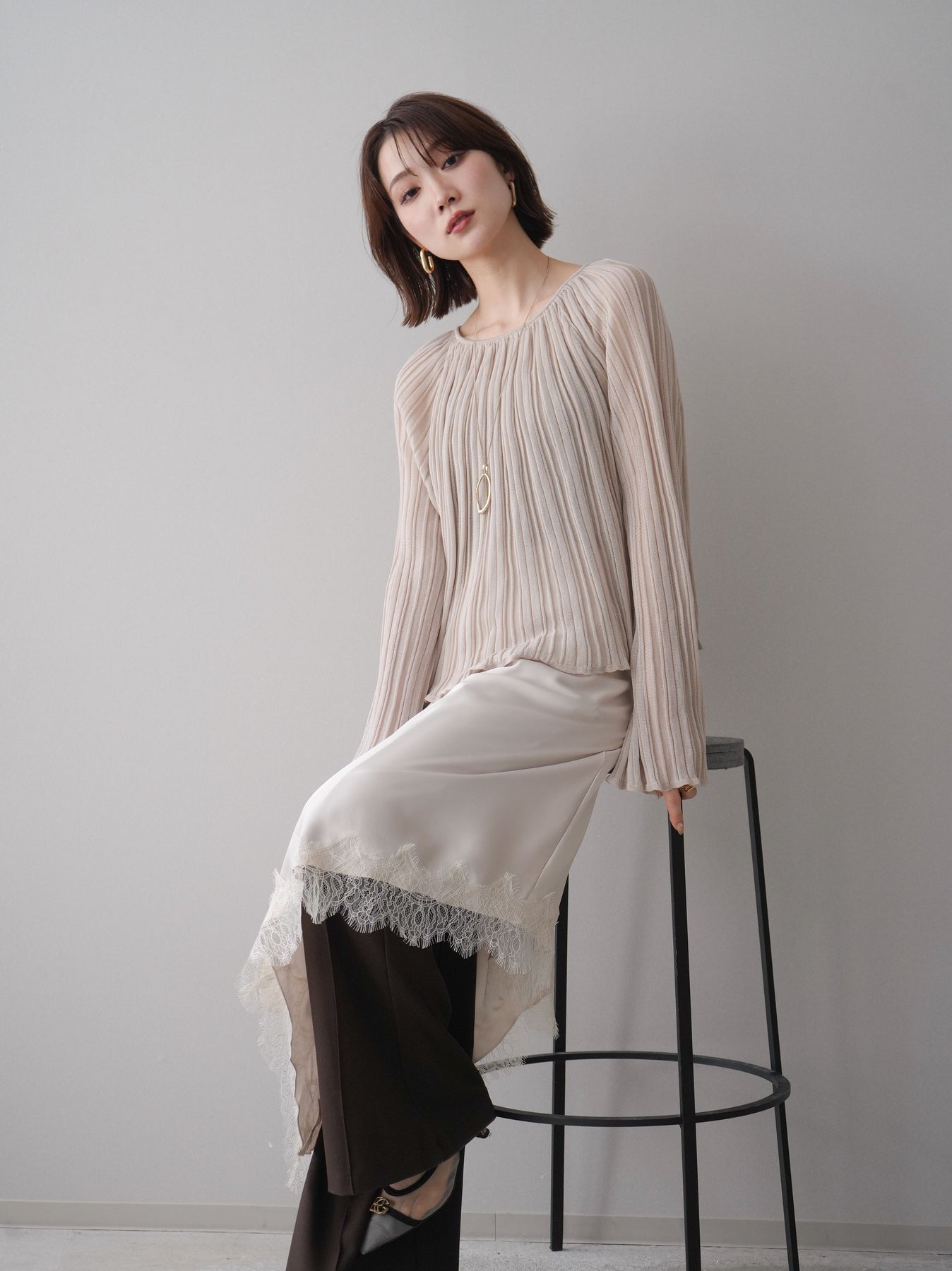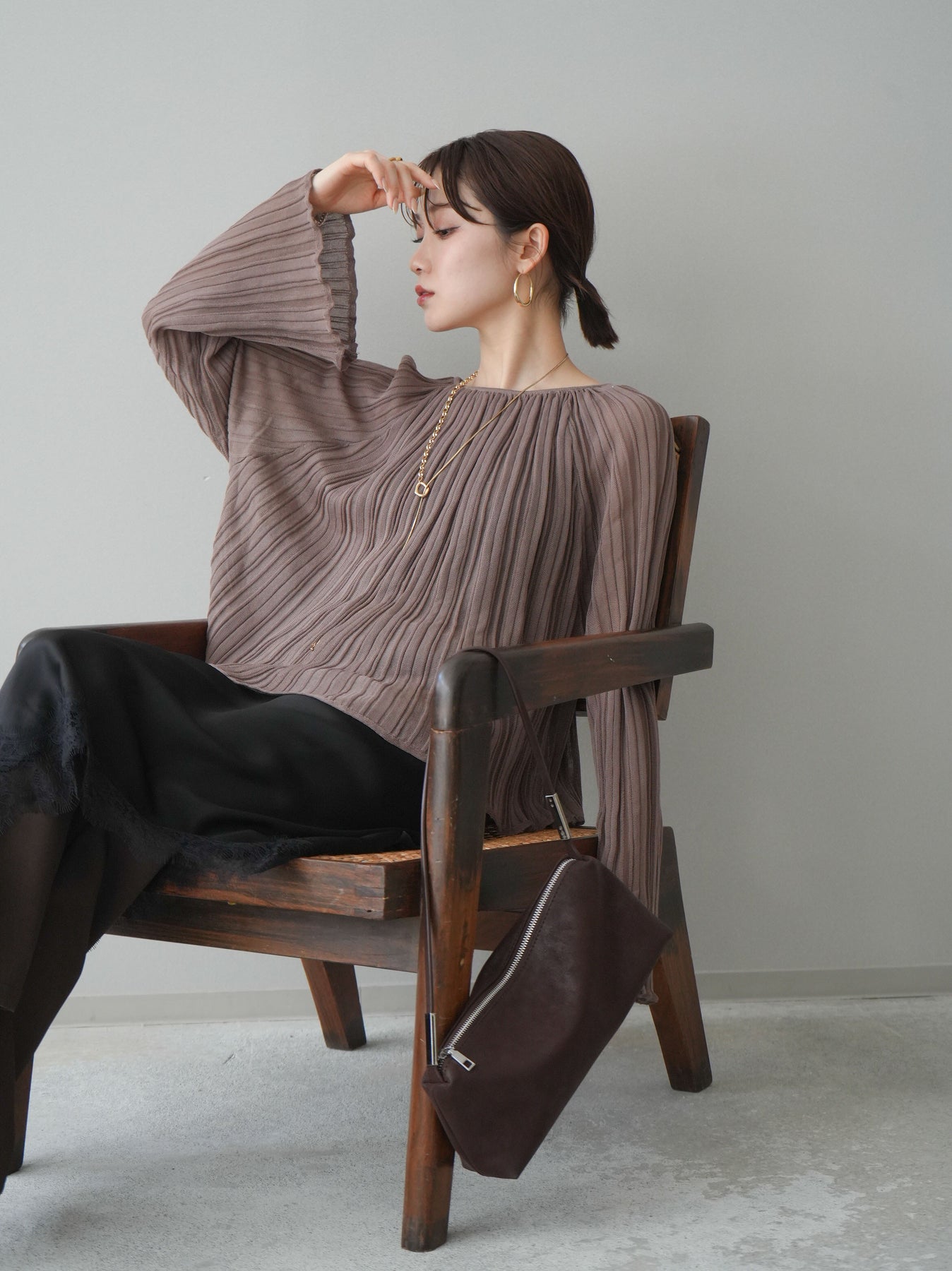 繊細なプリーツ加工が表情を生み出すニットトップス。縦に流れるラインがすっきりとした印象を与え、程よくフィットしながらも軽やかな着心地を叶えます。シンプルなデザインでありながら、動くたびに揺れるプリーツが女性らしさを引き立て、デニムからきれいめボトムまで幅広いスタイリングにマッチ。1枚でもレイヤードでも活躍する万能アイテムです。