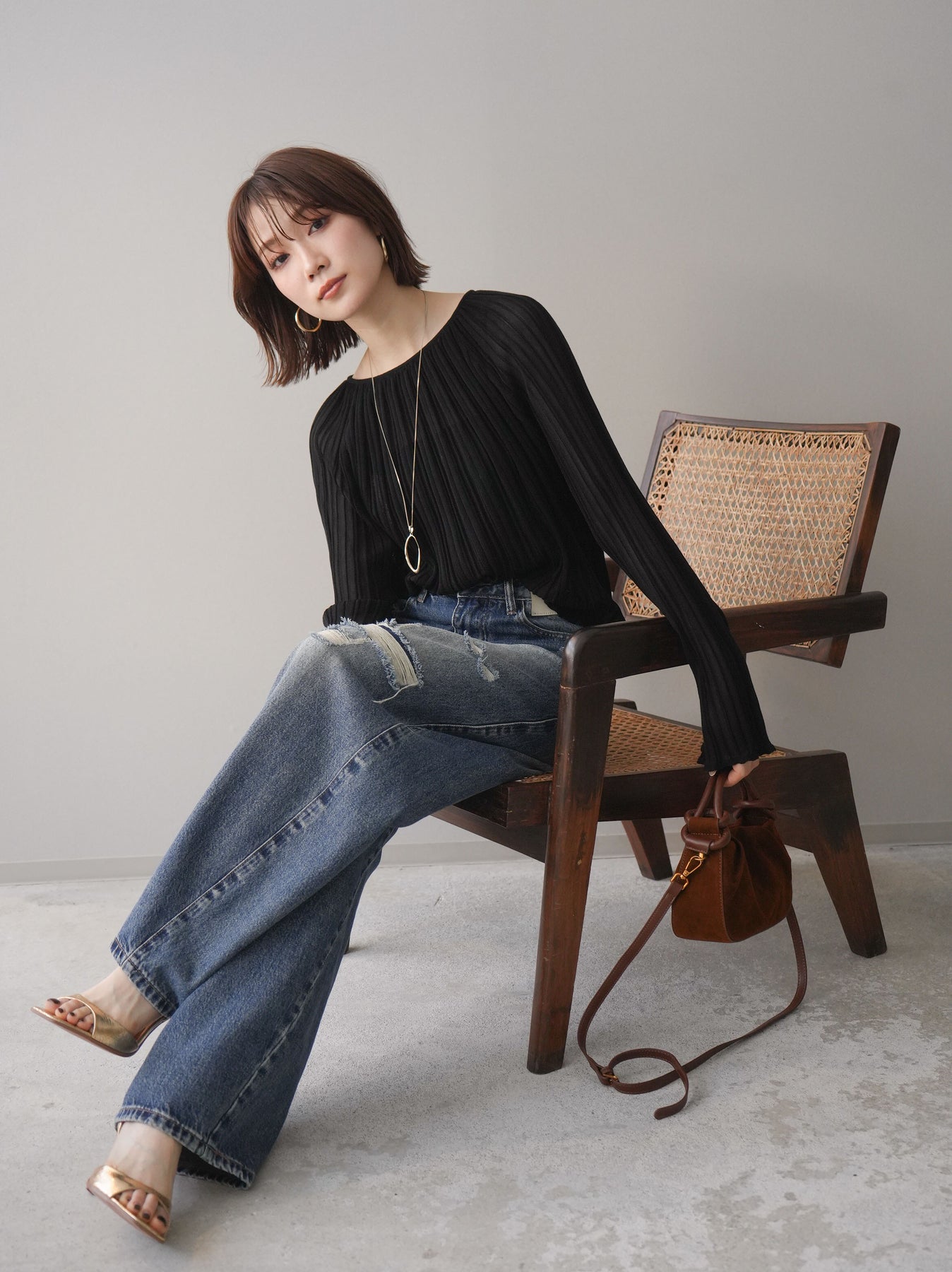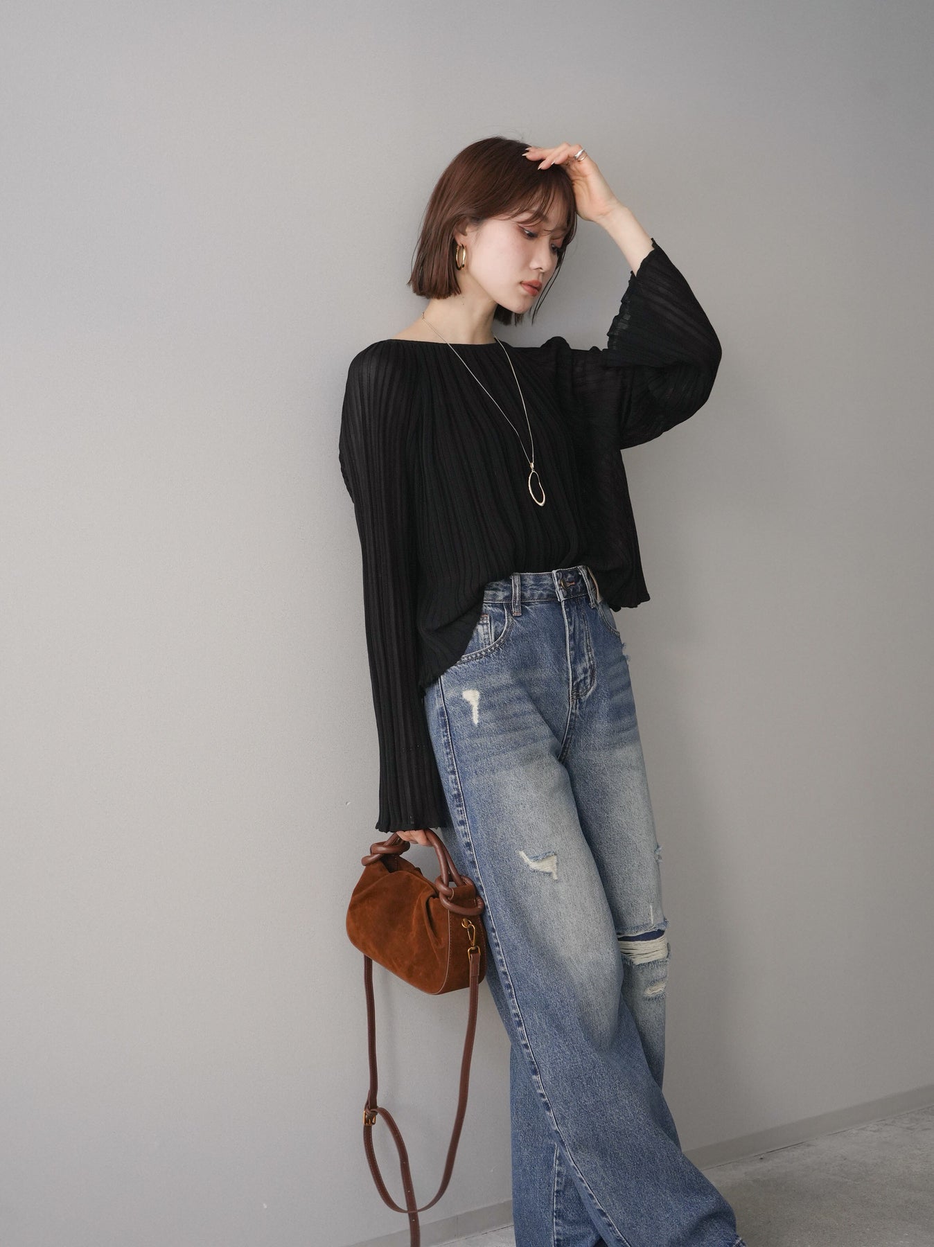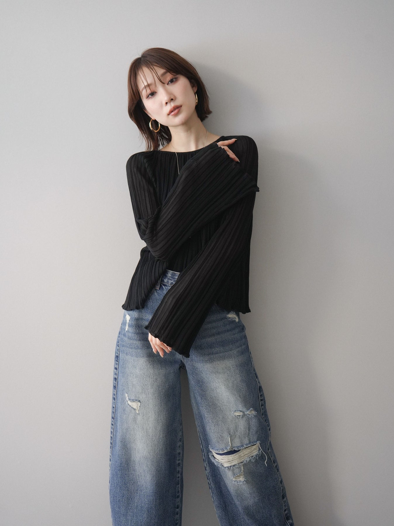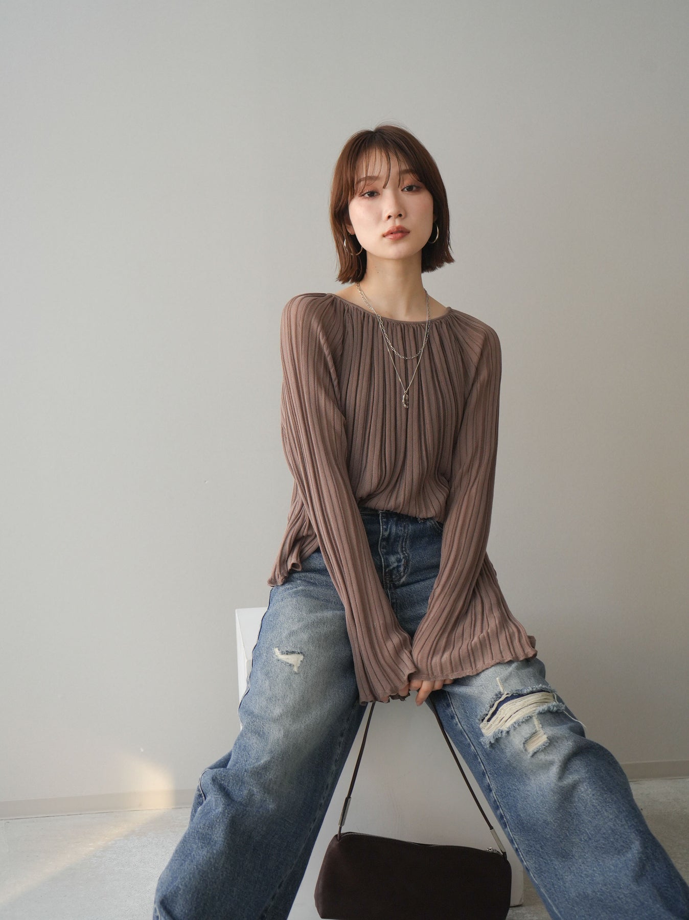 繊細なプリーツ加工が表情を生み出すニットトップス。縦に流れるラインがすっきりとした印象を与え、程よくフィットしながらも軽やかな着心地を叶えます。シンプルなデザインでありながら、動くたびに揺れるプリーツが女性らしさを引き立て、デニムからきれいめボトムまで幅広いスタイリングにマッチ。1枚でもレイヤードでも活躍する万能アイテムです。
