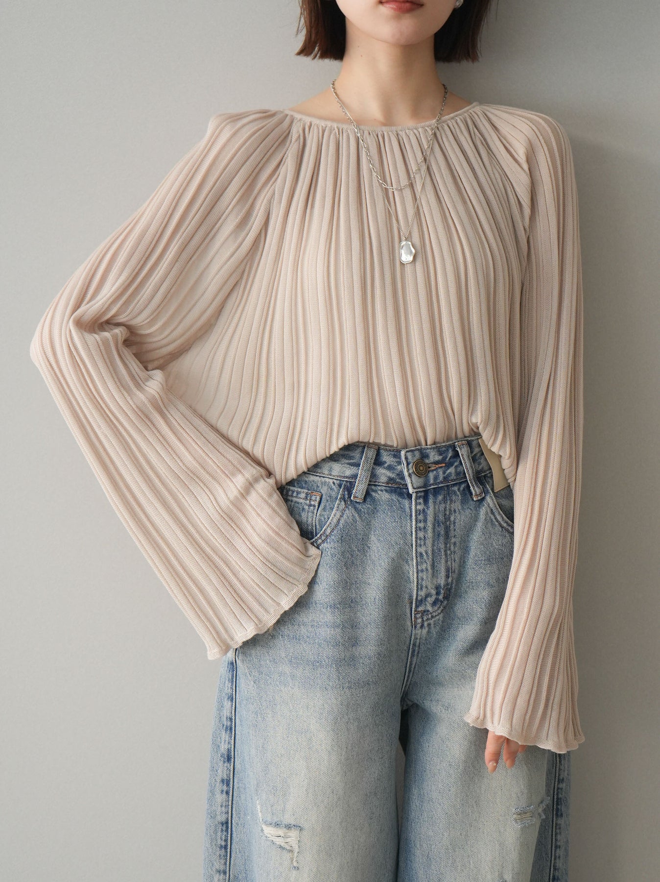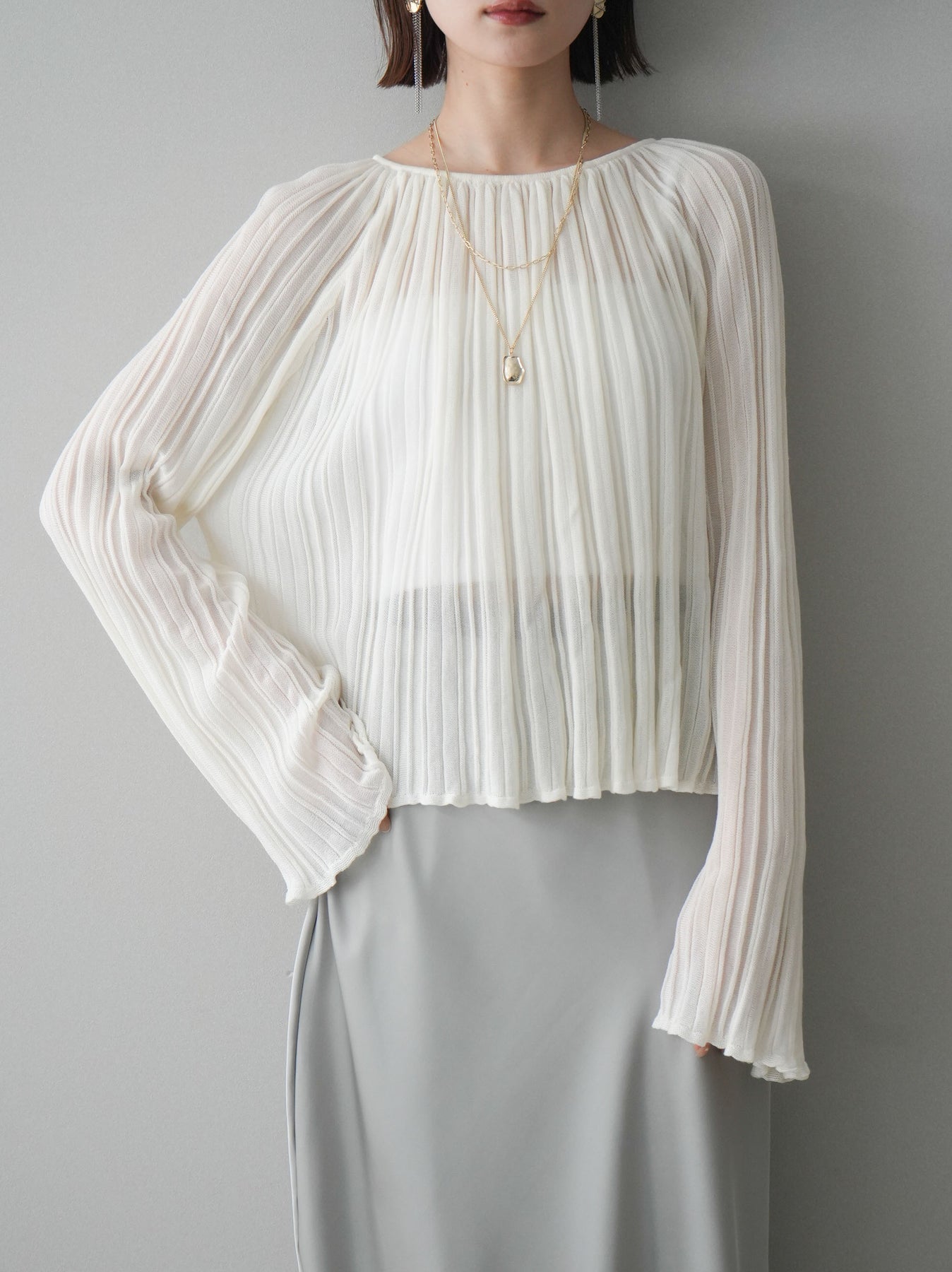 ◆ [予約]プリーツシアーフレアスリーブニットトップス