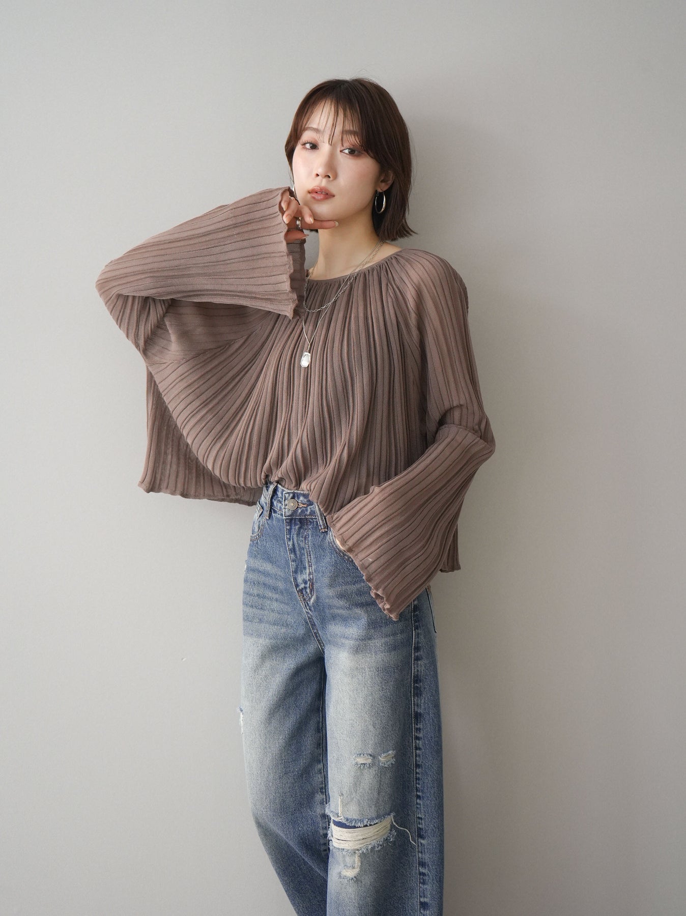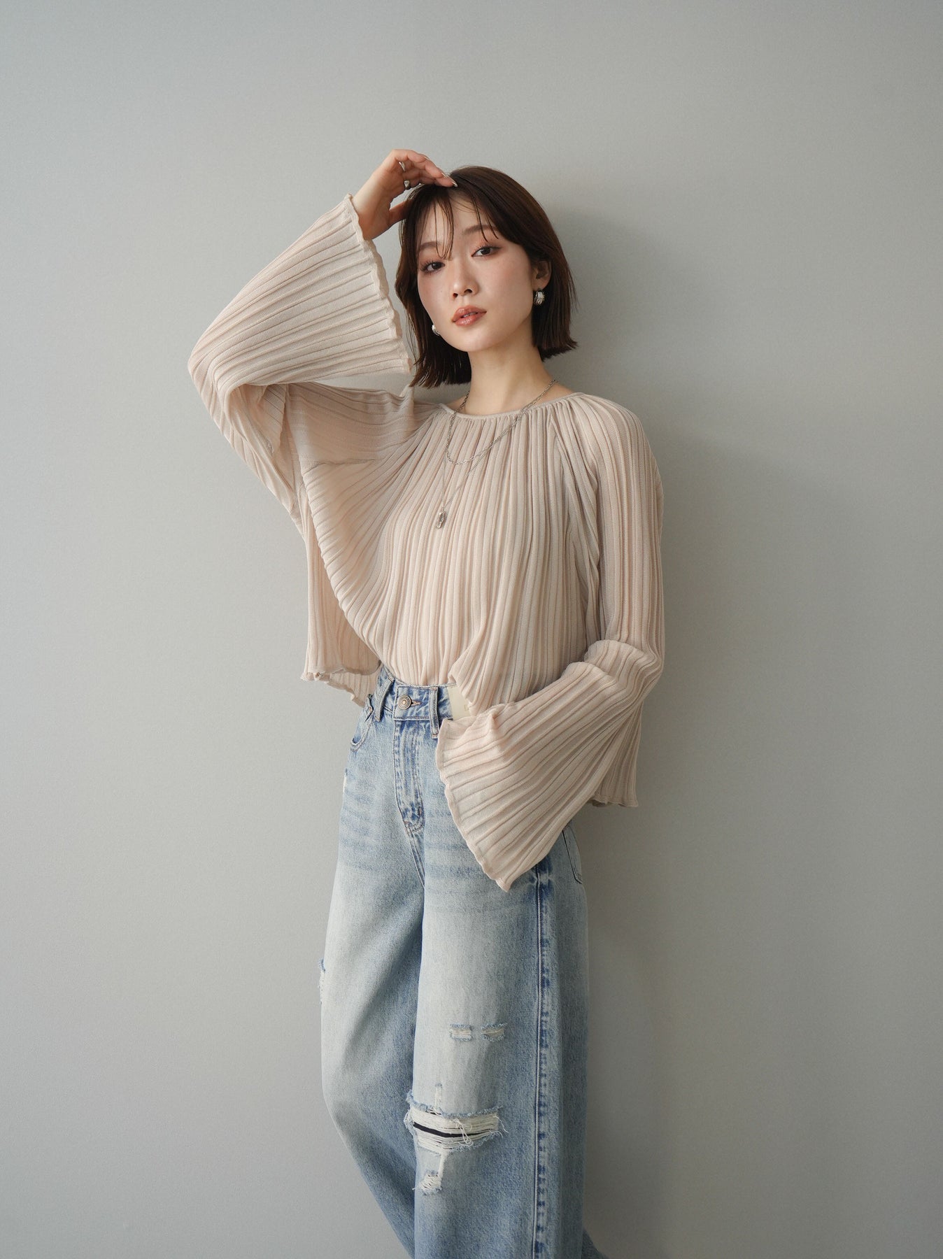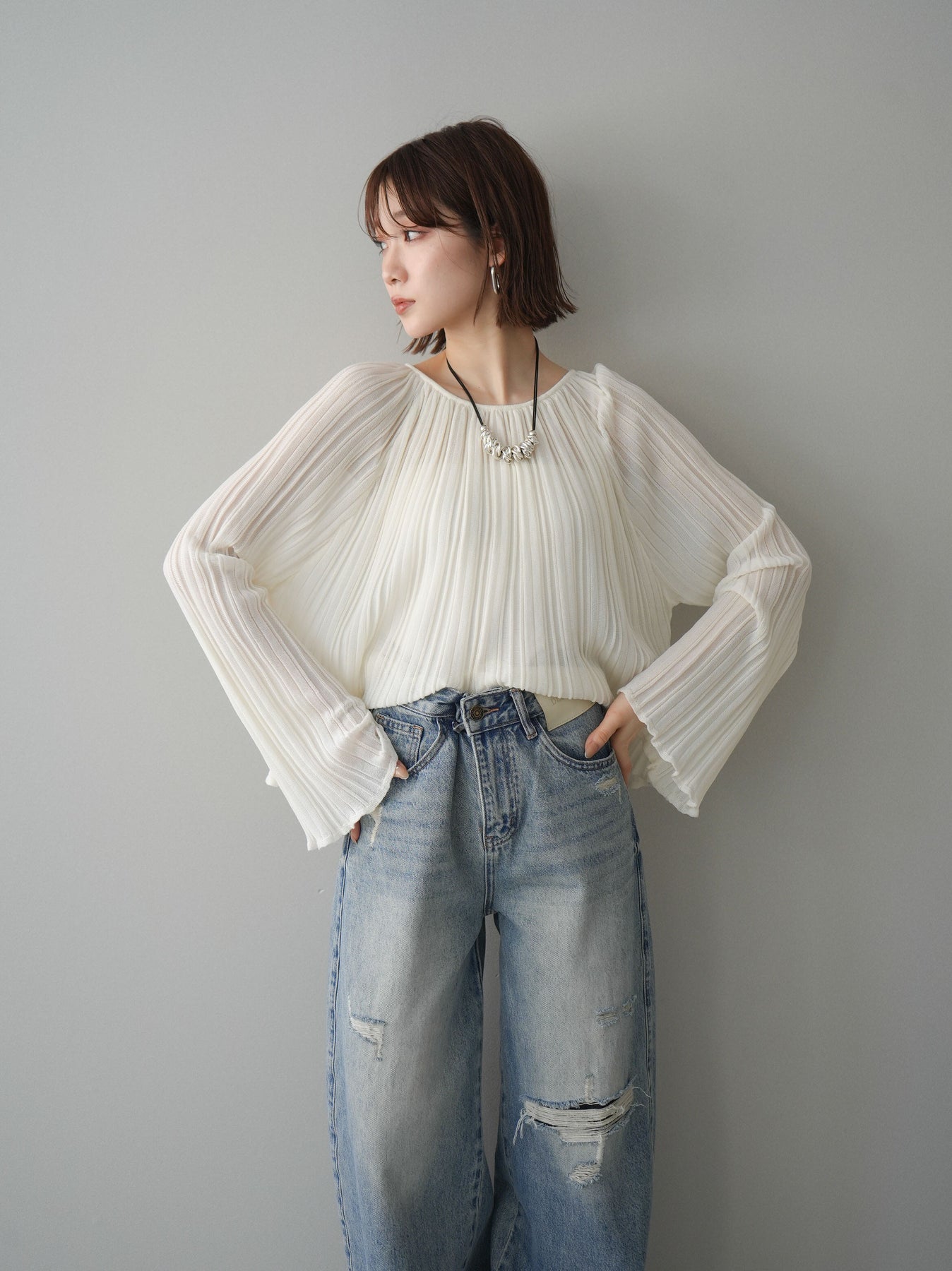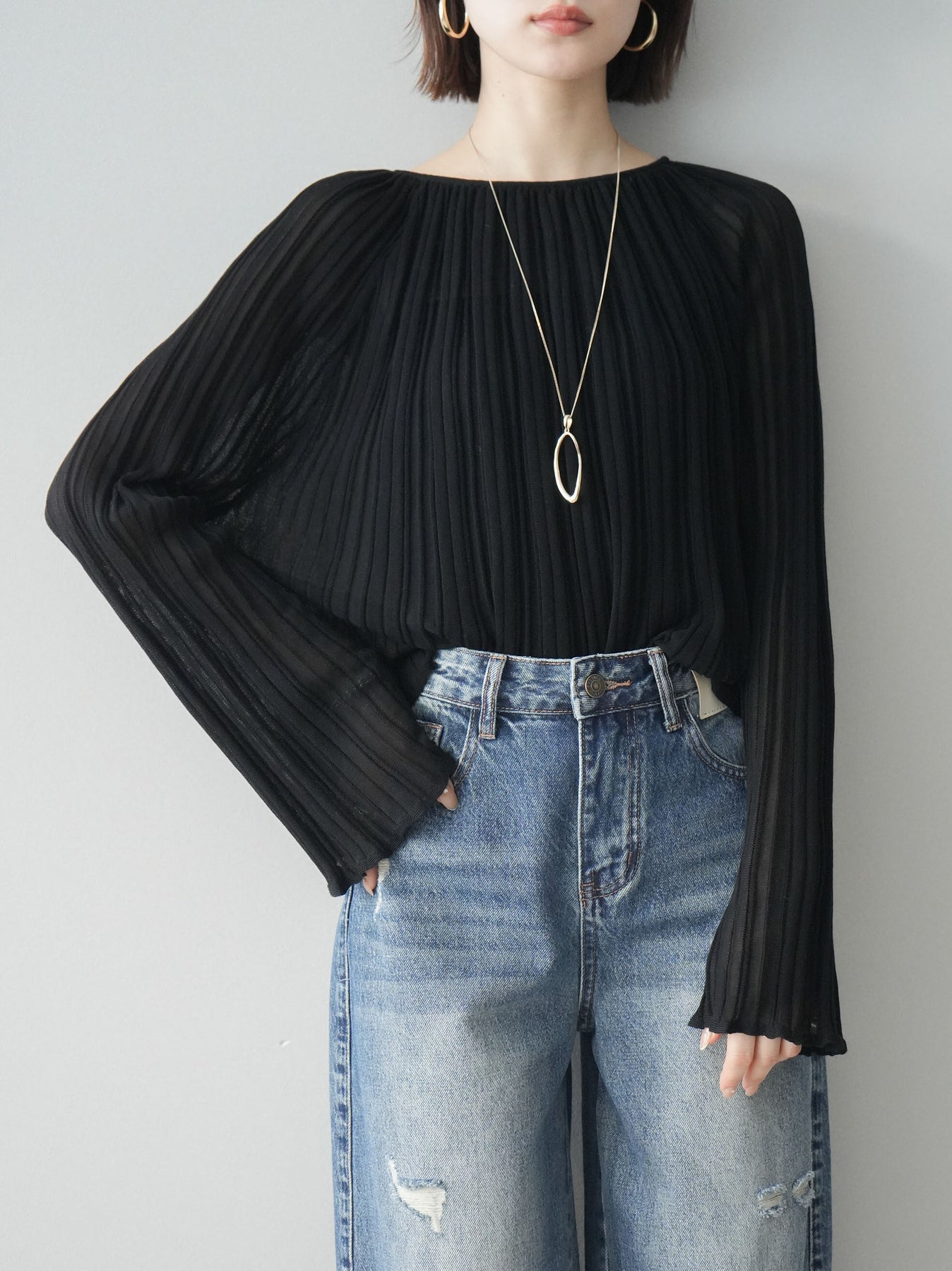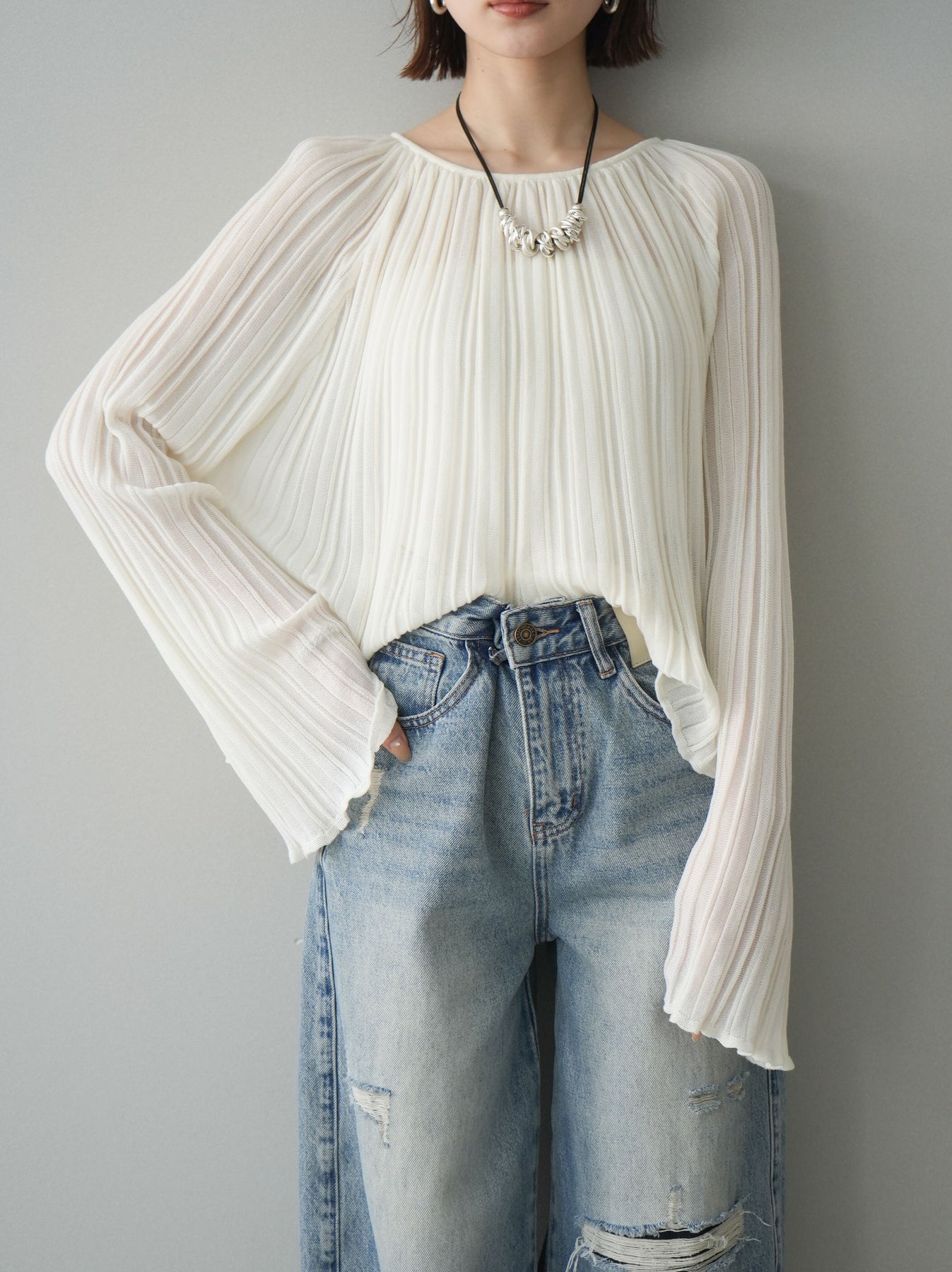 [SET]プリーツシアーフレアスリーブニットトップス+ダメージデニムセミワイドパンツ(2set)