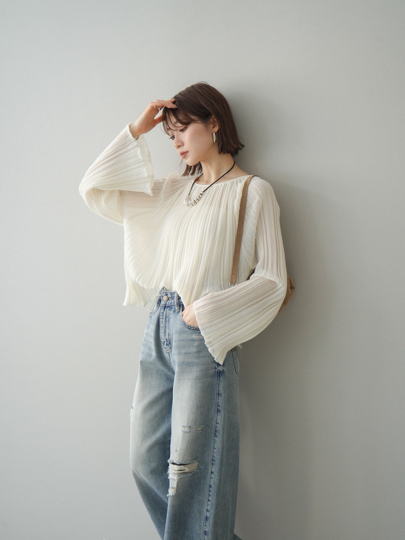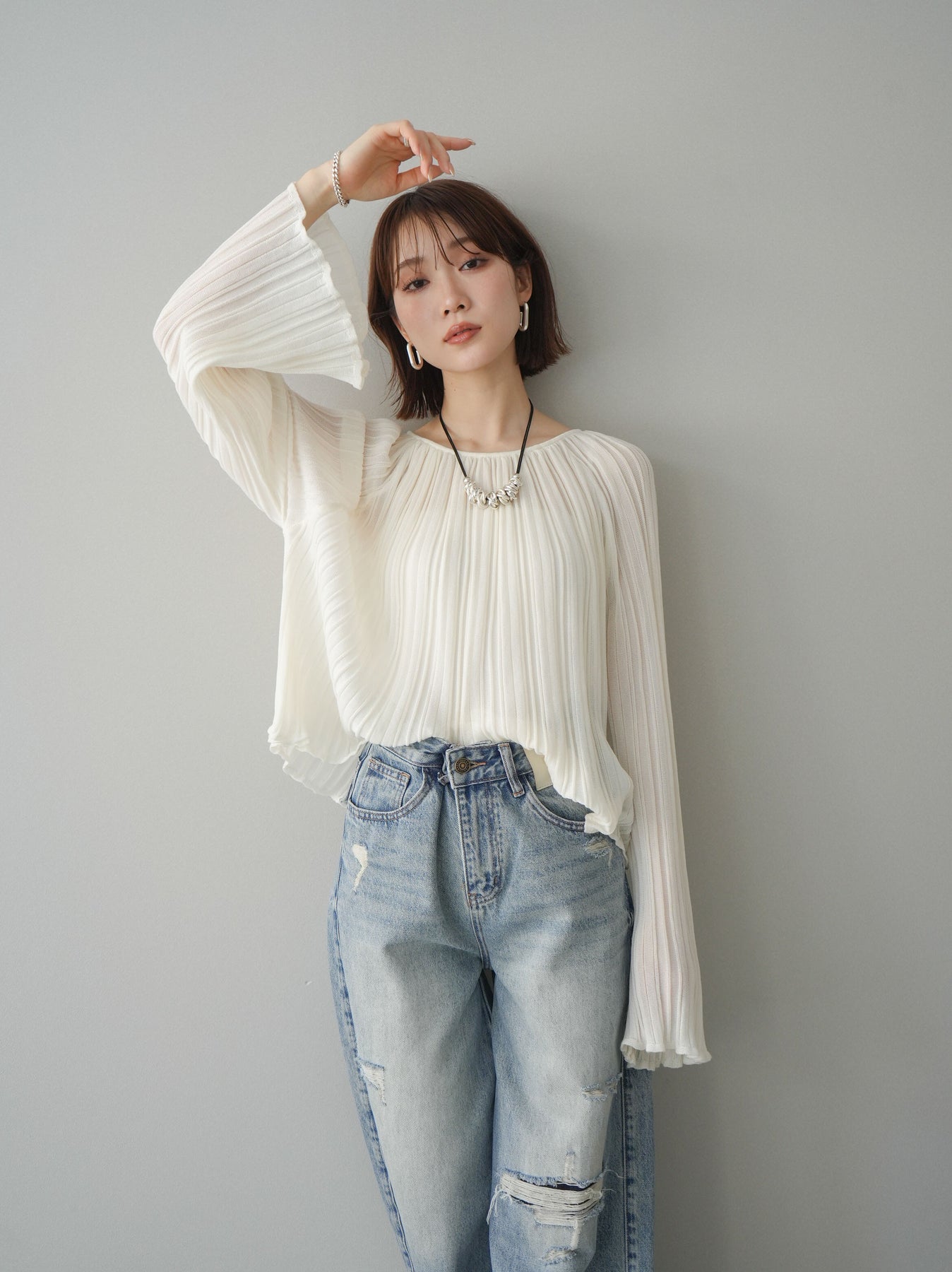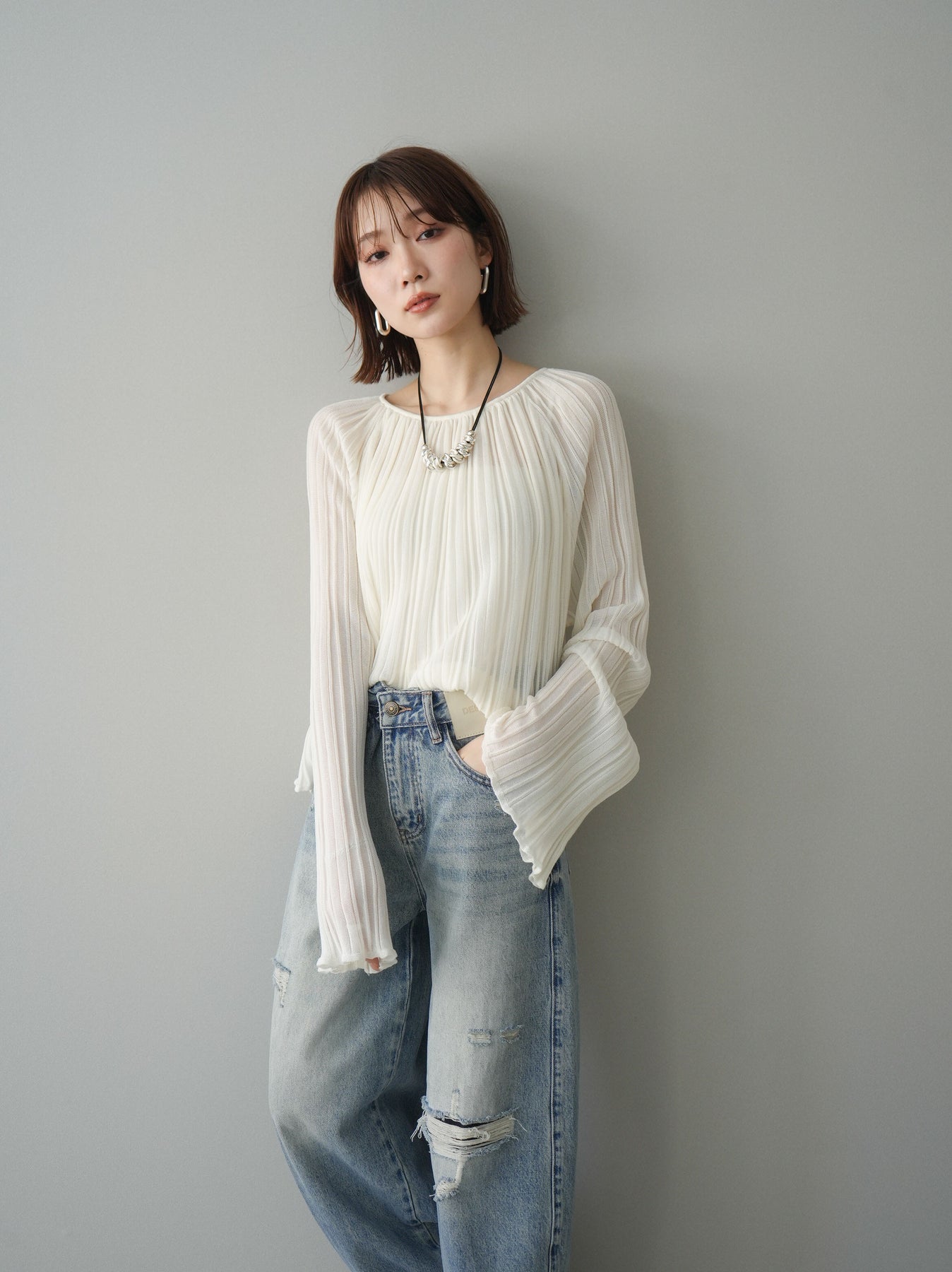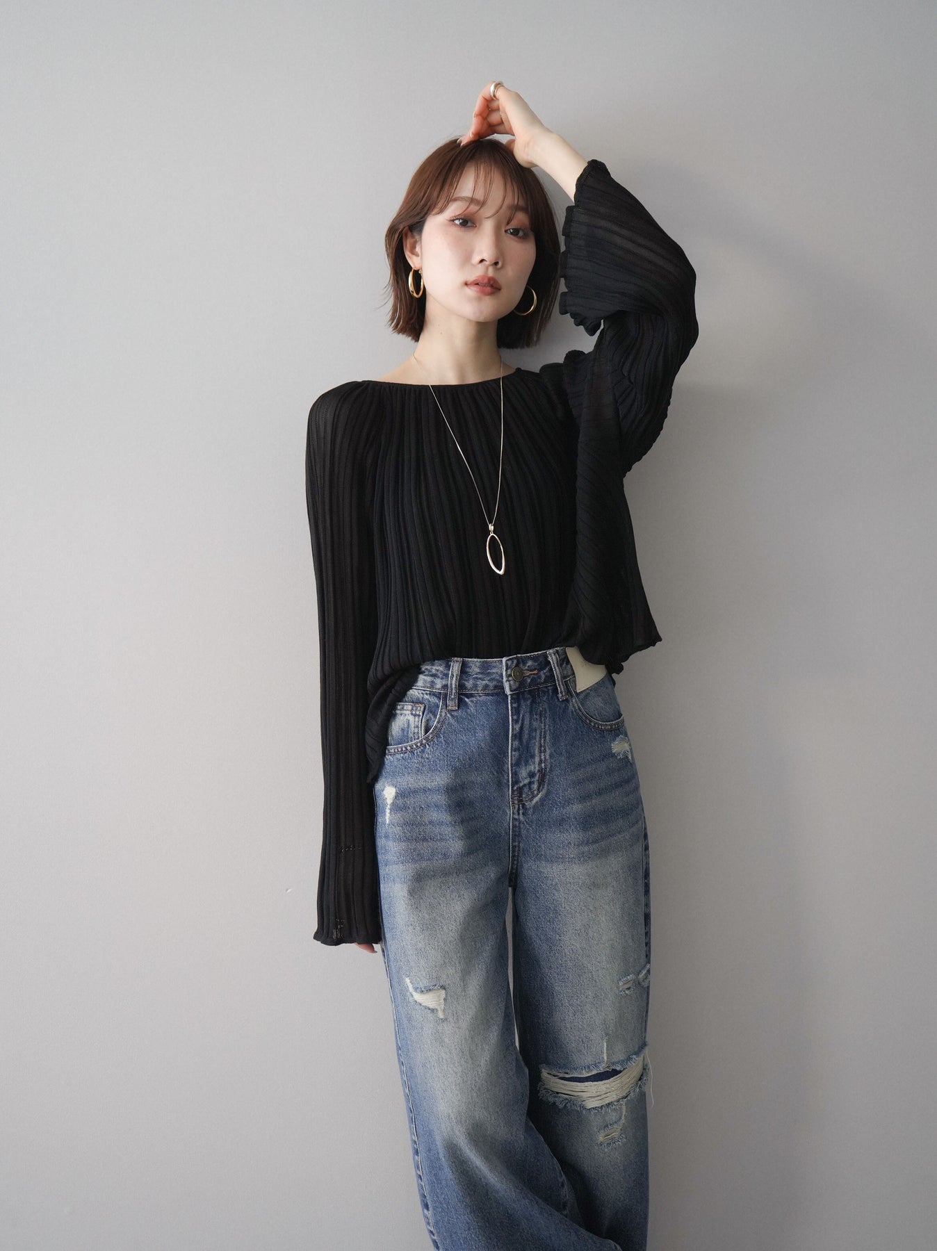 [SET]プリーツシアーフレアスリーブニットトップス+ダメージデニムセミワイドパンツ(2set)