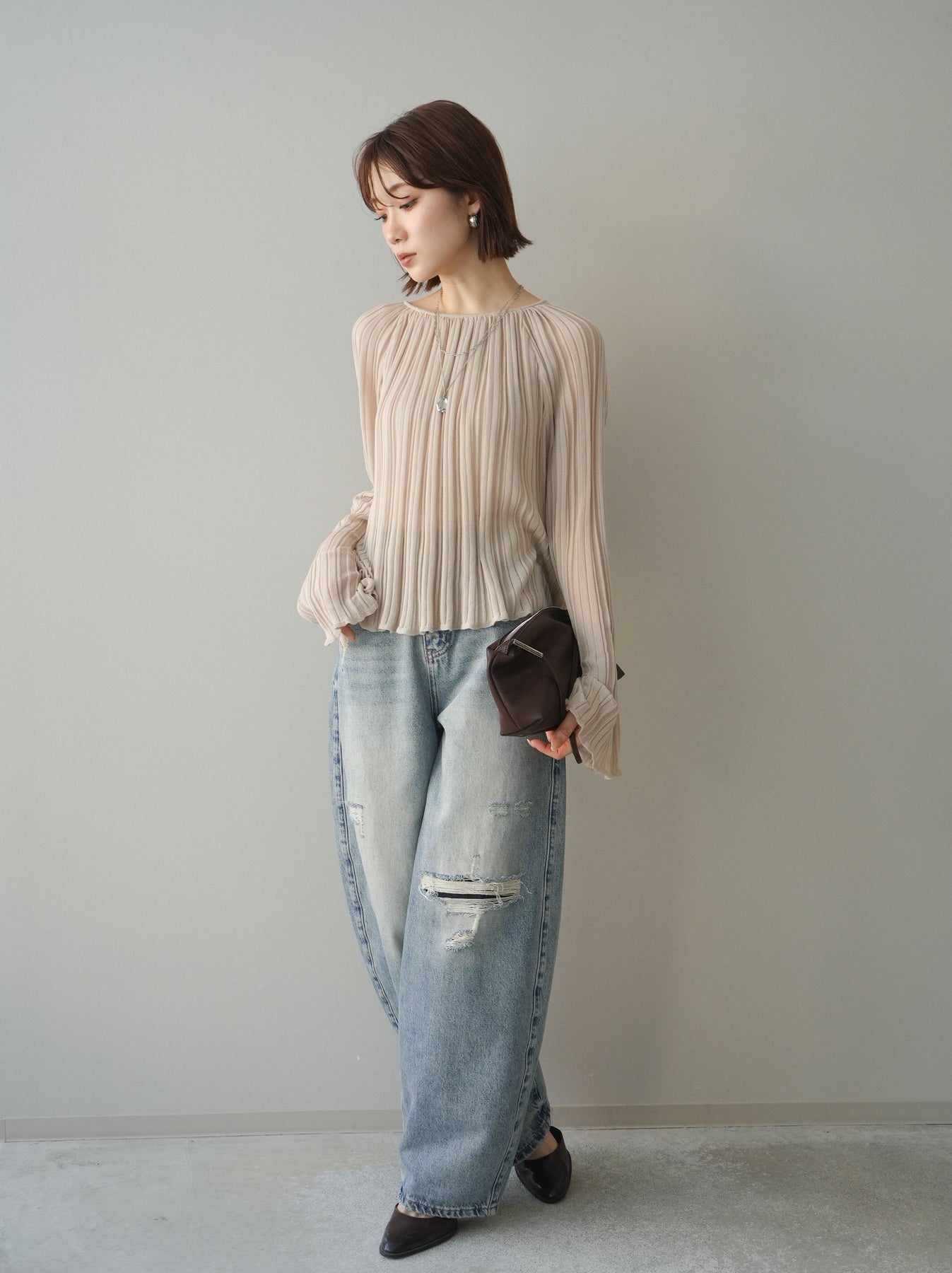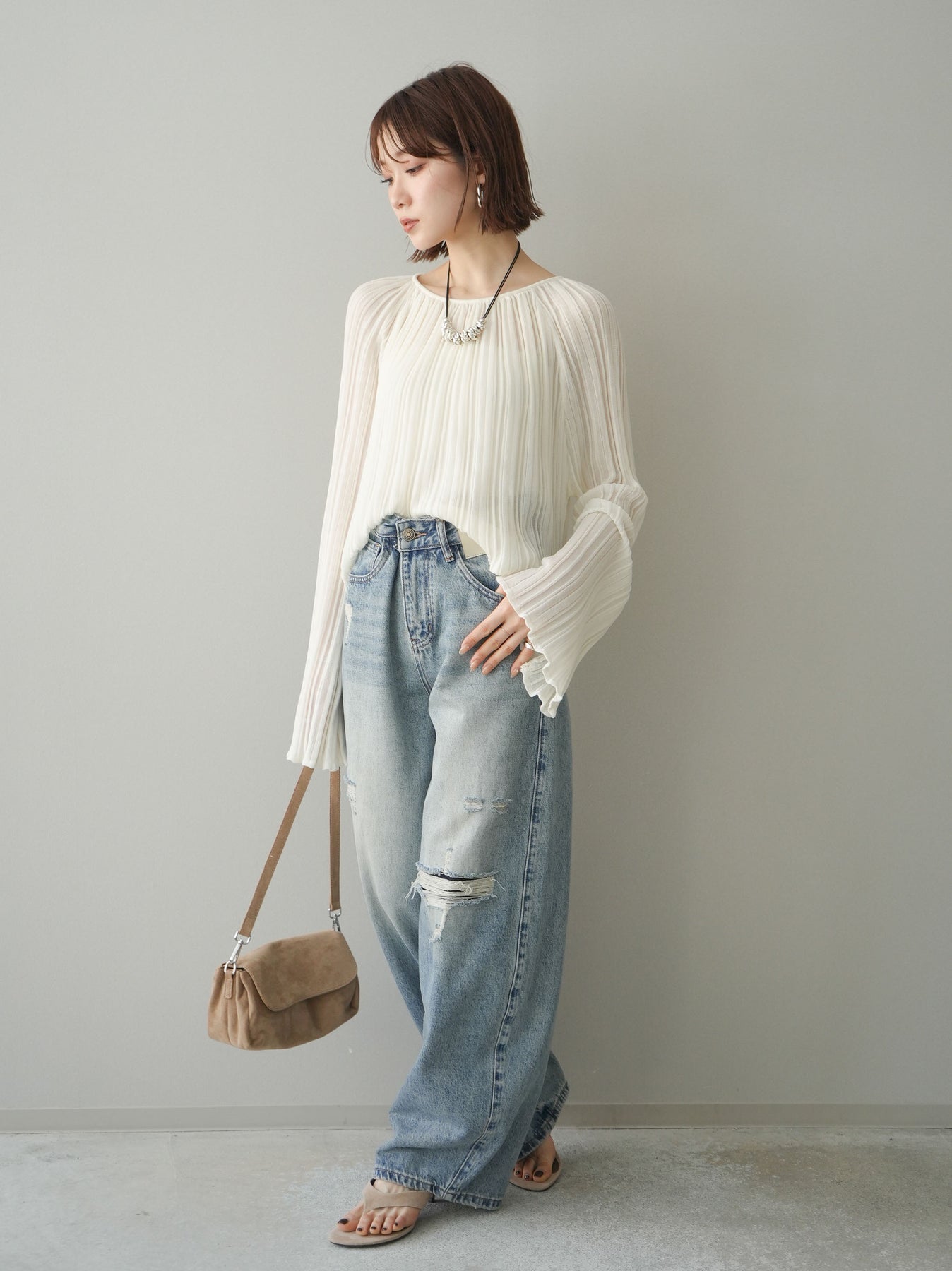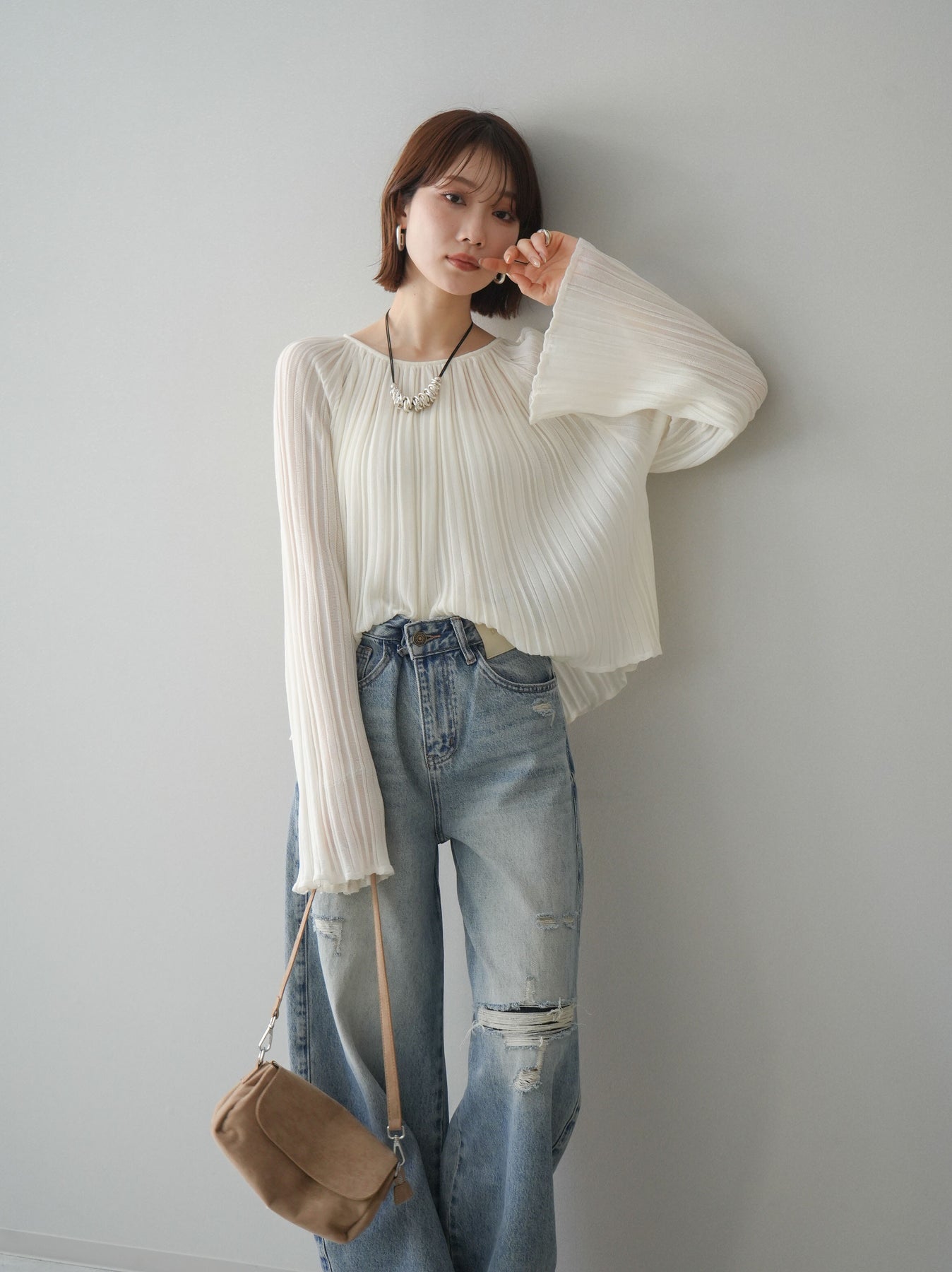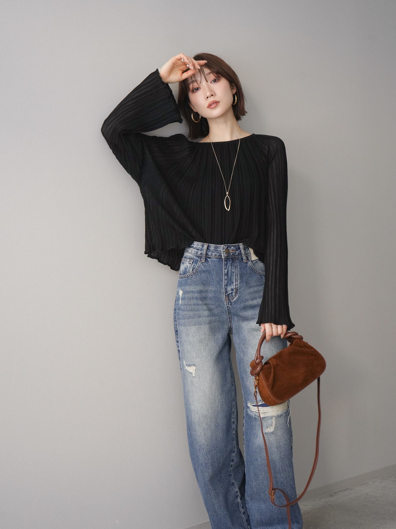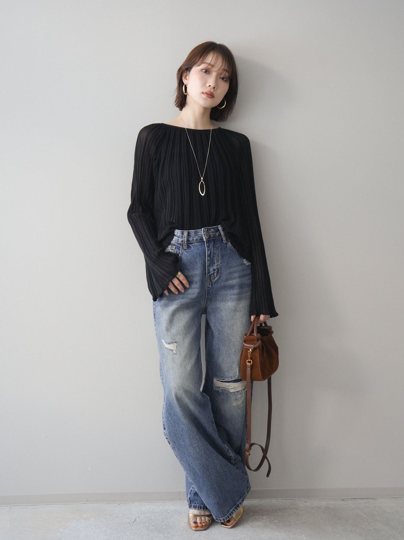 [SET]プリーツシアーフレアスリーブニットトップス+ダメージデニムセミワイドパンツ(2set)
