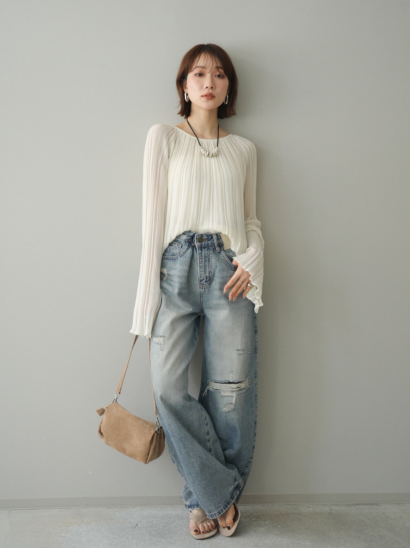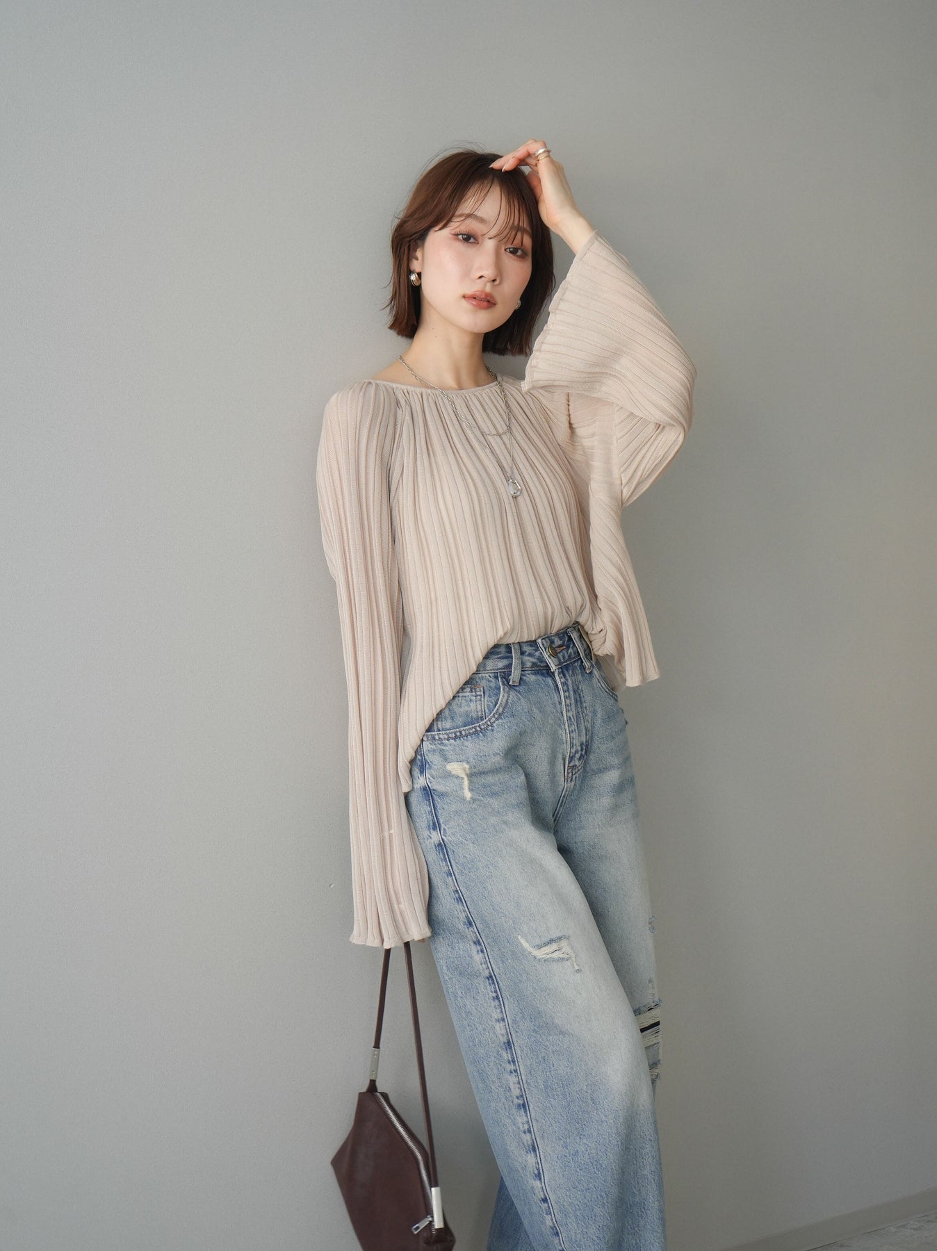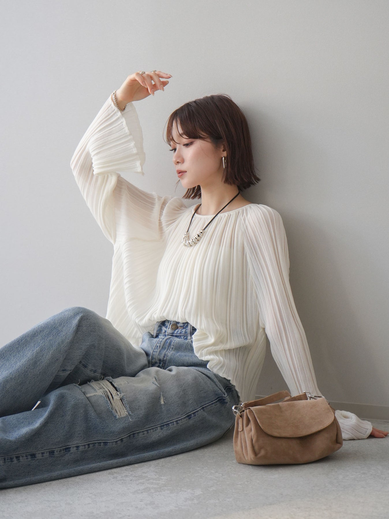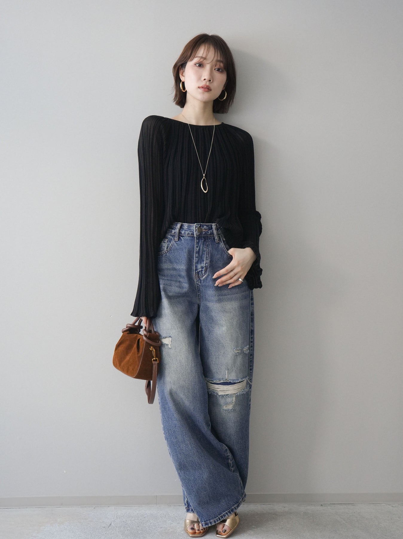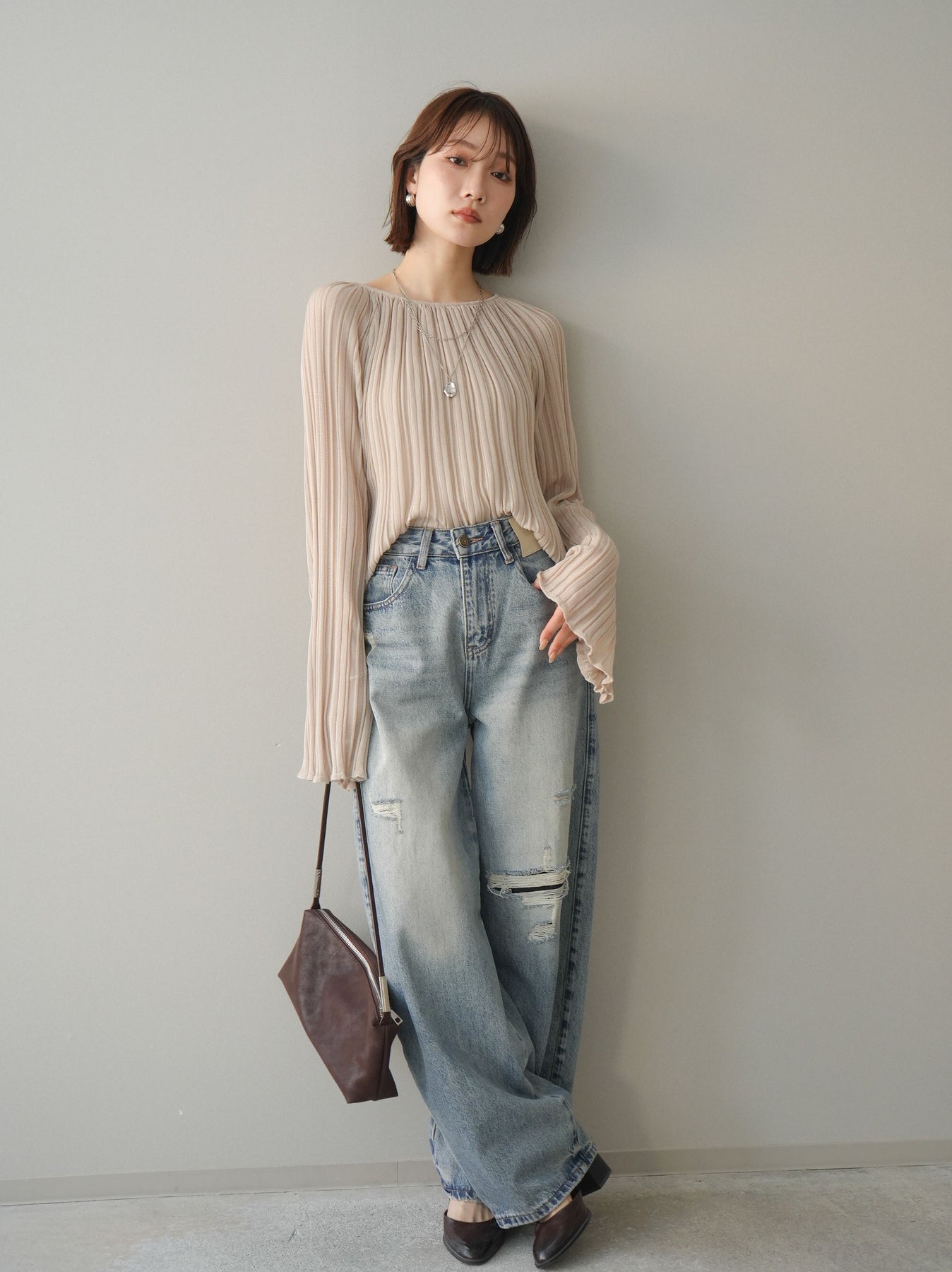 [SET]プリーツシアーフレアスリーブニットトップス+ダメージデニムセミワイドパンツ(2set)