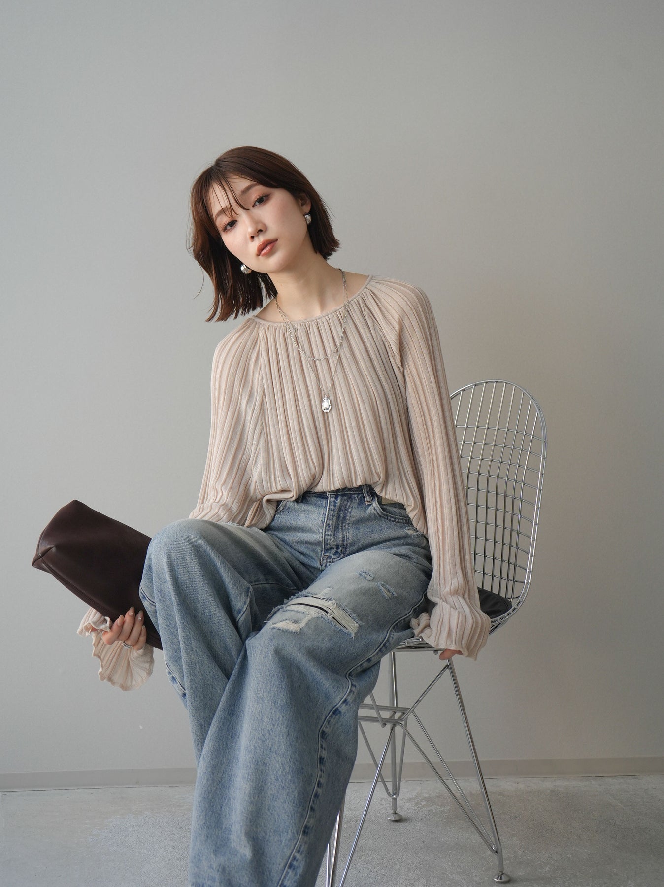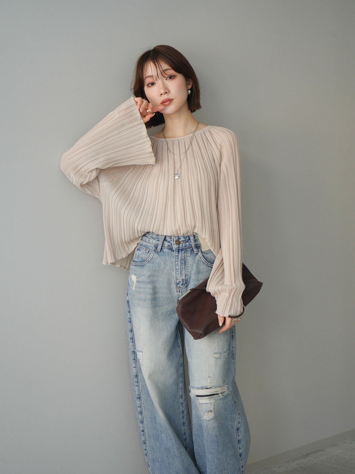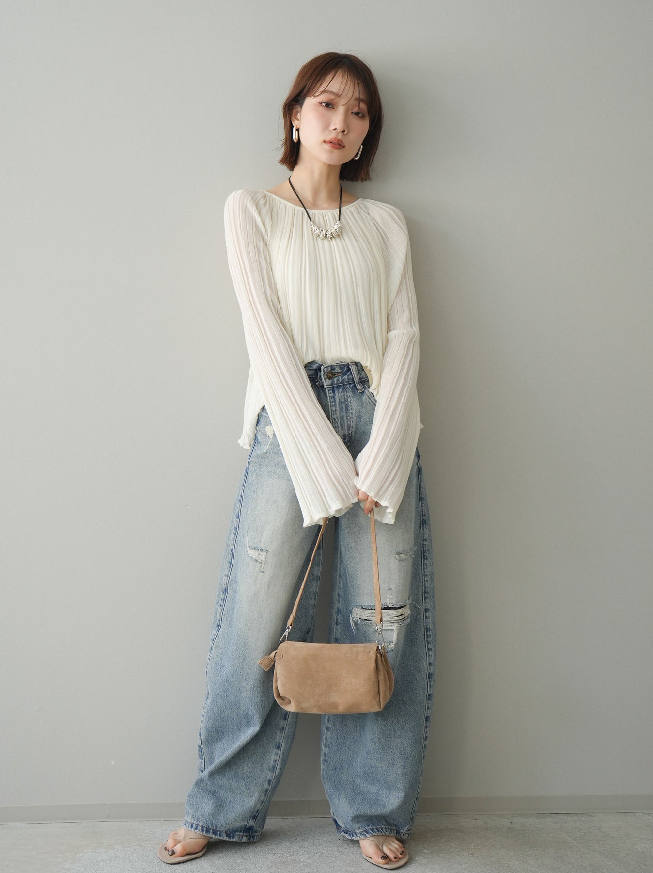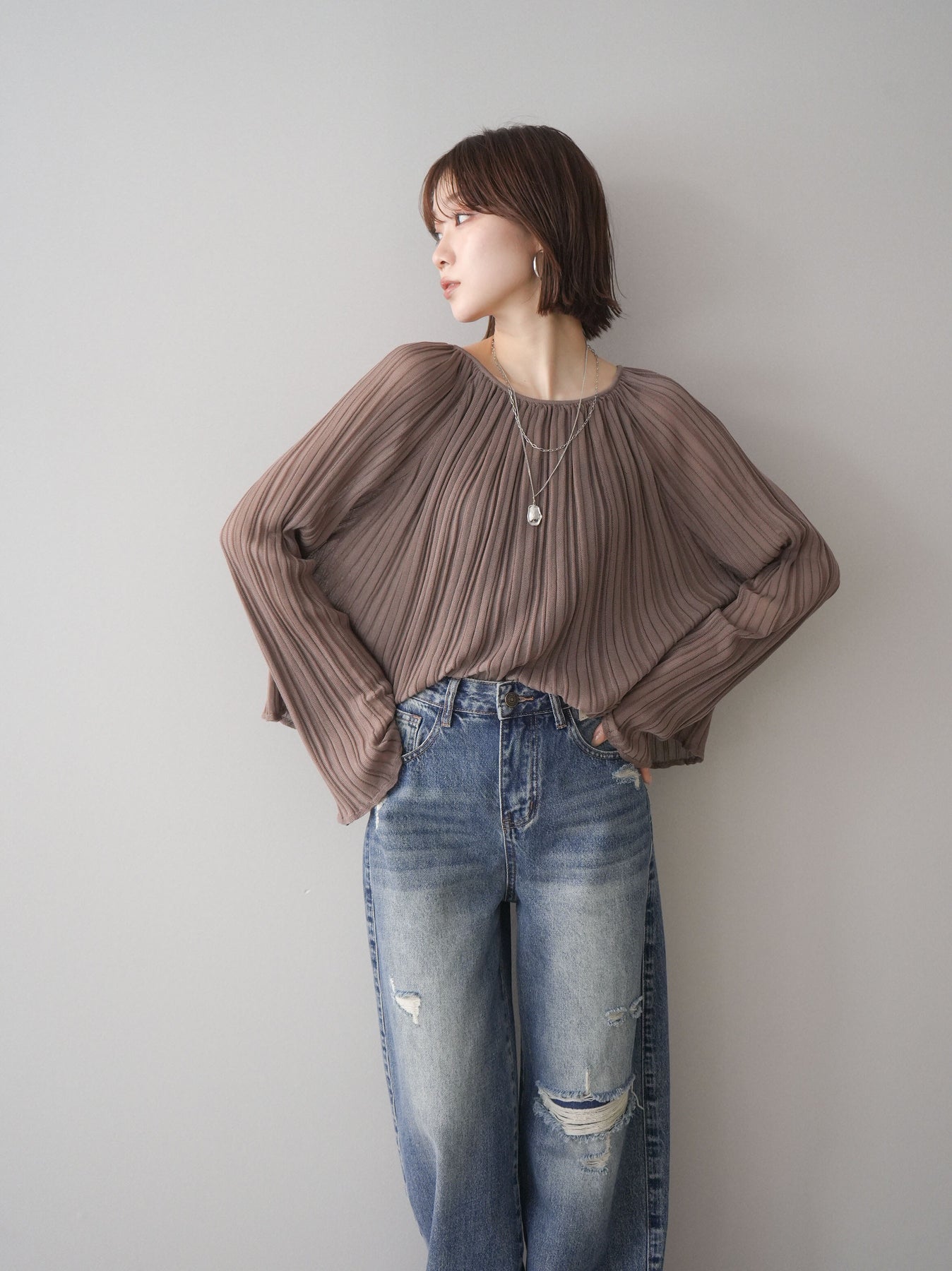 [SET]プリーツシアーフレアスリーブニットトップス+ダメージデニムセミワイドパンツ(2set)