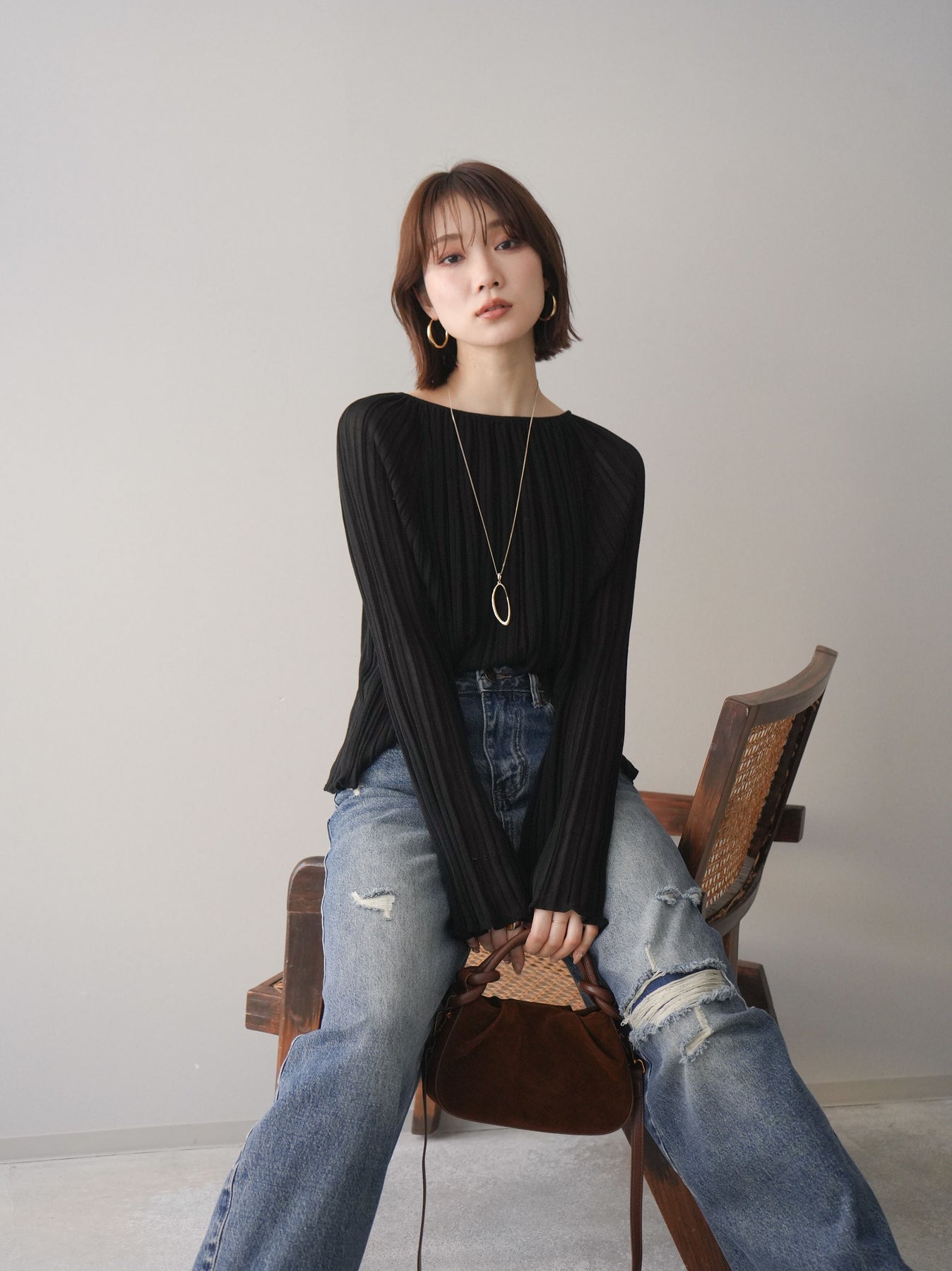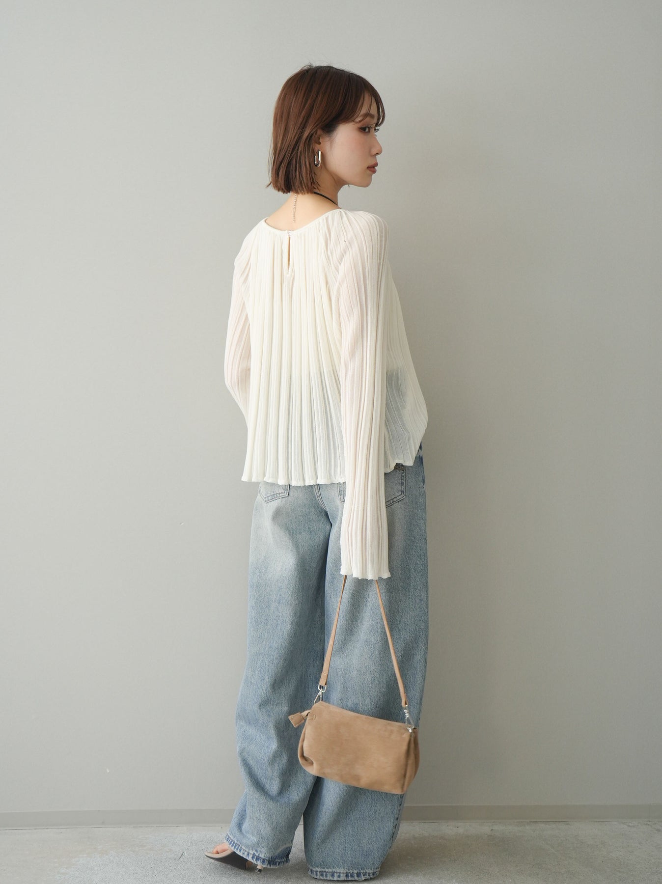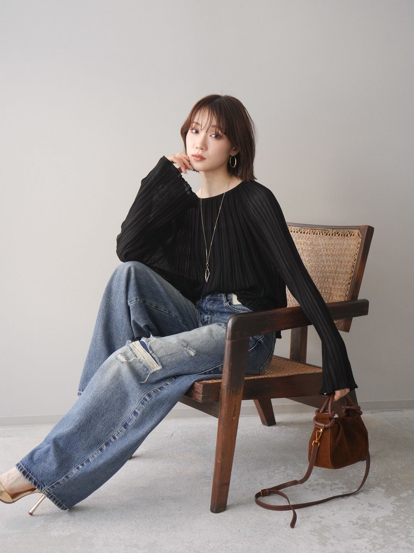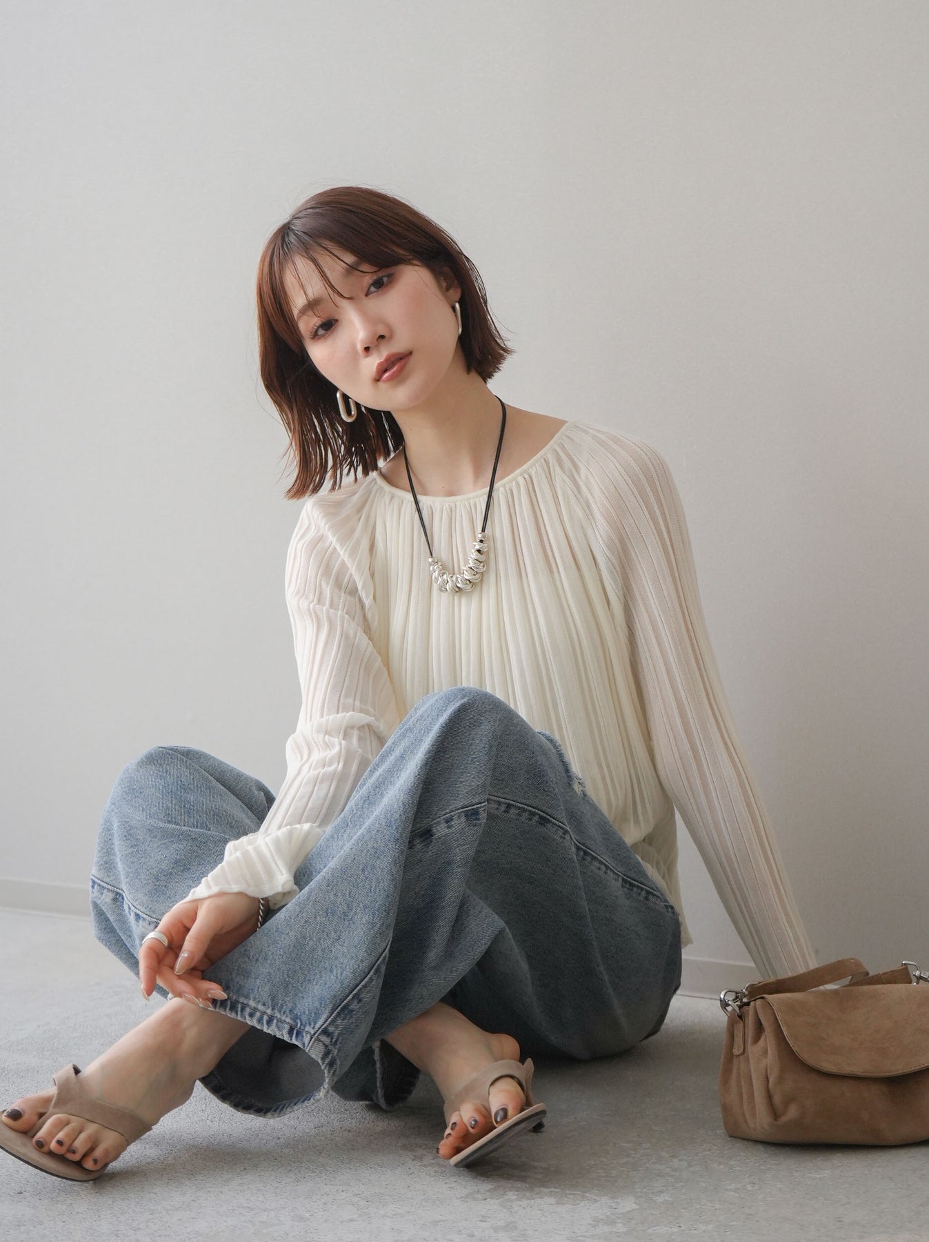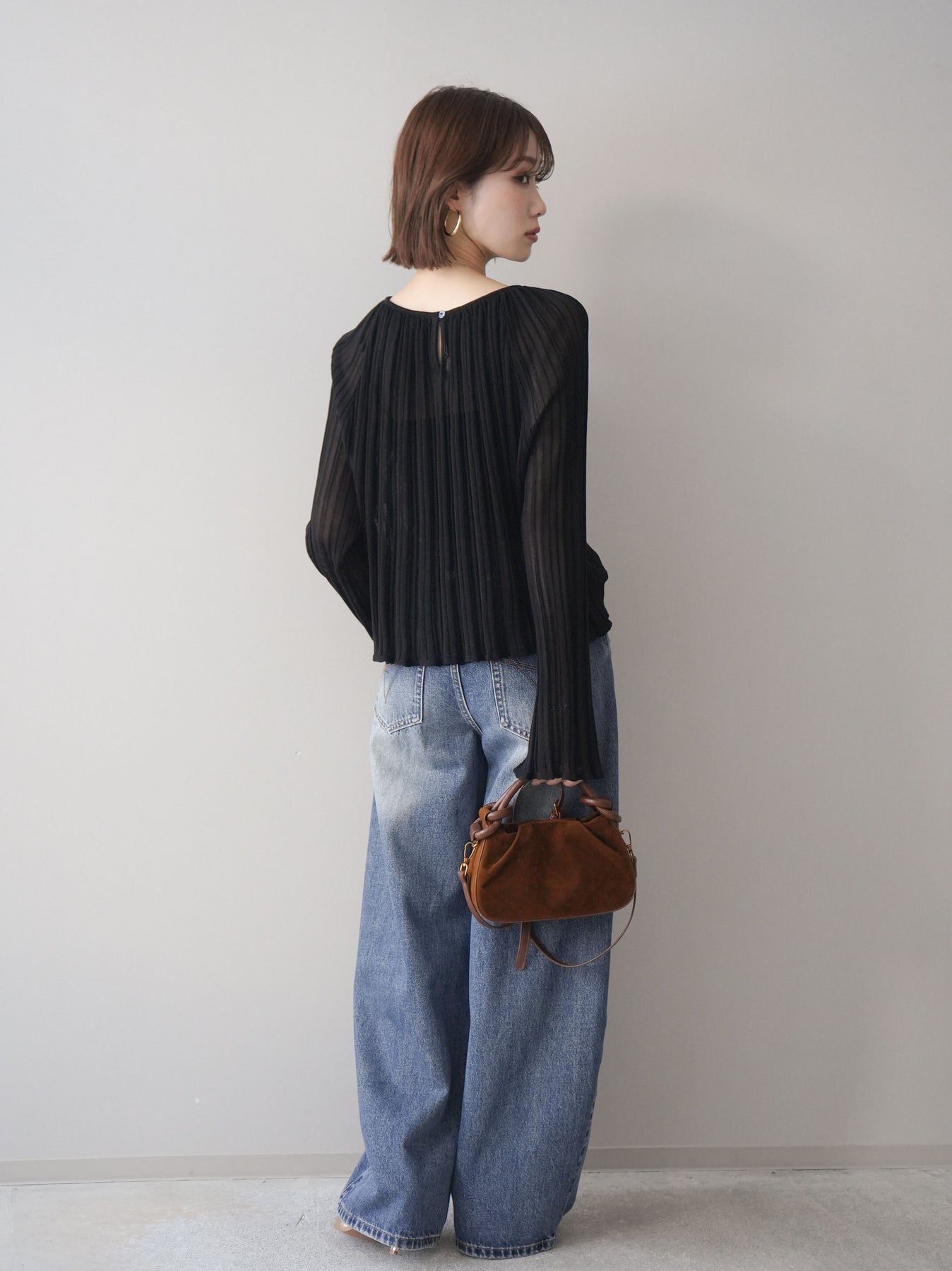 [SET]プリーツシアーフレアスリーブニットトップス+ダメージデニムセミワイドパンツ(2set)