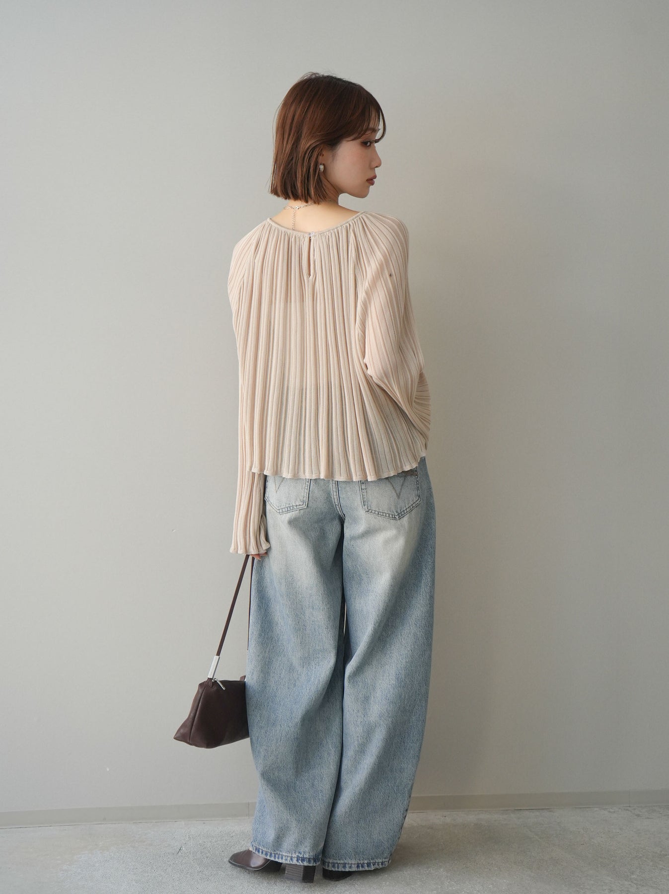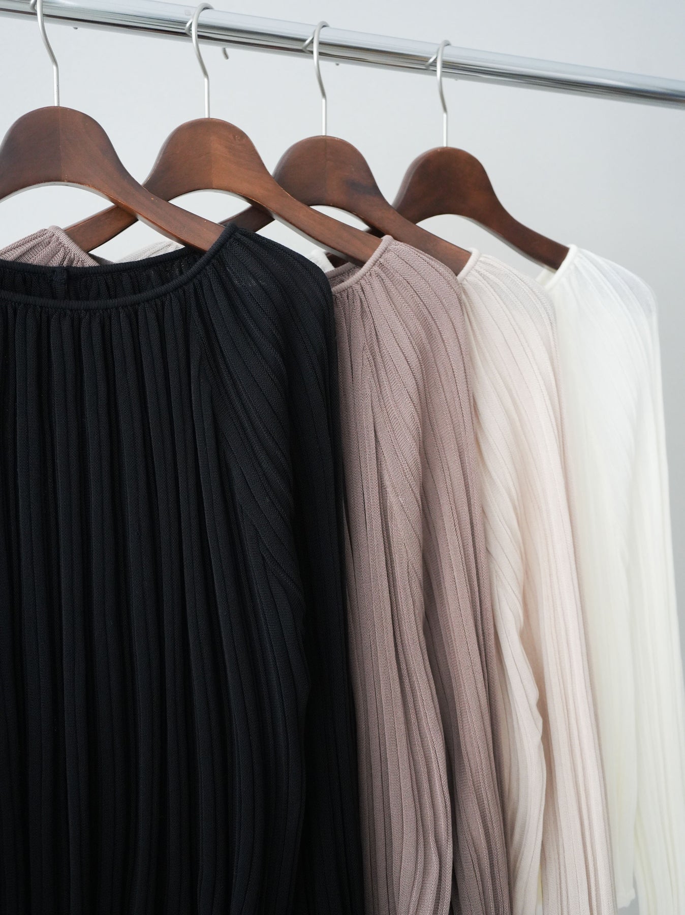繊細なプリーツ加工が表情を生み出すニットトップス。縦に流れるラインがすっきりとした印象を与え、程よくフィットしながらも軽やかな着心地を叶えます。シンプルなデザインでありながら、動くたびに揺れるプリーツが女性らしさを引き立て、デニムからきれいめボトムまで幅広いスタイリングにマッチ。1枚でもレイヤードでも活躍する万能アイテムです。