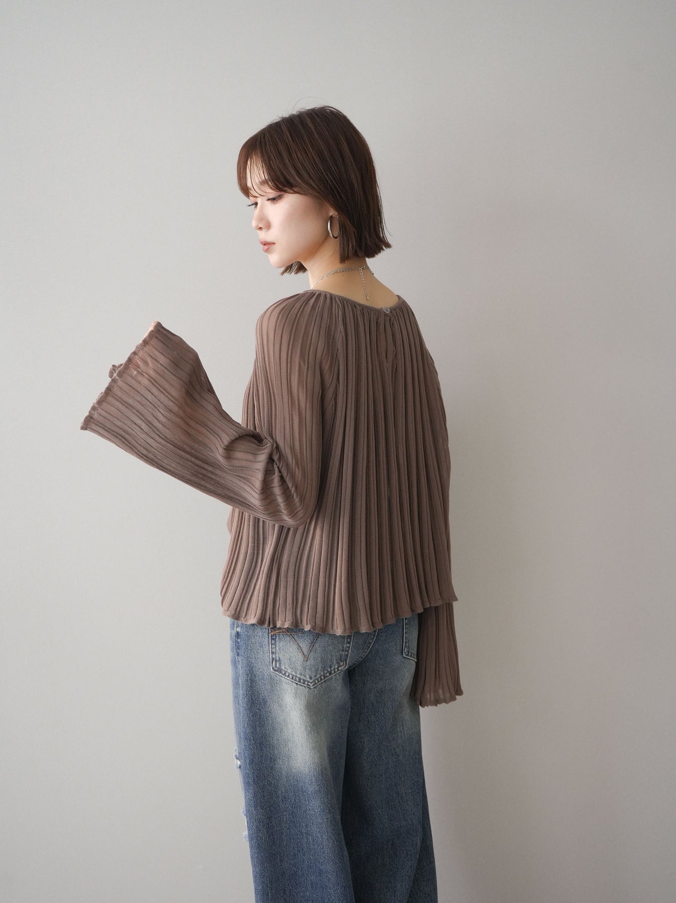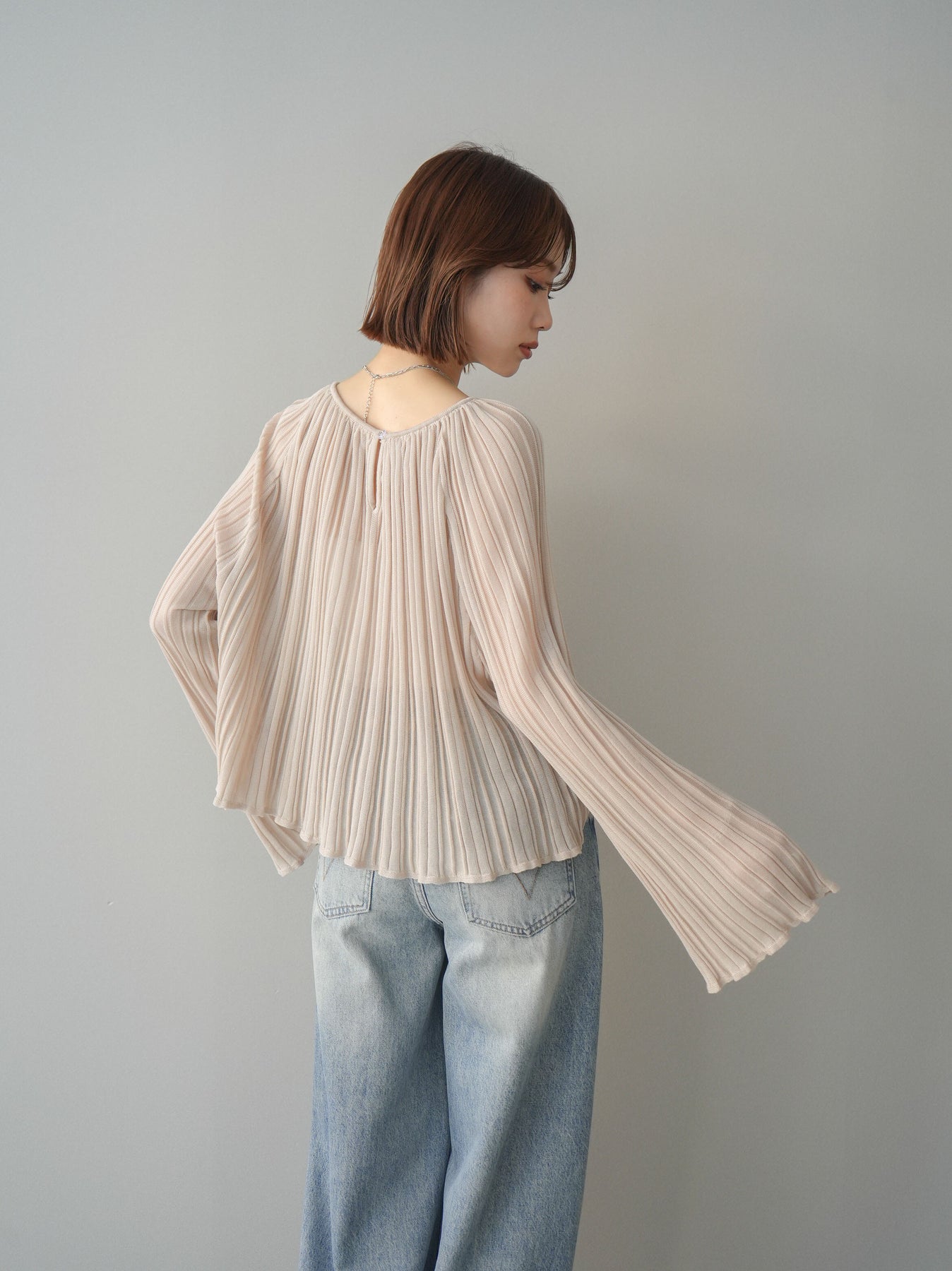 [予約]プリーツシアーフレアスリーブニットトップス
