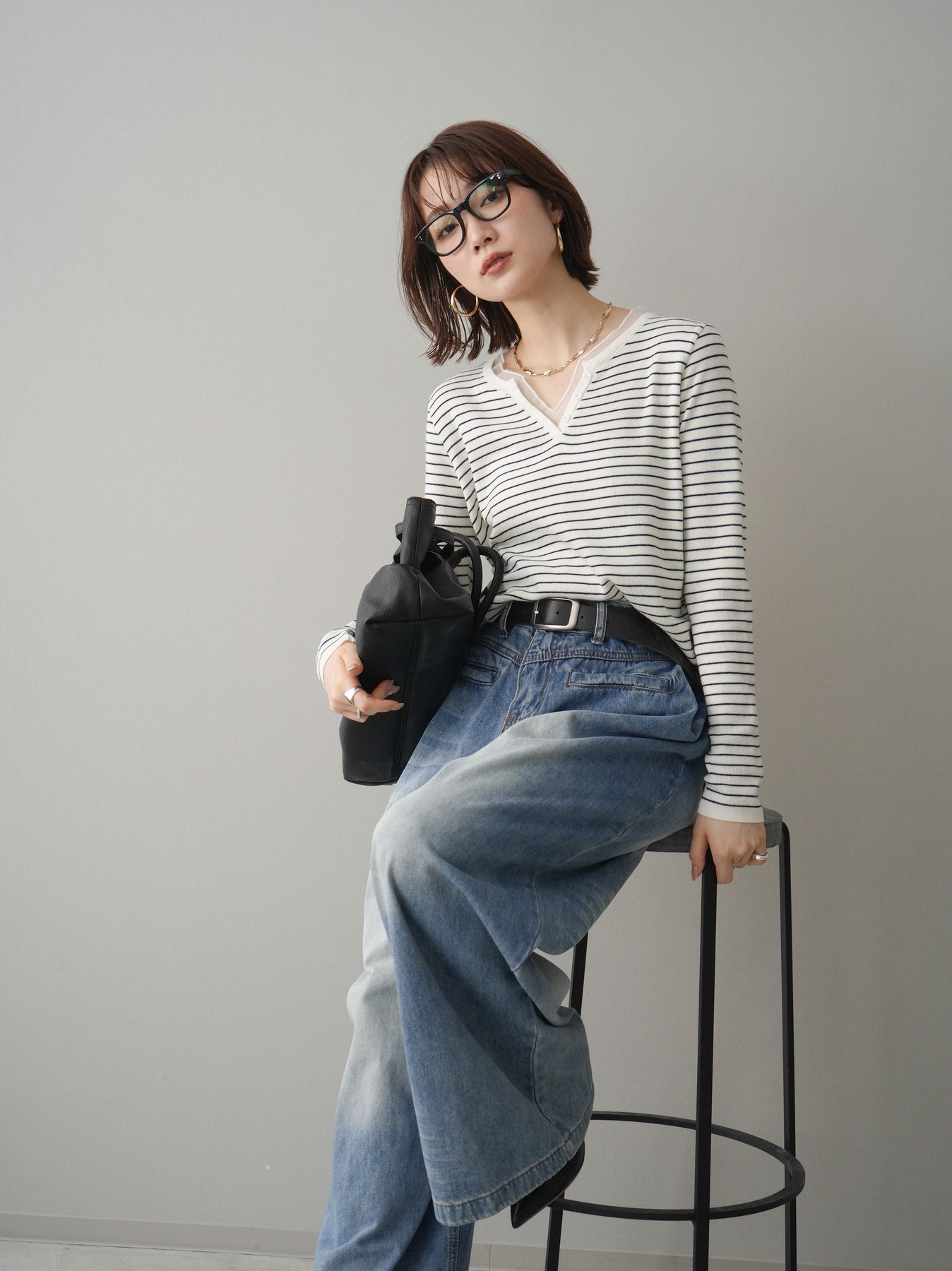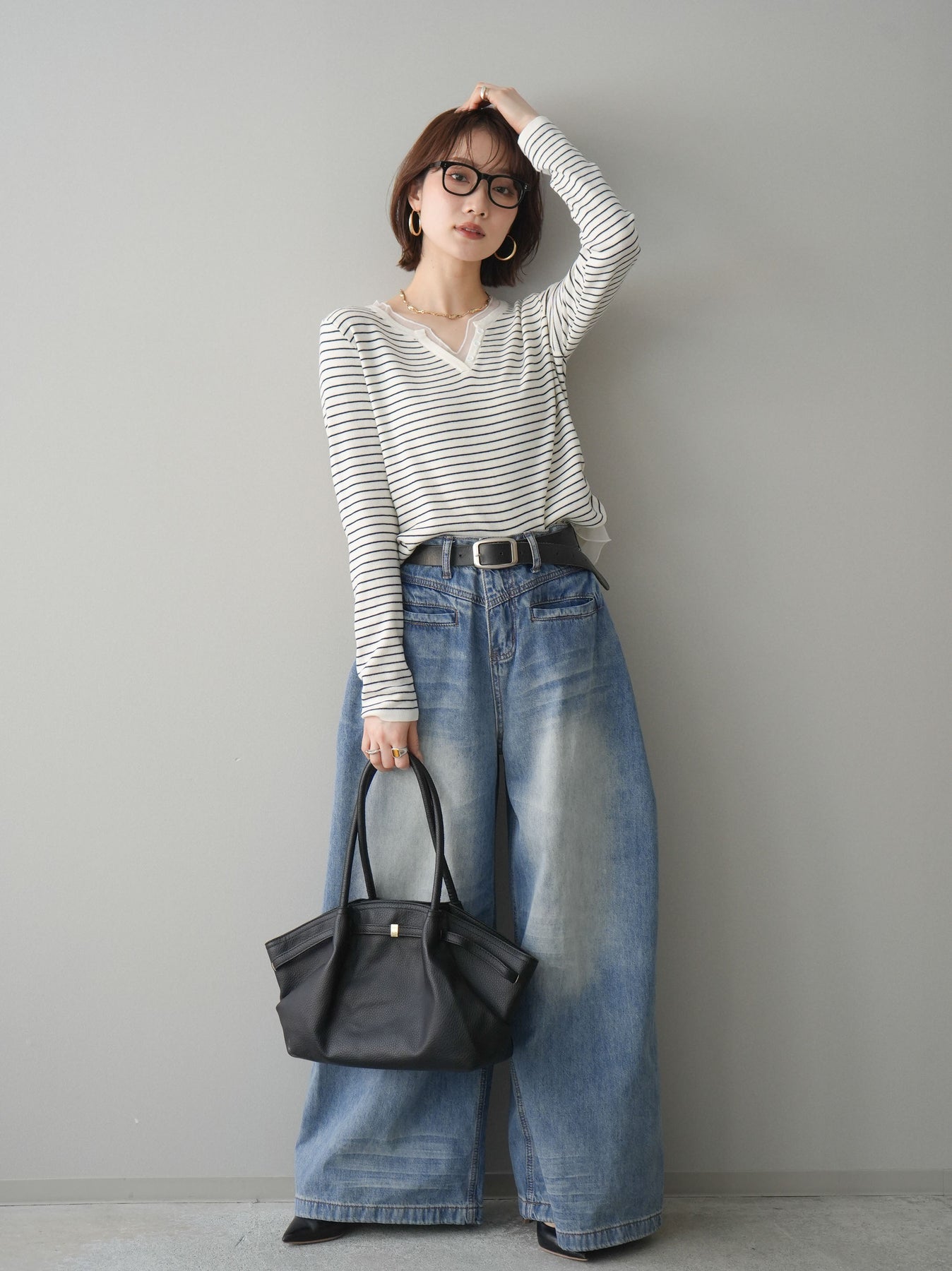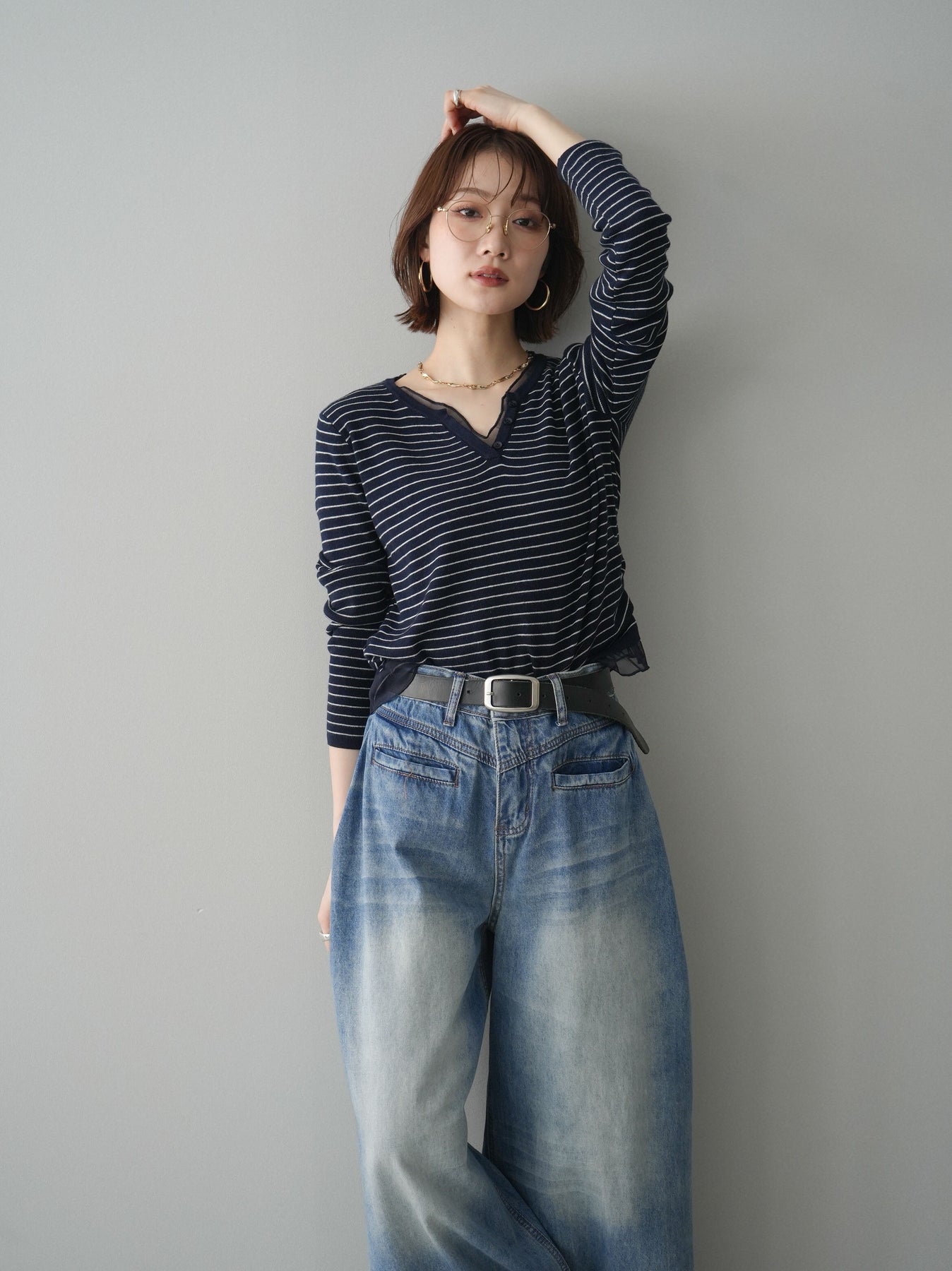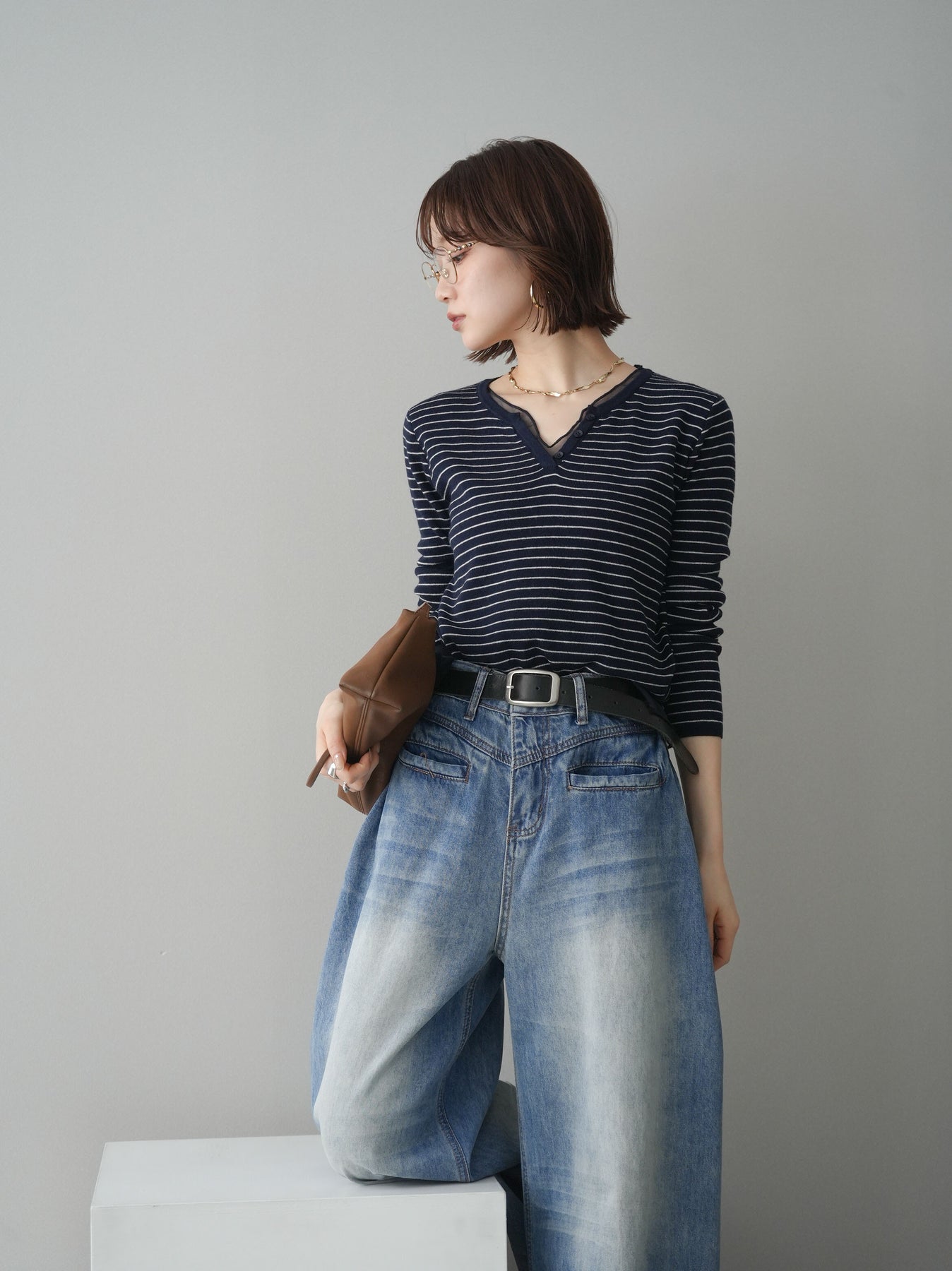 [SET]チュールレイヤードデザインボーダーニットトップス+フロントポケットサイドタックワイドデニム(2set)