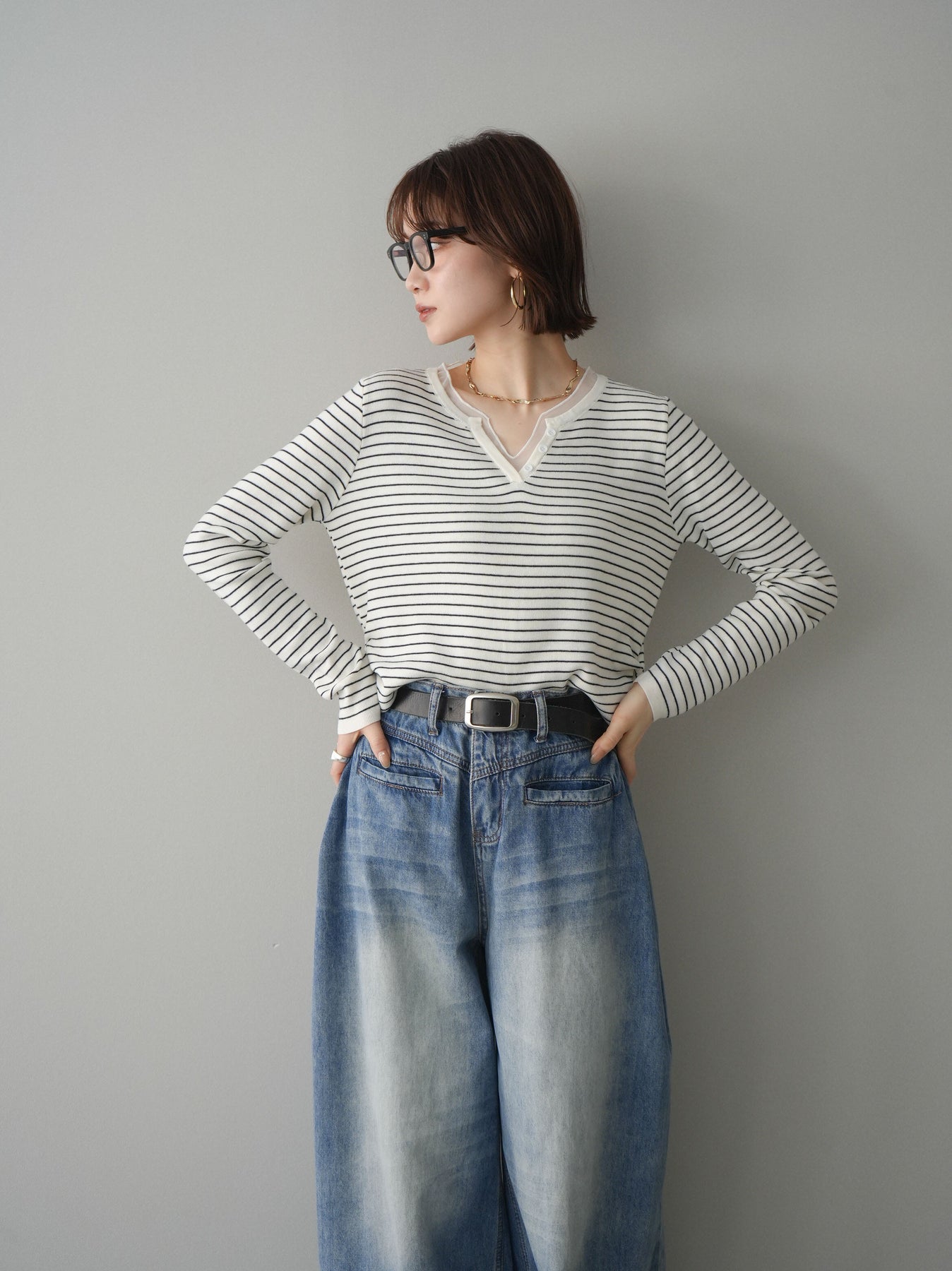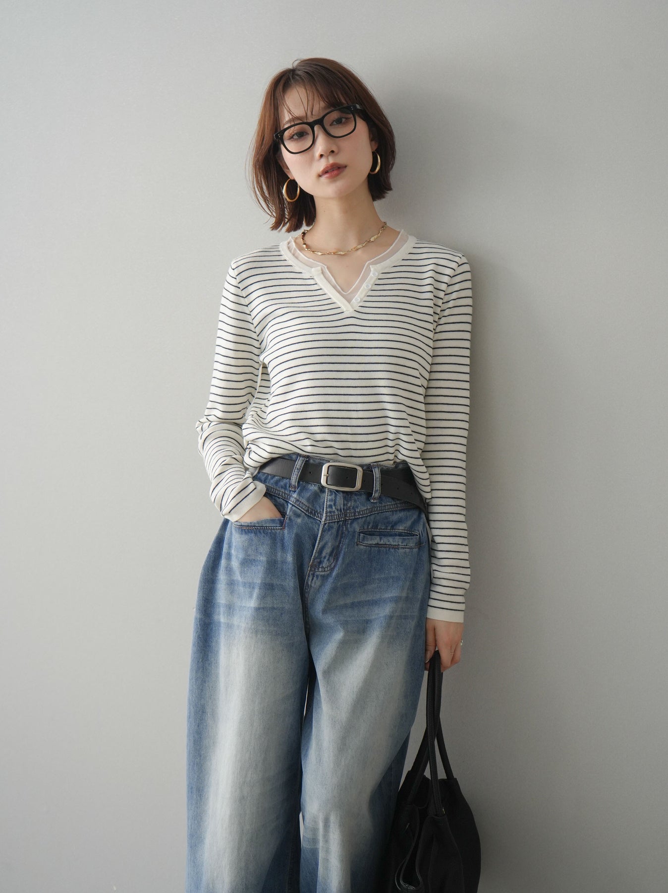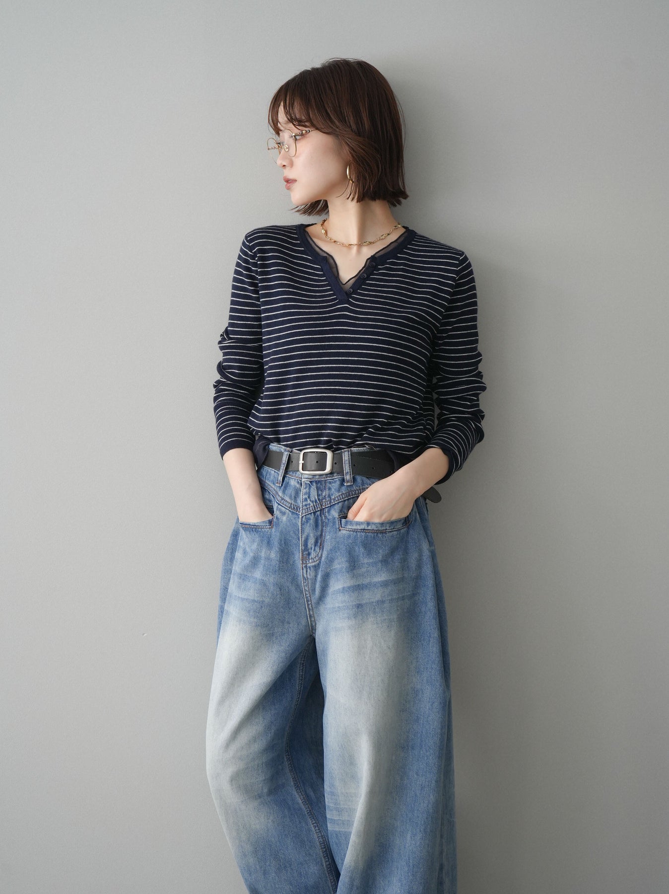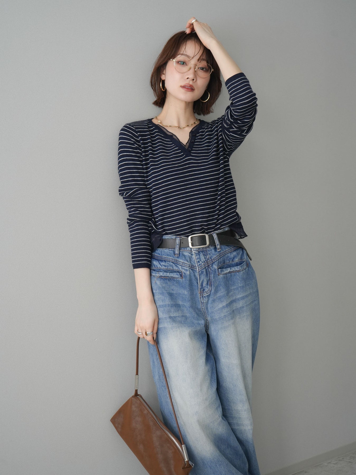 [SET]チュールレイヤードデザインボーダーニットトップス+フロントポケットサイドタックワイドデニム(2set)