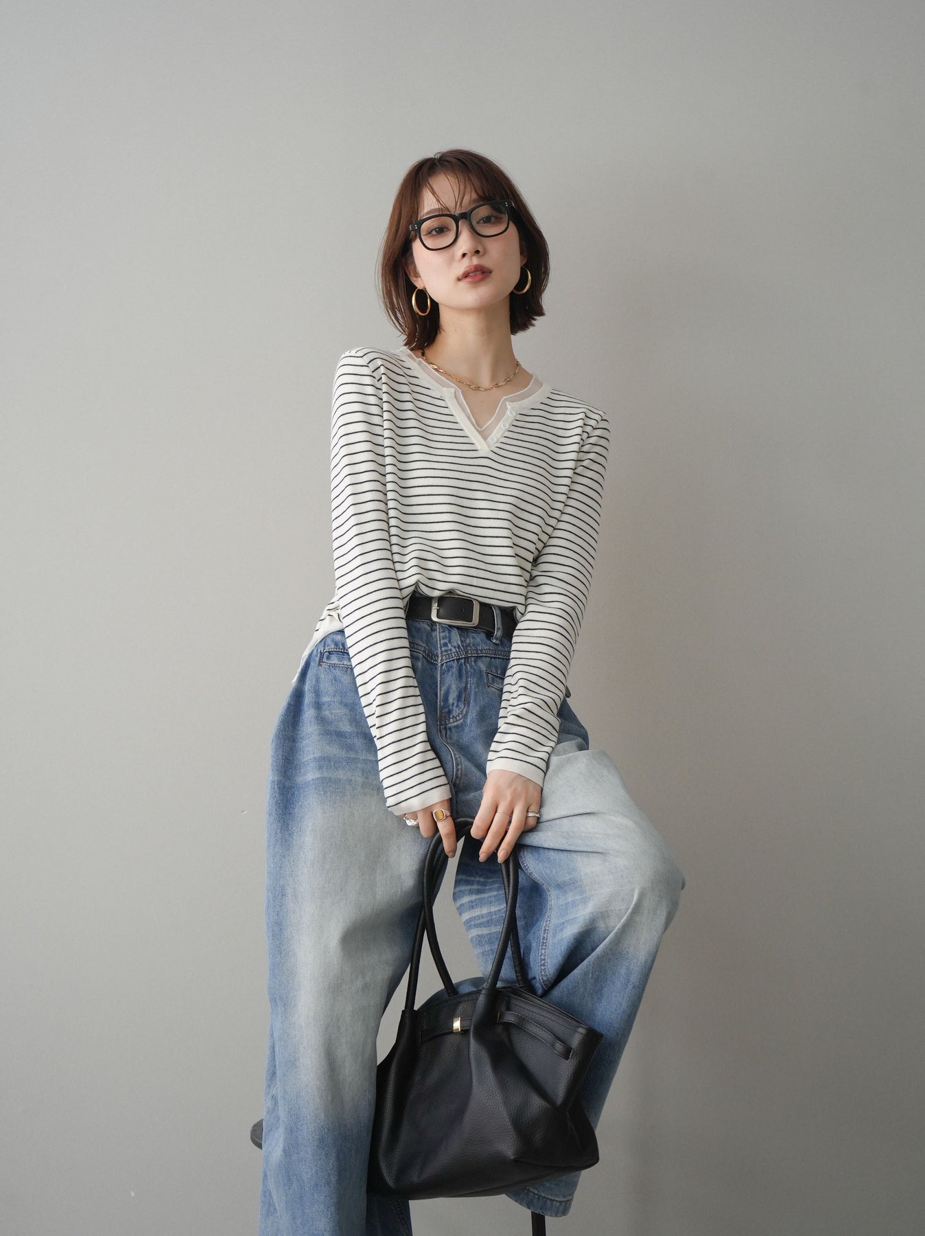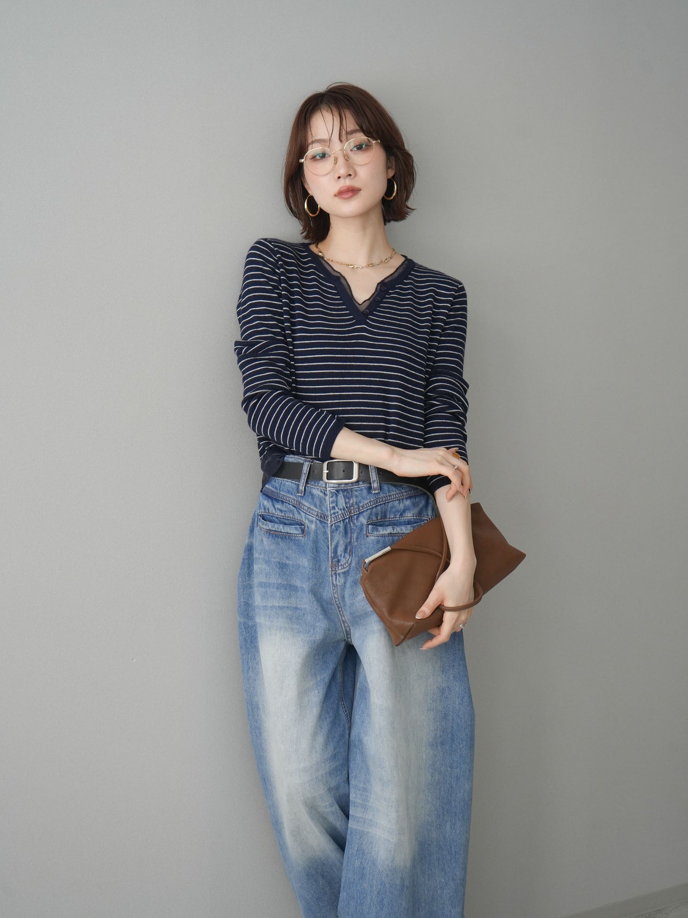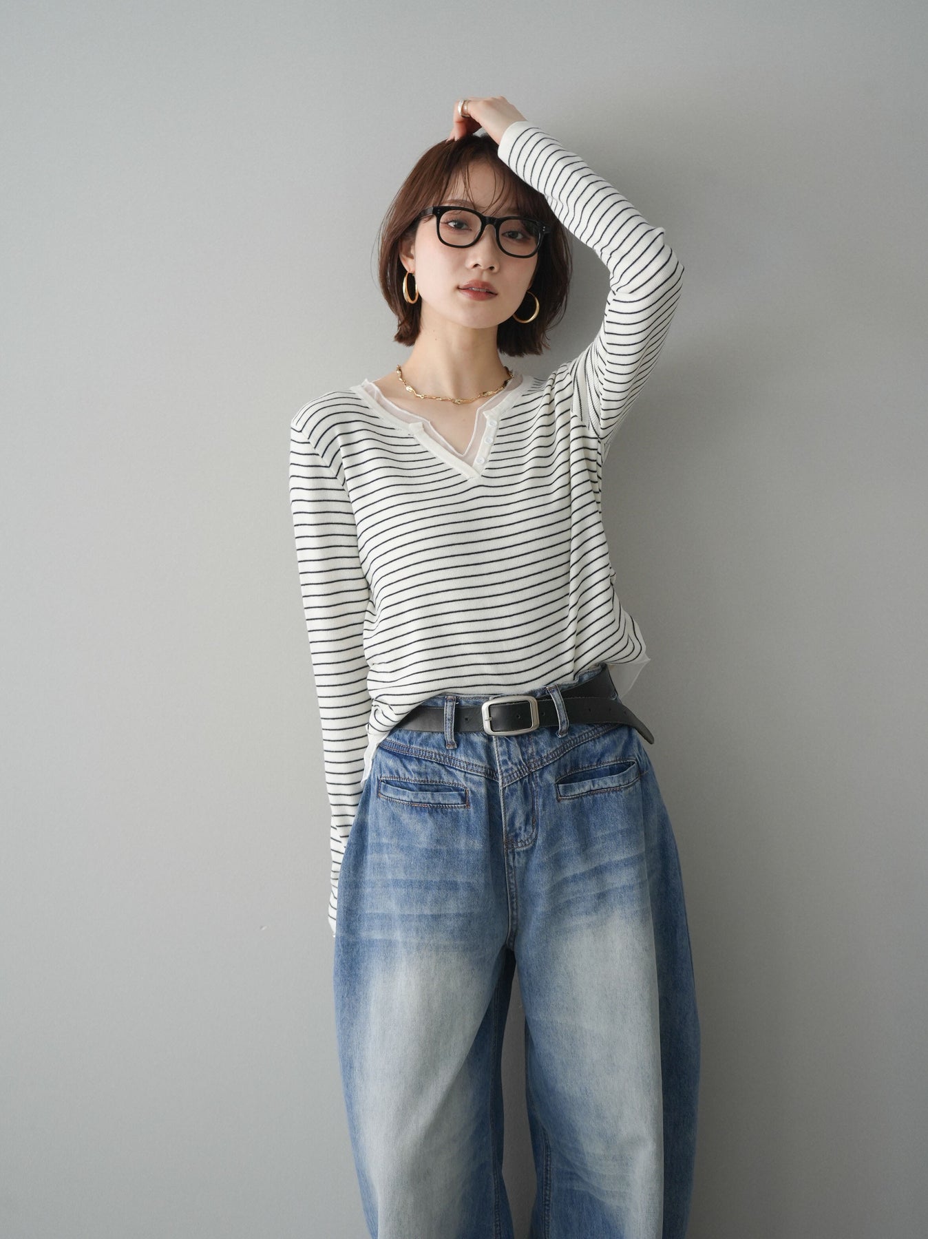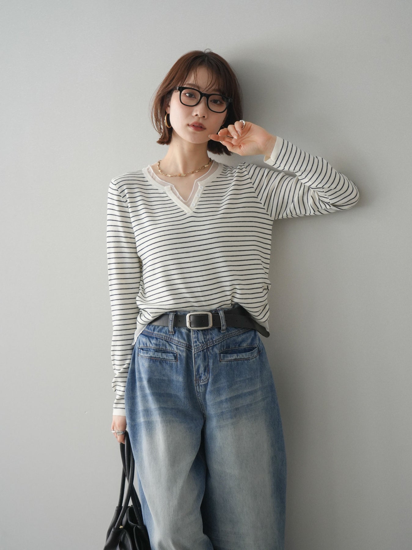 [SET]チュールレイヤードデザインボーダーニットトップス+フロントポケットサイドタックワイドデニム(2set)