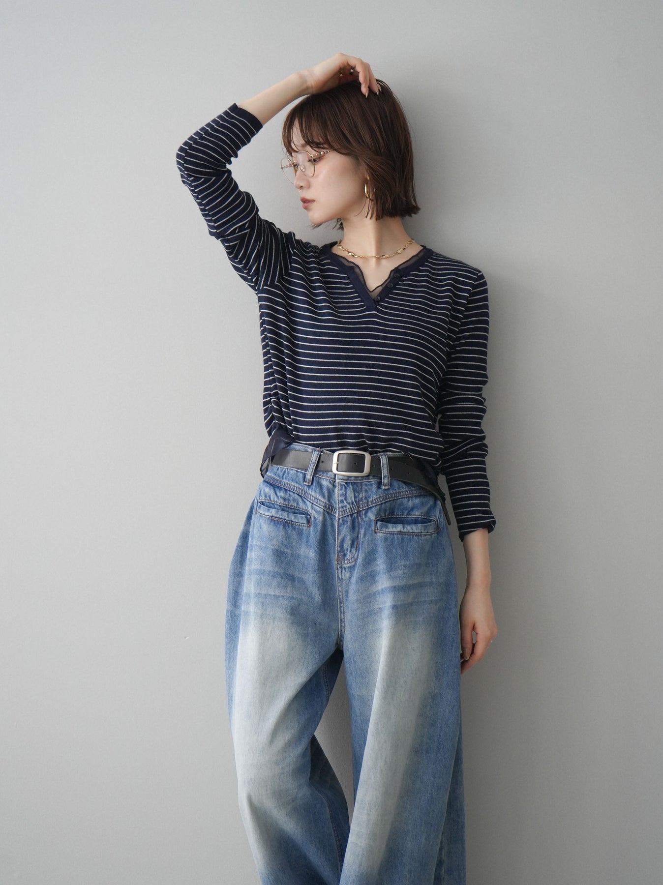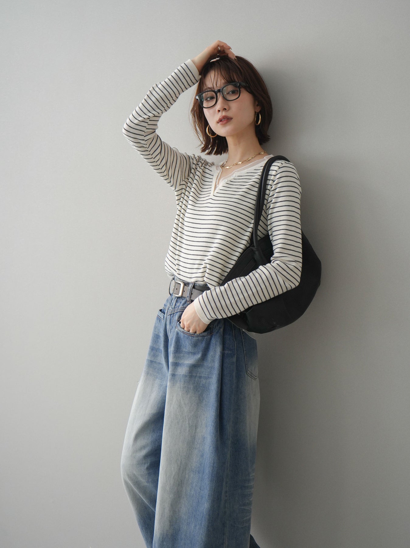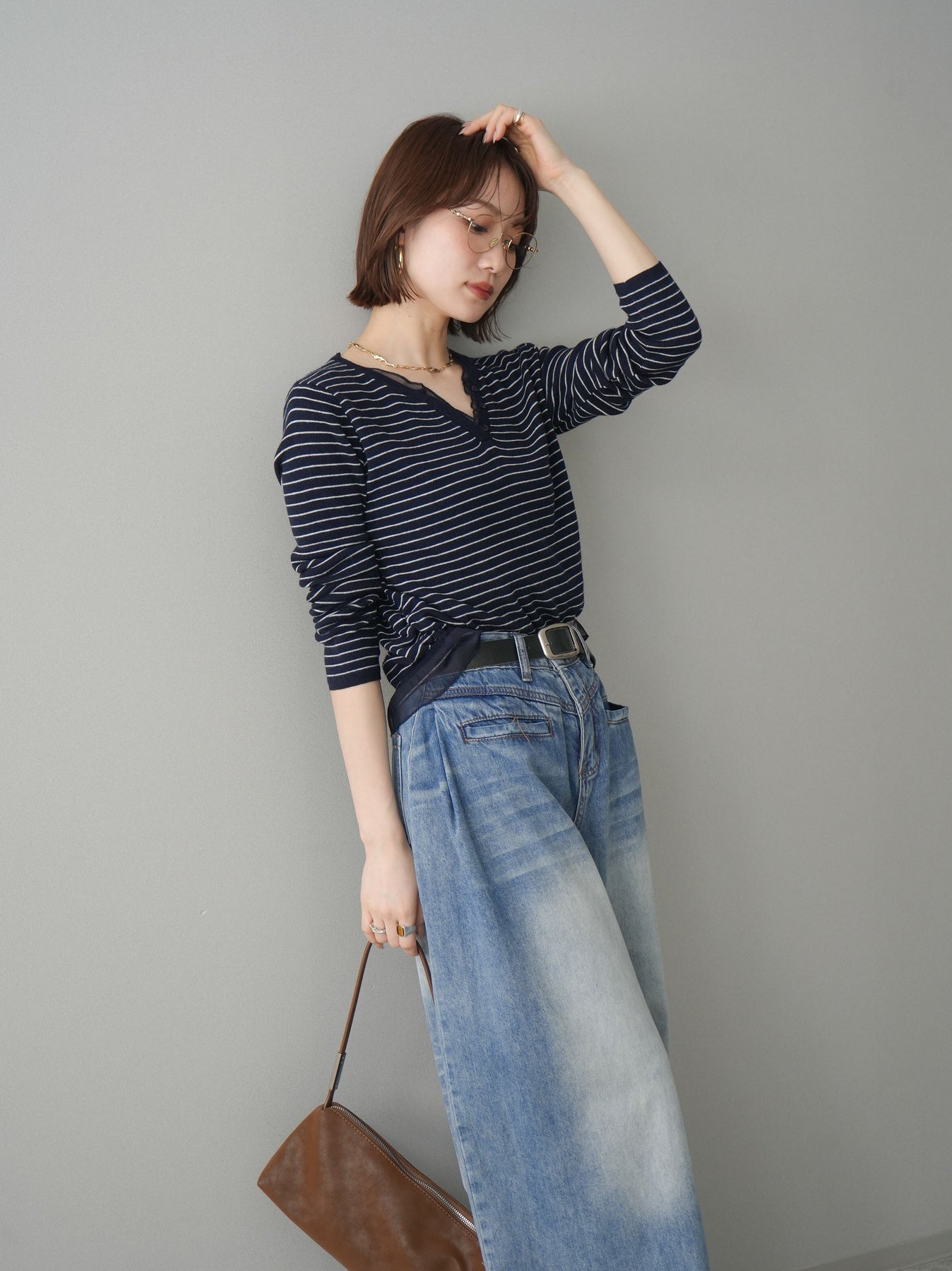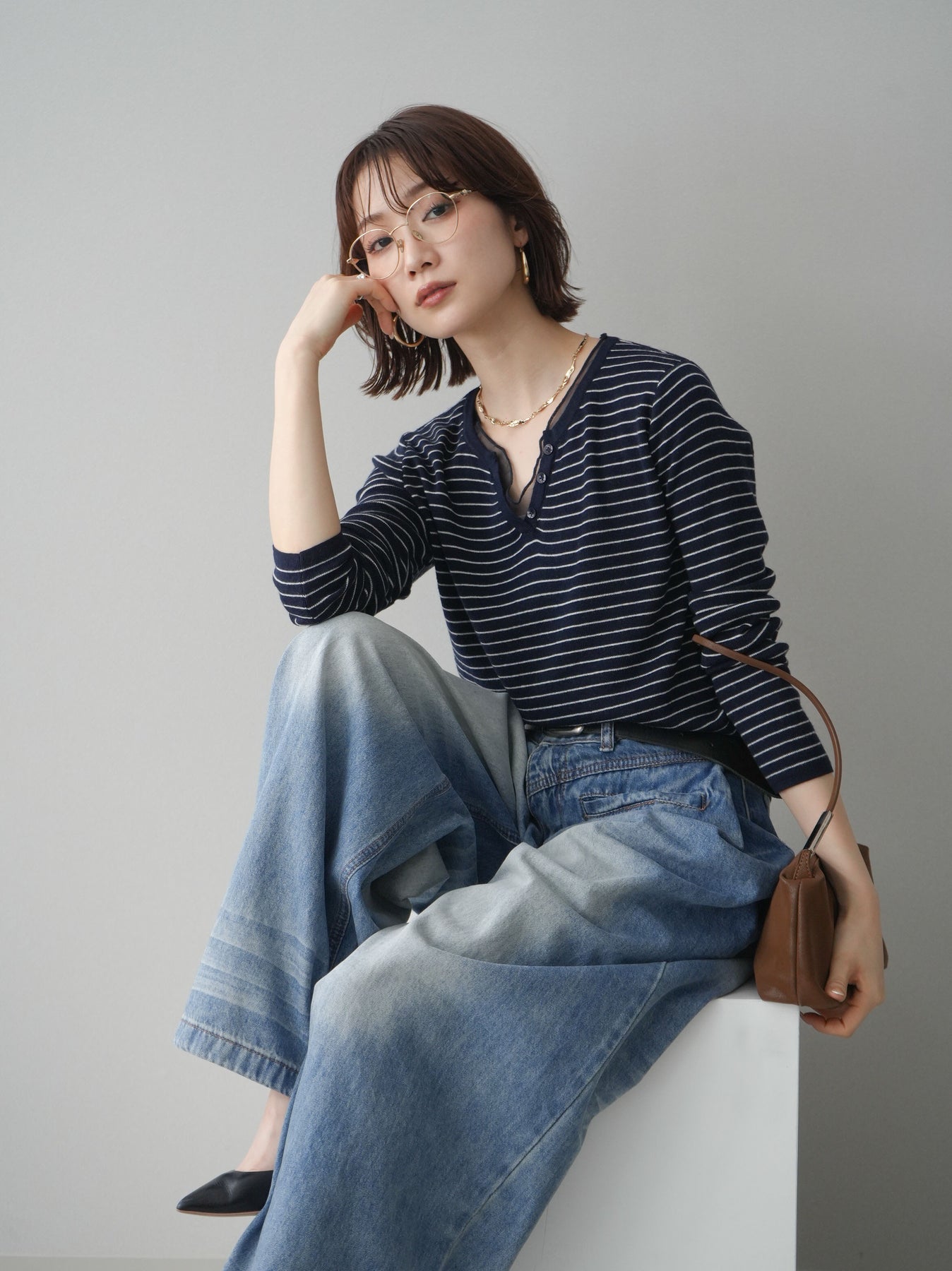 [SET]チュールレイヤードデザインボーダーニットトップス+フロントポケットサイドタックワイドデニム(2set)