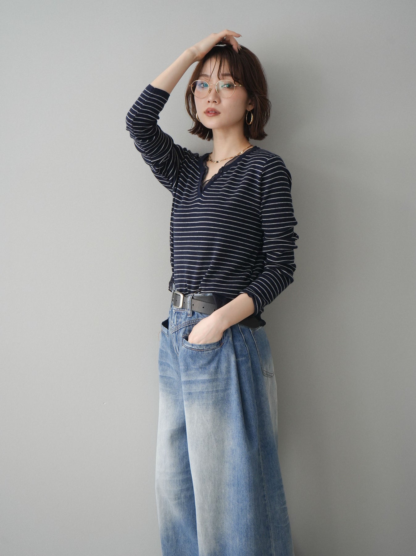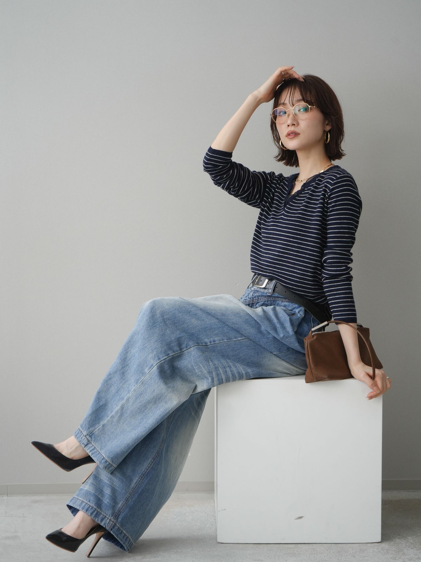サイドに施したタックデザインが立体的なシルエットを生み出すデニムパンツ。腰まわりはすっきりと見せつつ、裾に向かって広がるワイドラインがこなれた印象を演出します。程よいヴィンテージライクな風合いで、シンプルなトップス合わせでもスタイリングが決まる一本。トップスをインしてもアウトでもバランスが取りやすく、デイリーに活躍するアイテムです。 ※ボトムス、キャミソール(インナー)以外の商品は一律でインナーは付属していません