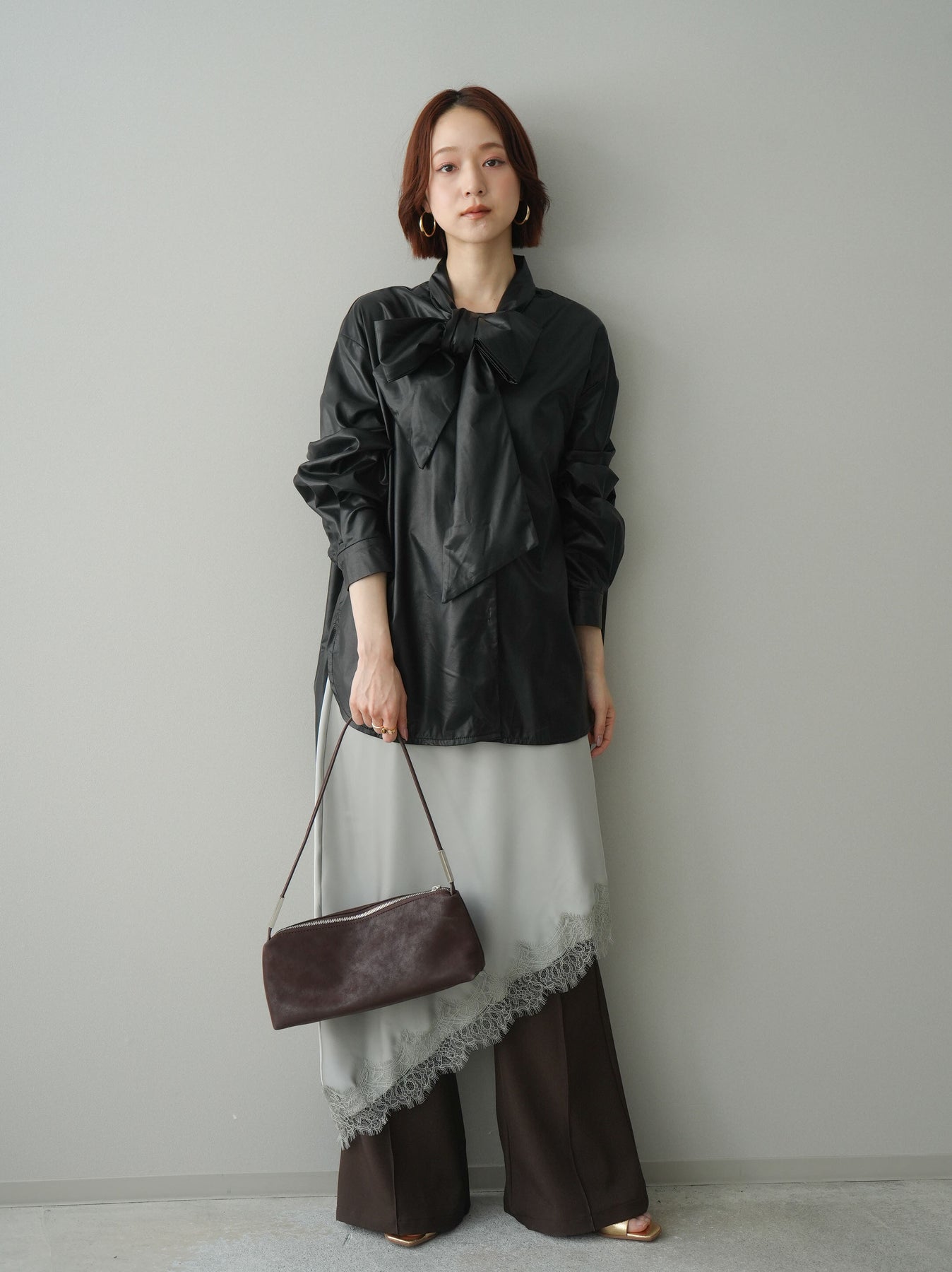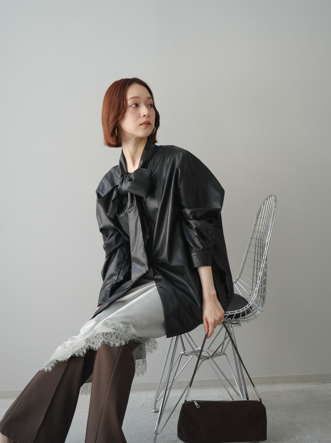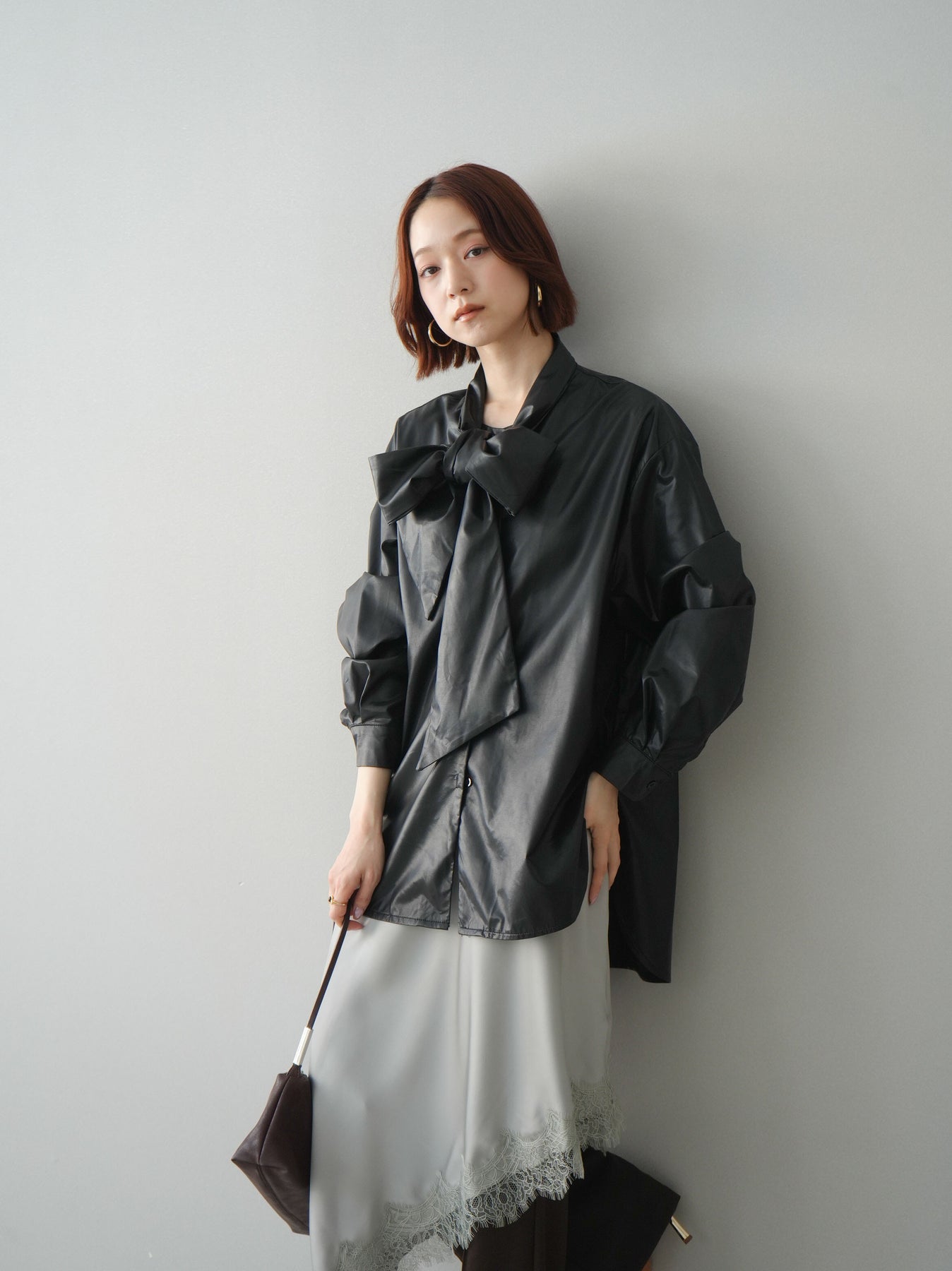 上品な光沢感が目を惹くフェイクレザー素材のボウタイブラウス。存在感のある大きめボウタイが顔まわりを華やかに演出し、シンプルなボトムと合わせるだけでスタイリングが決まります。ゆとりのあるシルエットでこなれた印象をプラスしつつ、モードな雰囲気も漂う一枚。きれいめにもカジュアルにも着回せる、コーディネートの主役アイテムです。