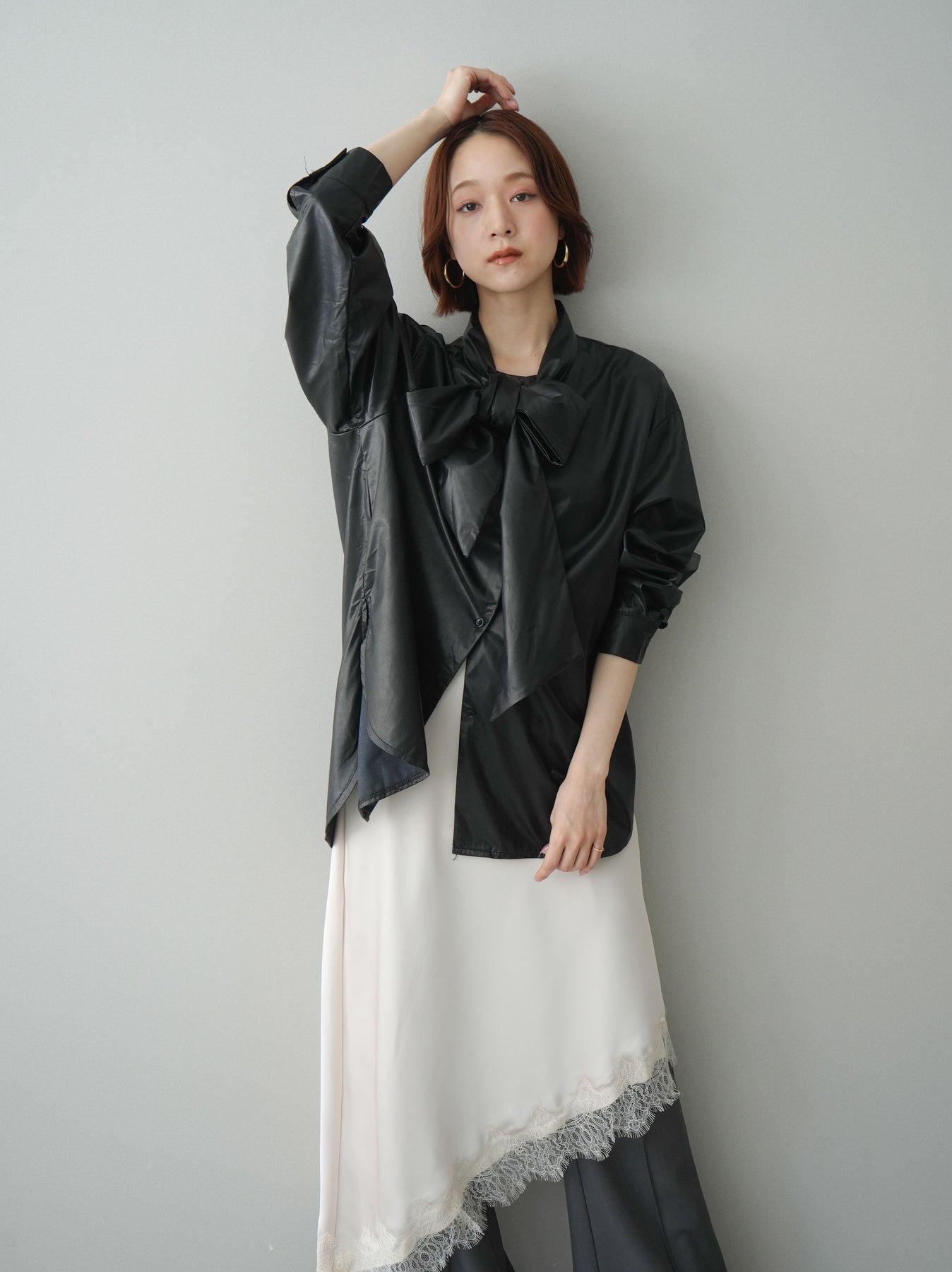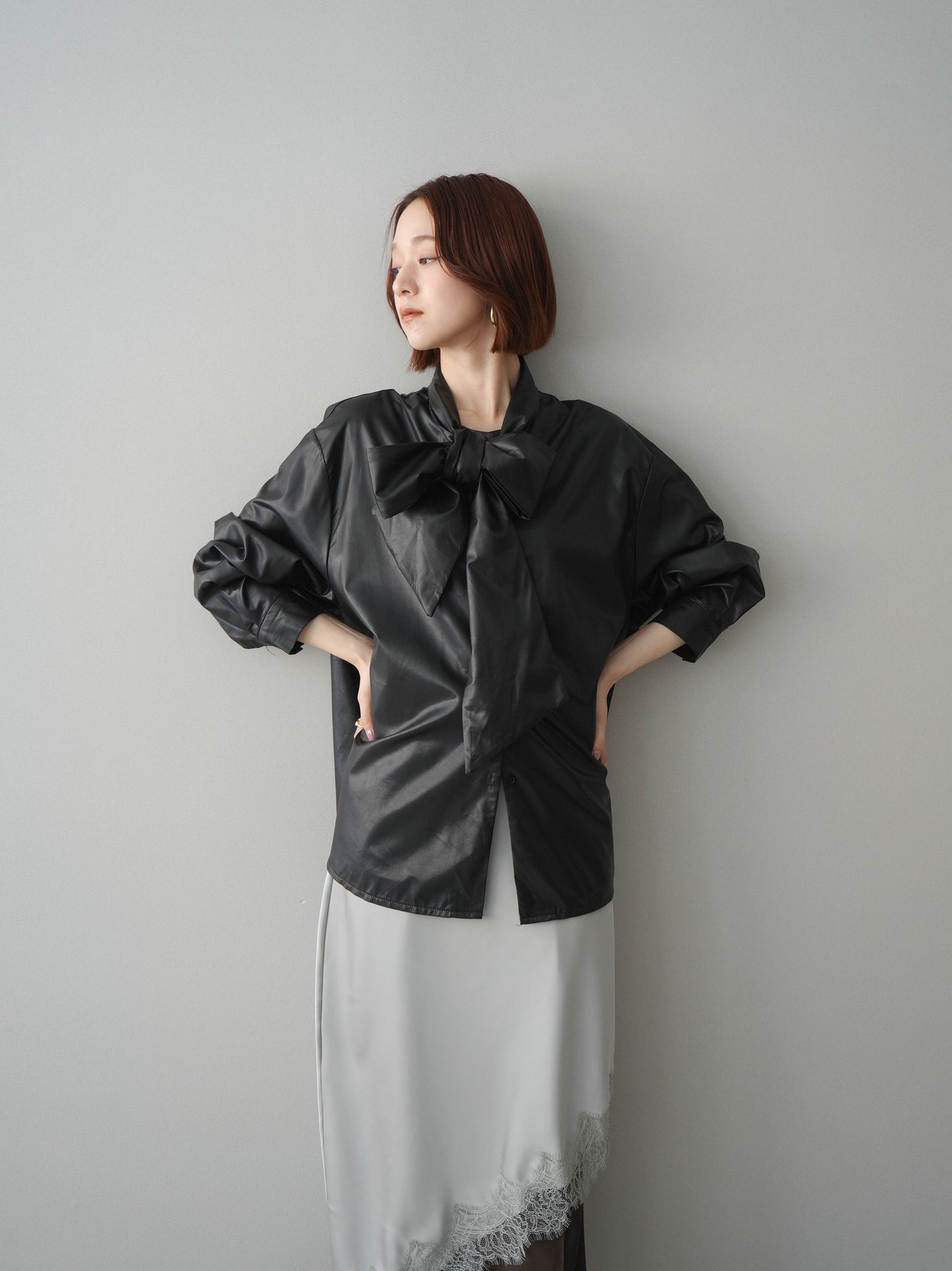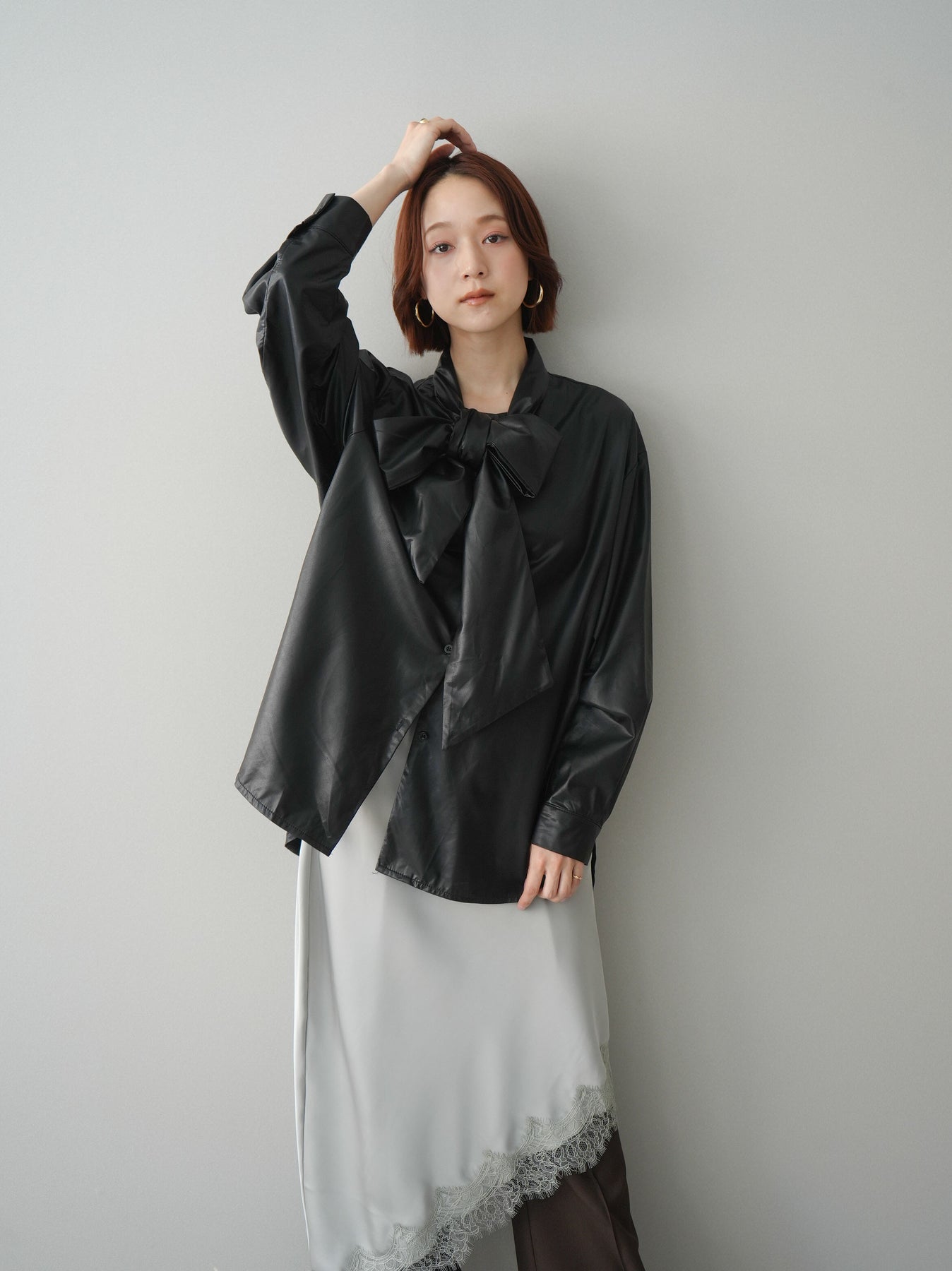 [予約]フェイクレザーボウタイブラウス